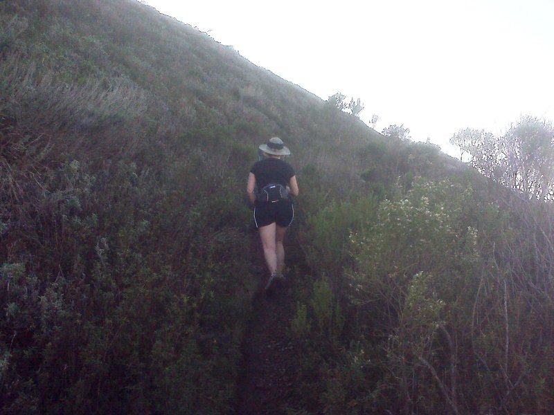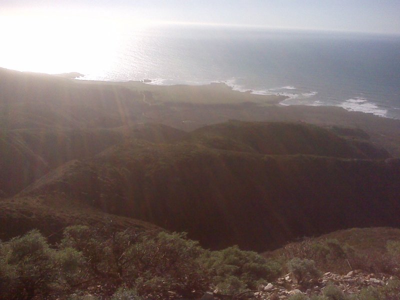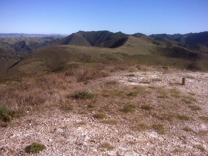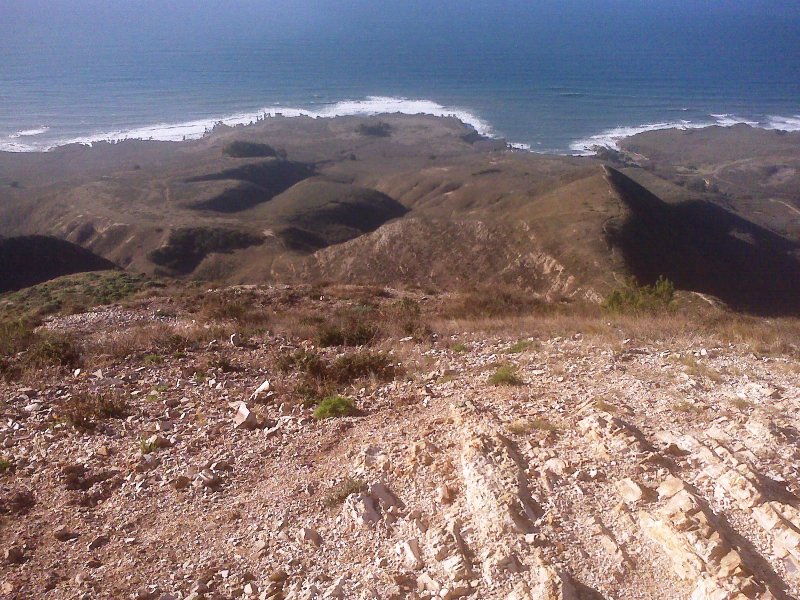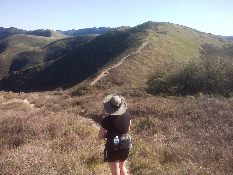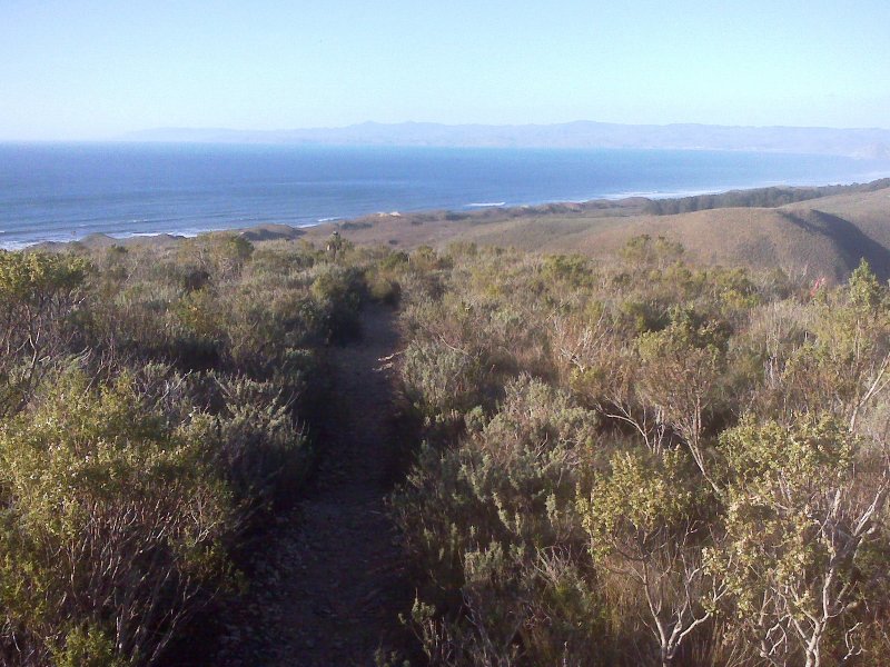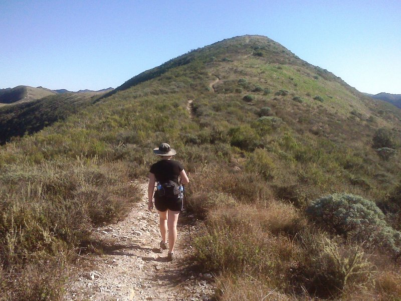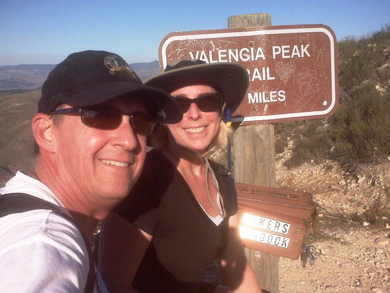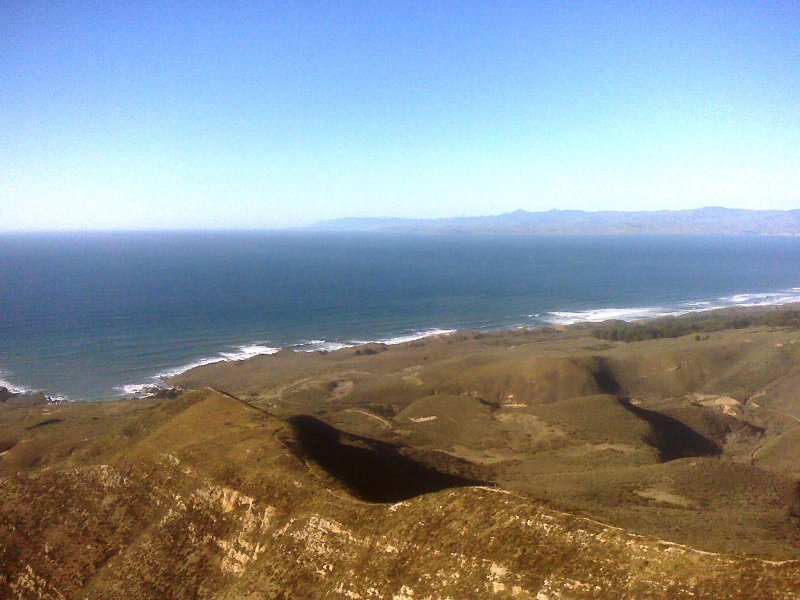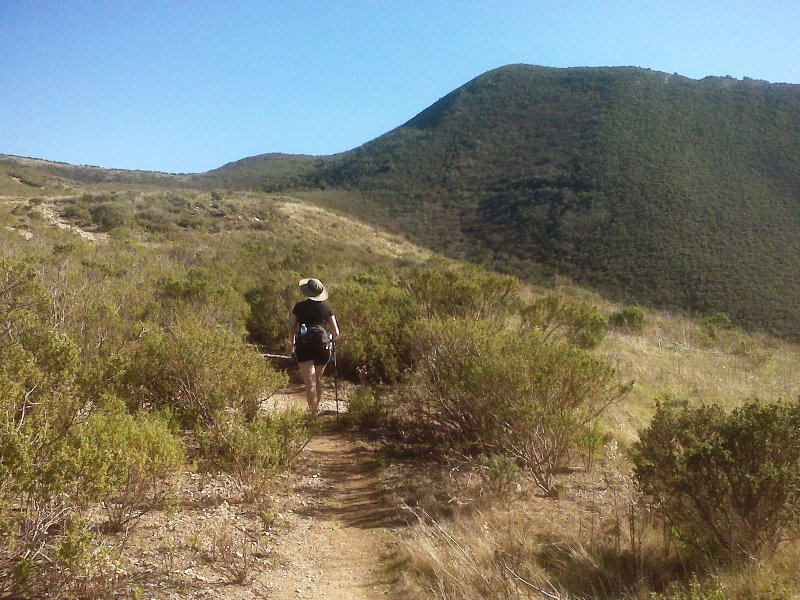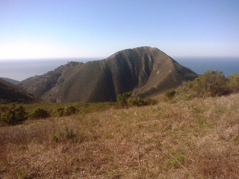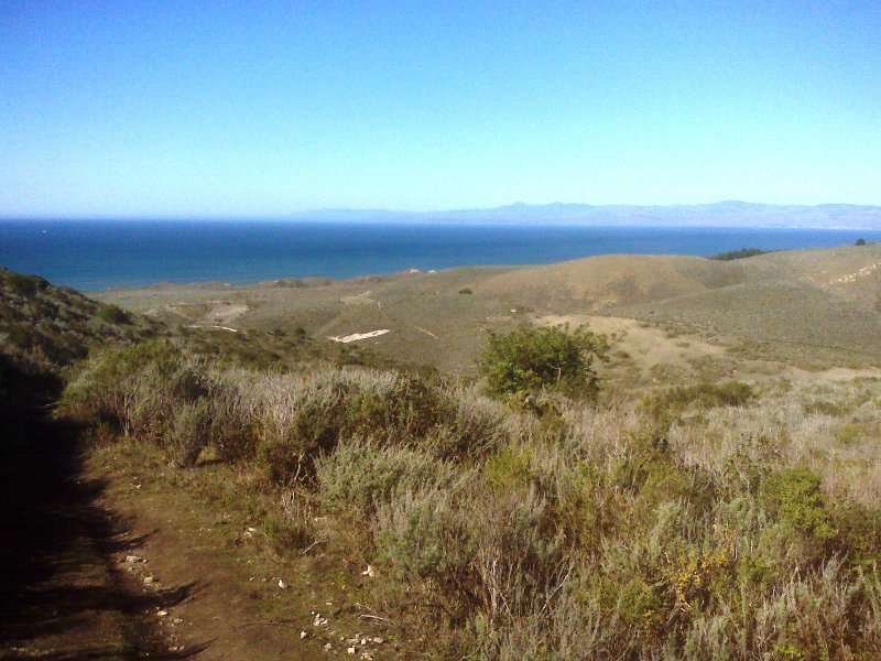 A beautiful, cloudless day in Montana de Oro State Park, and our destination was 1,373′ Oats Peak. We hiked up the south side of the Islay Creek canyon to a saddle just east of Valencia Peak, thinking the next hill was Oats Peak. To our surprise, Oats was three small summits and another 3/4 mile away further east – the trail followed the undulating contours of the ridgeline, requiring a sequence of elevation gains and losses, but we got there eventually without too much additional effort. As we ate our customary lunch on top, the steep east face of Valencia Peak kept calling out to us, so we decided to tag its summit as well on the way back. After descending the Oats Peak trail to the saddle, we found the lateral trail, quite steep and overgrown in places, that ascends Valencia’s northeast shoulder. After reaching Valencia Peak’s summit for the third time (and enjoying both the best weather and views of our various visits here), we then descended to meet the Oats Peak trail again via a cutoff below Valencia’s west ridge. No camera, only photos from Chris’ BlackBerry and Jane’s iPhone.