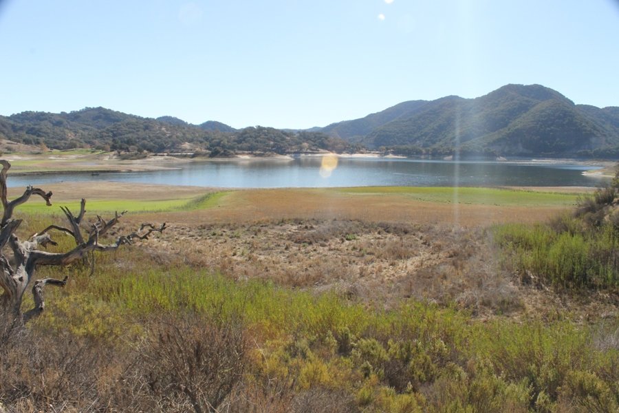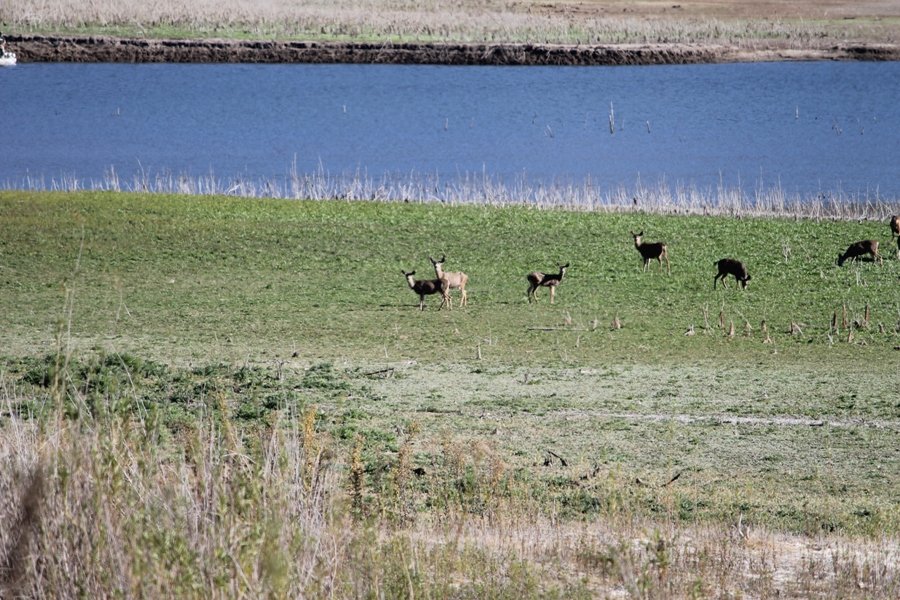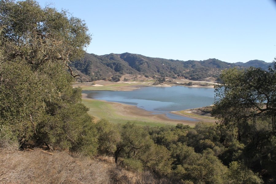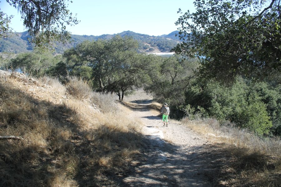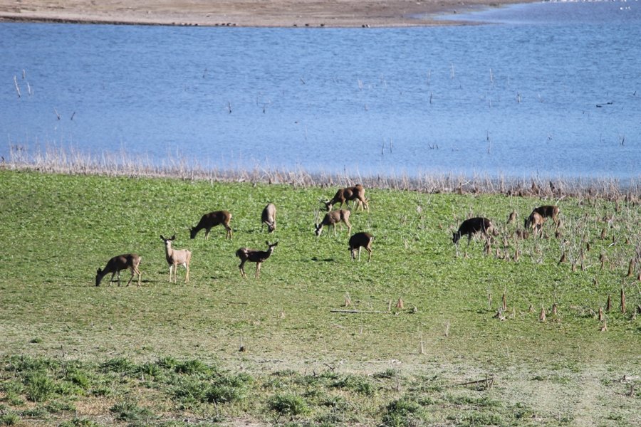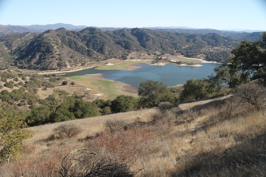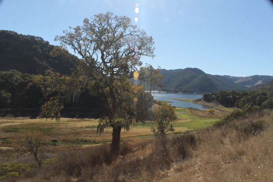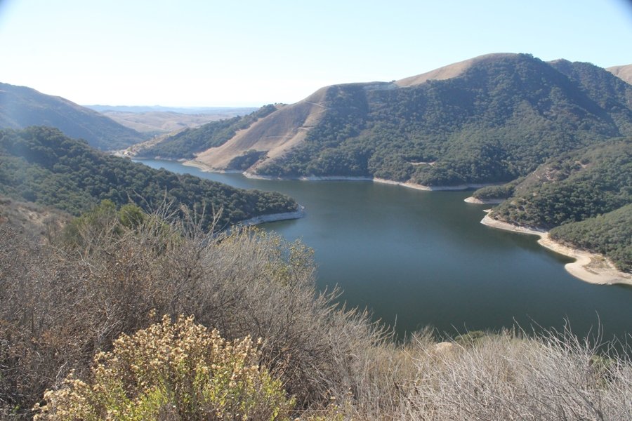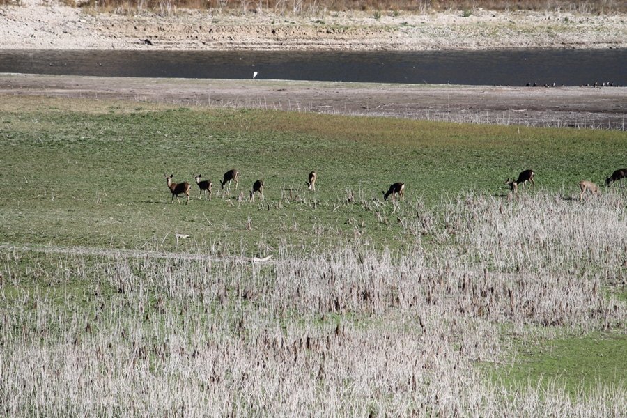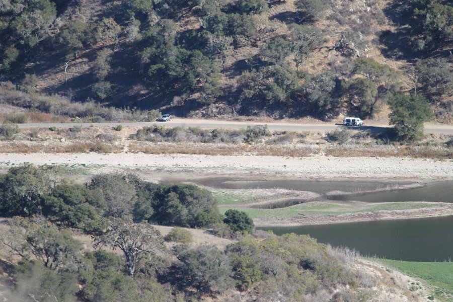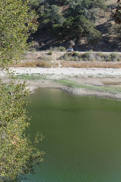 Okay, it’s time to buy a bigger 4WD vehicle. Our day began with an ambitious plan to hike both Big Falls and Little Falls Canyons northeast of Lopez Lake near Arroyo Grande, an 8+-mile endeavor that would require a drive up Lopez Canyon Road – though a county road, this route crosses Lopez Creek more than a dozen times to reach the Big Falls trailhead. Chris had brought the CRV thinking we might be able to pull this off, and we had high hopes as we set out from Pismo, expecting that water levels would be low enough to allow our easy and successful passage. We cruised up to the lake without incident, finding the Upper Lopez Canyon road just east of the lake facilities entrance. Initially paved with asphalt, the road climbs very steeply up the east side of High Ridge, traverses the ridgeline northward, then drops just as steeply down into Wittenberg Canyon, one of the tributary feeders of the lake itself. After passing some ranches and a Boy Scout camp, the road climbs again over a ridge before dropping into Lopez Canyon where the pavement ends. Here’s where it got a little hairy. Passing signs noting that high-clearance vehicles are required beyond this point, we reached our first creek crossing a few hundred yards later – the water looked to be maybe a foot deep and about 10 yards wide (we had failed to realize that Lopez Creek is fed by perennial springs, and that it is always flowing like this). We both got out to survey the situation, commenting that it would not be too cowardly to admit defeat right now and to go find a Plan B hike – however, the crossing held some sort of allure that begged us to at least give it a try, and we were near enough to civilization that we could probably get help if something went wrong. So, in we went. For Chris, the issue turned out not to be so much the depth of the water as it was how squirrely the car got as it crossed over the slippery rocks – for Jane, it was the depth, as is evident in her comments here (small children, please cover your ears). After this initial success, we made a second crossing shorter and shallower than the first before coming to a third crossing – here, we had to cross the creek at a more oblique angle, meaning we’d negotiate maybe 25 yards of water. Let’s do it, said we, and this was by far the craziest of the three – the CRV lurched and fishtailed, water steamed up from the warm engine, but we made it through and up the other side. Still catching our breath, we continued up the canyon for another hundred yards before coming to crossing #4 – although short in terms of distance, this crossing had steep sides and what looked to be deeper water, and we could see where other vehicles had torn up the dirt as they struggled to get up the other side. This was enough to finally deter us, so we made a 5-point turn on the narrow roadway and retraced our steps – the three re-crossings were just as manic the second time around, and it was great relief for us both to eventually get back to the pavement. As we drove back toward the lake, Jane flipped through our little guidebook and found a 7-mile hike at Lopez Lake – called the Duna Vista Loop Trail, this walk follows the lakeshore for the first 2-1/2 miles before climbing west to an overlook atop a ridge, then dropping southward off the ridge and returning north to complete the loop at the water’s edge. We made the half-hour drive back to the lake entrance, paid our day use fee ($10!), and found the Duna Vista trailhead at the end of the road. It was shortly after 11am when we set out past a closed access gate and north up a level road, reaching after a mile or so the Boy Scout camp we had driven by previously. Turning south, we made our way along the now-dry Wittenberg Creek, eventually reaching the lake just past the camp property. Here, what was until now a level road became a very pleasant singletrack that wound its way along the western shore of Wittenberg Arm (Lopez Lake is shaped in a V, one wing being Lopez Arm to the west and Wittenberg Arm to the east). We came to a junction with the Encinal Trail, part of the Duna Vista loop that switches back several times as it climbs westward away from the lake. As we gained elevation, we saw a small herd of about 15 deer below as they crossed a shallow cove of the lake before continuing north to graze on green grass along the lakeshore. At the top of the ridge, we came to another junction – the Encinal Trail continues north to a primitive walk-in campground another half-mile away, and we turned south to gain the Duna Vista overlook a few minutes later. A grand view awaited us, with the Santa Lucias to the north, the Caliente and Sierra Madre ranges to the east, and Arroyo Grande and the dunes to the south (we figure this view is what earned the overlook the name of Duna Vista). We ate our sandwiches here, the handful of people in outboard fishing boats on the lake being the only other humans we saw the entire 3+ hours we spent on the trail. The trip back began with a gentle descent southward along the ridge, but the drop back down to the lake was very steep in places, the trail apparently being an old jeep road judging from its width, and we were glad to have taken the Encinal Trail for our ascent. The deer were still grazing along the lake as we completed our descent, so out came the long lens to try and get some good pictures of them. We snapped several as we walked northward on the trail, gradually closing the distance between us and the herd. We reached a point closest to them atop a short bluff, and Chris was able to scramble down it to within about 50 yards before they got skittish. First, a buck ran swiftly to the north, away from the group, and the rest followed in groups of two or three. We proceeded quickly up the trail in an attempt to head them off, and we found several does congregating in a draw below us – the lead buck was nowhere to be seen, that is until Chris spotted his antlers in the bru