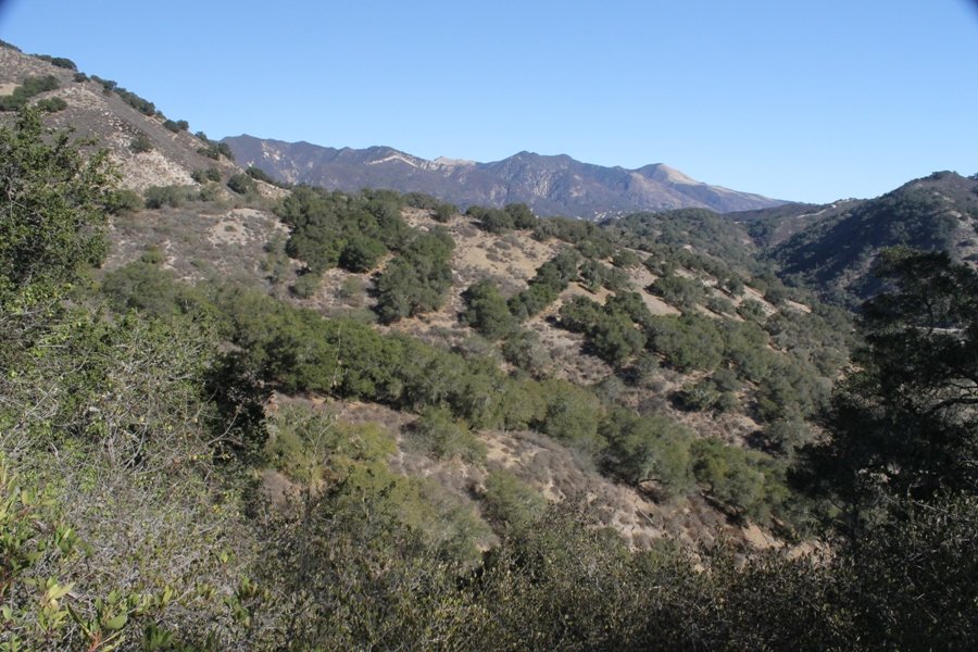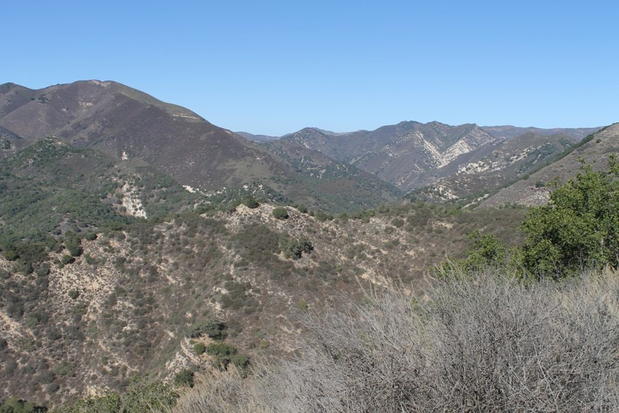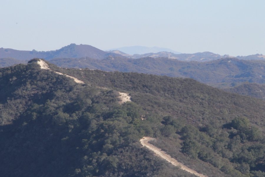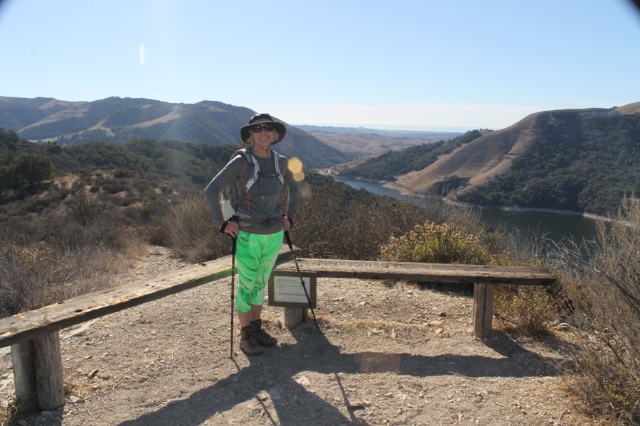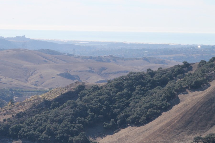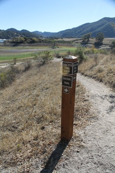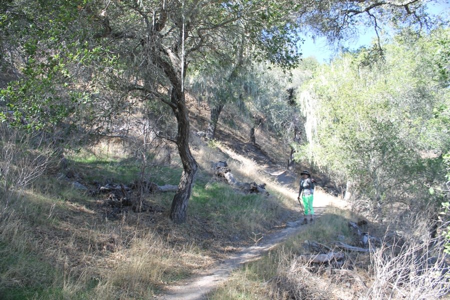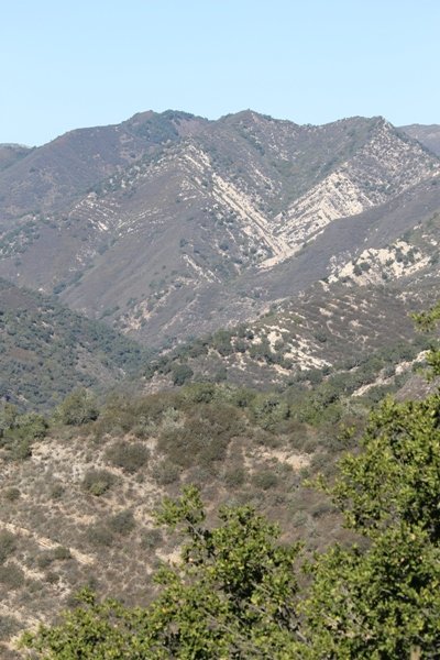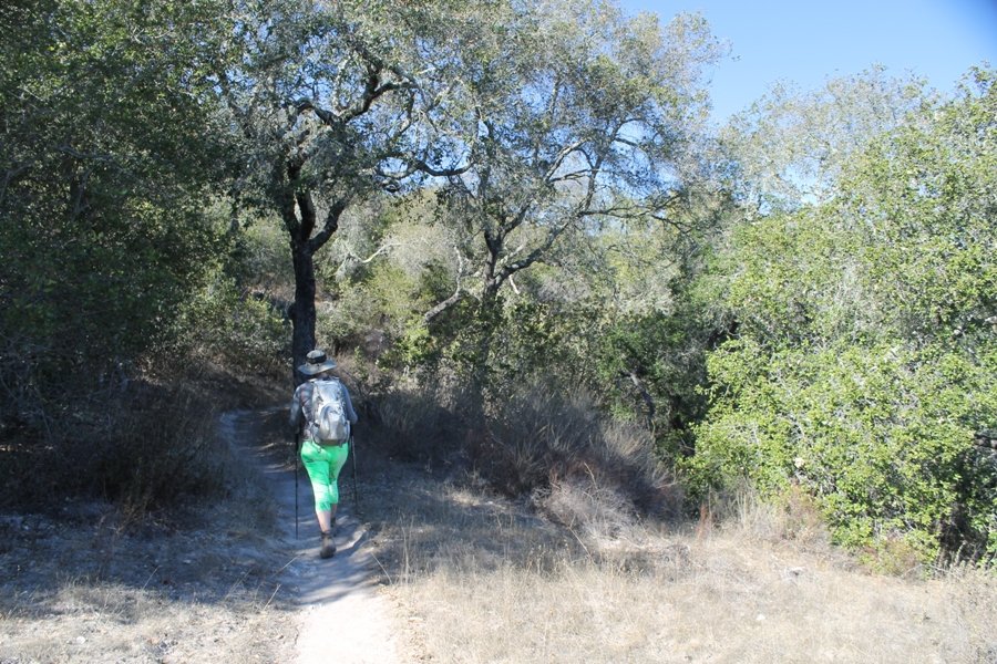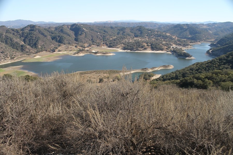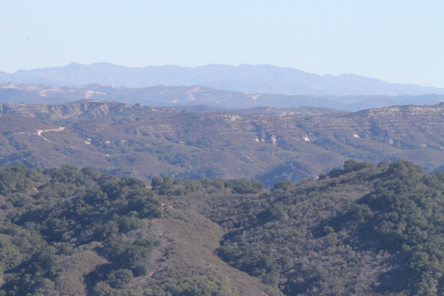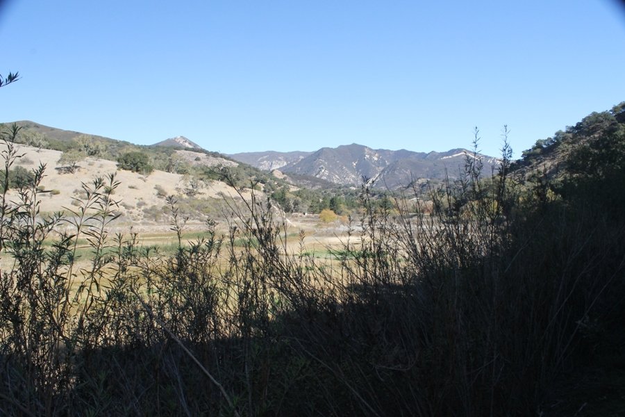 Okay, it’s time to buy a bigger 4WD vehicle. Our day began with an ambitious plan to hike both Big Falls and Little Falls Canyons northeast of Lopez Lake near Arroyo Grande, an 8+-mile endeavor that would require a drive up Lopez Canyon Road – though a county road, this route crosses Lopez Creek more than a dozen times to reach the Big Falls trailhead. Chris had brought the CRV thinking we might be able to pull this off, and we had high hopes as we set out from Pismo, expecting that water levels would be low enough to allow our easy and successful passage. We cruised up to the lake without incident, finding the Upper Lopez Canyon road just east of the lake facilities entrance. Initially paved with asphalt, the road climbs very steeply up the east side of High Ridge, traverses the ridgeline northward, then drops just as steeply down into Wittenberg Canyon, one of the tributary feeders of the lake itself. After passing some ranches and a Boy Scout camp, the road climbs again over a ridge before dropping into Lopez Canyon where the pavement ends. Here’s where it got a little hairy. Passing signs noting that high-clearance vehicles are required beyond this point, we reached our first creek crossing a few hundred yards later – the water looked to be maybe a foot deep and about 10 yards wide (we had failed to realize that Lopez Creek is fed by perennial springs, and that it is always flowing like this). We both got out to survey the situation, commenting that it would not be too cowardly to admit defeat right now and to go find a Plan B hike – however, the crossing held some sort of allure that begged us to at least give it a try, and we were near enough to civilization that we could probably get help if something went wrong. So, in we went. For Chris, the issue turned out not to be so much the depth of the water as it was how squirrely the car got as it crossed over the slippery rocks – for Jane, it was the depth, as is evident in her comments here (small children, please cover your ears). After this initial success, we made a second crossing shorter and shallower than the first before coming to a third crossing – here, we had to cross the creek at a more oblique angle, meaning we’d negotiate maybe 25 yards of water. Let’s do it, said we, and this was by far the craziest of the three – the CRV lurched and fishtailed, water steamed up from the warm engine, but we made it through and up the other side. Still catching our breath, we continued up the canyon for another hundred yards before coming to crossing #4 – although short in terms of distance, this crossing had steep sides and what looked to be deeper water, and we could see where other vehicles had torn up the dirt as they struggled to get up the other side. This was enough to finally deter us, so we made a 5-point turn on the narrow roadway and retraced our steps – the three re-crossings were just as manic the second time around, and it was great relief for us both to eventually get back to the pavement. As we drove back toward the lake, Jane flipped through our little guidebook and found a 7-mile hike at Lopez Lake – called the Duna Vista Loop Trail, this walk follows the lakeshore for the first 2-1/2 miles before climbing west to an overlook atop a ridge, then dropping southward off the ridge and returning north to complete the loop at the water’s edge. We made the half-hour drive back to the lake entrance, paid our day use fee ($10!), and found the Duna Vista trailhead at the end of the road. It was shortly after 11am when we set out past a closed access gate and north up a level road, reaching after a mile or so the Boy Scout camp we had driven by previously. Turning south, we made our way along the now-dry Wittenberg Creek, eventually reaching the lake just past the camp property. Here, what was until now a level road became a very pleasant singletrack that wound its way along the western shore of Wittenberg Arm (Lopez Lake is shaped in a V, one wing being Lopez Arm to the west and Wittenberg Arm to the east). We came to a junction with the Encinal Trail, part of the Duna Vista loop that switches back several times as it climbs westward away from the lake. As we gained elevation, we saw a small herd of about 15 deer below as they crossed a shallow cove of the lake before continuing north to graze on green grass along the lakeshore. At the top of the ridge, we came to another junction – the Encinal Trail continues north to a primitive walk-in campground another half-mile away, and we turned south to gain the Duna Vista overlook a few minutes later. A grand view awaited us, with the Santa Lucias to the north, the Caliente and Sierra Madre ranges to the east, and Arroyo Grande and the dunes to the south (we figure this view is what earned the overlook the name of Duna Vista). We ate our sandwiches here, the handful of people in outboard fishing boats on the lake being the only other humans we saw the entire 3+ hours we spent on the trail. The trip back began with a gentle descent southward along the ridge, but the drop back down to the lake was very steep in places, the trail apparently being an old jeep road judging from its width, and we were glad to have taken the Encinal Trail for our ascent. The deer were still grazing along the lake as we completed our descent, so out came the long lens to try and get some good pictures of them. We snapped several as we walked northward on the trail, gradually closing the distance between us and the herd. We reached a point closest to them atop a short bluff, and Chris was able to scramble down it to within about 50 yards before they got skittish. First, a buck ran swiftly to the north, away from the group, and the rest followed in groups of two or three. We proceeded quickly up the trail in an attempt to head them off, and we found several does congregating in a draw below us – the lead buck was nowhere to be seen, that is until Chris spotted his antlers in the bru