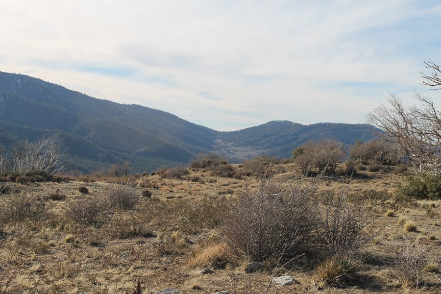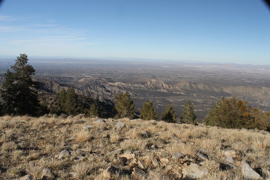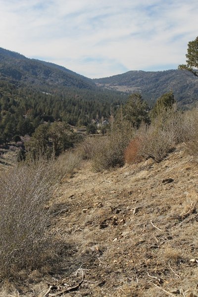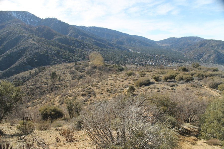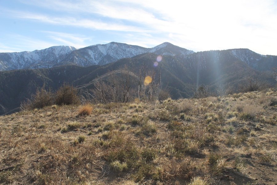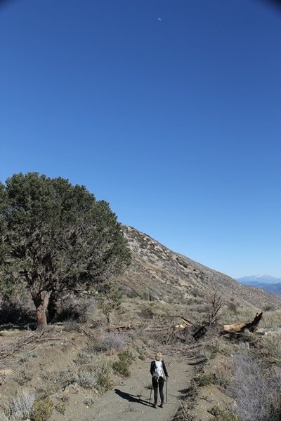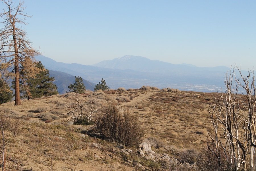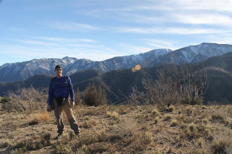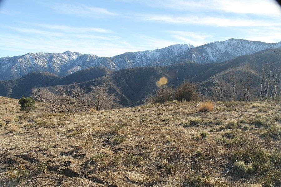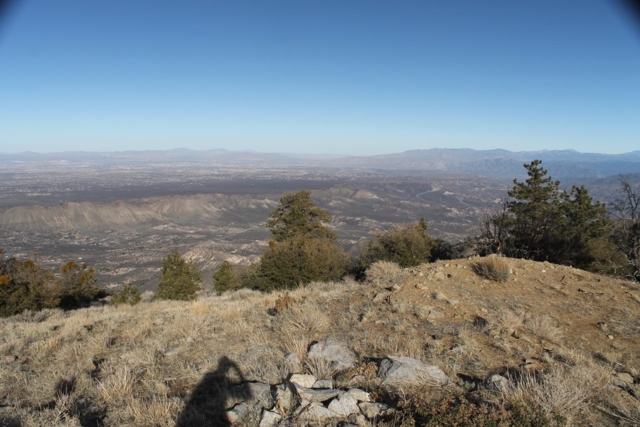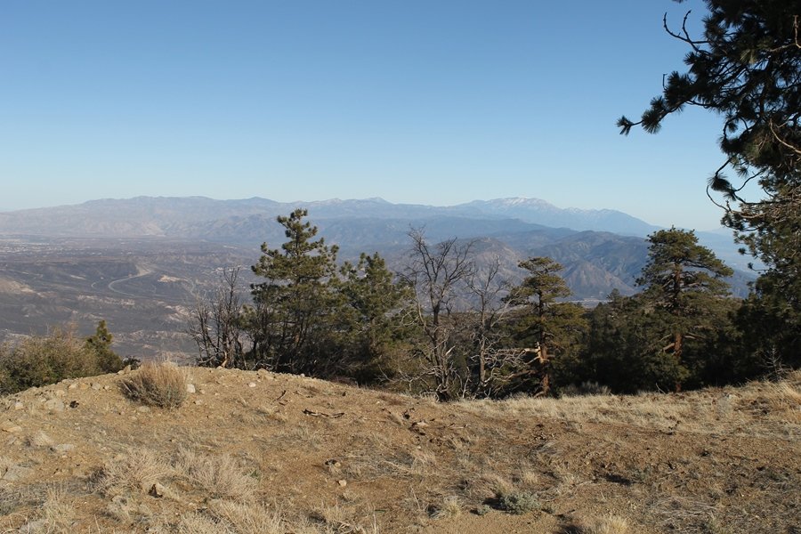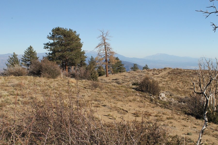 Well, it’s taken the better part of two years, but we finally purchased a cabin in Wrightwood. Stormy weather last weekend had made it difficult to even get up here, much less hike, but make it we did in spite of very heavy rain in the desert and about 3″ of wet and slushy snow at the cabin. The weather for our second weekend was much better – temps in the 60s, bright sunshine, and a Friday off had us packing the U-Haul to get some furniture in the place. Chelsea, Pedro, and the boys joined us for the trip, and we got the truck unloaded in plenty of time to do a hike Saturday afternoon – while Chelsea rested at the cabin with Jude and Ollie, Pedro came along with us. Circle Mountain, elev. 6,875′, lies immediately east of Wrightwood and is accessed via a short but steep use trail – the trailhead is a couple of hundred yards east of Lone Pine Canyon Road at the end of a gated dirt road. This gate has been closed the past couple of times we had driven by, so it was no surprise that it was still closed when we arrived about 2:30pm. We set out east past the gate and within 50 yards encountered a large oak tree that had fallen across the road – after bushwhacking around it to the north, we came across another fallen tree not much further along. Eventually, we came to a large clearing at the end of the road, the parking area we would have otherwise been able to drive through. Below to the east lay a shallow saddle, after which we began the steep ascent up Circle Mountain’s western shoulder. There were multiple faint paths leading up the hill, none any more gentle than the others, so we picked our way up the slope, eventually topping out on a ridge than ran more level and over a second hill for the next 1/4 mile. After that, however, the trail steepened considerably as it climbed straight up the fall line of the mountain’s upper slope. Frequent breathers in this section allowed us to take in the ever-improving scenery – north to the desert, south to the snowcapped peaks around Mt. Baldy, and west to Wrightwood and beyond (these westward views in particular gave us new perspective on the steepness of Swarthout Valley, the slope of which is barely perceptible as one drives through on Hwy 2). Finally, we crested the hilltop and discovered we were at a high but false summit, the true summit lying a few feet of elevation higher about 100 yards further east. Despite some brush and a grove of ponderosa pines to the northwest, the views were amazing, and we spent the next 30 minutes wandering all over the broad hilltop taking in the various vistas. In the extreme distance, we could just make out Olancha Peak in the Sierras and Telescope Peak near Death Valley to the north, while eastward we could clearly see both Mts. San Gorgonio and San Jacinto. South were the highest peaks of the San Gabriels – Baldy, Mt. Harwood, and the Devil’s Backbone seemed close enough to touch, while Pine and Wright Mountains dominated the skyline to the southwest. Eventually, we headed back down, overshooting the network of use trails in the lowest section and making our own cross-country routes instead. Two hours for the under-three-mile roundtrip, but the effort felt good nonetheless despite the slow pace – this was the highest elevation we had walked since Reyes Peak in early November, but we’ll have many chances to acclimatize now that we have a permanent base camp in the area (truly, that was the most awesome thing: a hot shower 5 minutes from the trailhead…).