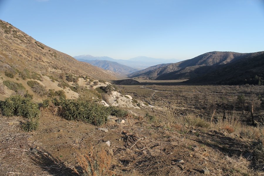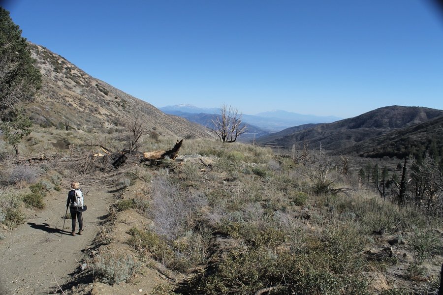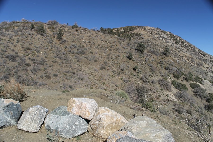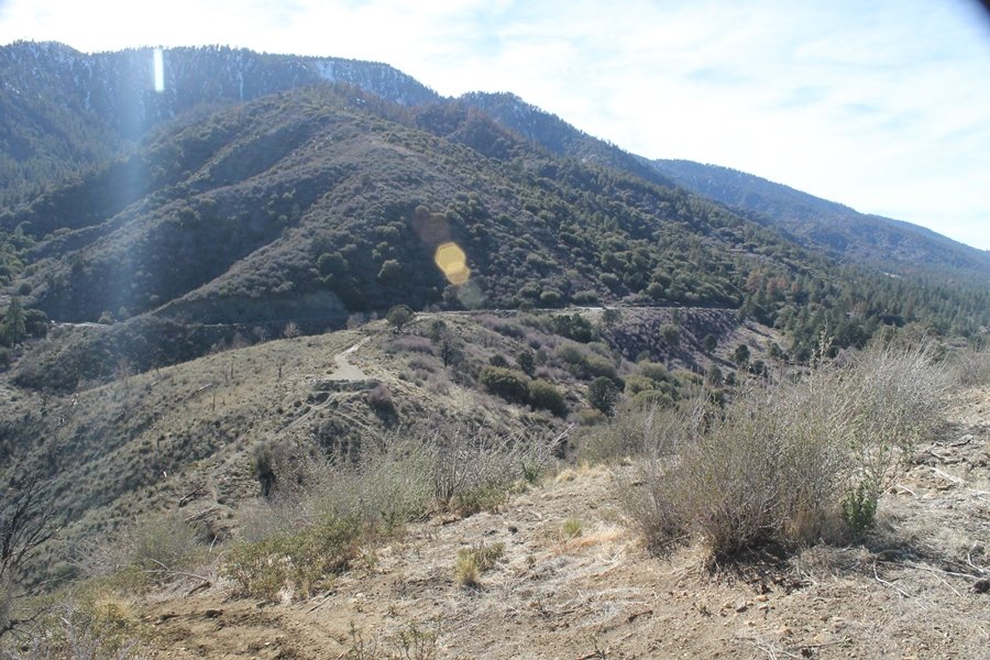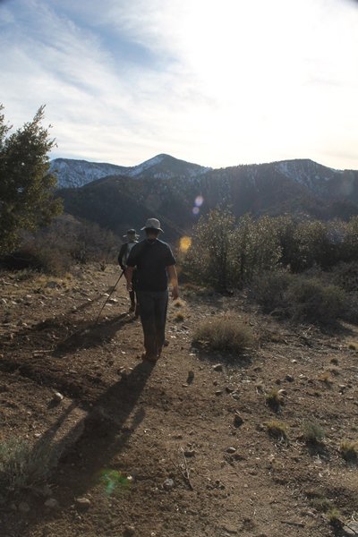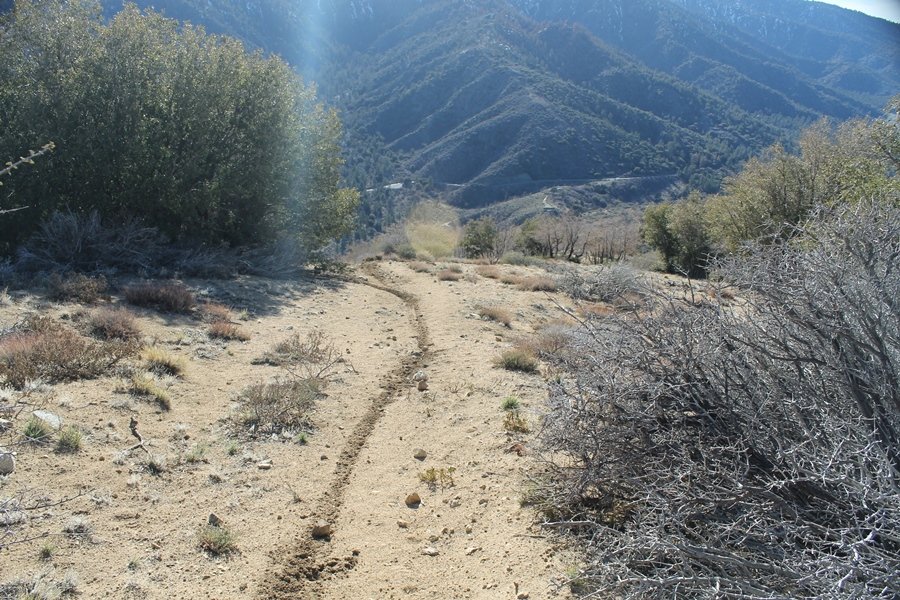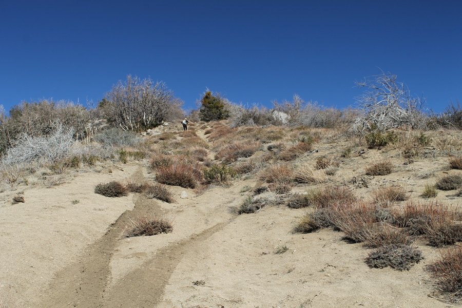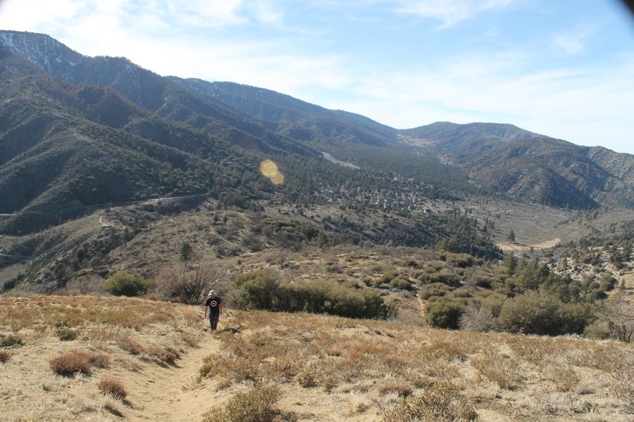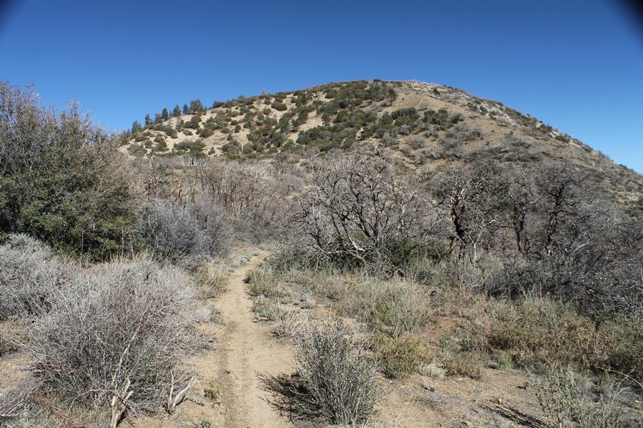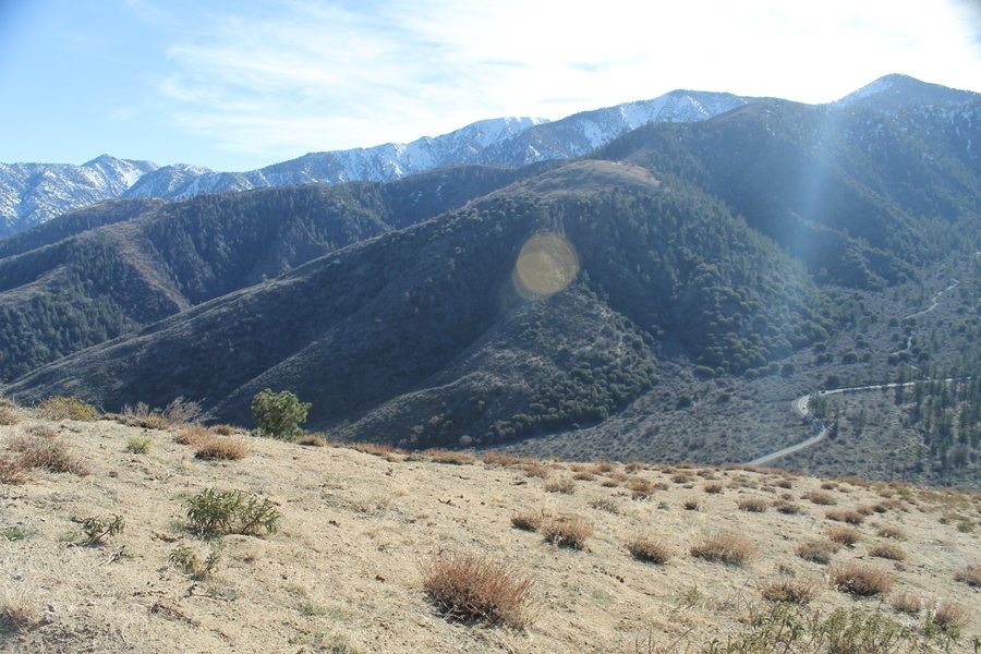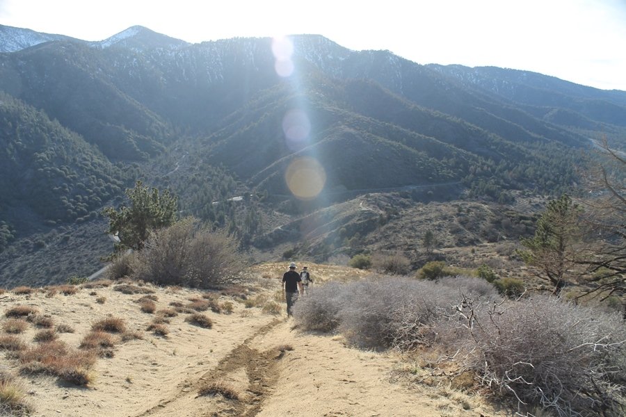 Well, it’s taken the better part of two years, but we finally purchased a cabin in Wrightwood. Stormy weather last weekend had made it difficult to even get up here, much less hike, but make it we did in spite of very heavy rain in the desert and about 3″ of wet and slushy snow at the cabin. The weather for our second weekend was much better – temps in the 60s, bright sunshine, and a Friday off had us packing the U-Haul to get some furniture in the place. Chelsea, Pedro, and the boys joined us for the trip, and we got the truck unloaded in plenty of time to do a hike Saturday afternoon – while Chelsea rested at the cabin with Jude and Ollie, Pedro came along with us. Circle Mountain, elev. 6,875′, lies immediately east of Wrightwood and is accessed via a short but steep use trail – the trailhead is a couple of hundred yards east of Lone Pine Canyon Road at the end of a gated dirt road. This gate has been closed the past couple of times we had driven by, so it was no surprise that it was still closed when we arrived about 2:30pm. We set out east past the gate and within 50 yards encountered a large oak tree that had fallen across the road – after bushwhacking around it to the north, we came across another fallen tree not much further along. Eventually, we came to a large clearing at the end of the road, the parking area we would have otherwise been able to drive through. Below to the east lay a shallow saddle, after which we began the steep ascent up Circle Mountain’s western shoulder. There were multiple faint paths leading up the hill, none any more gentle than the others, so we picked our way up the slope, eventually topping out on a ridge than ran more level and over a second hill for the next 1/4 mile. After that, however, the trail steepened considerably as it climbed straight up the fall line of the mountain’s upper slope. Frequent breathers in this section allowed us to take in the ever-improving scenery – north to the desert, south to the snowcapped peaks around Mt. Baldy, and west to Wrightwood and beyond (these westward views in particular gave us new perspective on the steepness of Swarthout Valley, the slope of which is barely perceptible as one drives through on Hwy 2). Finally, we crested the hilltop and discovered we were at a high but false summit, the true summit lying a few feet of elevation higher about 100 yards further east. Despite some brush and a grove of ponderosa pines to the northwest, the views were amazing, and we spent the next 30 minutes wandering all over the broad hilltop taking in the various vistas. In the extreme distance, we could just make out Olancha Peak in the Sierras and Telescope Peak near Death Valley to the north, while eastward we could clearly see both Mts. San Gorgonio and San Jacinto. South were the highest peaks of the San Gabriels – Baldy, Mt. Harwood, and the Devil’s Backbone seemed close enough to touch, while Pine and Wright Mountains dominated the skyline to the southwest. Eventually, we headed back down, overshooting the network of use trails in the lowest section and making our own cross-country routes instead. Two hours for the under-three-mile roundtrip, but the effort felt good nonetheless despite the slow pace – this was the highest elevation we had walked since Reyes Peak in early November, but we’ll have many chances to acclimatize now that we have a permanent base camp in the area (truly, that was the most awesome thing: a hot shower 5 minutes from the trailhead…).