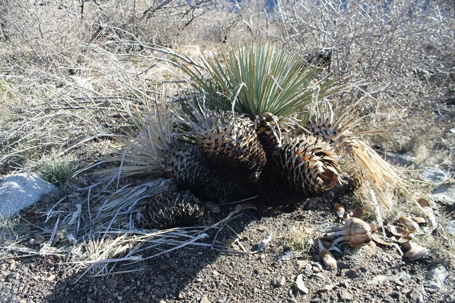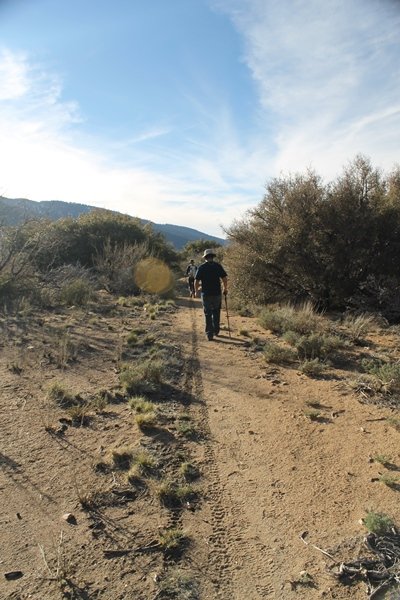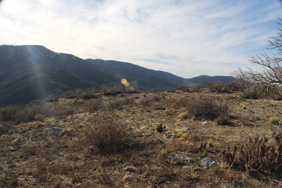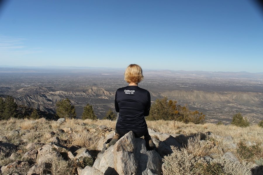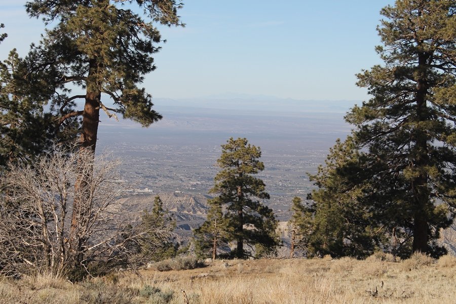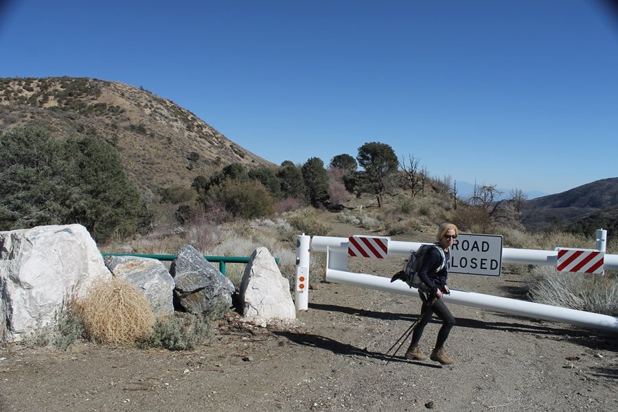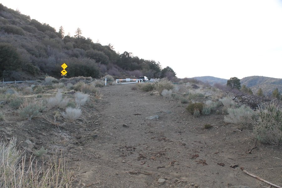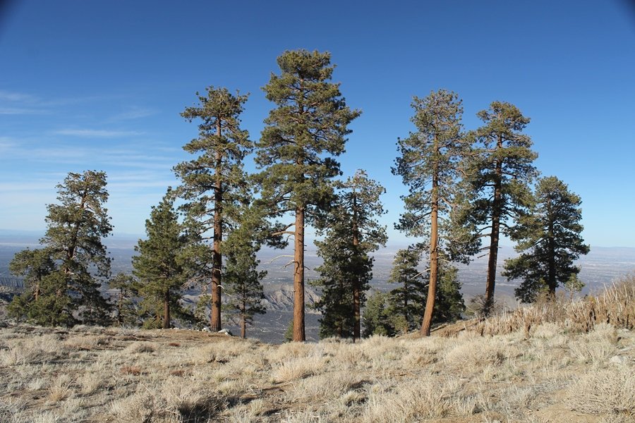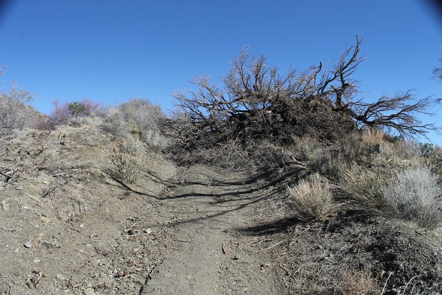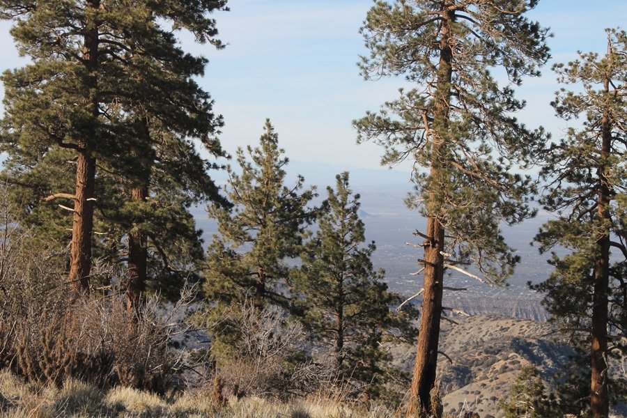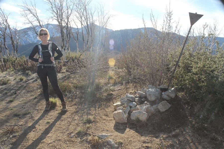 Well, it’s taken the better part of two years, but we finally purchased a cabin in Wrightwood. Stormy weather last weekend had made it difficult to even get up here, much less hike, but make it we did in spite of very heavy rain in the desert and about 3″ of wet and slushy snow at the cabin. The weather for our second weekend was much better – temps in the 60s, bright sunshine, and a Friday off had us packing the U-Haul to get some furniture in the place. Chelsea, Pedro, and the boys joined us for the trip, and we got the truck unloaded in plenty of time to do a hike Saturday afternoon – while Chelsea rested at the cabin with Jude and Ollie, Pedro came along with us. Circle Mountain, elev. 6,875′, lies immediately east of Wrightwood and is accessed via a short but steep use trail – the trailhead is a couple of hundred yards east of Lone Pine Canyon Road at the end of a gated dirt road. This gate has been closed the past couple of times we had driven by, so it was no surprise that it was still closed when we arrived about 2:30pm. We set out east past the gate and within 50 yards encountered a large oak tree that had fallen across the road – after bushwhacking around it to the north, we came across another fallen tree not much further along. Eventually, we came to a large clearing at the end of the road, the parking area we would have otherwise been able to drive through. Below to the east lay a shallow saddle, after which we began the steep ascent up Circle Mountain’s western shoulder. There were multiple faint paths leading up the hill, none any more gentle than the others, so we picked our way up the slope, eventually topping out on a ridge than ran more level and over a second hill for the next 1/4 mile. After that, however, the trail steepened considerably as it climbed straight up the fall line of the mountain’s upper slope. Frequent breathers in this section allowed us to take in the ever-improving scenery – north to the desert, south to the snowcapped peaks around Mt. Baldy, and west to Wrightwood and beyond (these westward views in particular gave us new perspective on the steepness of Swarthout Valley, the slope of which is barely perceptible as one drives through on Hwy 2). Finally, we crested the hilltop and discovered we were at a high but false summit, the true summit lying a few feet of elevation higher about 100 yards further east. Despite some brush and a grove of ponderosa pines to the northwest, the views were amazing, and we spent the next 30 minutes wandering all over the broad hilltop taking in the various vistas. In the extreme distance, we could just make out Olancha Peak in the Sierras and Telescope Peak near Death Valley to the north, while eastward we could clearly see both Mts. San Gorgonio and San Jacinto. South were the highest peaks of the San Gabriels – Baldy, Mt. Harwood, and the Devil’s Backbone seemed close enough to touch, while Pine and Wright Mountains dominated the skyline to the southwest. Eventually, we headed back down, overshooting the network of use trails in the lowest section and making our own cross-country routes instead. Two hours for the under-three-mile roundtrip, but the effort felt good nonetheless despite the slow pace – this was the highest elevation we had walked since Reyes Peak in early November, but we’ll have many chances to acclimatize now that we have a permanent base camp in the area (truly, that was the most awesome thing: a hot shower 5 minutes from the trailhead…).