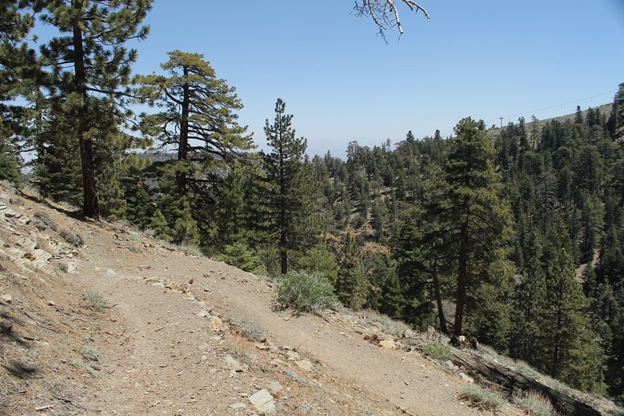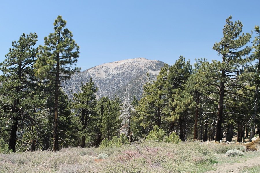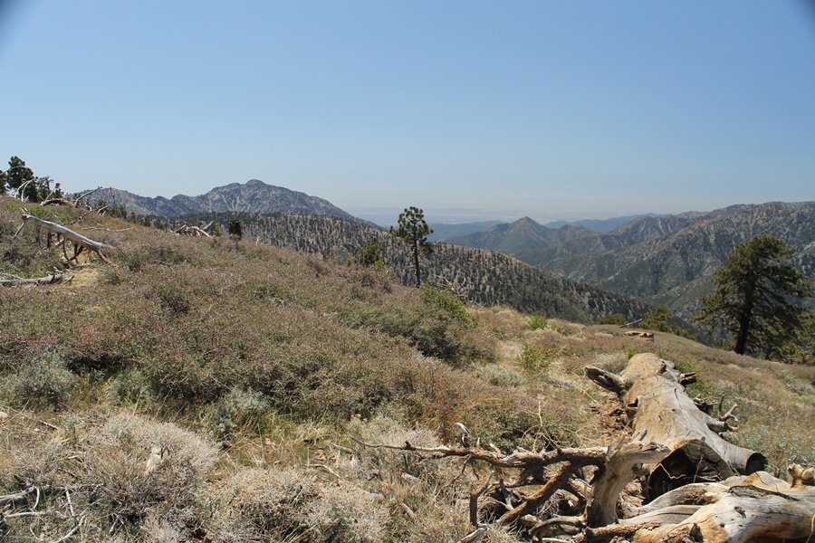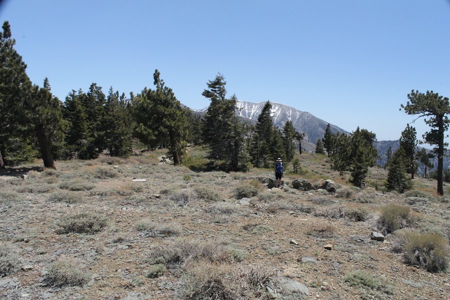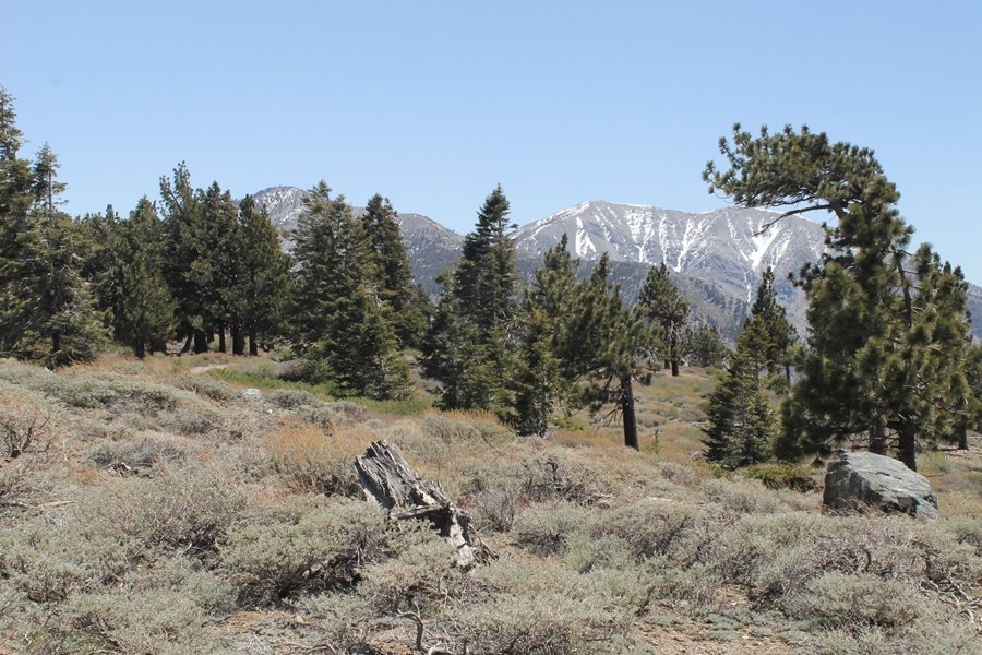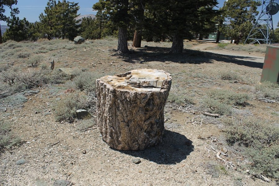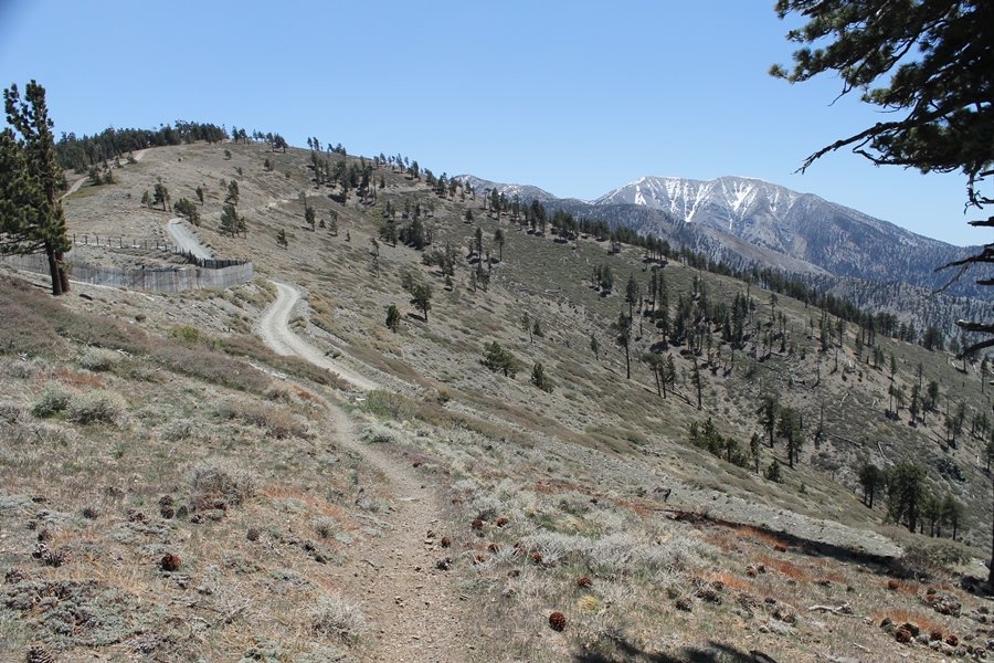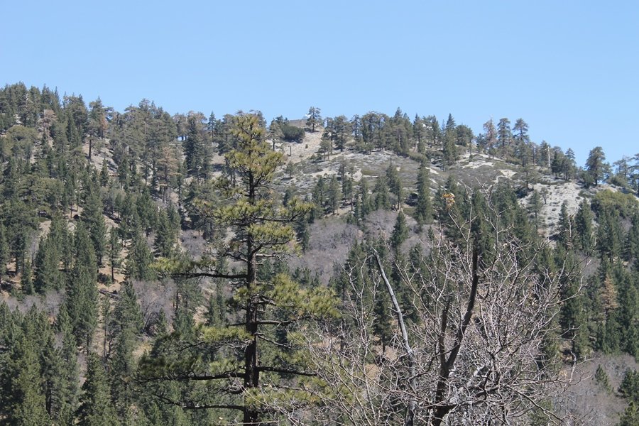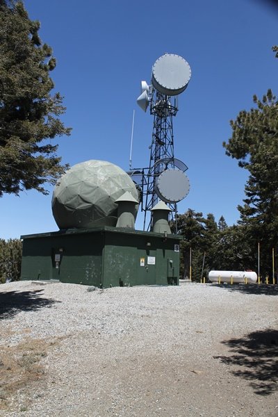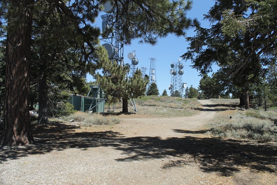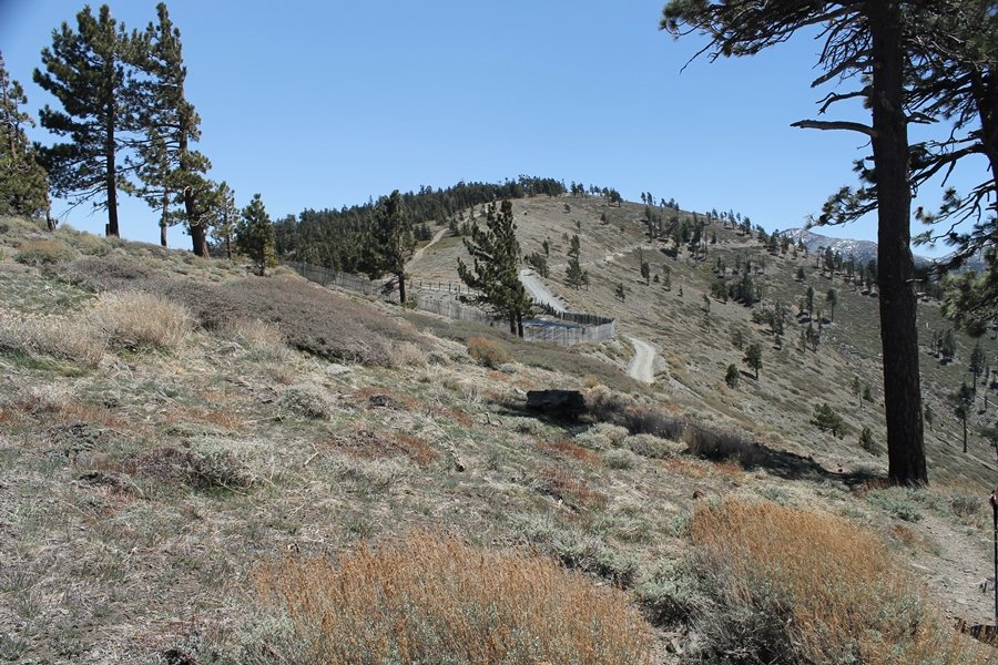 The eastern San Gabriels had gotten some snow the previous weekend, but whatever stuck had virtually disappeared by mid-week, and we were anxious to start exploring the area with vigor. Having not done anything at altitude for weeks, we decided to find something that would help us acclimate while still being a good workout. The Blue Ridge trail runs from the base of the Mountain High West ski area at Big Pines some two miles up the north face of Blue Ridge, terminating at a campground of the same name – another mile or so east of the campground is the unofficially-named Frost Peak, a prominent 8,405′ bump on Blue Ridge atop which is a large radio site. The Pacific Crest Trail (PCT) runs the entire length of Blue Ridge, so we figured we’d hike up to the campground, then follow the PCT eastward for some indeterminate distance before retracing our steps – in all, some 6-7 miles with about 2,000′ of elevation gain. We found the trailhead easily enough at the outlet of the west ski area parking lot and headed out about 11:30am, right away climbing moderately through some short switchbacks before trending more southeast in a more gentle traverse up the ridge. We encountered several parties heading down, each of whom had enjoyed cooler temperatures early in the day – by this time, the midday thermometer was close to 80 degrees, although the trail offered plenty of shade and a light breeze the whole way up. While at a definite incline, the trail gradient never felt too taxing – it was just the ticket for the acclimatizing workout we were after. After about an hour of hiking, we emerged atop the ridgeline at the base of a ski run and chairlift that dropped westward from a taller height to the east, and we found the campground just west of that point as well. We wandered through the empty campground looking for a nice lunch spot, choosing a table at the facility’s southern edge with views over the San Gabriel River drainage to the south – this would definitely be the spot to camp. We hadn’t seen any PCT signs yet, but as we wandered a little further south in search of better views, we found a well-groomed trail that we followed eastward, discovering a PCT marker where the trail entered the eastern ski area property. The trail winds its way east through the ski runs, eventually merging with the Blue Ridge road, a Forest Service route that closes in winter (but is now open given the absence of snow). A few hundred yards up the road, we found more PCT markers which we followed northward, contouring around a large catch basin above the ski area containing some water that didn’t look very fresh – with Frost Peak rising above us to the east and the PCT appearing to trend more along the north side of the ridge and away from its top, we veered up a steep 4WD access road that we followed to the summit. Frost Peak is so named for a benchmark designation on the topo map, and we passed the various antennae as we reached the broad and largely bare mountaintop, unsuccessfully searching for the survey monument. While various small mounds were probable monument locations, the large tree stump segment at the center of the summit clearing was the obvious highpoint, albeit an unnatural one – Chris climbed atop this to take some photos, although the 3-foot elevation gain did nothing to improve perspective. We poked around a bit through the radio facilities, noting several signs indicating continuous video surveillance of the equipment but finding no security fences or other measures – among the various structures was a stone house, and we wonder whether this was originally some sort of shelter that was later converted to its current use housing telecom gear. Wanting to take care of some business in Wrightwood before it got too late, we decided to head back, using a different access road for our descent but eventually reaching the same point on the Blue Ridge road at the catch basin. From here, it was all familiar terrain as we backtracked our way down the ridgeline, past the campground, and down the trail to the car. In all, we walked just under 7 miles, enjoying beautiful views and fantastic weather.