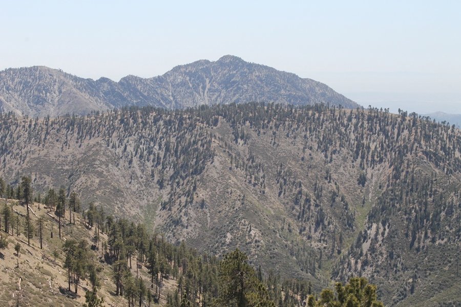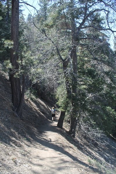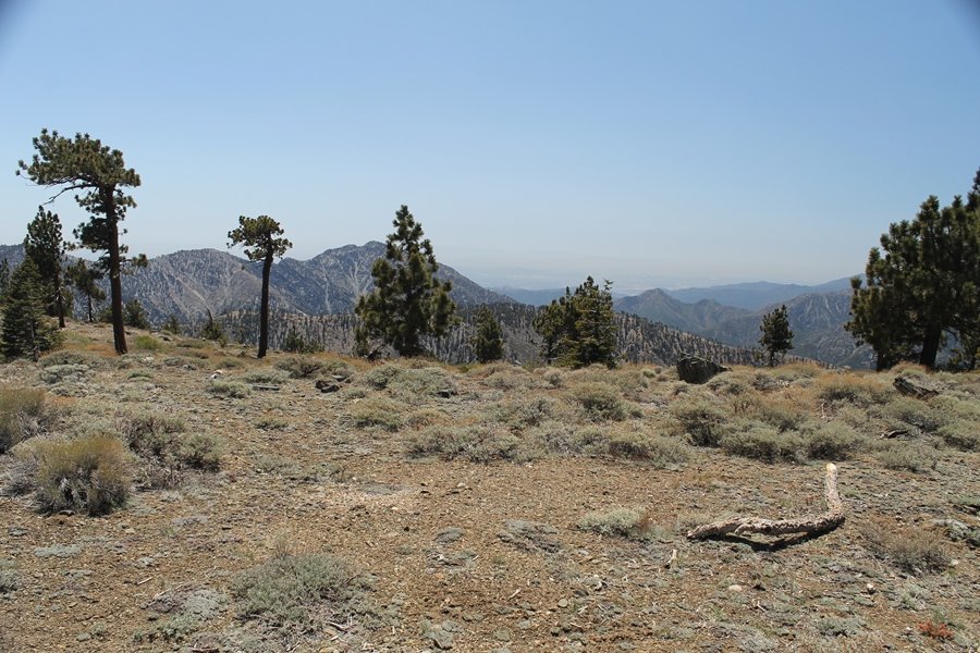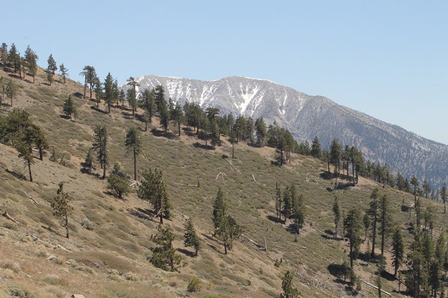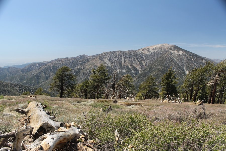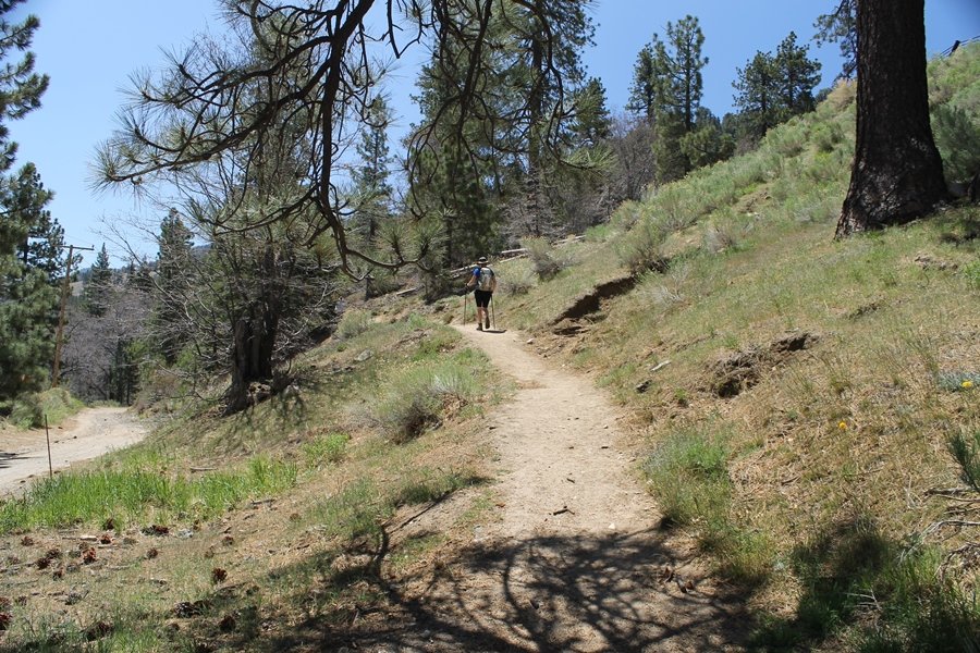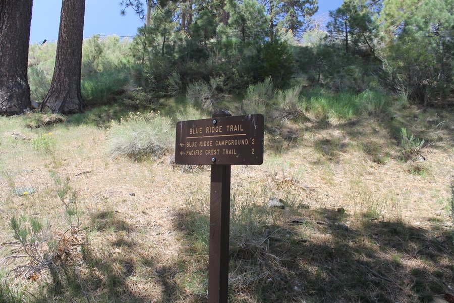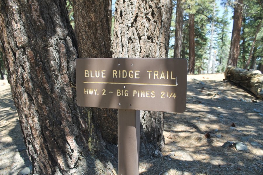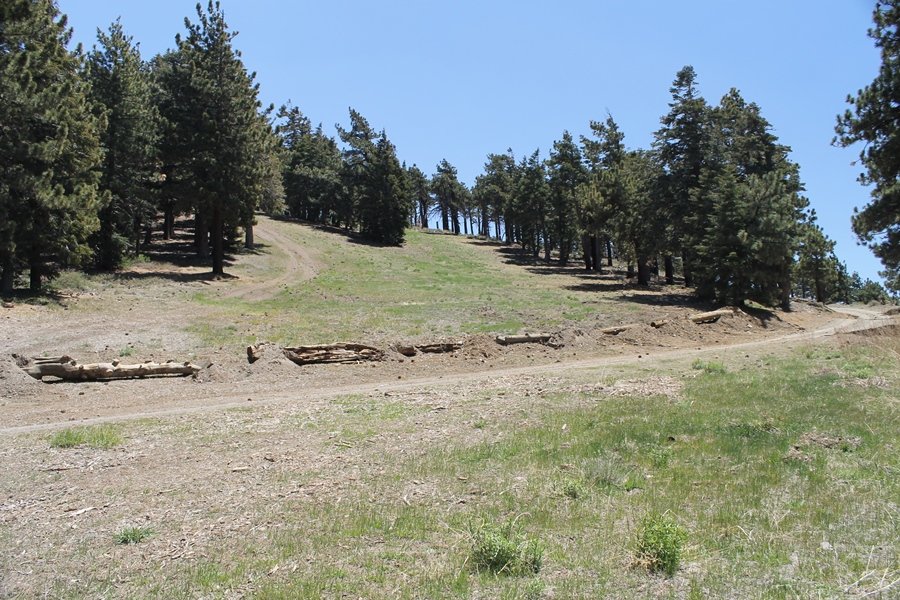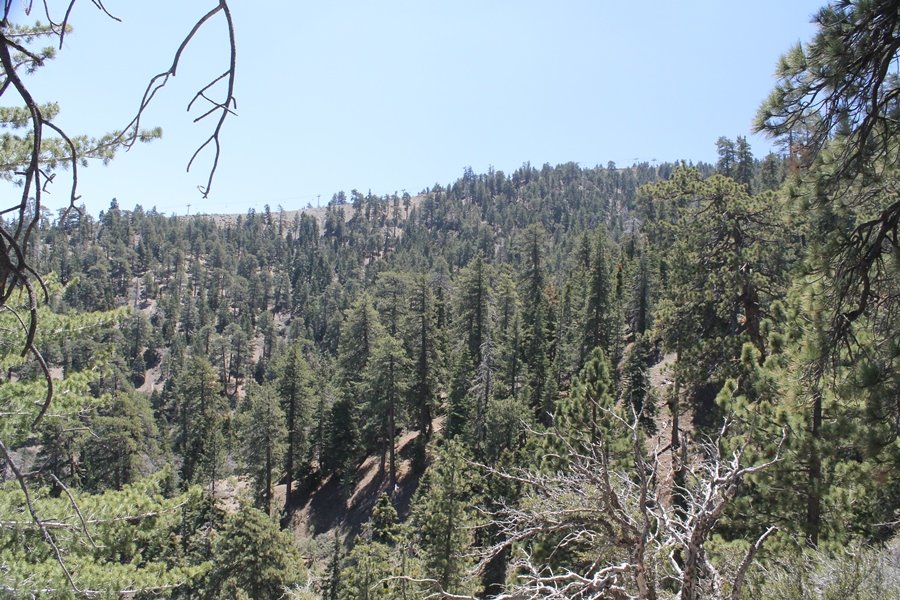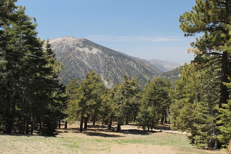 The eastern San Gabriels had gotten some snow the previous weekend, but whatever stuck had virtually disappeared by mid-week, and we were anxious to start exploring the area with vigor. Having not done anything at altitude for weeks, we decided to find something that would help us acclimate while still being a good workout. The Blue Ridge trail runs from the base of the Mountain High West ski area at Big Pines some two miles up the north face of Blue Ridge, terminating at a campground of the same name – another mile or so east of the campground is the unofficially-named Frost Peak, a prominent 8,405′ bump on Blue Ridge atop which is a large radio site. The Pacific Crest Trail (PCT) runs the entire length of Blue Ridge, so we figured we’d hike up to the campground, then follow the PCT eastward for some indeterminate distance before retracing our steps – in all, some 6-7 miles with about 2,000′ of elevation gain. We found the trailhead easily enough at the outlet of the west ski area parking lot and headed out about 11:30am, right away climbing moderately through some short switchbacks before trending more southeast in a more gentle traverse up the ridge. We encountered several parties heading down, each of whom had enjoyed cooler temperatures early in the day – by this time, the midday thermometer was close to 80 degrees, although the trail offered plenty of shade and a light breeze the whole way up. While at a definite incline, the trail gradient never felt too taxing – it was just the ticket for the acclimatizing workout we were after. After about an hour of hiking, we emerged atop the ridgeline at the base of a ski run and chairlift that dropped westward from a taller height to the east, and we found the campground just west of that point as well. We wandered through the empty campground looking for a nice lunch spot, choosing a table at the facility’s southern edge with views over the San Gabriel River drainage to the south – this would definitely be the spot to camp. We hadn’t seen any PCT signs yet, but as we wandered a little further south in search of better views, we found a well-groomed trail that we followed eastward, discovering a PCT marker where the trail entered the eastern ski area property. The trail winds its way east through the ski runs, eventually merging with the Blue Ridge road, a Forest Service route that closes in winter (but is now open given the absence of snow). A few hundred yards up the road, we found more PCT markers which we followed northward, contouring around a large catch basin above the ski area containing some water that didn’t look very fresh – with Frost Peak rising above us to the east and the PCT appearing to trend more along the north side of the ridge and away from its top, we veered up a steep 4WD access road that we followed to the summit. Frost Peak is so named for a benchmark designation on the topo map, and we passed the various antennae as we reached the broad and largely bare mountaintop, unsuccessfully searching for the survey monument. While various small mounds were probable monument locations, the large tree stump segment at the center of the summit clearing was the obvious highpoint, albeit an unnatural one – Chris climbed atop this to take some photos, although the 3-foot elevation gain did nothing to improve perspective. We poked around a bit through the radio facilities, noting several signs indicating continuous video surveillance of the equipment but finding no security fences or other measures – among the various structures was a stone house, and we wonder whether this was originally some sort of shelter that was later converted to its current use housing telecom gear. Wanting to take care of some business in Wrightwood before it got too late, we decided to head back, using a different access road for our descent but eventually reaching the same point on the Blue Ridge road at the catch basin. From here, it was all familiar terrain as we backtracked our way down the ridgeline, past the campground, and down the trail to the car. In all, we walked just under 7 miles, enjoying beautiful views and fantastic weather.