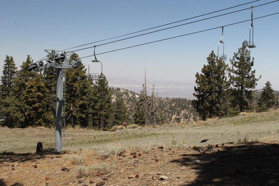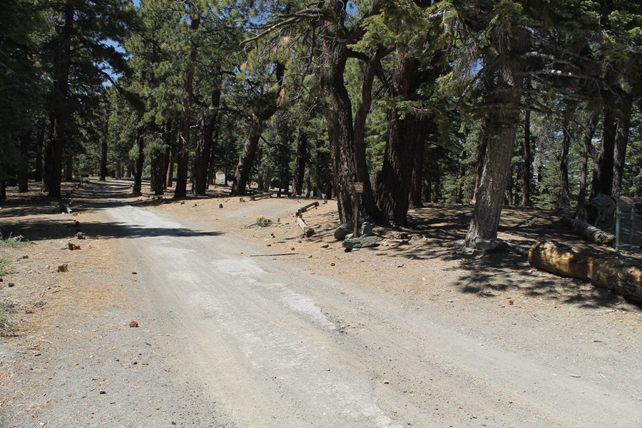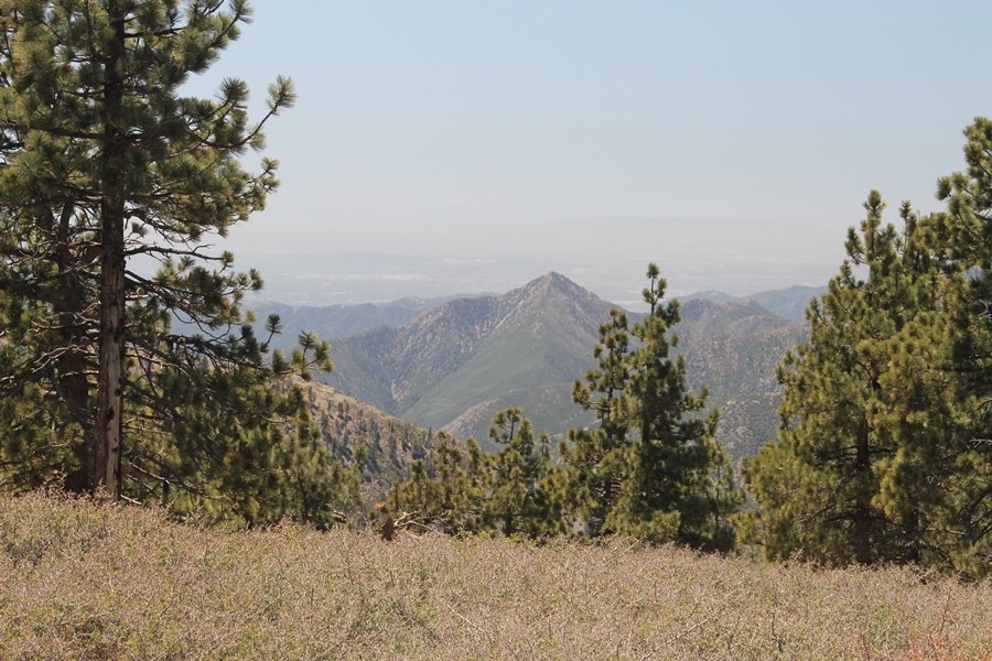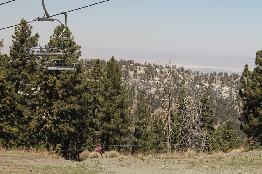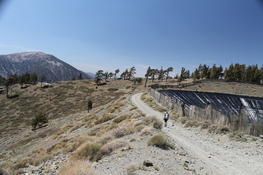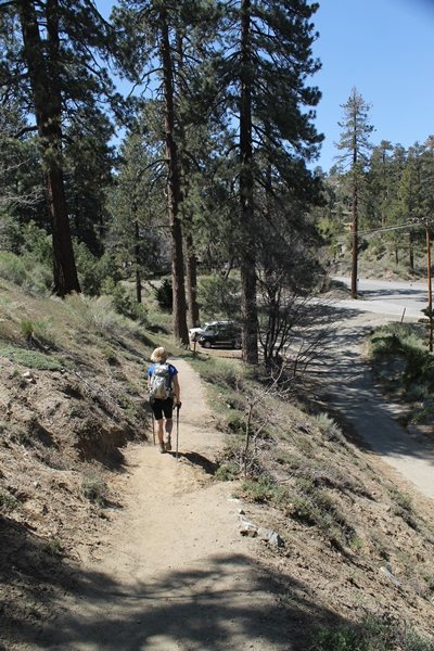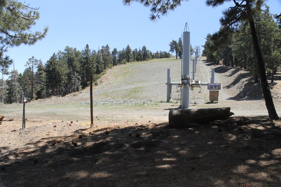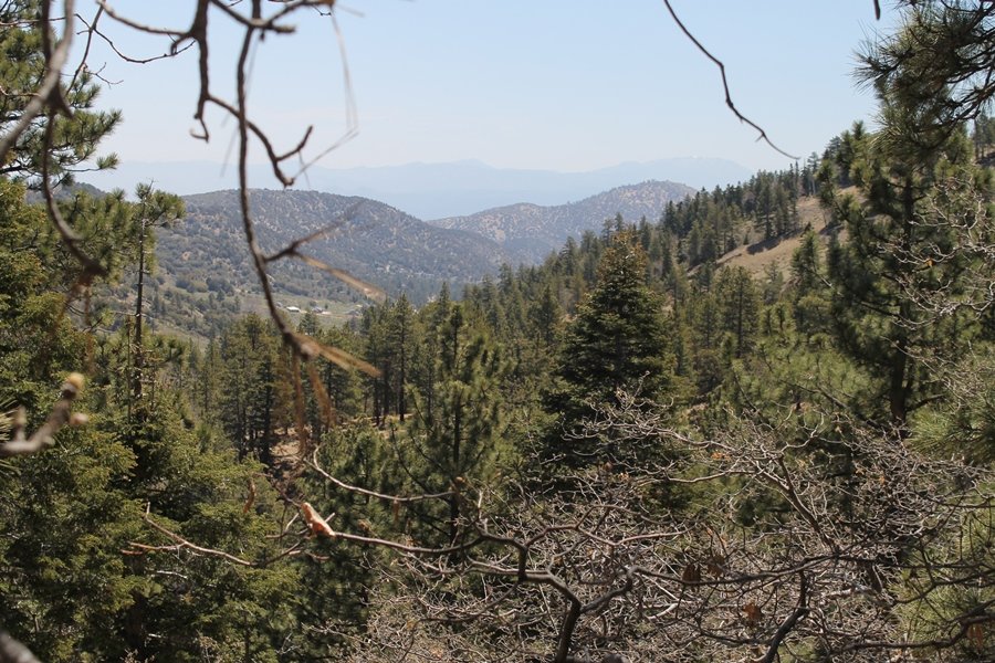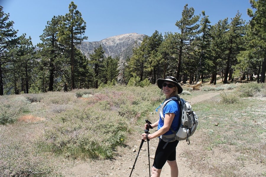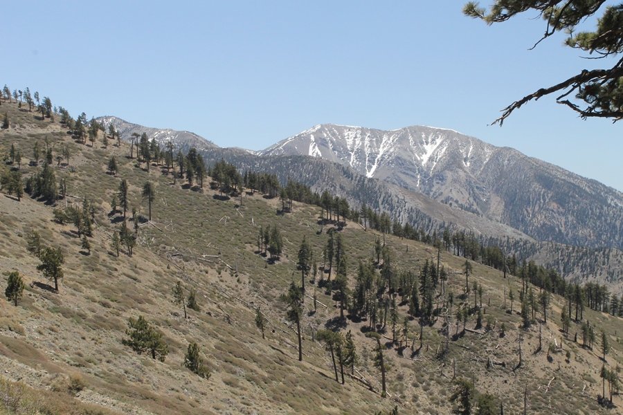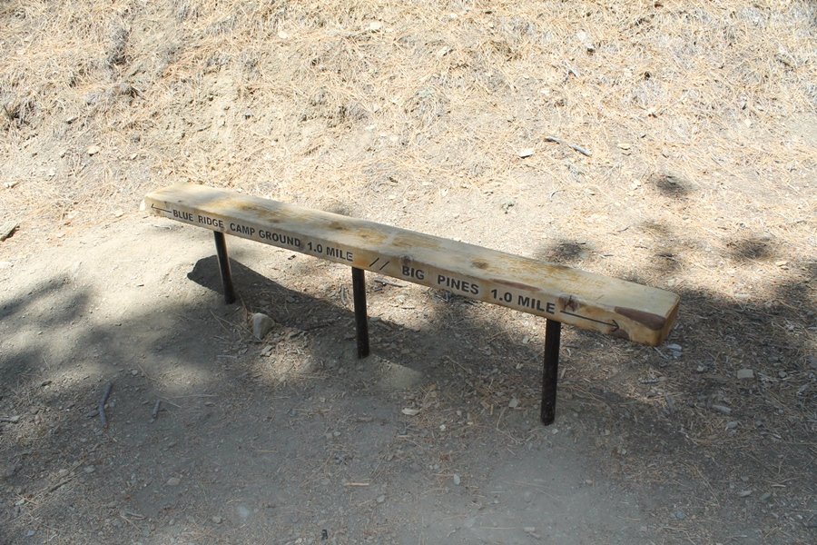 The eastern San Gabriels had gotten some snow the previous weekend, but whatever stuck had virtually disappeared by mid-week, and we were anxious to start exploring the area with vigor. Having not done anything at altitude for weeks, we decided to find something that would help us acclimate while still being a good workout. The Blue Ridge trail runs from the base of the Mountain High West ski area at Big Pines some two miles up the north face of Blue Ridge, terminating at a campground of the same name – another mile or so east of the campground is the unofficially-named Frost Peak, a prominent 8,405′ bump on Blue Ridge atop which is a large radio site. The Pacific Crest Trail (PCT) runs the entire length of Blue Ridge, so we figured we’d hike up to the campground, then follow the PCT eastward for some indeterminate distance before retracing our steps – in all, some 6-7 miles with about 2,000′ of elevation gain. We found the trailhead easily enough at the outlet of the west ski area parking lot and headed out about 11:30am, right away climbing moderately through some short switchbacks before trending more southeast in a more gentle traverse up the ridge. We encountered several parties heading down, each of whom had enjoyed cooler temperatures early in the day – by this time, the midday thermometer was close to 80 degrees, although the trail offered plenty of shade and a light breeze the whole way up. While at a definite incline, the trail gradient never felt too taxing – it was just the ticket for the acclimatizing workout we were after. After about an hour of hiking, we emerged atop the ridgeline at the base of a ski run and chairlift that dropped westward from a taller height to the east, and we found the campground just west of that point as well. We wandered through the empty campground looking for a nice lunch spot, choosing a table at the facility’s southern edge with views over the San Gabriel River drainage to the south – this would definitely be the spot to camp. We hadn’t seen any PCT signs yet, but as we wandered a little further south in search of better views, we found a well-groomed trail that we followed eastward, discovering a PCT marker where the trail entered the eastern ski area property. The trail winds its way east through the ski runs, eventually merging with the Blue Ridge road, a Forest Service route that closes in winter (but is now open given the absence of snow). A few hundred yards up the road, we found more PCT markers which we followed northward, contouring around a large catch basin above the ski area containing some water that didn’t look very fresh – with Frost Peak rising above us to the east and the PCT appearing to trend more along the north side of the ridge and away from its top, we veered up a steep 4WD access road that we followed to the summit. Frost Peak is so named for a benchmark designation on the topo map, and we passed the various antennae as we reached the broad and largely bare mountaintop, unsuccessfully searching for the survey monument. While various small mounds were probable monument locations, the large tree stump segment at the center of the summit clearing was the obvious highpoint, albeit an unnatural one – Chris climbed atop this to take some photos, although the 3-foot elevation gain did nothing to improve perspective. We poked around a bit through the radio facilities, noting several signs indicating continuous video surveillance of the equipment but finding no security fences or other measures – among the various structures was a stone house, and we wonder whether this was originally some sort of shelter that was later converted to its current use housing telecom gear. Wanting to take care of some business in Wrightwood before it got too late, we decided to head back, using a different access road for our descent but eventually reaching the same point on the Blue Ridge road at the catch basin. From here, it was all familiar terrain as we backtracked our way down the ridgeline, past the campground, and down the trail to the car. In all, we walked just under 7 miles, enjoying beautiful views and fantastic weather.