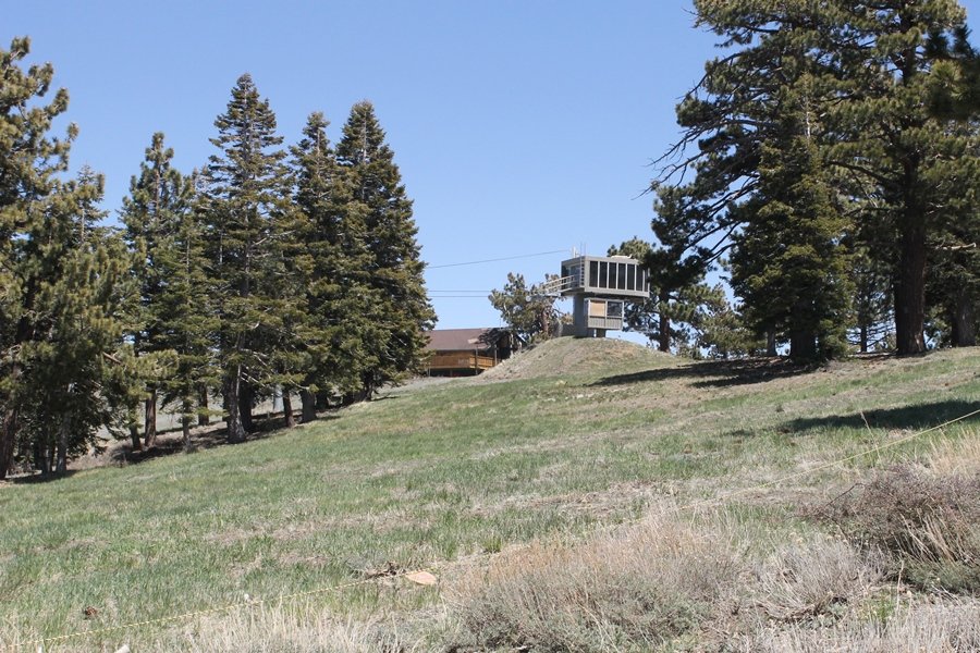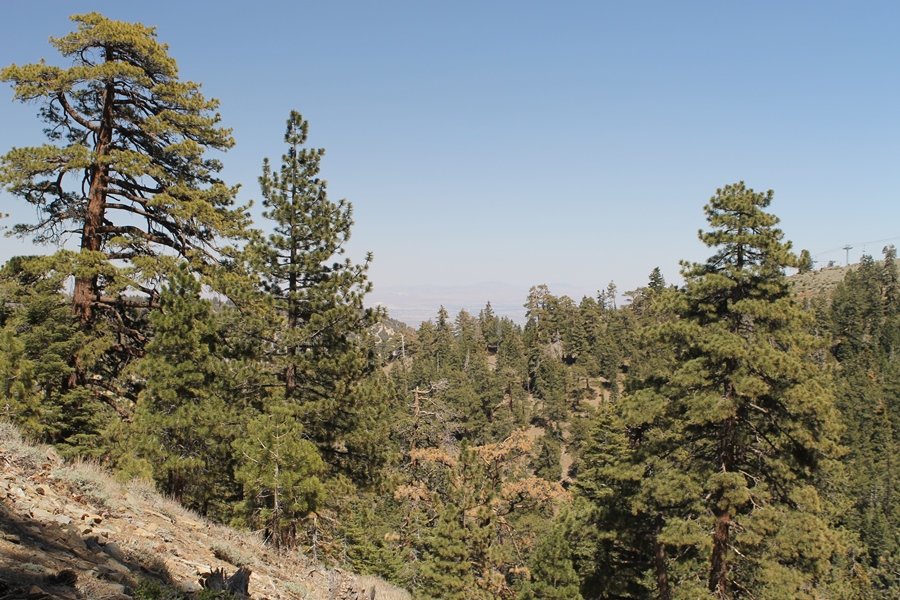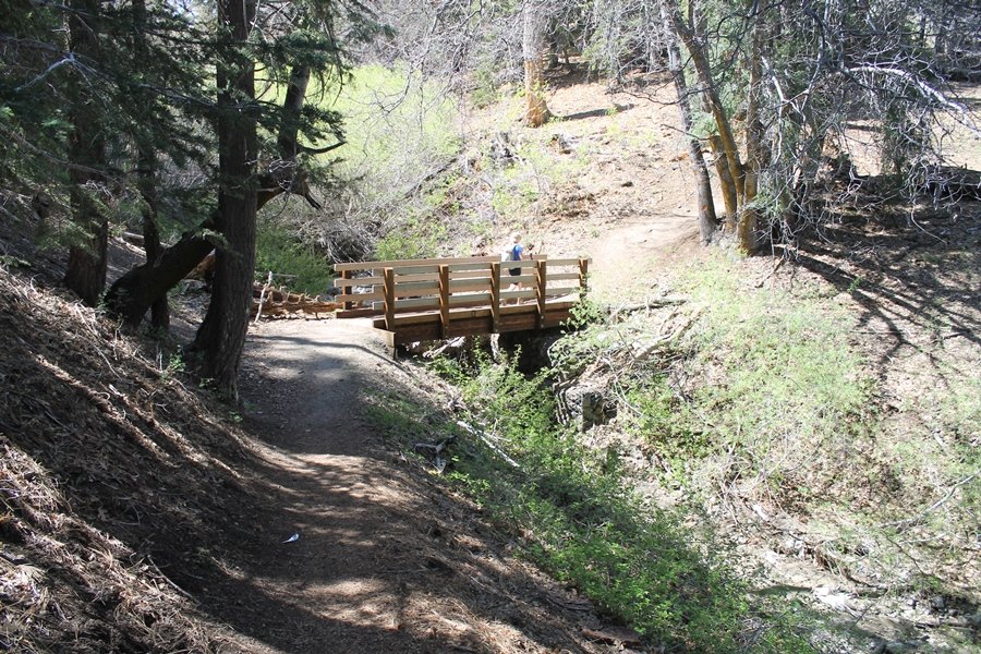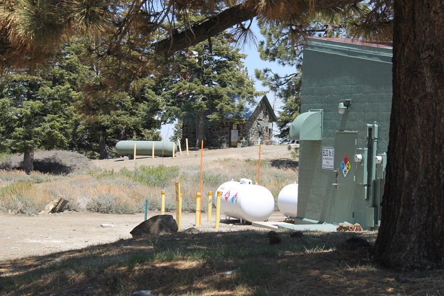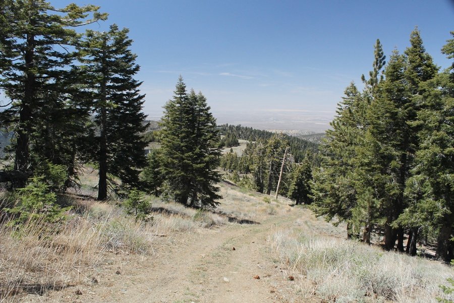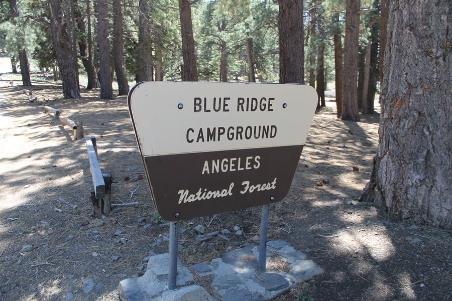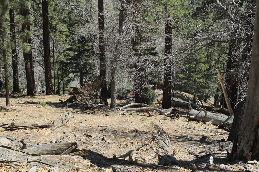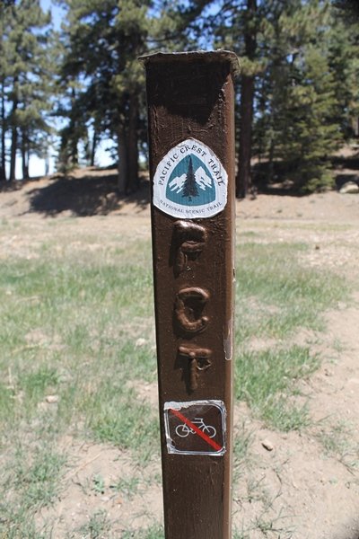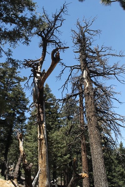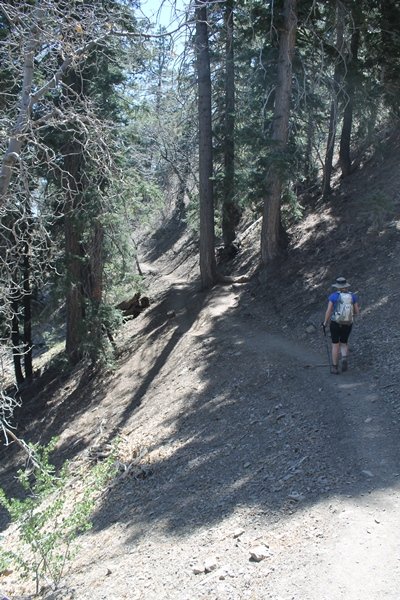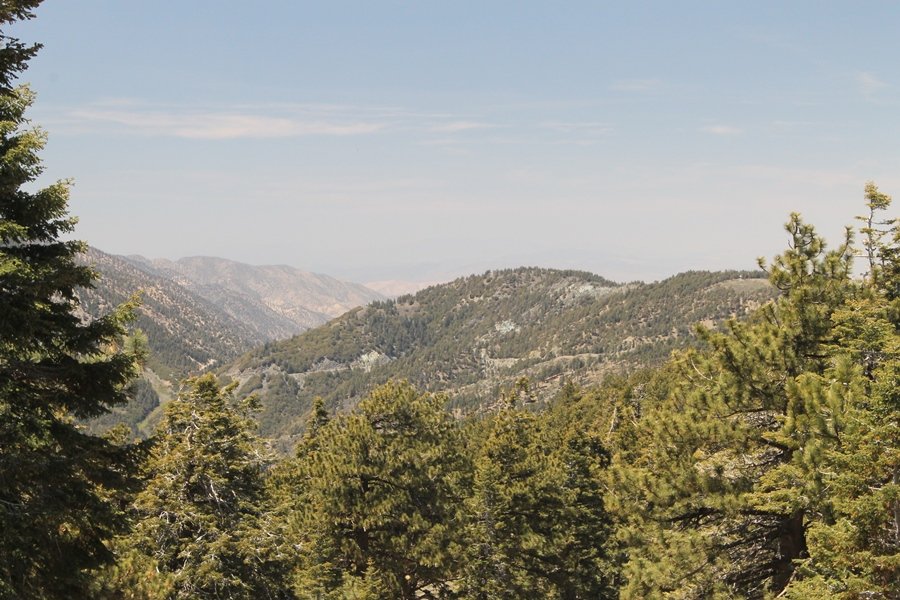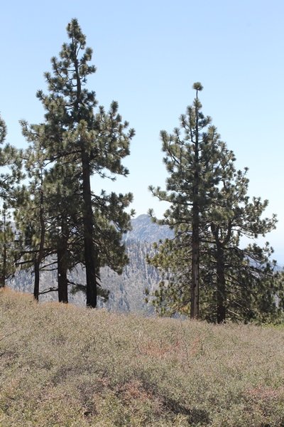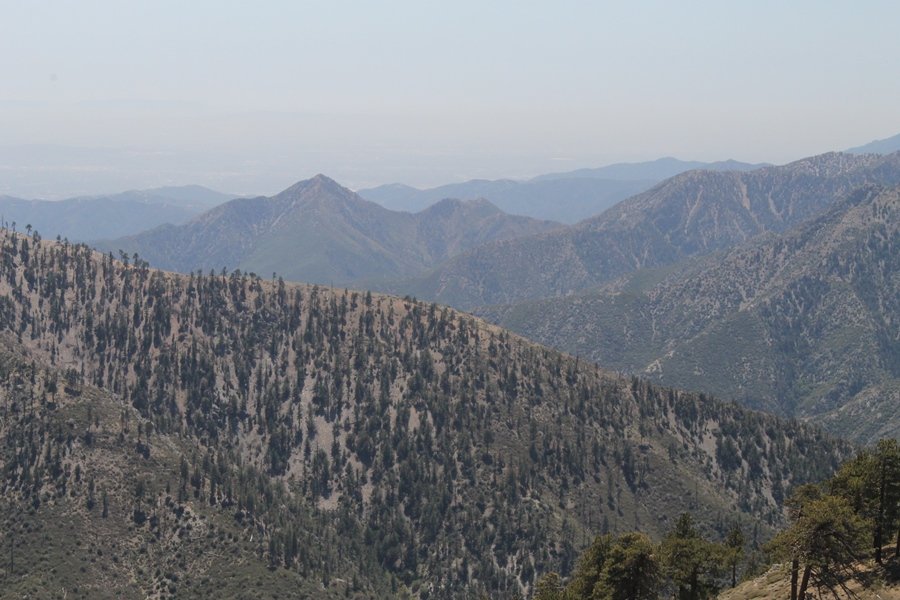 The eastern San Gabriels had gotten some snow the previous weekend, but whatever stuck had virtually disappeared by mid-week, and we were anxious to start exploring the area with vigor. Having not done anything at altitude for weeks, we decided to find something that would help us acclimate while still being a good workout. The Blue Ridge trail runs from the base of the Mountain High West ski area at Big Pines some two miles up the north face of Blue Ridge, terminating at a campground of the same name – another mile or so east of the campground is the unofficially-named Frost Peak, a prominent 8,405′ bump on Blue Ridge atop which is a large radio site. The Pacific Crest Trail (PCT) runs the entire length of Blue Ridge, so we figured we’d hike up to the campground, then follow the PCT eastward for some indeterminate distance before retracing our steps – in all, some 6-7 miles with about 2,000′ of elevation gain. We found the trailhead easily enough at the outlet of the west ski area parking lot and headed out about 11:30am, right away climbing moderately through some short switchbacks before trending more southeast in a more gentle traverse up the ridge. We encountered several parties heading down, each of whom had enjoyed cooler temperatures early in the day – by this time, the midday thermometer was close to 80 degrees, although the trail offered plenty of shade and a light breeze the whole way up. While at a definite incline, the trail gradient never felt too taxing – it was just the ticket for the acclimatizing workout we were after. After about an hour of hiking, we emerged atop the ridgeline at the base of a ski run and chairlift that dropped westward from a taller height to the east, and we found the campground just west of that point as well. We wandered through the empty campground looking for a nice lunch spot, choosing a table at the facility’s southern edge with views over the San Gabriel River drainage to the south – this would definitely be the spot to camp. We hadn’t seen any PCT signs yet, but as we wandered a little further south in search of better views, we found a well-groomed trail that we followed eastward, discovering a PCT marker where the trail entered the eastern ski area property. The trail winds its way east through the ski runs, eventually merging with the Blue Ridge road, a Forest Service route that closes in winter (but is now open given the absence of snow). A few hundred yards up the road, we found more PCT markers which we followed northward, contouring around a large catch basin above the ski area containing some water that didn’t look very fresh – with Frost Peak rising above us to the east and the PCT appearing to trend more along the north side of the ridge and away from its top, we veered up a steep 4WD access road that we followed to the summit. Frost Peak is so named for a benchmark designation on the topo map, and we passed the various antennae as we reached the broad and largely bare mountaintop, unsuccessfully searching for the survey monument. While various small mounds were probable monument locations, the large tree stump segment at the center of the summit clearing was the obvious highpoint, albeit an unnatural one – Chris climbed atop this to take some photos, although the 3-foot elevation gain did nothing to improve perspective. We poked around a bit through the radio facilities, noting several signs indicating continuous video surveillance of the equipment but finding no security fences or other measures – among the various structures was a stone house, and we wonder whether this was originally some sort of shelter that was later converted to its current use housing telecom gear. Wanting to take care of some business in Wrightwood before it got too late, we decided to head back, using a different access road for our descent but eventually reaching the same point on the Blue Ridge road at the catch basin. From here, it was all familiar terrain as we backtracked our way down the ridgeline, past the campground, and down the trail to the car. In all, we walked just under 7 miles, enjoying beautiful views and fantastic weather.