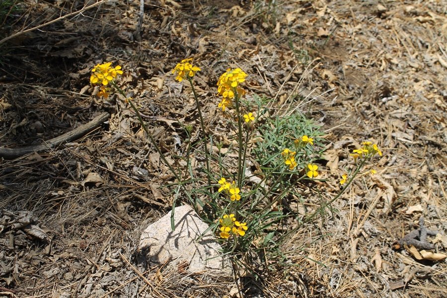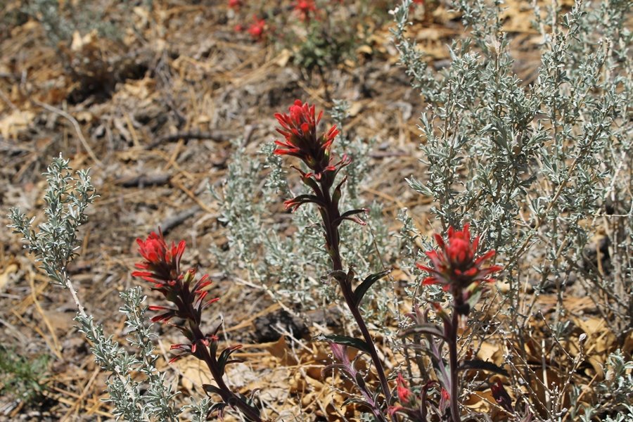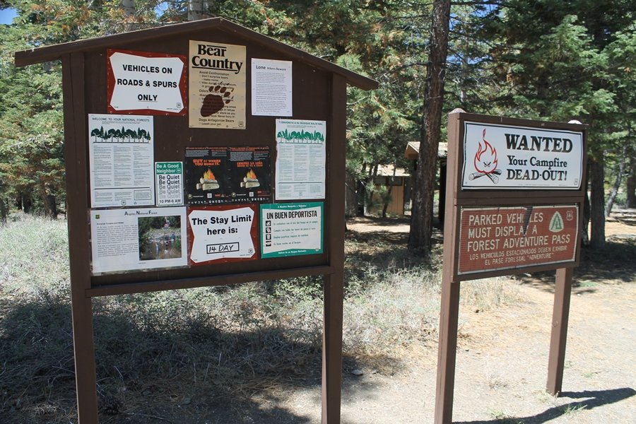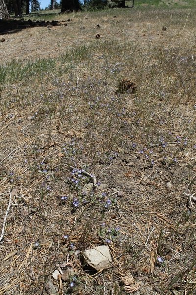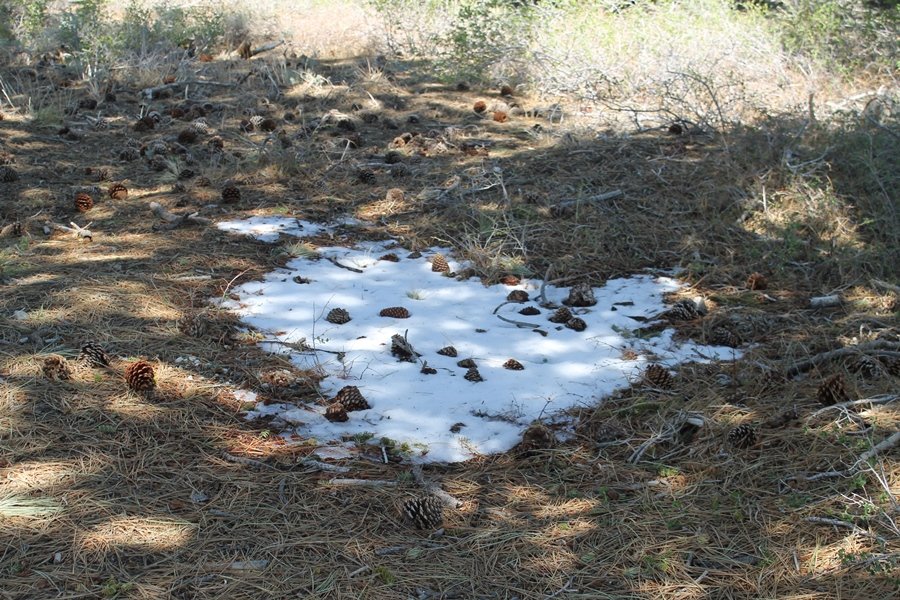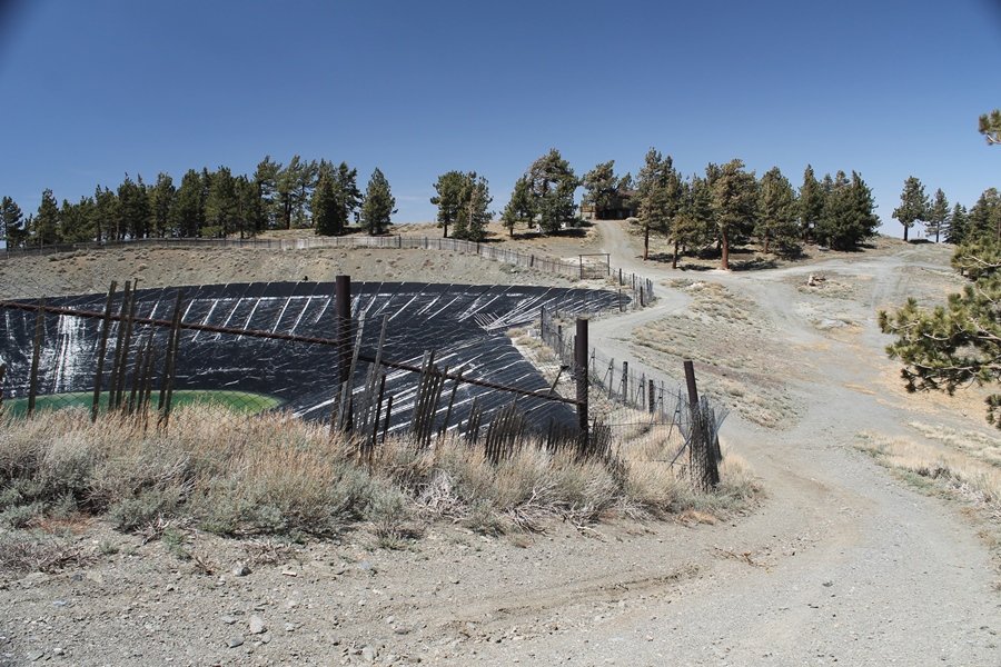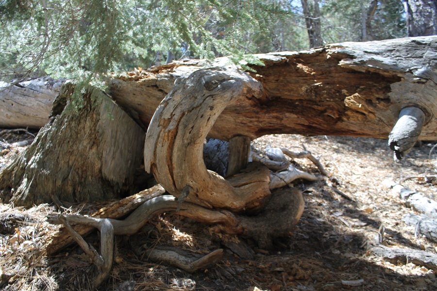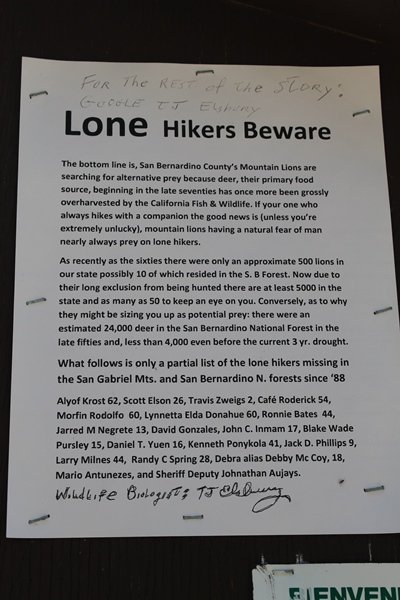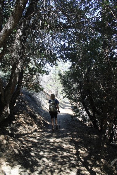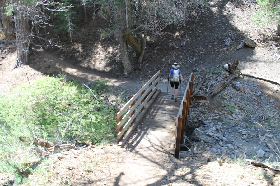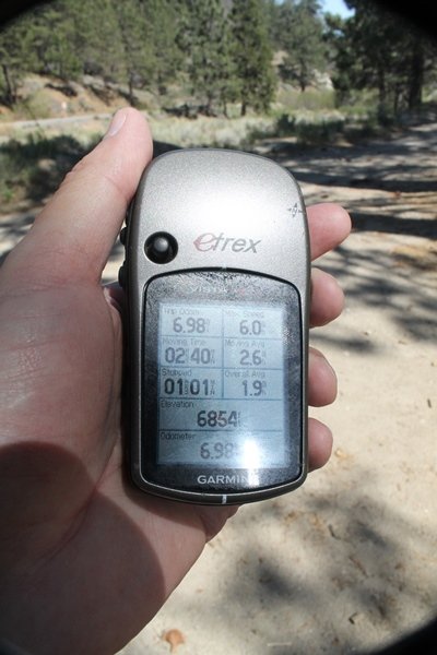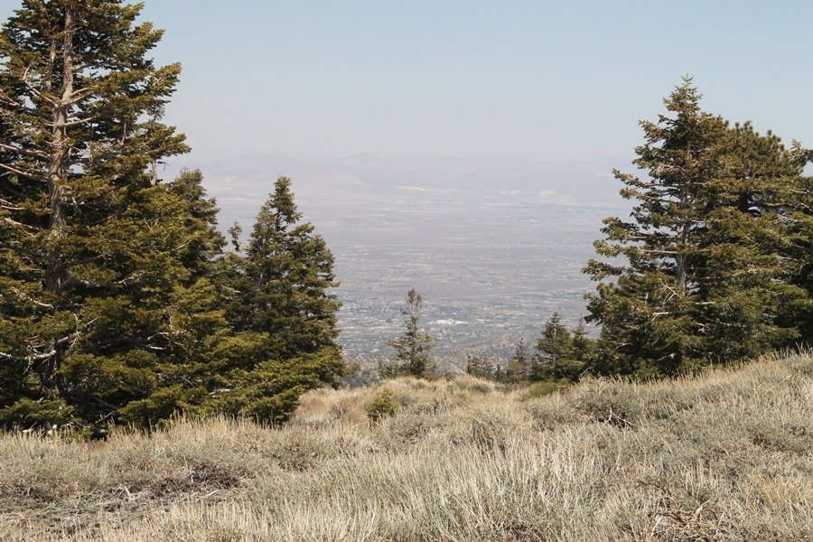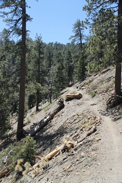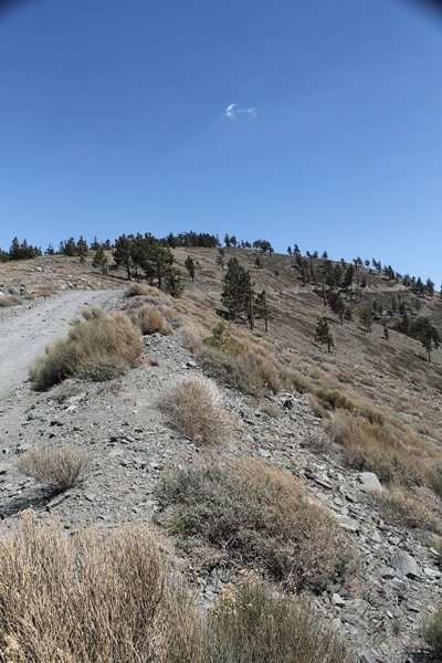The eastern San Gabriels had gotten some snow the previous weekend, but whatever stuck had virtually disappeared by mid-week, and we were anxious to start exploring the area with vigor. Having not done anything at altitude for weeks, we decided to find something that would help us acclimate while still being a good workout. The Blue Ridge trail runs from the base of the Mountain High West ski area at Big Pines some two miles up the north face of Blue Ridge, terminating at a campground of the same name – another mile or so east of the campground is the unofficially-named Frost Peak, a prominent 8,405′ bump on Blue Ridge atop which is a large radio site. The Pacific Crest Trail (PCT) runs the entire length of Blue Ridge, so we figured we’d hike up to the campground, then follow the PCT eastward for some indeterminate distance before retracing our steps – in all, some 6-7 miles with about 2,000′ of elevation gain. We found the trailhead easily enough at the outlet of the west ski area parking lot and headed out about 11:30am, right away climbing moderately through some short switchbacks before trending more southeast in a more gentle traverse up the ridge. We encountered several parties heading down, each of whom had enjoyed cooler temperatures early in the day – by this time, the midday thermometer was close to 80 degrees, although the trail offered plenty of shade and a light breeze the whole way up. While at a definite incline, the trail gradient never felt too taxing – it was just the ticket for the acclimatizing workout we were after. After about an hour of hiking, we emerged atop the ridgeline at the base of a ski run and chairlift that dropped westward from a taller height to the east, and we found the campground just west of that point as well. We wandered through the empty campground looking for a nice lunch spot, choosing a table at the facility’s southern edge with views over the San Gabriel River drainage to the south – this would definitely be the spot to camp. We hadn’t seen any PCT signs yet, but as we wandered a little further south in search of better views, we found a well-groomed trail that we followed eastward, discovering a PCT marker where the trail entered the eastern ski area property. The trail winds its way east through the ski runs, eventually merging with the Blue Ridge road, a Forest Service route that closes in winter (but is now open given the absence of snow). A few hundred yards up the road, we found more PCT markers which we followed northward, contouring around a large catch basin above the ski area containing some water that didn’t look very fresh – with Frost Peak rising above us to the east and the PCT appearing to trend more along the north side of the ridge and away from its top, we veered up a steep 4WD access road that we followed to the summit. Frost Peak is so named for a benchmark designation on the topo map, and we passed the various antennae as we reached the broad and largely bare mountaintop, unsuccessfully searching for the survey monument. While various small mounds were probable monument locations, the large tree stump segment at the center of the summit clearing was the obvious highpoint, albeit an unnatural one – Chris climbed atop this to take some photos, although the 3-foot elevation gain did nothing to improve perspective. We poked around a bit through the radio facilities, noting several signs indicating continuous video surveillance of the equipment but finding no security fences or other measures – among the various structures was a stone house, and we wonder whether this was originally some sort of shelter that was later converted to its current use housing telecom gear. Wanting to take care of some business in Wrightwood before it got too late, we decided to head back, using a different access road for our descent but eventually reaching the same point on the Blue Ridge road at the catch basin. From here, it was all familiar terrain as we backtracked our way down the ridgeline, past the campground, and down the trail to the car. In all, we walked just under 7 miles, enjoying beautiful views and fantastic weather.