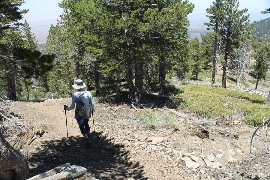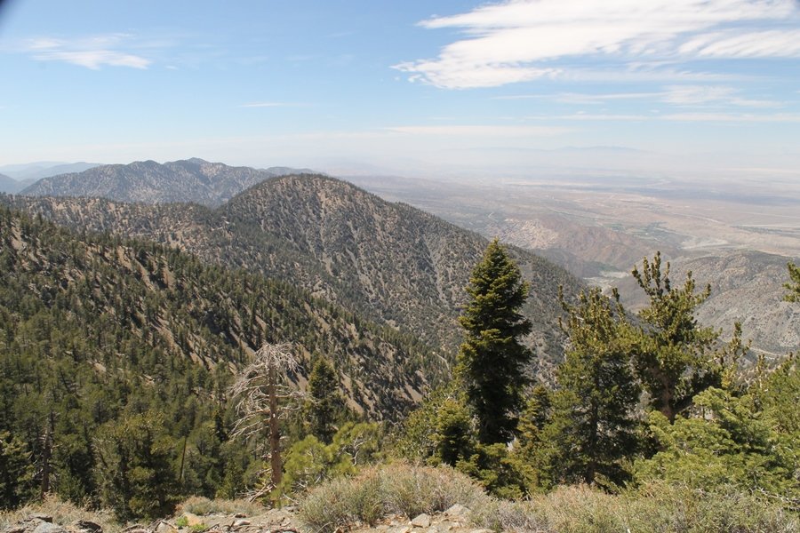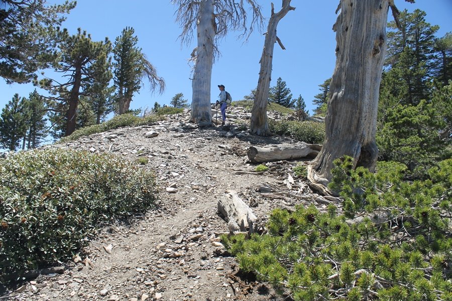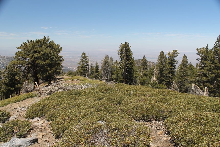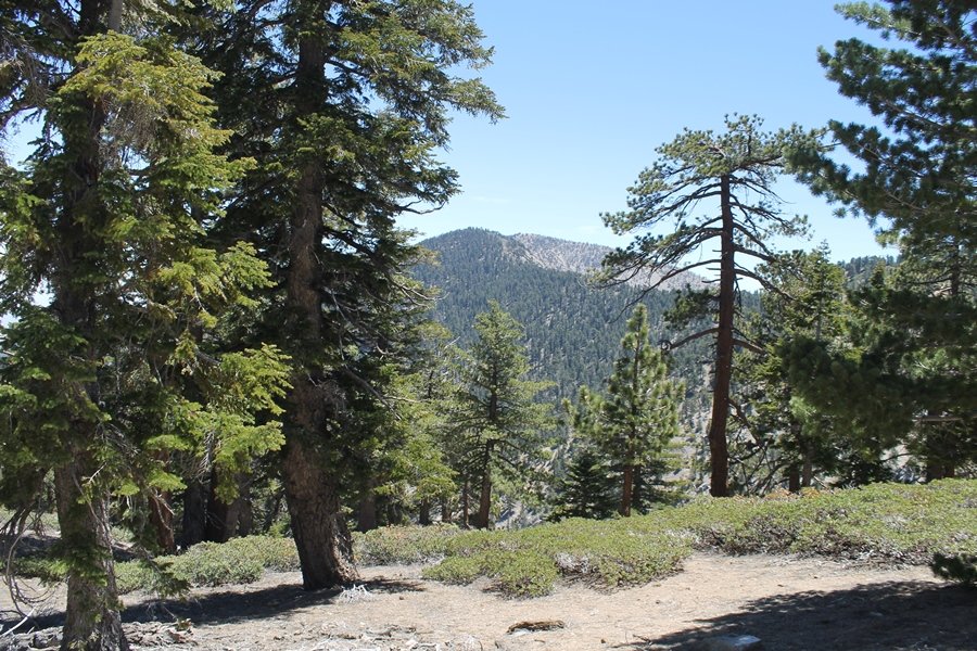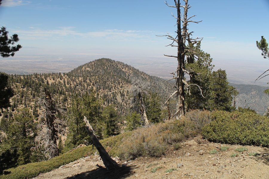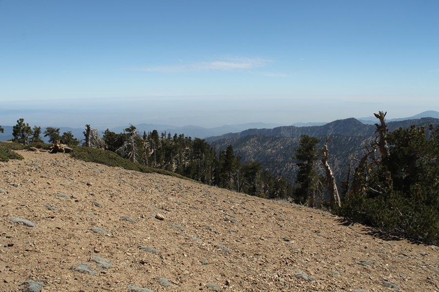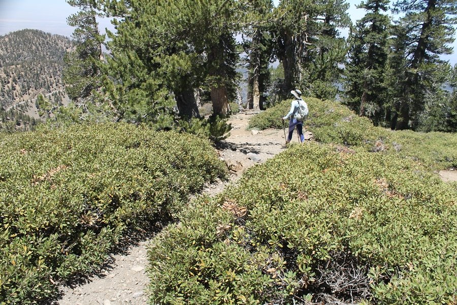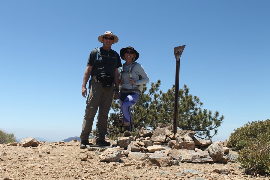 For a couple of weeks now, we had been talking about repeating our hike up Mt. Baden-Powell (9,399′), but adding a trip down the peak’s western ridgeline as well. We had also kicked around the idea of doing the hike in the reverse direction, from west to east. In either case, we’d need to shuttle a car to one end or the other, so we thought we’d make the trip when our kids were visiting earlier during our week-long stay in Wrightwood. Well, we ended up being busy with other family activities and didn’t get the hike in, so we decided instead to do it on our own, starting from Dawson Saddle in the west, making the 4-1/2 mile hike eastward to Baden-Powell, then retracing our steps back west. A bonus would be making short side trips to two other HPS-listed summits, Throop Peak (9,138′)and Mt. Burnham (8,997′), along the way. Based on mileage figures cited in various hiking guides, we figured the hike to be around 9 miles with about 2,000′ of elevation gain (our previous ascent of Baden-Powell last November from Vincent Gap was of similar length but with 40% more gain). Typically, we got a late start, arriving at Dawson Saddle about 11:30am – the day had warmed quite a bit, and it certainly felt hotter than the forecasted 66 degrees. We were looking for the Dawson Saddle trail, built by a team of Boy Scouts in the early 1980s who logged more than 3,000 work hours during its construction – this path would lead us south up Throop Peak’s north ridge to a junction with the PCT just east of the peak, which we’d climb via a short use trail. Then, we’d walk the PCT up to Baden-Powell, taking a similar use trail to tag Mt. Burnham about midway up the ridge. There was an obvious trail just across Hwy 2 from where we parked but no signage at all – we knew there were two trailheads here, an official one and a popular shortcut, but since this was the only one we had seen, we started up, knowing we’d get to the same place. After a couple of short, steep switchbacks, one of which was blocked by a fallen tree, we found the main trail, encountering a group of fathers and sons at the junction – they explained that the official trailhead was a few hundred yards east of where we had started, and that there was a large sign marked “Dawson Saddle Trail”. So much for our powers of observation – oh well. We left them behind as we made reasonable time up what turned out to be a moderate but very manageable grade, although Chris right away felt very tired on the steeper sections – his energy tank would be on fumes throughout the day, resulting in a slow pace well below our average. We reached the PCT after about an hour of walking, logging 2 miles in the process, and we found the use trail up Throop Peak, as well as a refreshing breeze, without any trouble. It took another 15 minutes or so to reach the summit, which offered amazing 360-degree views – there was a fair amount of detail visible not only on the hazy desert side but down in the smoggy Inland Empire as well, though we couldn’t see downtown LA as we could in November. We searched all over the summit area for a register but could not locate it – we settled instead for a summit self-portrait. After a few minutes taking in the views, we headed back down to the PCT, immediately setting out eastward into the saddle west of Mt. Burnham. Here, the trail follows close to the ridgeline, reminding us of the Reyes Peak trail in Los Padres NF above Ojai – at the bottom of the saddle, we dipped below 8,600′, meaning we had some 800′ to gain back to the Baden-Powell summit. Climbing out of the saddle, we left the ridgeline to round Mt. Burnham’s north shoulder, passing through what may be the prettiest forest we’ve walked through in the area to date – a couple of switchbacks brought us back south to the ridge’s crest, where we regained our southward views as well as found the use trail to Burnham’s summit. At the top, we found a campsite but no sign of a summit marker – however, Jane’s diligent searching turned up the register can, buried below a small pile of stones tucked beneath a large patch of buckthorn. By now it was about 2:30pm, and we figured it would take us at least another 45 minutes to get to Baden-Powell – we had left our dog, Frances, back at the cabin (locked inside since we have no fenced yard or dog run there), and we were concerned about leaving her alone for too long. After a brief rest, we headed out again, initially traversing the south side of the ridge for the first time before switching back up the slope and re-crossing the ridgeline to its north flank. From here, the PCT wound moderately upward, and before long we could see the bare crest of Baden-Powell’s NE ridge above us, where we knew from our previous visit the summit trail left the PCT. We paused at this junction to marvel at the tremendous views to the east – this vista, to which photographs can do no justice, is worth whatever effort is required to get here. We spied a lone hiker descending the summit trail above us, and we struck up a conversation with him as he approached – Eric McConnell was his name, aka Snakecharmer (his trail name so bestowed given his five encounters with rattlesnakes on his trip so far), today being his first back on the trail after taking two weeks off in Wrightwood to heal his badly blistered feet. He is the only PCT thru-hiker we’ve met on the trail to date, and we were full of questions about his experience so far – his sounds like a truly epic journey (as are pretty much all PCT thru-hikes), and we’ve included a link to his blog at right. He reminded us a lot of our son, Carter, and, after taking his photo, we wished him well as he continued the day’s walk to Little Jimmy Camp, some 7 miles west near Islip Saddle. We continued on up to the summit, staying only long enough to sign the register and snap four pictures (for more detail on Mt. Baden-Powell, please see our previous p