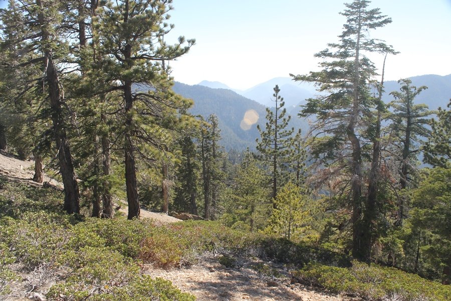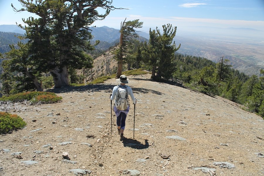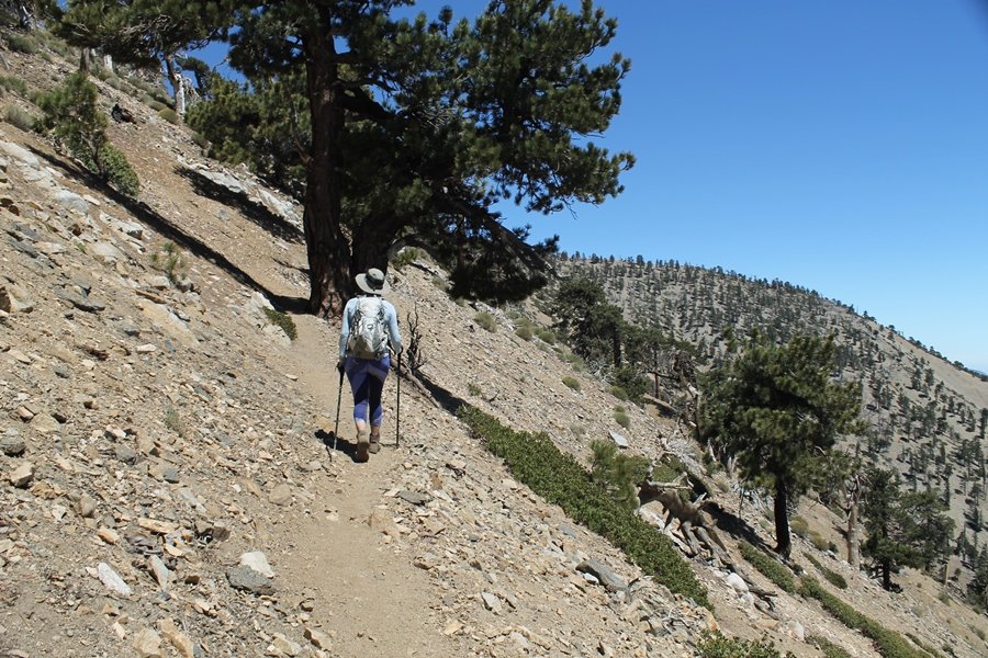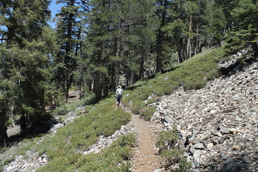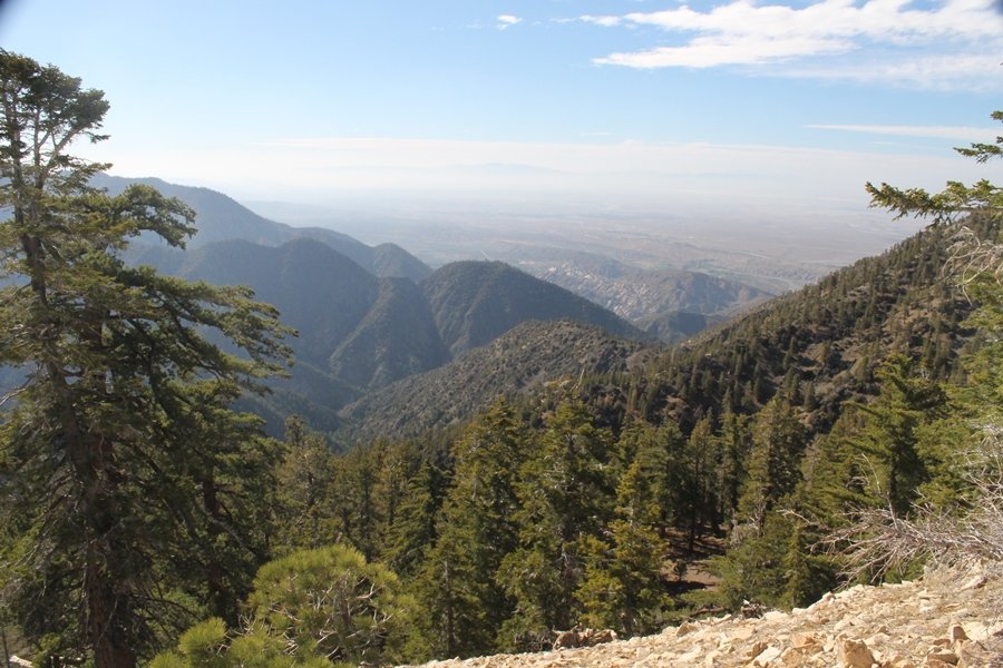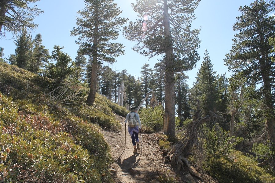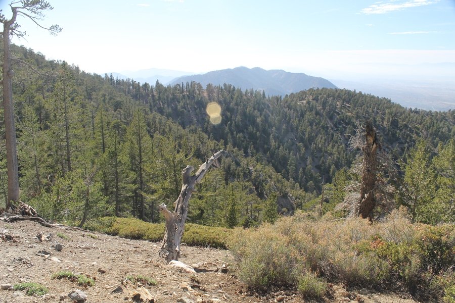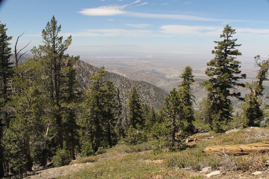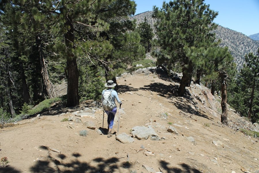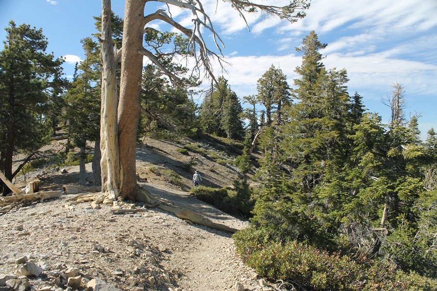 For a couple of weeks now, we had been talking about repeating our hike up Mt. Baden-Powell (9,399′), but adding a trip down the peak’s western ridgeline as well. We had also kicked around the idea of doing the hike in the reverse direction, from west to east. In either case, we’d need to shuttle a car to one end or the other, so we thought we’d make the trip when our kids were visiting earlier during our week-long stay in Wrightwood. Well, we ended up being busy with other family activities and didn’t get the hike in, so we decided instead to do it on our own, starting from Dawson Saddle in the west, making the 4-1/2 mile hike eastward to Baden-Powell, then retracing our steps back west. A bonus would be making short side trips to two other HPS-listed summits, Throop Peak (9,138′)and Mt. Burnham (8,997′), along the way. Based on mileage figures cited in various hiking guides, we figured the hike to be around 9 miles with about 2,000′ of elevation gain (our previous ascent of Baden-Powell last November from Vincent Gap was of similar length but with 40% more gain). Typically, we got a late start, arriving at Dawson Saddle about 11:30am – the day had warmed quite a bit, and it certainly felt hotter than the forecasted 66 degrees. We were looking for the Dawson Saddle trail, built by a team of Boy Scouts in the early 1980s who logged more than 3,000 work hours during its construction – this path would lead us south up Throop Peak’s north ridge to a junction with the PCT just east of the peak, which we’d climb via a short use trail. Then, we’d walk the PCT up to Baden-Powell, taking a similar use trail to tag Mt. Burnham about midway up the ridge. There was an obvious trail just across Hwy 2 from where we parked but no signage at all – we knew there were two trailheads here, an official one and a popular shortcut, but since this was the only one we had seen, we started up, knowing we’d get to the same place. After a couple of short, steep switchbacks, one of which was blocked by a fallen tree, we found the main trail, encountering a group of fathers and sons at the junction – they explained that the official trailhead was a few hundred yards east of where we had started, and that there was a large sign marked “Dawson Saddle Trail”. So much for our powers of observation – oh well. We left them behind as we made reasonable time up what turned out to be a moderate but very manageable grade, although Chris right away felt very tired on the steeper sections – his energy tank would be on fumes throughout the day, resulting in a slow pace well below our average. We reached the PCT after about an hour of walking, logging 2 miles in the process, and we found the use trail up Throop Peak, as well as a refreshing breeze, without any trouble. It took another 15 minutes or so to reach the summit, which offered amazing 360-degree views – there was a fair amount of detail visible not only on the hazy desert side but down in the smoggy Inland Empire as well, though we couldn’t see downtown LA as we could in November. We searched all over the summit area for a register but could not locate it – we settled instead for a summit self-portrait. After a few minutes taking in the views, we headed back down to the PCT, immediately setting out eastward into the saddle west of Mt. Burnham. Here, the trail follows close to the ridgeline, reminding us of the Reyes Peak trail in Los Padres NF above Ojai – at the bottom of the saddle, we dipped below 8,600′, meaning we had some 800′ to gain back to the Baden-Powell summit. Climbing out of the saddle, we left the ridgeline to round Mt. Burnham’s north shoulder, passing through what may be the prettiest forest we’ve walked through in the area to date – a couple of switchbacks brought us back south to the ridge’s crest, where we regained our southward views as well as found the use trail to Burnham’s summit. At the top, we found a campsite but no sign of a summit marker – however, Jane’s diligent searching turned up the register can, buried below a small pile of stones tucked beneath a large patch of buckthorn. By now it was about 2:30pm, and we figured it would take us at least another 45 minutes to get to Baden-Powell – we had left our dog, Frances, back at the cabin (locked inside since we have no fenced yard or dog run there), and we were concerned about leaving her alone for too long. After a brief rest, we headed out again, initially traversing the south side of the ridge for the first time before switching back up the slope and re-crossing the ridgeline to its north flank. From here, the PCT wound moderately upward, and before long we could see the bare crest of Baden-Powell’s NE ridge above us, where we knew from our previous visit the summit trail left the PCT. We paused at this junction to marvel at the tremendous views to the east – this vista, to which photographs can do no justice, is worth whatever effort is required to get here. We spied a lone hiker descending the summit trail above us, and we struck up a conversation with him as he approached – Eric McConnell was his name, aka Snakecharmer (his trail name so bestowed given his five encounters with rattlesnakes on his trip so far), today being his first back on the trail after taking two weeks off in Wrightwood to heal his badly blistered feet. He is the only PCT thru-hiker we’ve met on the trail to date, and we were full of questions about his experience so far – his sounds like a truly epic journey (as are pretty much all PCT thru-hikes), and we’ve included a link to his blog at right. He reminded us a lot of our son, Carter, and, after taking his photo, we wished him well as he continued the day’s walk to Little Jimmy Camp, some 7 miles west near Islip Saddle. We continued on up to the summit, staying only long enough to sign the register and snap four pictures (for more detail on Mt. Baden-Powell, please see our previous p