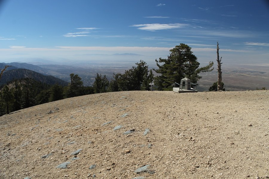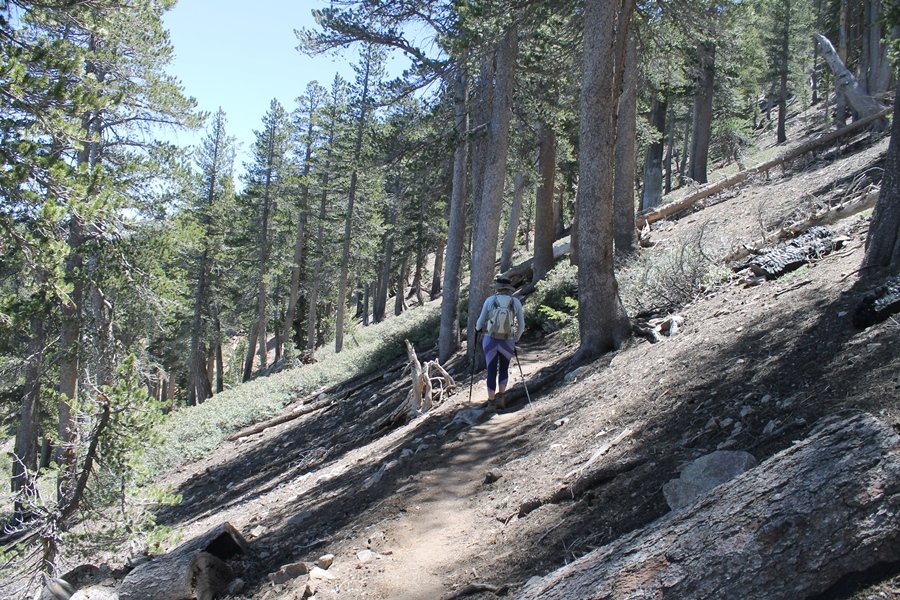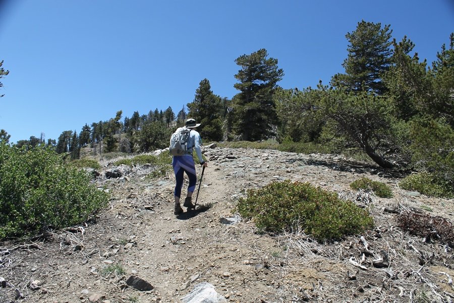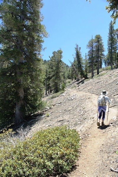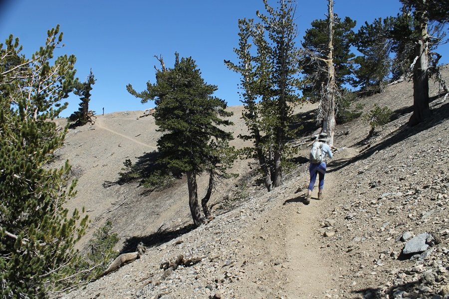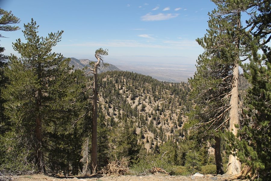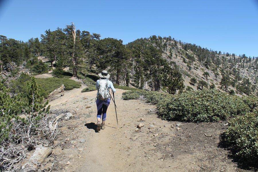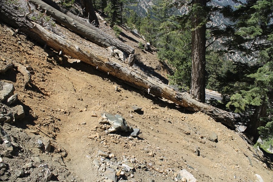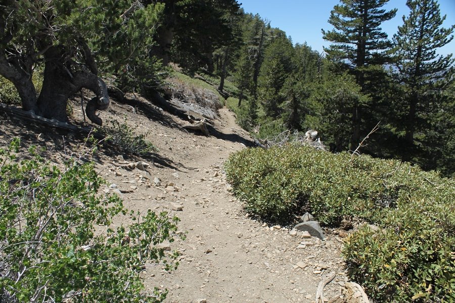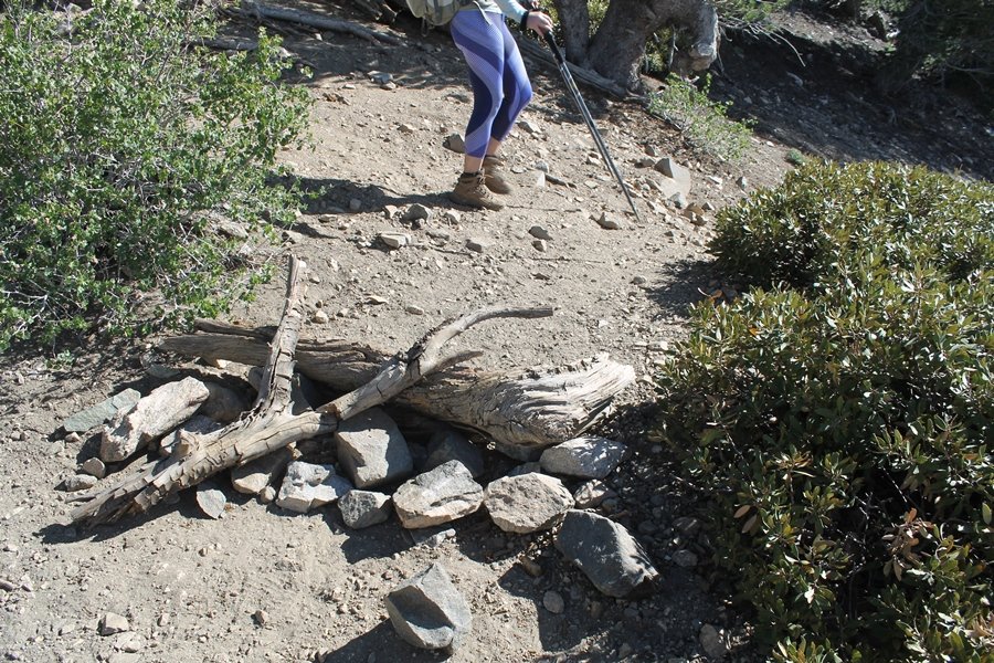 For a couple of weeks now, we had been talking about repeating our hike up Mt. Baden-Powell (9,399′), but adding a trip down the peak’s western ridgeline as well. We had also kicked around the idea of doing the hike in the reverse direction, from west to east. In either case, we’d need to shuttle a car to one end or the other, so we thought we’d make the trip when our kids were visiting earlier during our week-long stay in Wrightwood. Well, we ended up being busy with other family activities and didn’t get the hike in, so we decided instead to do it on our own, starting from Dawson Saddle in the west, making the 4-1/2 mile hike eastward to Baden-Powell, then retracing our steps back west. A bonus would be making short side trips to two other HPS-listed summits, Throop Peak (9,138′)and Mt. Burnham (8,997′), along the way. Based on mileage figures cited in various hiking guides, we figured the hike to be around 9 miles with about 2,000′ of elevation gain (our previous ascent of Baden-Powell last November from Vincent Gap was of similar length but with 40% more gain). Typically, we got a late start, arriving at Dawson Saddle about 11:30am – the day had warmed quite a bit, and it certainly felt hotter than the forecasted 66 degrees. We were looking for the Dawson Saddle trail, built by a team of Boy Scouts in the early 1980s who logged more than 3,000 work hours during its construction – this path would lead us south up Throop Peak’s north ridge to a junction with the PCT just east of the peak, which we’d climb via a short use trail. Then, we’d walk the PCT up to Baden-Powell, taking a similar use trail to tag Mt. Burnham about midway up the ridge. There was an obvious trail just across Hwy 2 from where we parked but no signage at all – we knew there were two trailheads here, an official one and a popular shortcut, but since this was the only one we had seen, we started up, knowing we’d get to the same place. After a couple of short, steep switchbacks, one of which was blocked by a fallen tree, we found the main trail, encountering a group of fathers and sons at the junction – they explained that the official trailhead was a few hundred yards east of where we had started, and that there was a large sign marked “Dawson Saddle Trail”. So much for our powers of observation – oh well. We left them behind as we made reasonable time up what turned out to be a moderate but very manageable grade, although Chris right away felt very tired on the steeper sections – his energy tank would be on fumes throughout the day, resulting in a slow pace well below our average. We reached the PCT after about an hour of walking, logging 2 miles in the process, and we found the use trail up Throop Peak, as well as a refreshing breeze, without any trouble. It took another 15 minutes or so to reach the summit, which offered amazing 360-degree views – there was a fair amount of detail visible not only on the hazy desert side but down in the smoggy Inland Empire as well, though we couldn’t see downtown LA as we could in November. We searched all over the summit area for a register but could not locate it – we settled instead for a summit self-portrait. After a few minutes taking in the views, we headed back down to the PCT, immediately setting out eastward into the saddle west of Mt. Burnham. Here, the trail follows close to the ridgeline, reminding us of the Reyes Peak trail in Los Padres NF above Ojai – at the bottom of the saddle, we dipped below 8,600′, meaning we had some 800′ to gain back to the Baden-Powell summit. Climbing out of the saddle, we left the ridgeline to round Mt. Burnham’s north shoulder, passing through what may be the prettiest forest we’ve walked through in the area to date – a couple of switchbacks brought us back south to the ridge’s crest, where we regained our southward views as well as found the use trail to Burnham’s summit. At the top, we found a campsite but no sign of a summit marker – however, Jane’s diligent searching turned up the register can, buried below a small pile of stones tucked beneath a large patch of buckthorn. By now it was about 2:30pm, and we figured it would take us at least another 45 minutes to get to Baden-Powell – we had left our dog, Frances, back at the cabin (locked inside since we have no fenced yard or dog run there), and we were concerned about leaving her alone for too long. After a brief rest, we headed out again, initially traversing the south side of the ridge for the first time before switching back up the slope and re-crossing the ridgeline to its north flank. From here, the PCT wound moderately upward, and before long we could see the bare crest of Baden-Powell’s NE ridge above us, where we knew from our previous visit the summit trail left the PCT. We paused at this junction to marvel at the tremendous views to the east – this vista, to which photographs can do no justice, is worth whatever effort is required to get here. We spied a lone hiker descending the summit trail above us, and we struck up a conversation with him as he approached – Eric McConnell was his name, aka Snakecharmer (his trail name so bestowed given his five encounters with rattlesnakes on his trip so far), today being his first back on the trail after taking two weeks off in Wrightwood to heal his badly blistered feet. He is the only PCT thru-hiker we’ve met on the trail to date, and we were full of questions about his experience so far – his sounds like a truly epic journey (as are pretty much all PCT thru-hikes), and we’ve included a link to his blog at right. He reminded us a lot of our son, Carter, and, after taking his photo, we wished him well as he continued the day’s walk to Little Jimmy Camp, some 7 miles west near Islip Saddle. We continued on up to the summit, staying only long enough to sign the register and snap four pictures (for more detail on Mt. Baden-Powell, please see our previous p