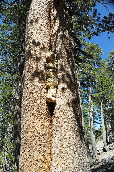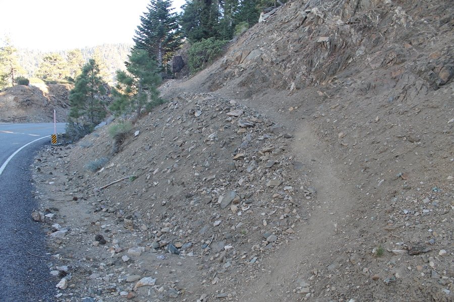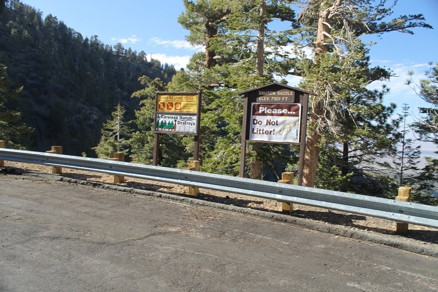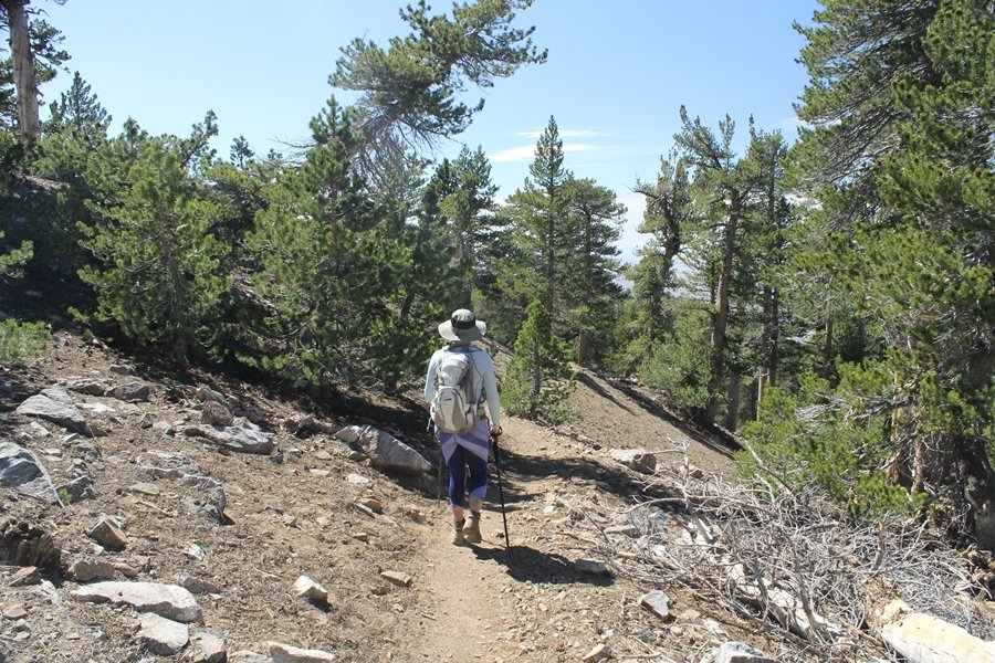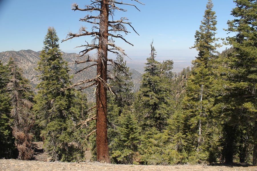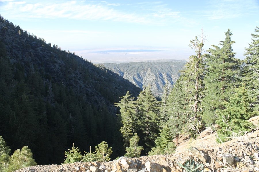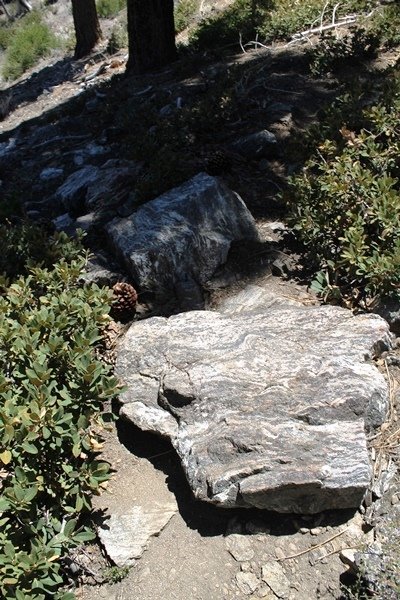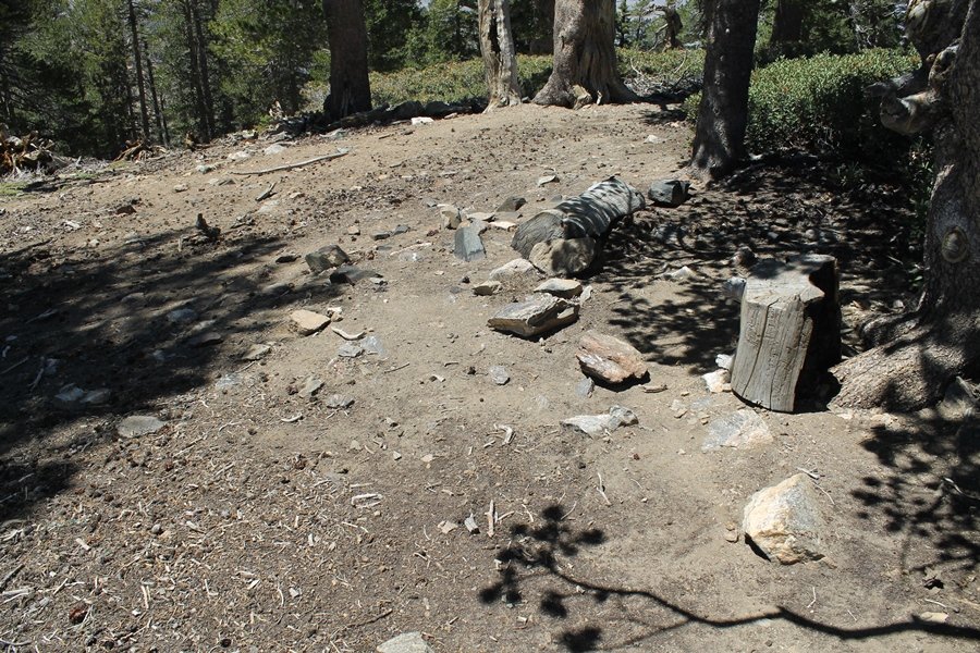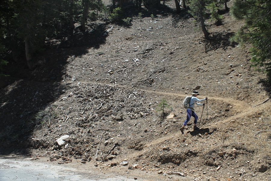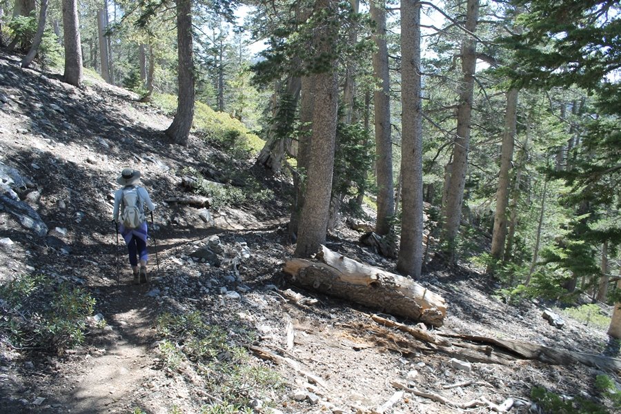For a couple of weeks now, we had been talking about repeating our hike up Mt. Baden-Powell (9,399′), but adding a trip down the peak’s western ridgeline as well. We had also kicked around the idea of doing the hike in the reverse direction, from west to east. In either case, we’d need to shuttle a car to one end or the other, so we thought we’d make the trip when our kids were visiting earlier during our week-long stay in Wrightwood. Well, we ended up being busy with other family activities and didn’t get the hike in, so we decided instead to do it on our own, starting from Dawson Saddle in the west, making the 4-1/2 mile hike eastward to Baden-Powell, then retracing our steps back west. A bonus would be making short side trips to two other HPS-listed summits, Throop Peak (9,138′)and Mt. Burnham (8,997′), along the way. Based on mileage figures cited in various hiking guides, we figured the hike to be around 9 miles with about 2,000′ of elevation gain (our previous ascent of Baden-Powell last November from Vincent Gap was of similar length but with 40% more gain). Typically, we got a late start, arriving at Dawson Saddle about 11:30am – the day had warmed quite a bit, and it certainly felt hotter than the forecasted 66 degrees. We were looking for the Dawson Saddle trail, built by a team of Boy Scouts in the early 1980s who logged more than 3,000 work hours during its construction – this path would lead us south up Throop Peak’s north ridge to a junction with the PCT just east of the peak, which we’d climb via a short use trail. Then, we’d walk the PCT up to Baden-Powell, taking a similar use trail to tag Mt. Burnham about midway up the ridge. There was an obvious trail just across Hwy 2 from where we parked but no signage at all – we knew there were two trailheads here, an official one and a popular shortcut, but since this was the only one we had seen, we started up, knowing we’d get to the same place. After a couple of short, steep switchbacks, one of which was blocked by a fallen tree, we found the main trail, encountering a group of fathers and sons at the junction – they explained that the official trailhead was a few hundred yards east of where we had started, and that there was a large sign marked “Dawson Saddle Trail”. So much for our powers of observation – oh well. We left them behind as we made reasonable time up what turned out to be a moderate but very manageable grade, although Chris right away felt very tired on the steeper sections – his energy tank would be on fumes throughout the day, resulting in a slow pace well below our average. We reached the PCT after about an hour of walking, logging 2 miles in the process, and we found the use trail up Throop Peak, as well as a refreshing breeze, without any trouble. It took another 15 minutes or so to reach the summit, which offered amazing 360-degree views – there was a fair amount of detail visible not only on the hazy desert side but down in the smoggy Inland Empire as well, though we couldn’t see downtown LA as we could in November. We searched all over the summit area for a register but could not locate it – we settled instead for a summit self-portrait. After a few minutes taking in the views, we headed back down to the PCT, immediately setting out eastward into the saddle west of Mt. Burnham. Here, the trail follows close to the ridgeline, reminding us of the Reyes Peak trail in Los Padres NF above Ojai – at the bottom of the saddle, we dipped below 8,600′, meaning we had some 800′ to gain back to the Baden-Powell summit. Climbing out of the saddle, we left the ridgeline to round Mt. Burnham’s north shoulder, passing through what may be the prettiest forest we’ve walked through in the area to date – a couple of switchbacks brought us back south to the ridge’s crest, where we regained our southward views as well as found the use trail to Burnham’s summit. At the top, we found a campsite but no sign of a summit marker – however, Jane’s diligent searching turned up the register can, buried below a small pile of stones tucked beneath a large patch of buckthorn. By now it was about 2:30pm, and we figured it would take us at least another 45 minutes to get to Baden-Powell – we had left our dog, Frances, back at the cabin (locked inside since we have no fenced yard or dog run there), and we were concerned about leaving her alone for too long. After a brief rest, we headed out again, initially traversing the south side of the ridge for the first time before switching back up the slope and re-crossing the ridgeline to its north flank. From here, the PCT wound moderately upward, and before long we could see the bare crest of Baden-Powell’s NE ridge above us, where we knew from our previous visit the summit trail left the PCT. We paused at this junction to marvel at the tremendous views to the east – this vista, to which photographs can do no justice, is worth whatever effort is required to get here. We spied a lone hiker descending the summit trail above us, and we struck up a conversation with him as he approached – Eric McConnell was his name, aka Snakecharmer (his trail name so bestowed given his five encounters with rattlesnakes on his trip so far), today being his first back on the trail after taking two weeks off in Wrightwood to heal his badly blistered feet. He is the only PCT thru-hiker we’ve met on the trail to date, and we were full of questions about his experience so far – his sounds like a truly epic journey (as are pretty much all PCT thru-hikes), and we’ve included a link to his blog at right. He reminded us a lot of our son, Carter, and, after taking his photo, we wished him well as he continued the day’s walk to Little Jimmy Camp, some 7 miles west near Islip Saddle. We continued on up to the summit, staying only long enough to sign the register and snap four pictures (for more detail on Mt. Baden-Powell, please see our previous p
