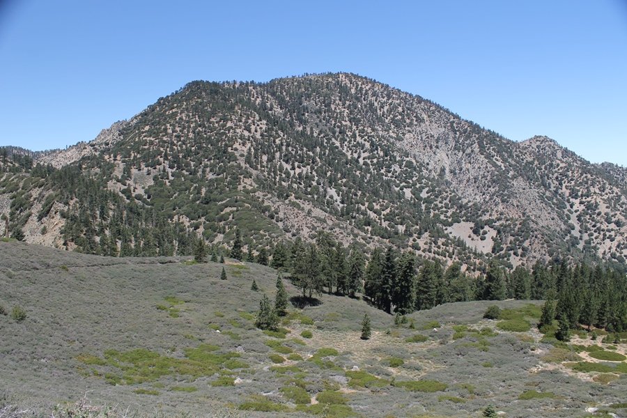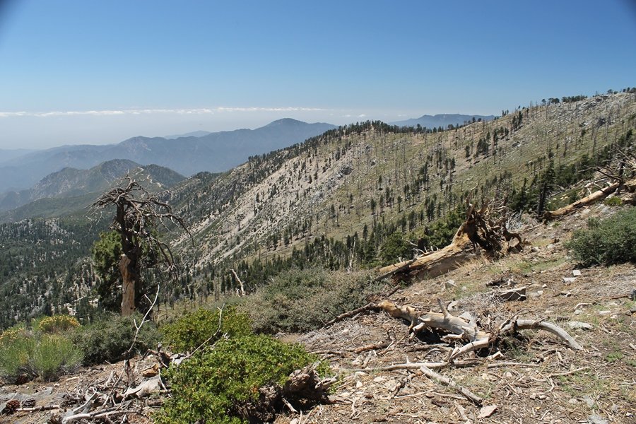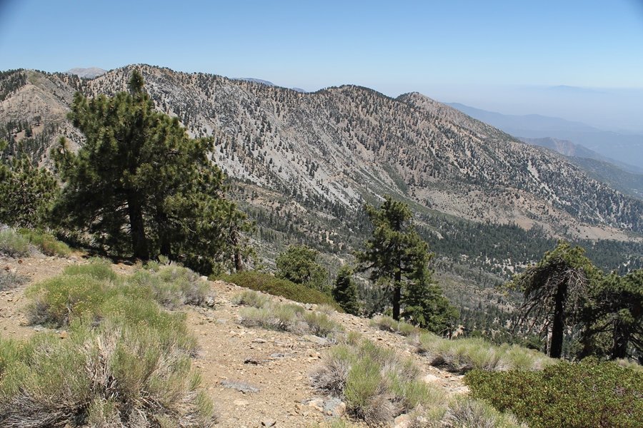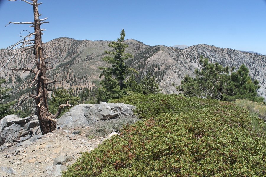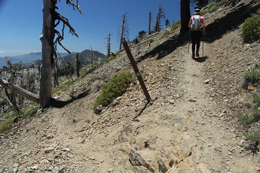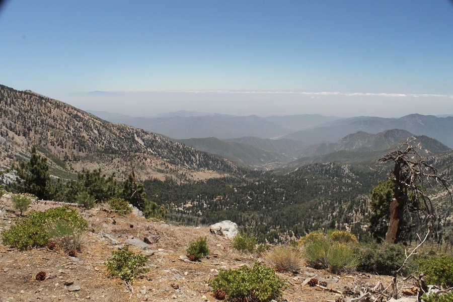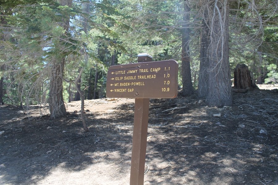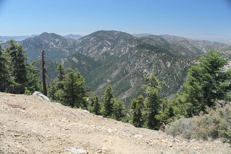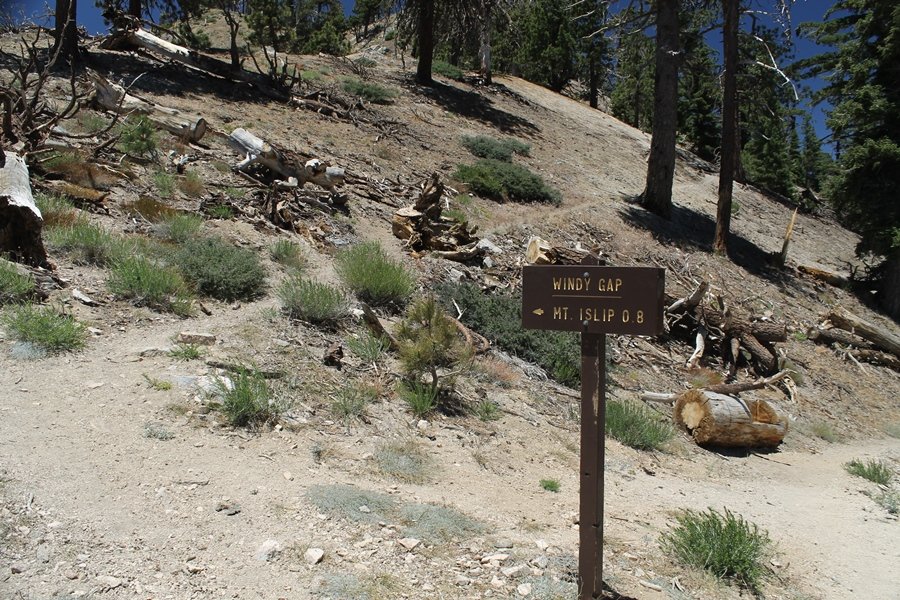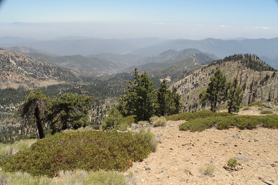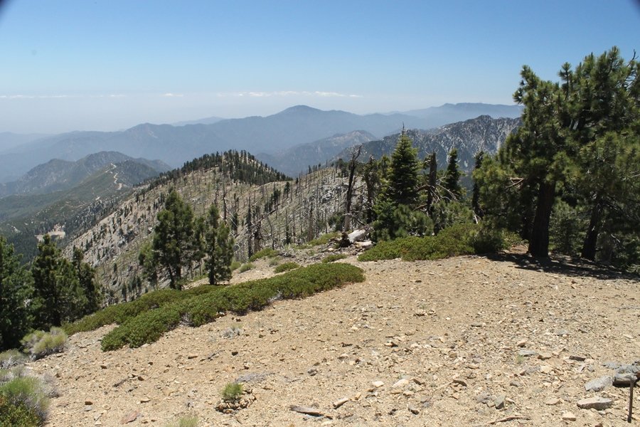 In Wrightwood again for the weekend, we decided to try and do two hikes on opposite sides of Islip Saddle, a point 30 minutes west of Wrightwood at which Hwy 2 crosses the Angeles Crest and the PCT west of the Mt. Baden-Powell area. East of the saddle lies its namesake, Mt. Islip, elev. 8,250′ (Islip is pronounced “eye-slip”), reached via the PCT eastbound, and west of the saddle is Mt. Williamson, elev. 8,244′, accessed via the PCT westbound. The HPS guide cites the Islip hike at 6-1/2 roundtrip miles while Williamson is only 5 – we figured we’d choose whichever peak when we got to the trailheads. We could see a pretty solid cloud cover to the south as we drove through the mountains and thought that might make for some cool pictures, deciding that Mt. Islip would be today’s destination since it offers more open views to the south, and we arrived at Islip Saddle about 11:30am. As we prepared to leave the parking area, a couple of young men came down the trail, one of whom was in running tights and carrying a very small pack – we found out from other hikers we met later that this fellow is attempting to break the world record for a PCT thru-hike, and that he is typically covering about 43 miles a day. Our goal was much less ambitious, and we proceeded east up the trail, first through a handful of switchbacks before circling around a large brushy meadow on the northwest shoulder of Mt. Islip. The trail was initially a bit steeper than we had expected, gaining about 800′ in its first mile – however, after crossing a forest service access road, the trail leveled out considerably and the walking became an effortless stroll in the woods. As we completed our second mile, we caught up with a group of dads and young kids, each burdened with a full pack for a weekend stay at Little Jimmy Campground, a walk-in facility just ahead – within five minutes of passing the group, we arrived at the campground, popular among PCTers with its level campsites and reliable water nearby at Little Jimmy Spring. Continuing east, we passed a side trail to the spring and began climbing more directly to Windy Gap, a low saddle on the crest between Mts. Islip on the west and Hawkins to the east – while the PCT continues eastward up the ridgeline, another trail drops into the drainage to the south, a pretty bowl containing Crystal Lake, the only naturally-occurring lake in the San Gabriels. The gap lived up to its name, with a stiff breeze blowing that cooled us off on this warm day. After a snapping a couple of photos, we turned west and headed up the signed Mt. Islip trail, a narrow path that climbed sharply at first but leveled out after a pair of switchbacks, following the gentle ridgeline westward. Mt. Islip’s conical profile could be seen ahead of us, and the trail shifted to the south side of the ridge as we neared the base of the summit bump. The Crystal Lake basin and much of the surrounding ridges burned in the Curve Fire of 2002, and we had a full panorama of the fire’s damage in this area – we’ve heard that it takes some 75 years for forests here to fully recover, a figure that seems probable given the still-denuded slopes more than a decade after the fire. We passed through large fields of low buckthorn and manzanita, eventually reaching a switchback that doubled us back eastward to the summit itself. There was a fire lookout here for many years, and the foundations of the lookout remain, as do the stone walls of a storage building built just off the north side of the summit. The 360-degree views were amazing, although the southern cloud cover we had been expecting had mostly burned off to reveal the perennial layer of smog over the Inland Empire instead. The mountains, however, were displayed all round in stunning clarity – Twin Peaks and Waterman Mountain to the southwest, the Williamson group immediately to the west across Islip Saddle, and Throop Peak to the east. To the southeast was Hawkins Ridge, consisting of four peaks – Mount Hawkins, Sadie Hawkins, Middle Hawkins, and South Hawkins from north to south (we understand these peaks were all named nearly a century ago after a popular waitress at a restaurant near Crystal Lake, and the HPS guide notes that “she must have been quite a gal” – indeed). We spent about 30 minutes at the summit taking in the views before retracing our steps back down the ridge to Windy Gap. On our way west, we took the side trip to Little Jimmy Spring where we again met the backpacking dads and kids filling up their water bottles. The walk back to the trailhead was very pleasant and passed quickly, and we made it back to the Jeep by 3:30pm. The GPS logged the trip at 7.25 miles, so a little longer than planned – a very nice hike, though this time of year it’s advisable to get an earlier start to beat the heat.