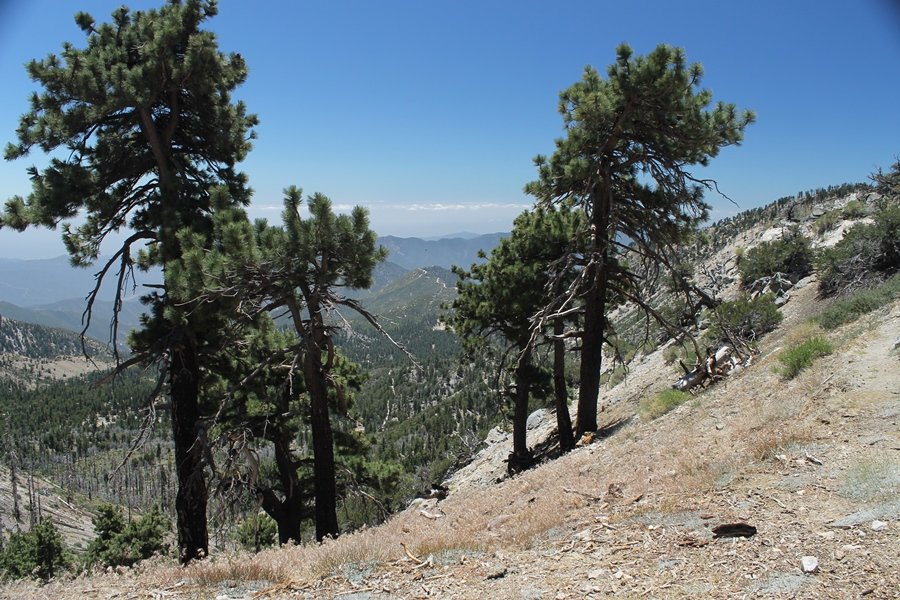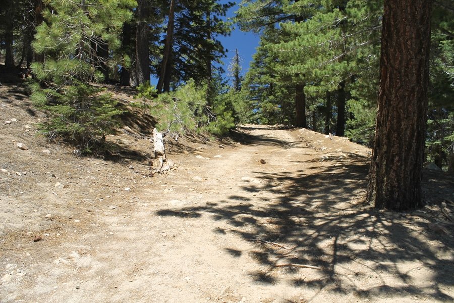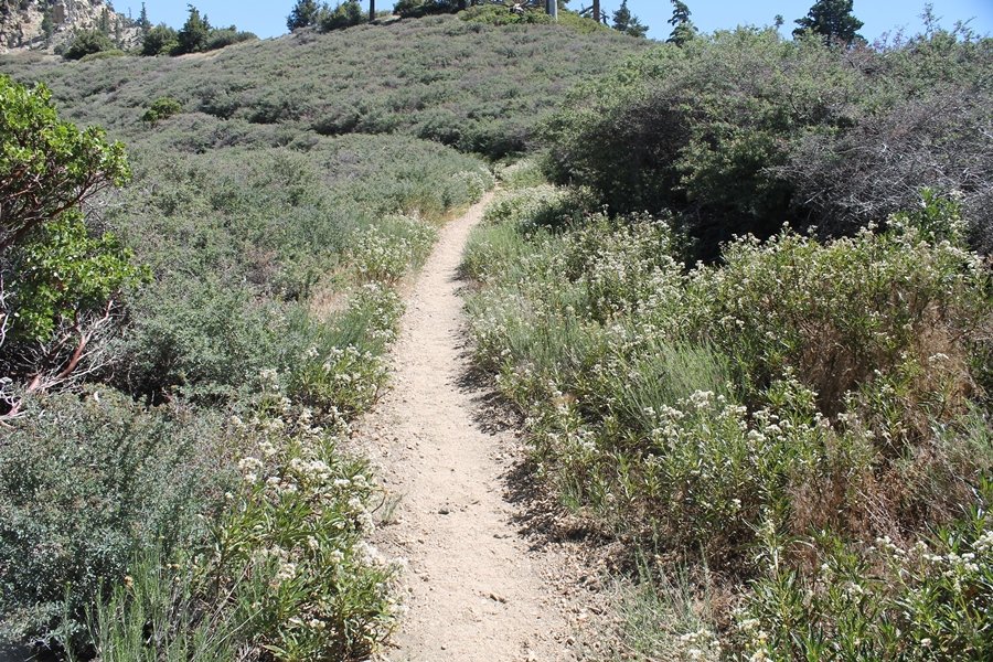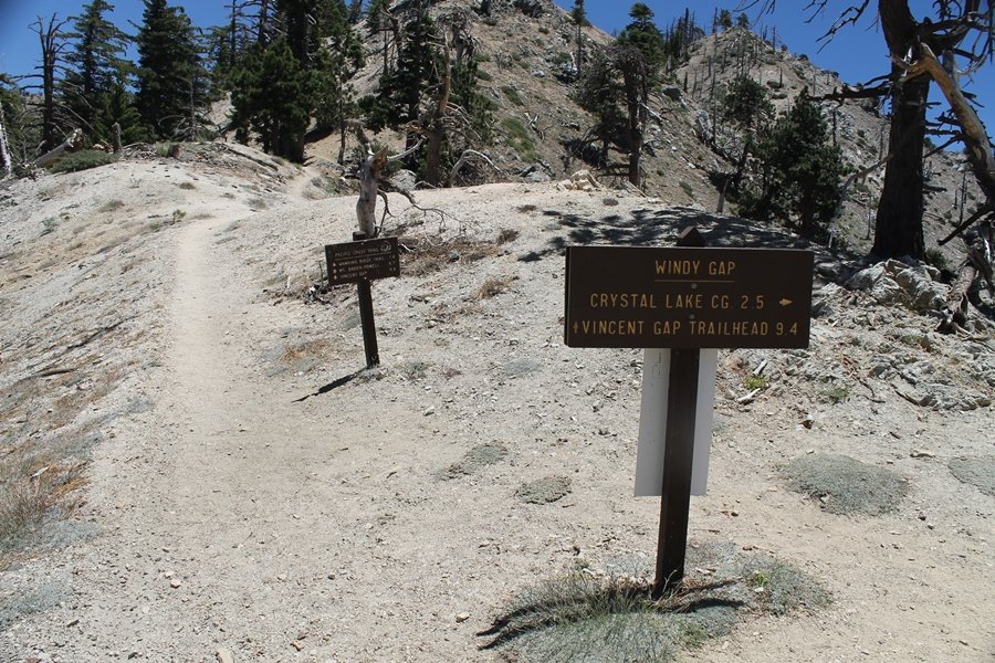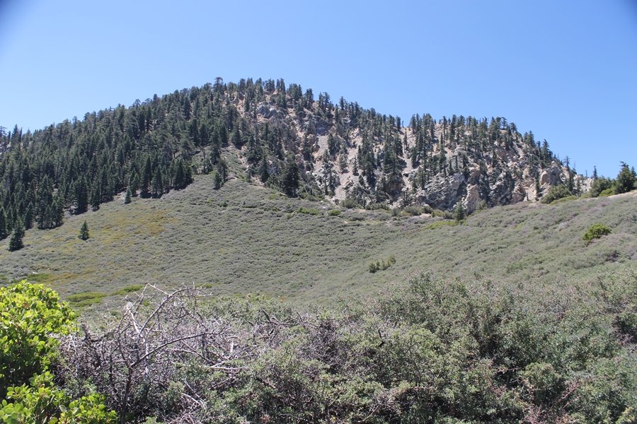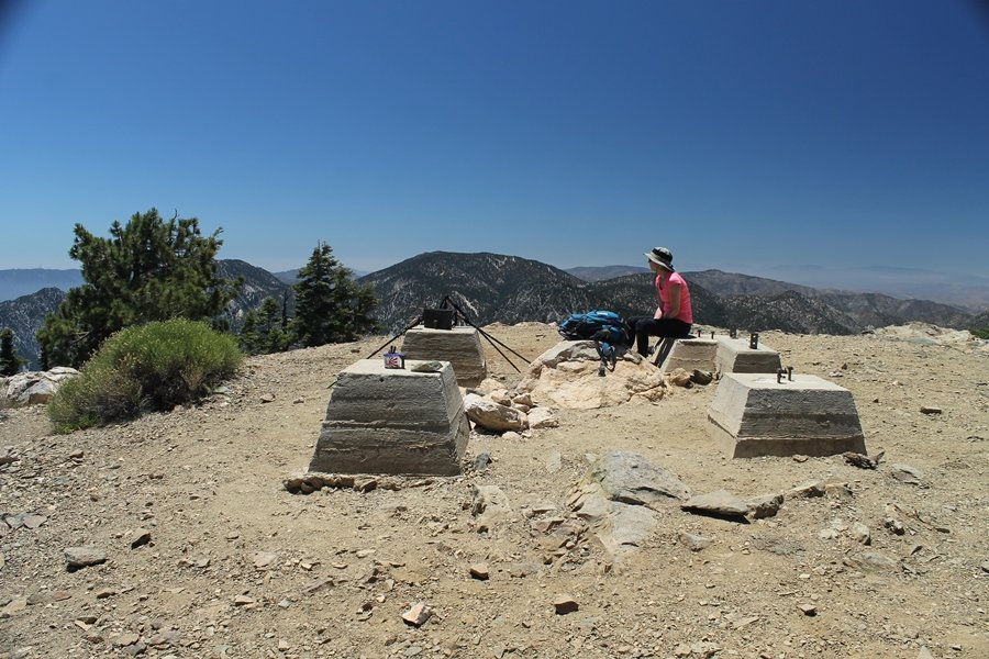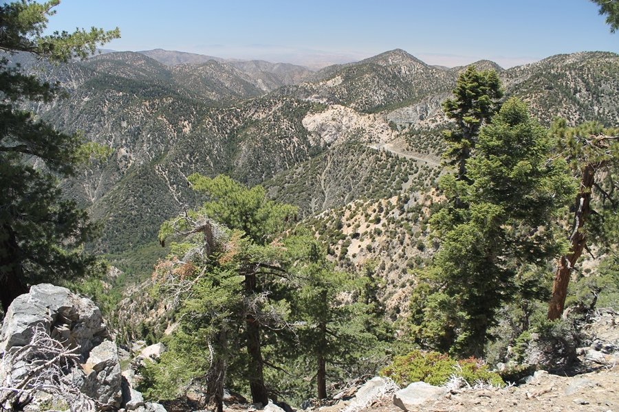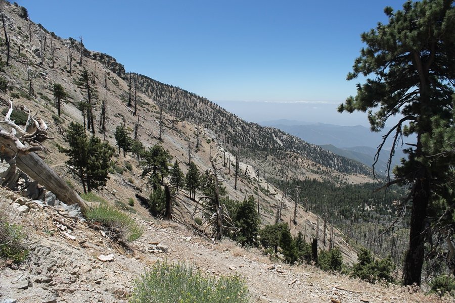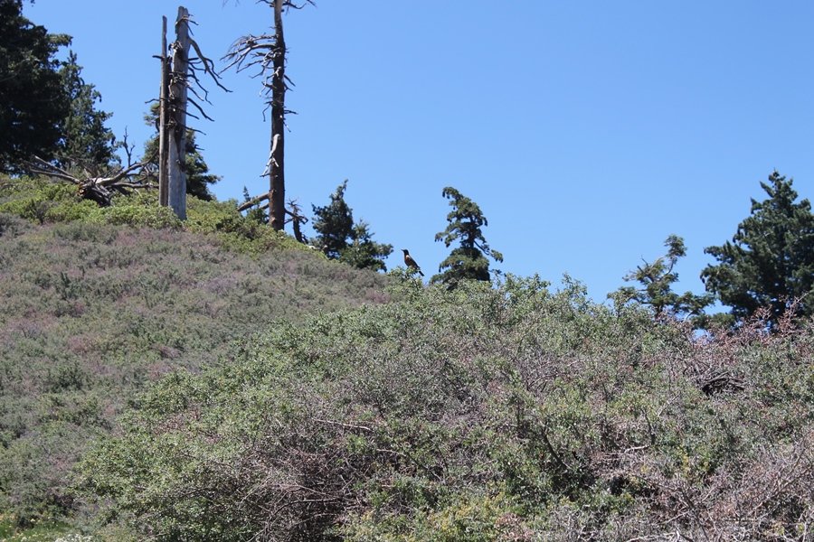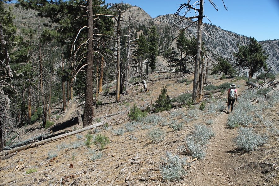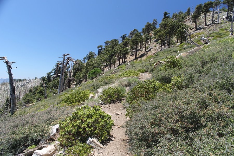 In Wrightwood again for the weekend, we decided to try and do two hikes on opposite sides of Islip Saddle, a point 30 minutes west of Wrightwood at which Hwy 2 crosses the Angeles Crest and the PCT west of the Mt. Baden-Powell area. East of the saddle lies its namesake, Mt. Islip, elev. 8,250′ (Islip is pronounced “eye-slip”), reached via the PCT eastbound, and west of the saddle is Mt. Williamson, elev. 8,244′, accessed via the PCT westbound. The HPS guide cites the Islip hike at 6-1/2 roundtrip miles while Williamson is only 5 – we figured we’d choose whichever peak when we got to the trailheads. We could see a pretty solid cloud cover to the south as we drove through the mountains and thought that might make for some cool pictures, deciding that Mt. Islip would be today’s destination since it offers more open views to the south, and we arrived at Islip Saddle about 11:30am. As we prepared to leave the parking area, a couple of young men came down the trail, one of whom was in running tights and carrying a very small pack – we found out from other hikers we met later that this fellow is attempting to break the world record for a PCT thru-hike, and that he is typically covering about 43 miles a day. Our goal was much less ambitious, and we proceeded east up the trail, first through a handful of switchbacks before circling around a large brushy meadow on the northwest shoulder of Mt. Islip. The trail was initially a bit steeper than we had expected, gaining about 800′ in its first mile – however, after crossing a forest service access road, the trail leveled out considerably and the walking became an effortless stroll in the woods. As we completed our second mile, we caught up with a group of dads and young kids, each burdened with a full pack for a weekend stay at Little Jimmy Campground, a walk-in facility just ahead – within five minutes of passing the group, we arrived at the campground, popular among PCTers with its level campsites and reliable water nearby at Little Jimmy Spring. Continuing east, we passed a side trail to the spring and began climbing more directly to Windy Gap, a low saddle on the crest between Mts. Islip on the west and Hawkins to the east – while the PCT continues eastward up the ridgeline, another trail drops into the drainage to the south, a pretty bowl containing Crystal Lake, the only naturally-occurring lake in the San Gabriels. The gap lived up to its name, with a stiff breeze blowing that cooled us off on this warm day. After a snapping a couple of photos, we turned west and headed up the signed Mt. Islip trail, a narrow path that climbed sharply at first but leveled out after a pair of switchbacks, following the gentle ridgeline westward. Mt. Islip’s conical profile could be seen ahead of us, and the trail shifted to the south side of the ridge as we neared the base of the summit bump. The Crystal Lake basin and much of the surrounding ridges burned in the Curve Fire of 2002, and we had a full panorama of the fire’s damage in this area – we’ve heard that it takes some 75 years for forests here to fully recover, a figure that seems probable given the still-denuded slopes more than a decade after the fire. We passed through large fields of low buckthorn and manzanita, eventually reaching a switchback that doubled us back eastward to the summit itself. There was a fire lookout here for many years, and the foundations of the lookout remain, as do the stone walls of a storage building built just off the north side of the summit. The 360-degree views were amazing, although the southern cloud cover we had been expecting had mostly burned off to reveal the perennial layer of smog over the Inland Empire instead. The mountains, however, were displayed all round in stunning clarity – Twin Peaks and Waterman Mountain to the southwest, the Williamson group immediately to the west across Islip Saddle, and Throop Peak to the east. To the southeast was Hawkins Ridge, consisting of four peaks – Mount Hawkins, Sadie Hawkins, Middle Hawkins, and South Hawkins from north to south (we understand these peaks were all named nearly a century ago after a popular waitress at a restaurant near Crystal Lake, and the HPS guide notes that “she must have been quite a gal” – indeed). We spent about 30 minutes at the summit taking in the views before retracing our steps back down the ridge to Windy Gap. On our way west, we took the side trip to Little Jimmy Spring where we again met the backpacking dads and kids filling up their water bottles. The walk back to the trailhead was very pleasant and passed quickly, and we made it back to the Jeep by 3:30pm. The GPS logged the trip at 7.25 miles, so a little longer than planned – a very nice hike, though this time of year it’s advisable to get an earlier start to beat the heat.