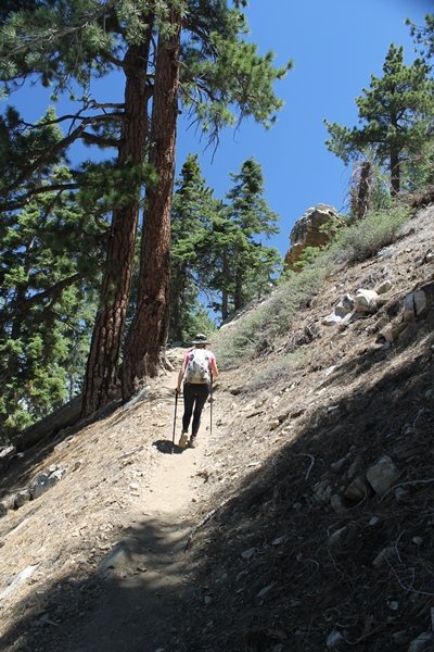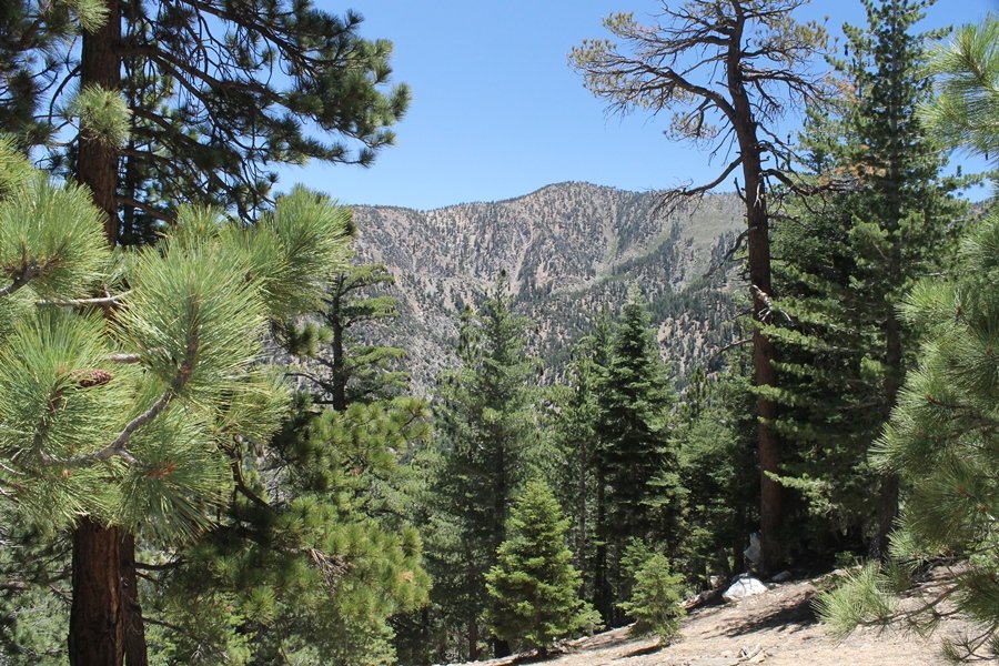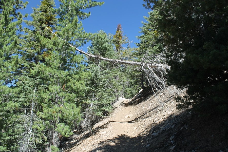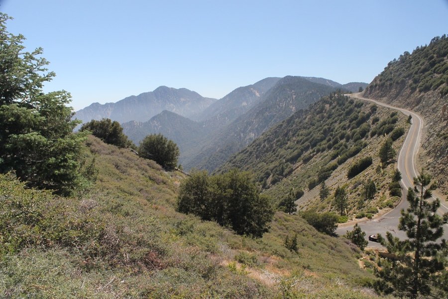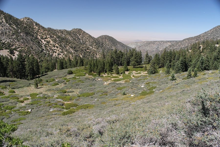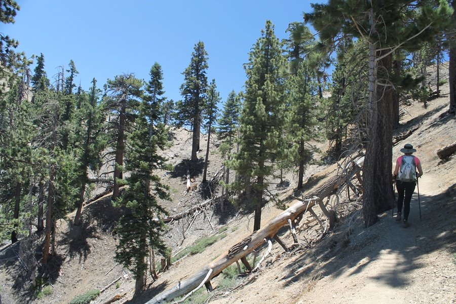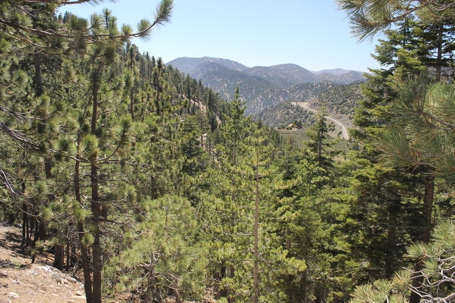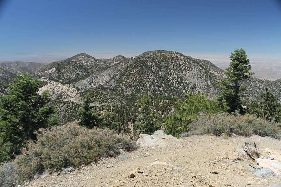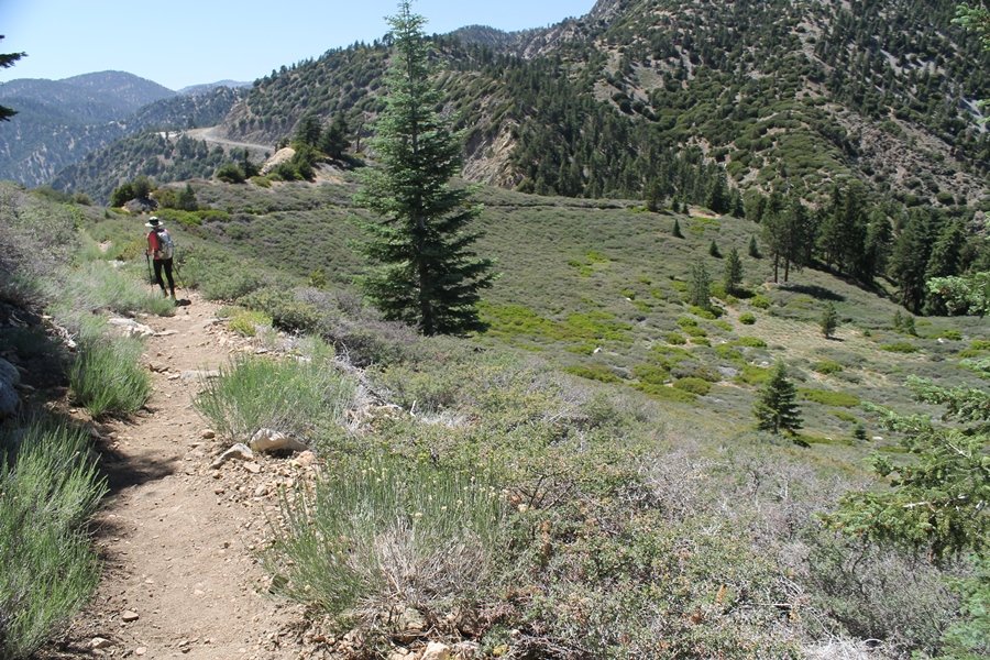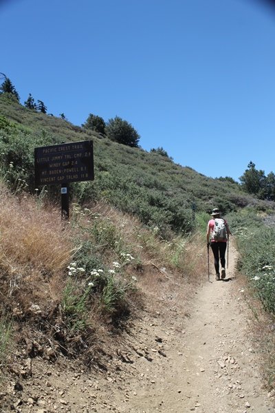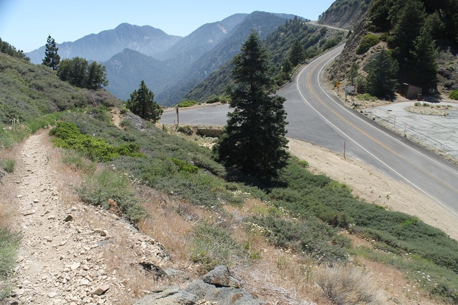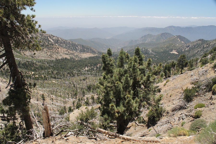 In Wrightwood again for the weekend, we decided to try and do two hikes on opposite sides of Islip Saddle, a point 30 minutes west of Wrightwood at which Hwy 2 crosses the Angeles Crest and the PCT west of the Mt. Baden-Powell area. East of the saddle lies its namesake, Mt. Islip, elev. 8,250′ (Islip is pronounced “eye-slip”), reached via the PCT eastbound, and west of the saddle is Mt. Williamson, elev. 8,244′, accessed via the PCT westbound. The HPS guide cites the Islip hike at 6-1/2 roundtrip miles while Williamson is only 5 – we figured we’d choose whichever peak when we got to the trailheads. We could see a pretty solid cloud cover to the south as we drove through the mountains and thought that might make for some cool pictures, deciding that Mt. Islip would be today’s destination since it offers more open views to the south, and we arrived at Islip Saddle about 11:30am. As we prepared to leave the parking area, a couple of young men came down the trail, one of whom was in running tights and carrying a very small pack – we found out from other hikers we met later that this fellow is attempting to break the world record for a PCT thru-hike, and that he is typically covering about 43 miles a day. Our goal was much less ambitious, and we proceeded east up the trail, first through a handful of switchbacks before circling around a large brushy meadow on the northwest shoulder of Mt. Islip. The trail was initially a bit steeper than we had expected, gaining about 800′ in its first mile – however, after crossing a forest service access road, the trail leveled out considerably and the walking became an effortless stroll in the woods. As we completed our second mile, we caught up with a group of dads and young kids, each burdened with a full pack for a weekend stay at Little Jimmy Campground, a walk-in facility just ahead – within five minutes of passing the group, we arrived at the campground, popular among PCTers with its level campsites and reliable water nearby at Little Jimmy Spring. Continuing east, we passed a side trail to the spring and began climbing more directly to Windy Gap, a low saddle on the crest between Mts. Islip on the west and Hawkins to the east – while the PCT continues eastward up the ridgeline, another trail drops into the drainage to the south, a pretty bowl containing Crystal Lake, the only naturally-occurring lake in the San Gabriels. The gap lived up to its name, with a stiff breeze blowing that cooled us off on this warm day. After a snapping a couple of photos, we turned west and headed up the signed Mt. Islip trail, a narrow path that climbed sharply at first but leveled out after a pair of switchbacks, following the gentle ridgeline westward. Mt. Islip’s conical profile could be seen ahead of us, and the trail shifted to the south side of the ridge as we neared the base of the summit bump. The Crystal Lake basin and much of the surrounding ridges burned in the Curve Fire of 2002, and we had a full panorama of the fire’s damage in this area – we’ve heard that it takes some 75 years for forests here to fully recover, a figure that seems probable given the still-denuded slopes more than a decade after the fire. We passed through large fields of low buckthorn and manzanita, eventually reaching a switchback that doubled us back eastward to the summit itself. There was a fire lookout here for many years, and the foundations of the lookout remain, as do the stone walls of a storage building built just off the north side of the summit. The 360-degree views were amazing, although the southern cloud cover we had been expecting had mostly burned off to reveal the perennial layer of smog over the Inland Empire instead. The mountains, however, were displayed all round in stunning clarity – Twin Peaks and Waterman Mountain to the southwest, the Williamson group immediately to the west across Islip Saddle, and Throop Peak to the east. To the southeast was Hawkins Ridge, consisting of four peaks – Mount Hawkins, Sadie Hawkins, Middle Hawkins, and South Hawkins from north to south (we understand these peaks were all named nearly a century ago after a popular waitress at a restaurant near Crystal Lake, and the HPS guide notes that “she must have been quite a gal” – indeed). We spent about 30 minutes at the summit taking in the views before retracing our steps back down the ridge to Windy Gap. On our way west, we took the side trip to Little Jimmy Spring where we again met the backpacking dads and kids filling up their water bottles. The walk back to the trailhead was very pleasant and passed quickly, and we made it back to the Jeep by 3:30pm. The GPS logged the trip at 7.25 miles, so a little longer than planned – a very nice hike, though this time of year it’s advisable to get an earlier start to beat the heat.