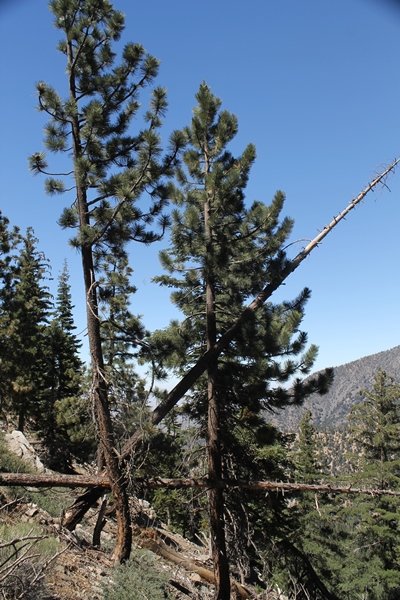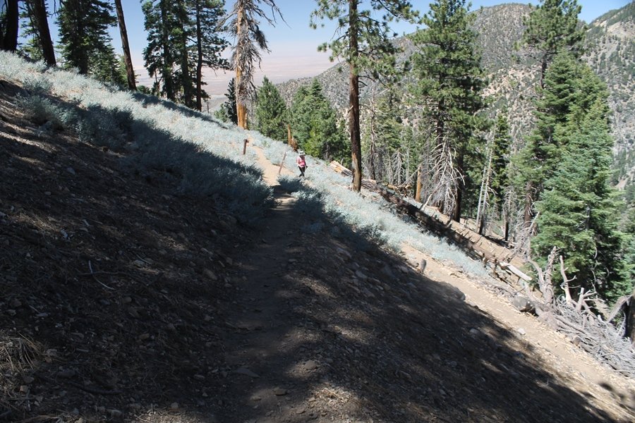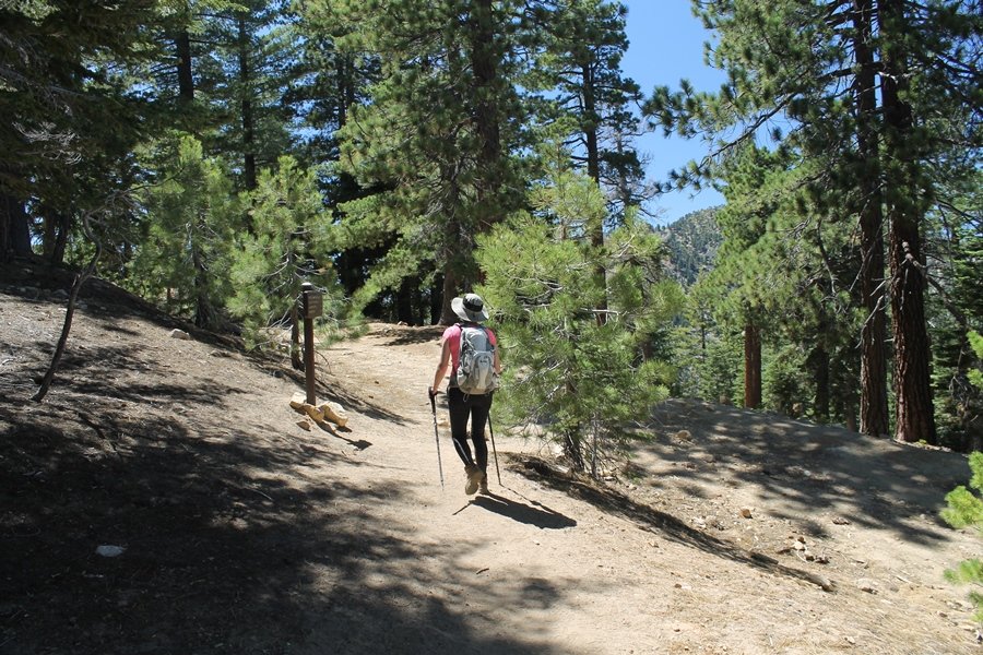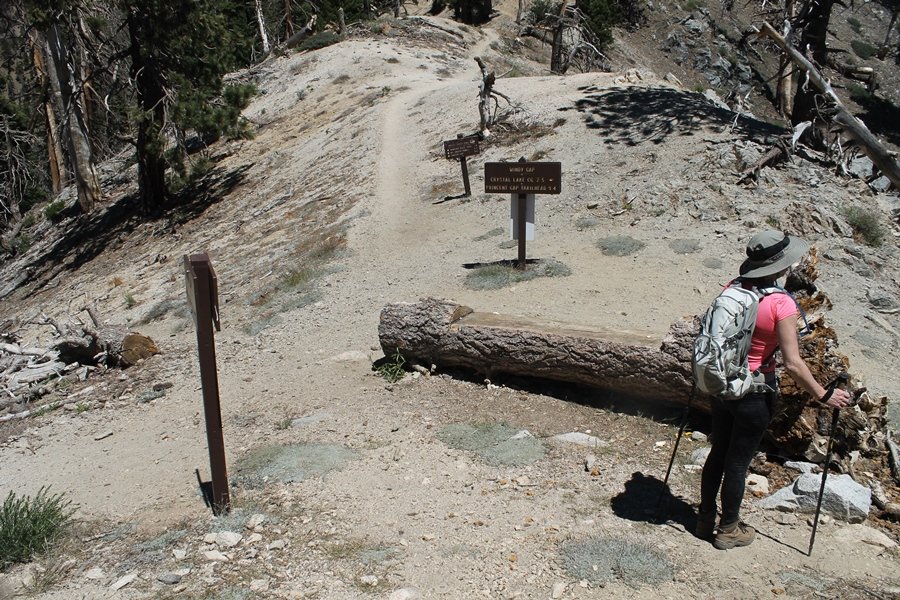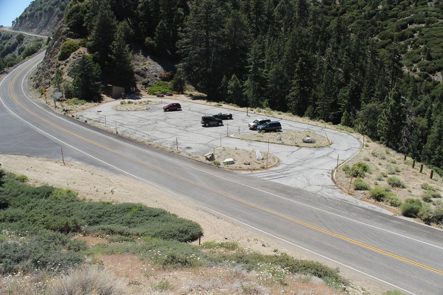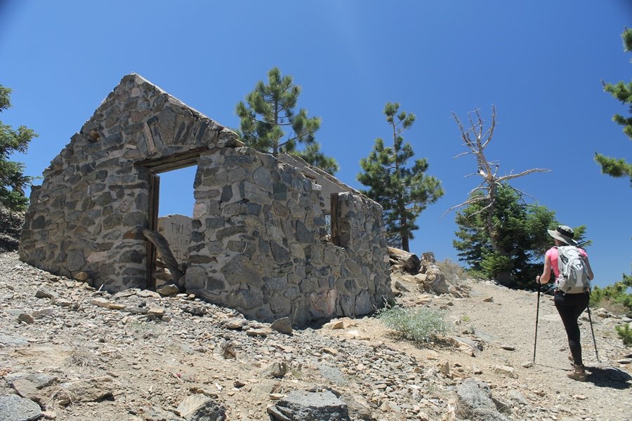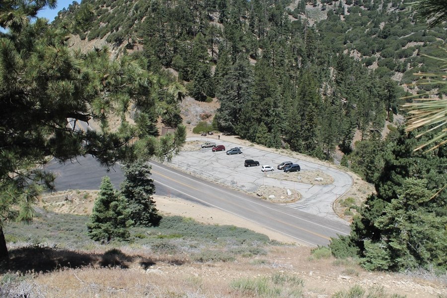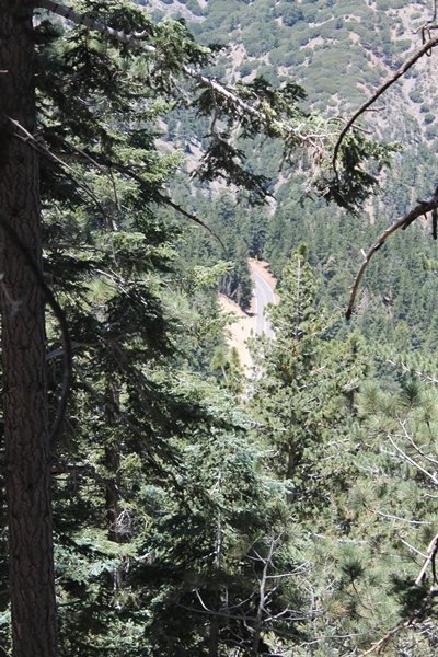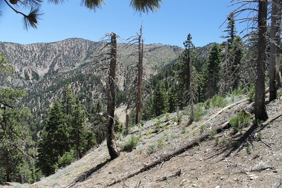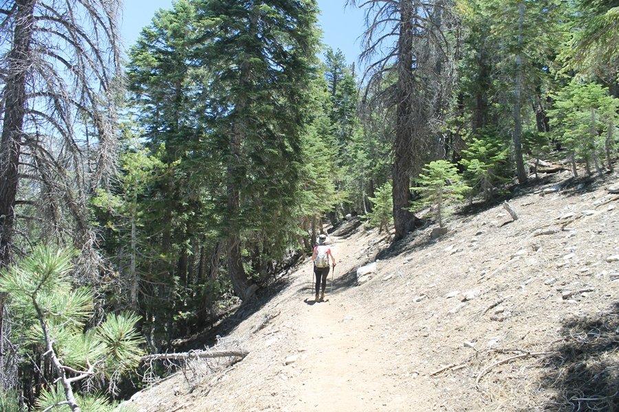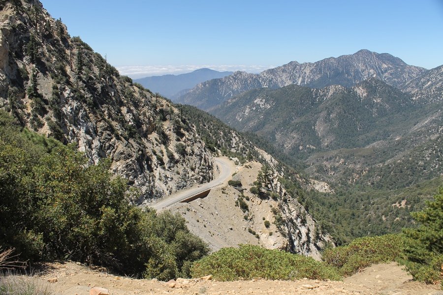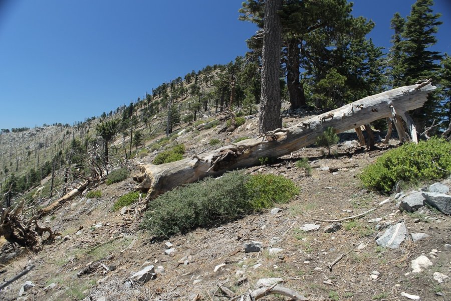 In Wrightwood again for the weekend, we decided to try and do two hikes on opposite sides of Islip Saddle, a point 30 minutes west of Wrightwood at which Hwy 2 crosses the Angeles Crest and the PCT west of the Mt. Baden-Powell area. East of the saddle lies its namesake, Mt. Islip, elev. 8,250′ (Islip is pronounced “eye-slip”), reached via the PCT eastbound, and west of the saddle is Mt. Williamson, elev. 8,244′, accessed via the PCT westbound. The HPS guide cites the Islip hike at 6-1/2 roundtrip miles while Williamson is only 5 – we figured we’d choose whichever peak when we got to the trailheads. We could see a pretty solid cloud cover to the south as we drove through the mountains and thought that might make for some cool pictures, deciding that Mt. Islip would be today’s destination since it offers more open views to the south, and we arrived at Islip Saddle about 11:30am. As we prepared to leave the parking area, a couple of young men came down the trail, one of whom was in running tights and carrying a very small pack – we found out from other hikers we met later that this fellow is attempting to break the world record for a PCT thru-hike, and that he is typically covering about 43 miles a day. Our goal was much less ambitious, and we proceeded east up the trail, first through a handful of switchbacks before circling around a large brushy meadow on the northwest shoulder of Mt. Islip. The trail was initially a bit steeper than we had expected, gaining about 800′ in its first mile – however, after crossing a forest service access road, the trail leveled out considerably and the walking became an effortless stroll in the woods. As we completed our second mile, we caught up with a group of dads and young kids, each burdened with a full pack for a weekend stay at Little Jimmy Campground, a walk-in facility just ahead – within five minutes of passing the group, we arrived at the campground, popular among PCTers with its level campsites and reliable water nearby at Little Jimmy Spring. Continuing east, we passed a side trail to the spring and began climbing more directly to Windy Gap, a low saddle on the crest between Mts. Islip on the west and Hawkins to the east – while the PCT continues eastward up the ridgeline, another trail drops into the drainage to the south, a pretty bowl containing Crystal Lake, the only naturally-occurring lake in the San Gabriels. The gap lived up to its name, with a stiff breeze blowing that cooled us off on this warm day. After a snapping a couple of photos, we turned west and headed up the signed Mt. Islip trail, a narrow path that climbed sharply at first but leveled out after a pair of switchbacks, following the gentle ridgeline westward. Mt. Islip’s conical profile could be seen ahead of us, and the trail shifted to the south side of the ridge as we neared the base of the summit bump. The Crystal Lake basin and much of the surrounding ridges burned in the Curve Fire of 2002, and we had a full panorama of the fire’s damage in this area – we’ve heard that it takes some 75 years for forests here to fully recover, a figure that seems probable given the still-denuded slopes more than a decade after the fire. We passed through large fields of low buckthorn and manzanita, eventually reaching a switchback that doubled us back eastward to the summit itself. There was a fire lookout here for many years, and the foundations of the lookout remain, as do the stone walls of a storage building built just off the north side of the summit. The 360-degree views were amazing, although the southern cloud cover we had been expecting had mostly burned off to reveal the perennial layer of smog over the Inland Empire instead. The mountains, however, were displayed all round in stunning clarity – Twin Peaks and Waterman Mountain to the southwest, the Williamson group immediately to the west across Islip Saddle, and Throop Peak to the east. To the southeast was Hawkins Ridge, consisting of four peaks – Mount Hawkins, Sadie Hawkins, Middle Hawkins, and South Hawkins from north to south (we understand these peaks were all named nearly a century ago after a popular waitress at a restaurant near Crystal Lake, and the HPS guide notes that “she must have been quite a gal” – indeed). We spent about 30 minutes at the summit taking in the views before retracing our steps back down the ridge to Windy Gap. On our way west, we took the side trip to Little Jimmy Spring where we again met the backpacking dads and kids filling up their water bottles. The walk back to the trailhead was very pleasant and passed quickly, and we made it back to the Jeep by 3:30pm. The GPS logged the trip at 7.25 miles, so a little longer than planned – a very nice hike, though this time of year it’s advisable to get an earlier start to beat the heat.