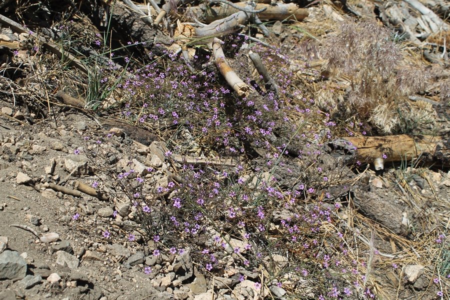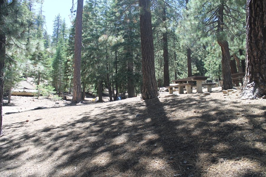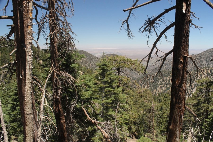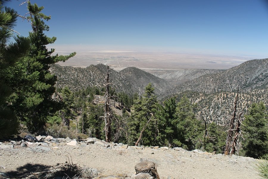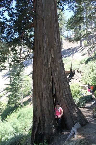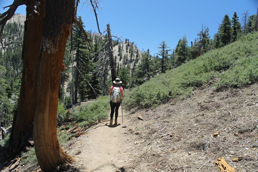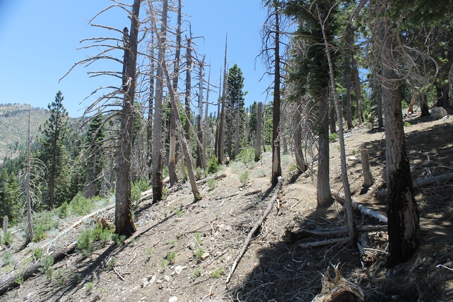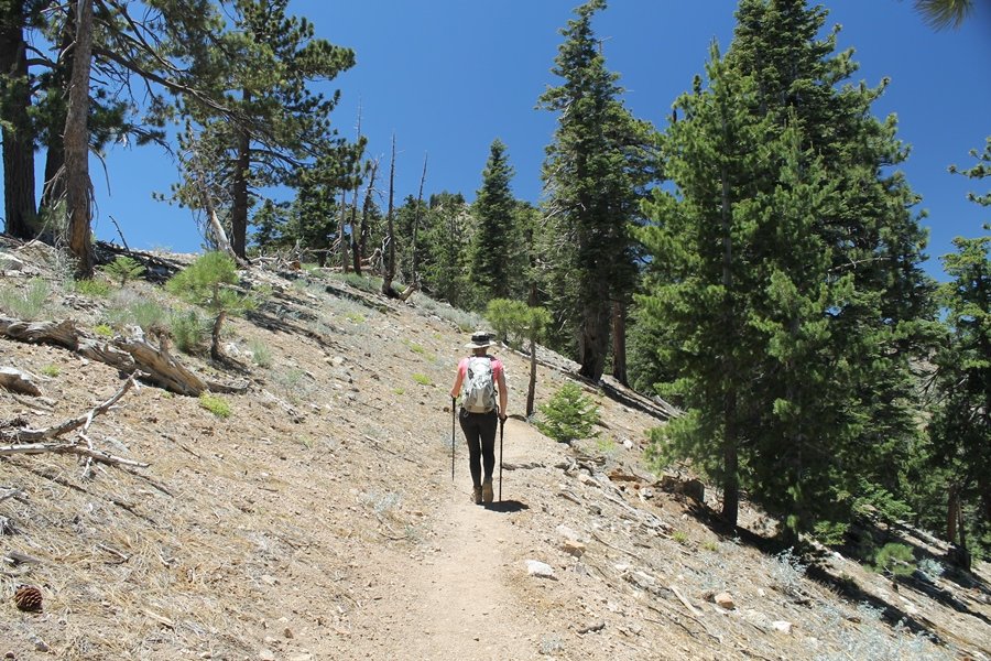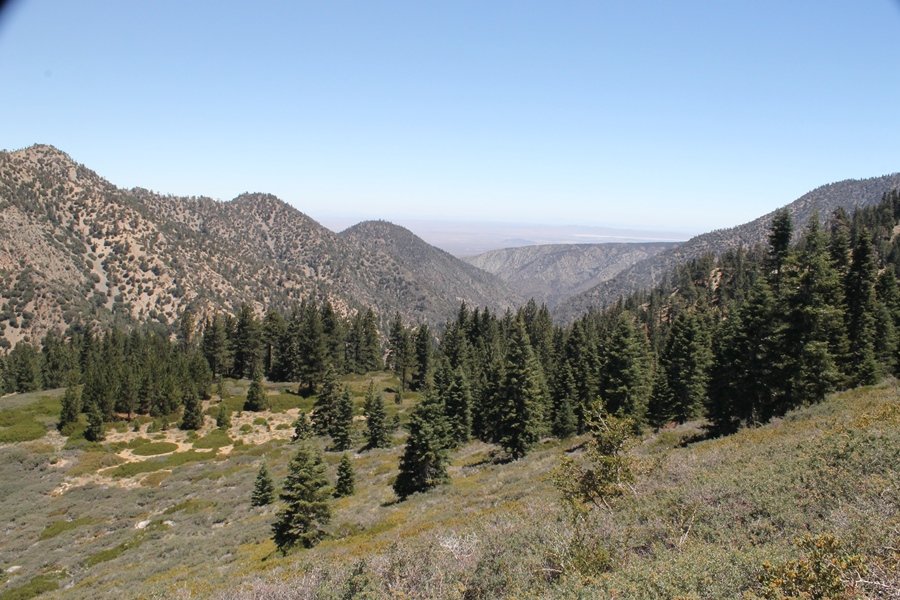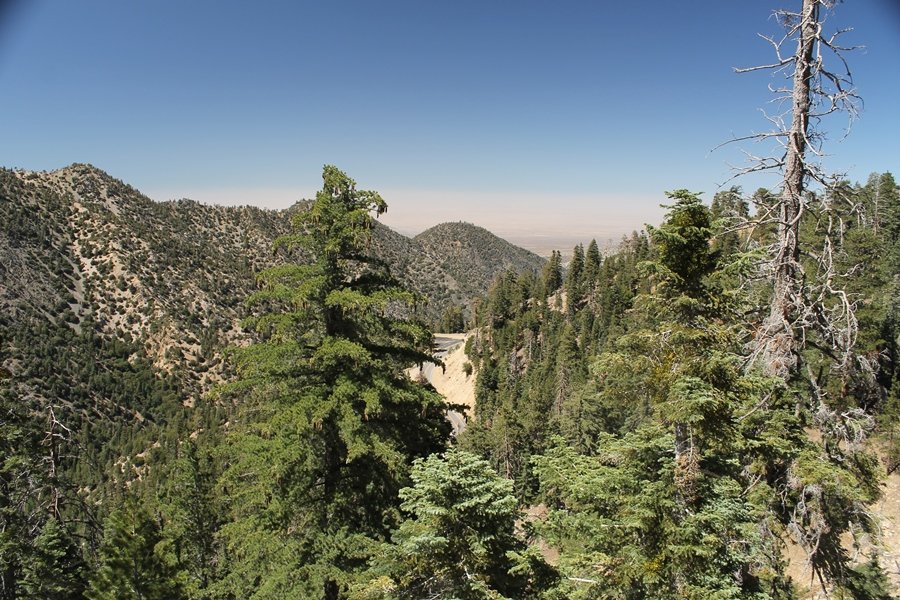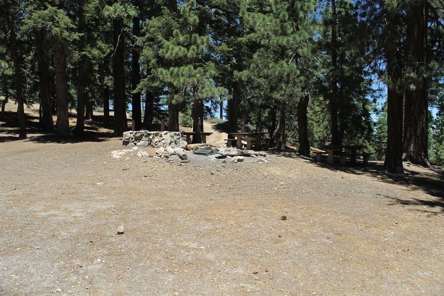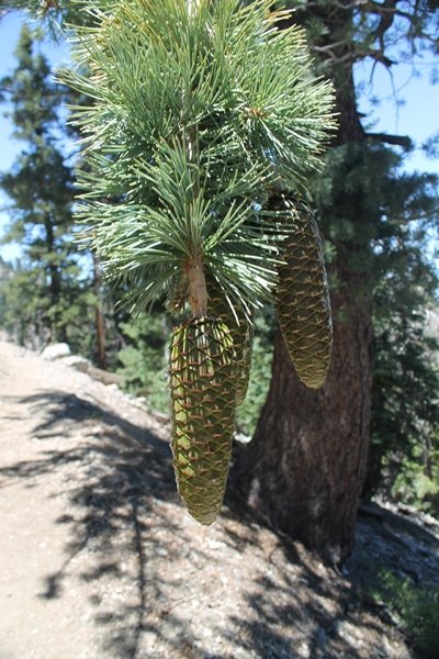 In Wrightwood again for the weekend, we decided to try and do two hikes on opposite sides of Islip Saddle, a point 30 minutes west of Wrightwood at which Hwy 2 crosses the Angeles Crest and the PCT west of the Mt. Baden-Powell area. East of the saddle lies its namesake, Mt. Islip, elev. 8,250′ (Islip is pronounced “eye-slip”), reached via the PCT eastbound, and west of the saddle is Mt. Williamson, elev. 8,244′, accessed via the PCT westbound. The HPS guide cites the Islip hike at 6-1/2 roundtrip miles while Williamson is only 5 – we figured we’d choose whichever peak when we got to the trailheads. We could see a pretty solid cloud cover to the south as we drove through the mountains and thought that might make for some cool pictures, deciding that Mt. Islip would be today’s destination since it offers more open views to the south, and we arrived at Islip Saddle about 11:30am. As we prepared to leave the parking area, a couple of young men came down the trail, one of whom was in running tights and carrying a very small pack – we found out from other hikers we met later that this fellow is attempting to break the world record for a PCT thru-hike, and that he is typically covering about 43 miles a day. Our goal was much less ambitious, and we proceeded east up the trail, first through a handful of switchbacks before circling around a large brushy meadow on the northwest shoulder of Mt. Islip. The trail was initially a bit steeper than we had expected, gaining about 800′ in its first mile – however, after crossing a forest service access road, the trail leveled out considerably and the walking became an effortless stroll in the woods. As we completed our second mile, we caught up with a group of dads and young kids, each burdened with a full pack for a weekend stay at Little Jimmy Campground, a walk-in facility just ahead – within five minutes of passing the group, we arrived at the campground, popular among PCTers with its level campsites and reliable water nearby at Little Jimmy Spring. Continuing east, we passed a side trail to the spring and began climbing more directly to Windy Gap, a low saddle on the crest between Mts. Islip on the west and Hawkins to the east – while the PCT continues eastward up the ridgeline, another trail drops into the drainage to the south, a pretty bowl containing Crystal Lake, the only naturally-occurring lake in the San Gabriels. The gap lived up to its name, with a stiff breeze blowing that cooled us off on this warm day. After a snapping a couple of photos, we turned west and headed up the signed Mt. Islip trail, a narrow path that climbed sharply at first but leveled out after a pair of switchbacks, following the gentle ridgeline westward. Mt. Islip’s conical profile could be seen ahead of us, and the trail shifted to the south side of the ridge as we neared the base of the summit bump. The Crystal Lake basin and much of the surrounding ridges burned in the Curve Fire of 2002, and we had a full panorama of the fire’s damage in this area – we’ve heard that it takes some 75 years for forests here to fully recover, a figure that seems probable given the still-denuded slopes more than a decade after the fire. We passed through large fields of low buckthorn and manzanita, eventually reaching a switchback that doubled us back eastward to the summit itself. There was a fire lookout here for many years, and the foundations of the lookout remain, as do the stone walls of a storage building built just off the north side of the summit. The 360-degree views were amazing, although the southern cloud cover we had been expecting had mostly burned off to reveal the perennial layer of smog over the Inland Empire instead. The mountains, however, were displayed all round in stunning clarity – Twin Peaks and Waterman Mountain to the southwest, the Williamson group immediately to the west across Islip Saddle, and Throop Peak to the east. To the southeast was Hawkins Ridge, consisting of four peaks – Mount Hawkins, Sadie Hawkins, Middle Hawkins, and South Hawkins from north to south (we understand these peaks were all named nearly a century ago after a popular waitress at a restaurant near Crystal Lake, and the HPS guide notes that “she must have been quite a gal” – indeed). We spent about 30 minutes at the summit taking in the views before retracing our steps back down the ridge to Windy Gap. On our way west, we took the side trip to Little Jimmy Spring where we again met the backpacking dads and kids filling up their water bottles. The walk back to the trailhead was very pleasant and passed quickly, and we made it back to the Jeep by 3:30pm. The GPS logged the trip at 7.25 miles, so a little longer than planned – a very nice hike, though this time of year it’s advisable to get an earlier start to beat the heat.
