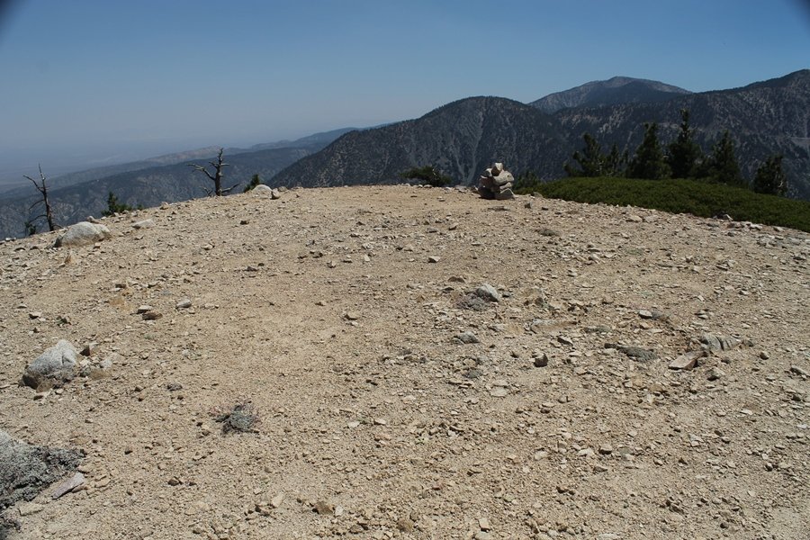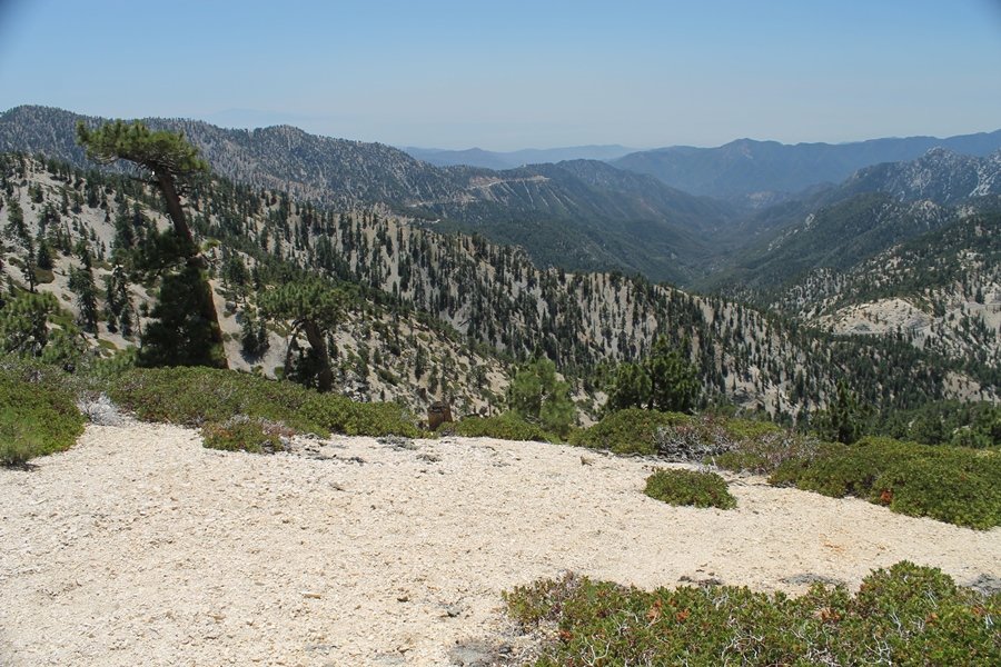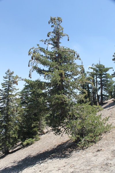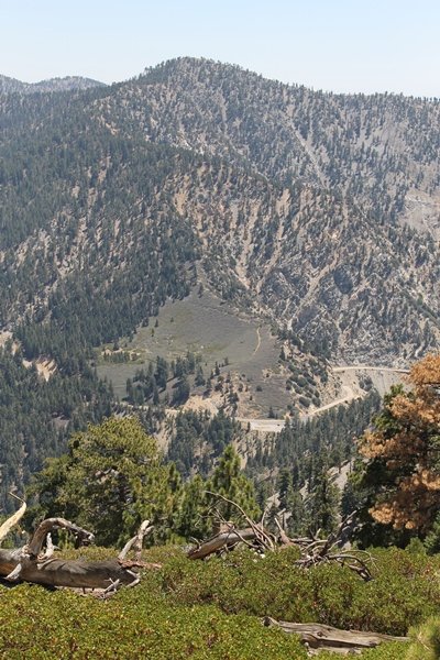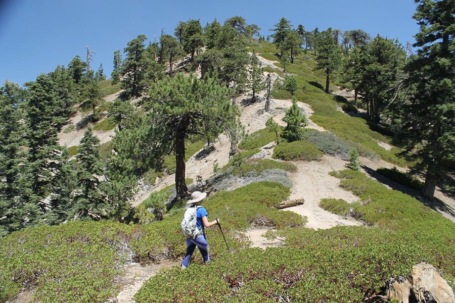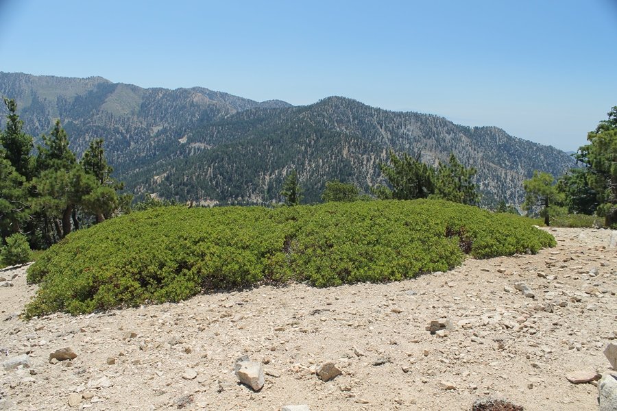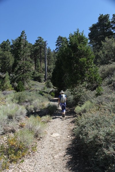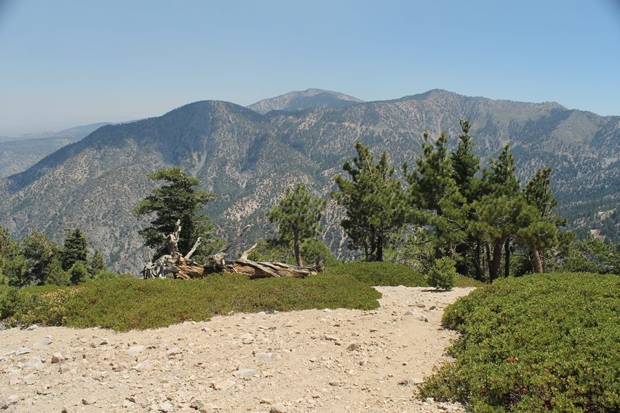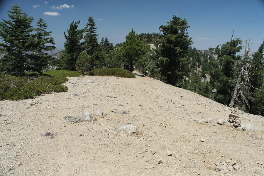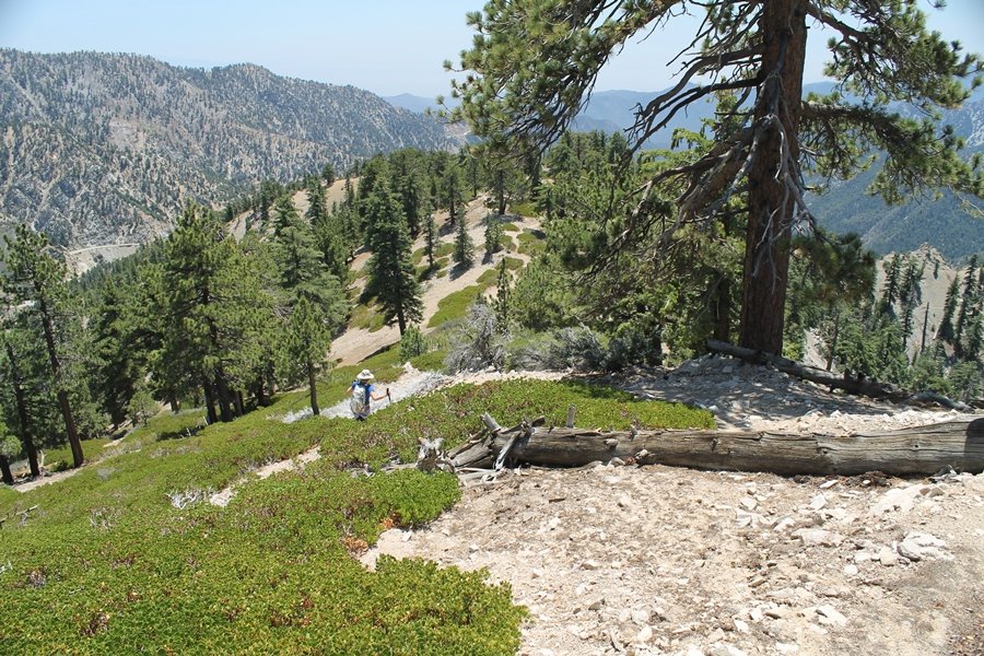 We had intended to hike Mt. Williamson as the second of a two-day exploration of the area around Islip Saddle, but our dog, Frances, got sick the night of our Mt. Islip walk and we had to postpone the next day’s trip as a result. The intervening weekends have been full of events and commitments, but none of them have involved any hiking of appreciable length. So, with our first available window since late June, we decided to give Mt. Williamson another go. The PCT heads west from Islip Saddle up and over Mt. Williamson’s south shoulder before dropping back southwest to Hwy 2, doing so to avoid very steep terrain across the south face of the mountain (Hwy 2 does the same, except that it tunnels under the south face). The distance on the PCT from either trailhead is the same, so, given our mid-morning start, we chose to start from the western trailhead on the far side of the tunnels as it was bound to be shadier than the exposed east side of the mountain. We headed out just before 11am under cloudless skies, making good time for the first half-mile as we ascended through open sugar pine forest – however, Chris quickly tired of our pace and wound up taking a good 30 minutes to cover the first mile (insert lessons about proper conditioning here). After munching on an energy bar, he felt much better, and we soon found ourselves at the crest of the south ridge marked prominently by a cairn – at this point, we turned north up a well-traveled use trail that picks it way up the easternmost of Williamson’s three summits. Most of the use trails we travel are less than well-engineered, usually steep and poorly maintained. We were pleasantly surprised that this one was nicely routed and unexpectedly gentle for the first two hundred yards – perhaps not unexpectedly, this quickly changed as we hit a significantly steeper section below the eastern summit. We picked our way upward, gaining about 300′ in a quarter mile, but the grade leveled out a bit and we found the open east summit before us at 8,214′. A couple of small cairns were here but not much else, so we continued west along the ridge toward the middle summit. The HPS guide notes that, although neither the marked summit (which is the eastern) nor the true high point (which is the western at 8,248′), the middle summit at 8,244′ is where the summit register is located – not. Two large cairns mark the middle summit, but we could not locate a register anywhere in the vicinity, despite an exhaustive search – the abundance of nice rocks and fallen logs for sitting do make this the best spot on the mountain for eating lunch or taking an extended break. We pushed westward over easy terrain to the west summit – here, we again found no register but were rewarded with the most open views along the ridge. To the north, we could easily see a debris field on a lower ridge – some online research revealed that this is the site of a 1966 plane crash, where an Air Force cargo plane went down killing the four unfortunate reservists aboard. The site is well-preserved with much of the plane’s structure intact, but we’ll save exploring that for another day. We had both turned on our phone’s GPS tracking function for a fitness app we’re using, and Jane realized her battery was quickly dying – we headed back east down the ridge, stopping briefly by the east summit to unsuccessfully locate a summit register, before retracing our steps back to the PCT. Once back on the main trail, Jane took off like a crazy woman, her breakaway opening up a large time gap ahead of the peloton (Chris). Down the trail we flew, Chris half-running to keep up – with about a mile to go, he reeled her in, probably due more to the fact she had given up hope of beating her phone’s battery to the finish and had slowed down considerably. In any event, we before long found ourselves back at the van, completing the 5+ miles in just over three hours, a pretty slow pace all things considered. Still, the weather and views were both great, and we look forward to our next hike, once the aches and pains of the rapid descent fade away…