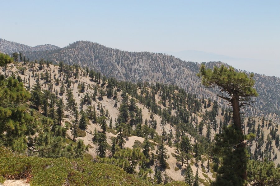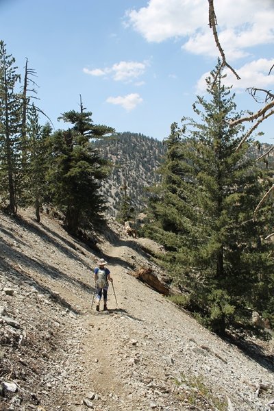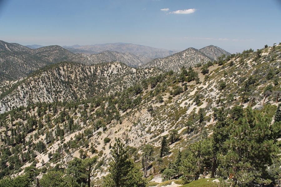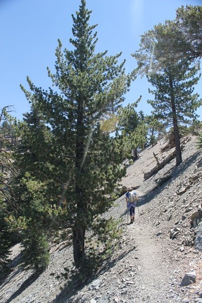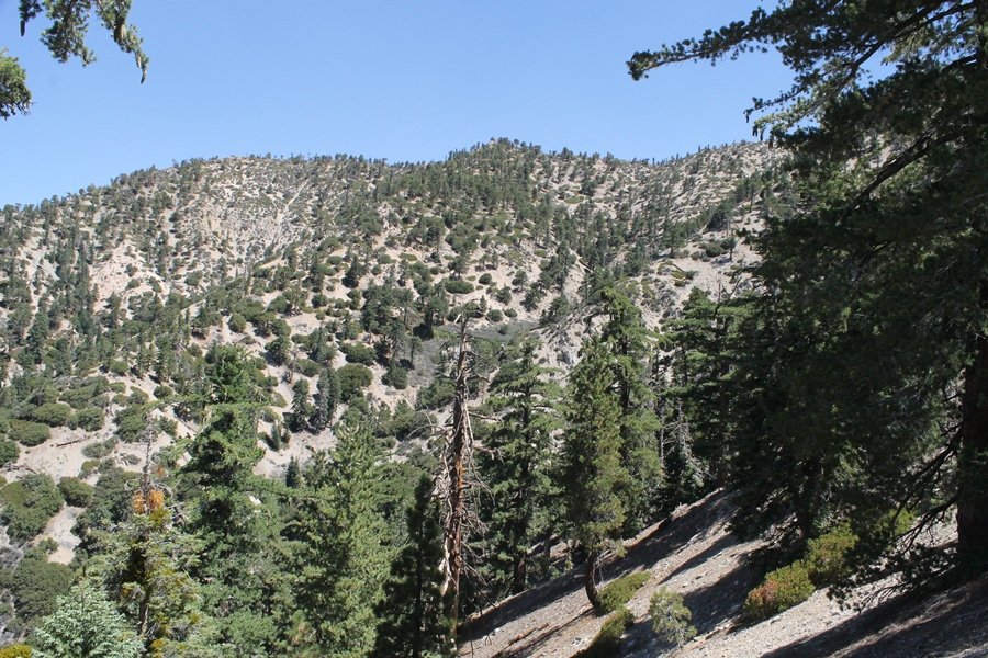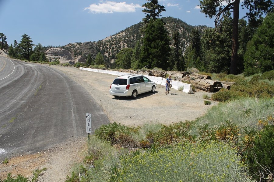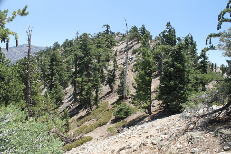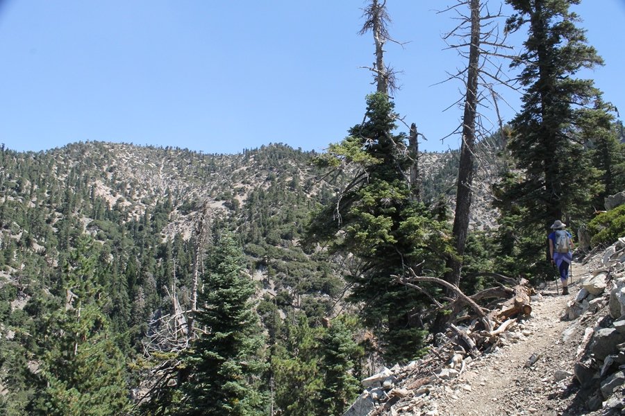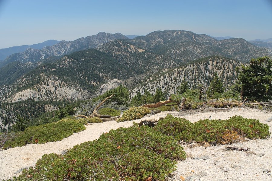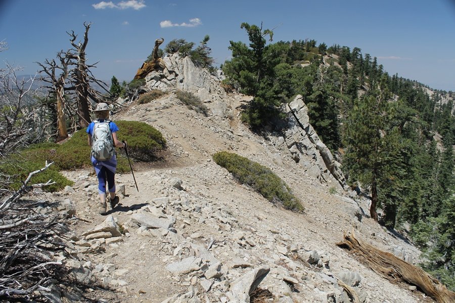 We had intended to hike Mt. Williamson as the second of a two-day exploration of the area around Islip Saddle, but our dog, Frances, got sick the night of our Mt. Islip walk and we had to postpone the next day’s trip as a result. The intervening weekends have been full of events and commitments, but none of them have involved any hiking of appreciable length. So, with our first available window since late June, we decided to give Mt. Williamson another go. The PCT heads west from Islip Saddle up and over Mt. Williamson’s south shoulder before dropping back southwest to Hwy 2, doing so to avoid very steep terrain across the south face of the mountain (Hwy 2 does the same, except that it tunnels under the south face). The distance on the PCT from either trailhead is the same, so, given our mid-morning start, we chose to start from the western trailhead on the far side of the tunnels as it was bound to be shadier than the exposed east side of the mountain. We headed out just before 11am under cloudless skies, making good time for the first half-mile as we ascended through open sugar pine forest – however, Chris quickly tired of our pace and wound up taking a good 30 minutes to cover the first mile (insert lessons about proper conditioning here). After munching on an energy bar, he felt much better, and we soon found ourselves at the crest of the south ridge marked prominently by a cairn – at this point, we turned north up a well-traveled use trail that picks it way up the easternmost of Williamson’s three summits. Most of the use trails we travel are less than well-engineered, usually steep and poorly maintained. We were pleasantly surprised that this one was nicely routed and unexpectedly gentle for the first two hundred yards – perhaps not unexpectedly, this quickly changed as we hit a significantly steeper section below the eastern summit. We picked our way upward, gaining about 300′ in a quarter mile, but the grade leveled out a bit and we found the open east summit before us at 8,214′. A couple of small cairns were here but not much else, so we continued west along the ridge toward the middle summit. The HPS guide notes that, although neither the marked summit (which is the eastern) nor the true high point (which is the western at 8,248′), the middle summit at 8,244′ is where the summit register is located – not. Two large cairns mark the middle summit, but we could not locate a register anywhere in the vicinity, despite an exhaustive search – the abundance of nice rocks and fallen logs for sitting do make this the best spot on the mountain for eating lunch or taking an extended break. We pushed westward over easy terrain to the west summit – here, we again found no register but were rewarded with the most open views along the ridge. To the north, we could easily see a debris field on a lower ridge – some online research revealed that this is the site of a 1966 plane crash, where an Air Force cargo plane went down killing the four unfortunate reservists aboard. The site is well-preserved with much of the plane’s structure intact, but we’ll save exploring that for another day. We had both turned on our phone’s GPS tracking function for a fitness app we’re using, and Jane realized her battery was quickly dying – we headed back east down the ridge, stopping briefly by the east summit to unsuccessfully locate a summit register, before retracing our steps back to the PCT. Once back on the main trail, Jane took off like a crazy woman, her breakaway opening up a large time gap ahead of the peloton (Chris). Down the trail we flew, Chris half-running to keep up – with about a mile to go, he reeled her in, probably due more to the fact she had given up hope of beating her phone’s battery to the finish and had slowed down considerably. In any event, we before long found ourselves back at the van, completing the 5+ miles in just over three hours, a pretty slow pace all things considered. Still, the weather and views were both great, and we look forward to our next hike, once the aches and pains of the rapid descent fade away…