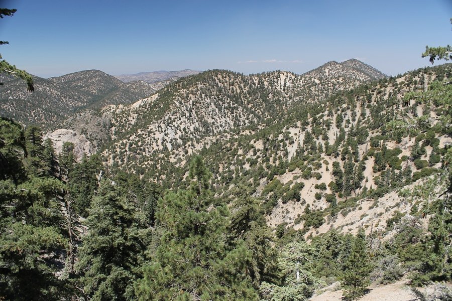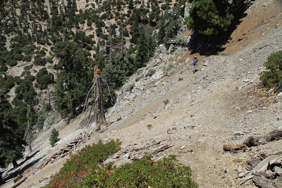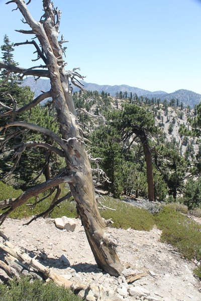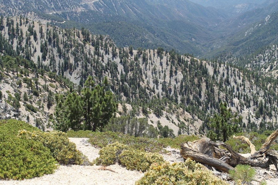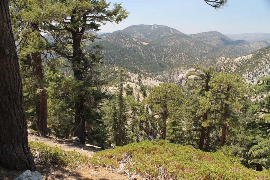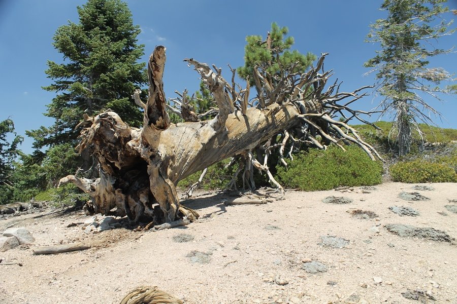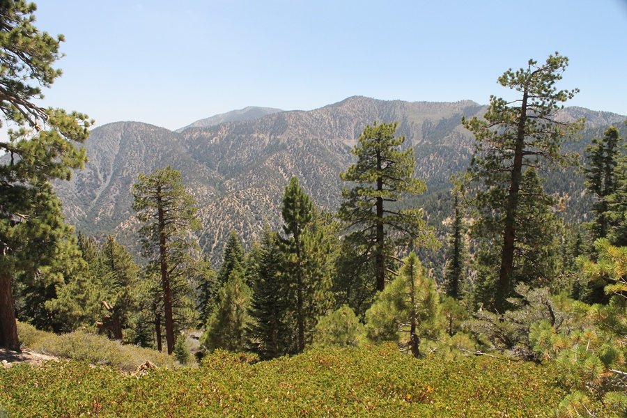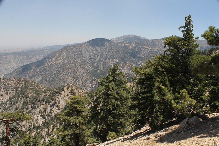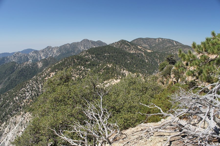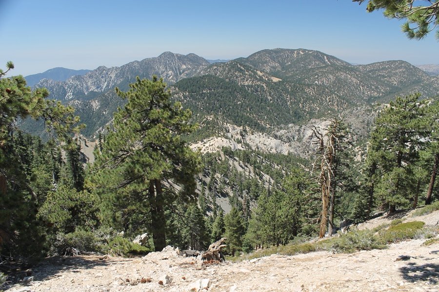 We had intended to hike Mt. Williamson as the second of a two-day exploration of the area around Islip Saddle, but our dog, Frances, got sick the night of our Mt. Islip walk and we had to postpone the next day’s trip as a result. The intervening weekends have been full of events and commitments, but none of them have involved any hiking of appreciable length. So, with our first available window since late June, we decided to give Mt. Williamson another go. The PCT heads west from Islip Saddle up and over Mt. Williamson’s south shoulder before dropping back southwest to Hwy 2, doing so to avoid very steep terrain across the south face of the mountain (Hwy 2 does the same, except that it tunnels under the south face). The distance on the PCT from either trailhead is the same, so, given our mid-morning start, we chose to start from the western trailhead on the far side of the tunnels as it was bound to be shadier than the exposed east side of the mountain. We headed out just before 11am under cloudless skies, making good time for the first half-mile as we ascended through open sugar pine forest – however, Chris quickly tired of our pace and wound up taking a good 30 minutes to cover the first mile (insert lessons about proper conditioning here). After munching on an energy bar, he felt much better, and we soon found ourselves at the crest of the south ridge marked prominently by a cairn – at this point, we turned north up a well-traveled use trail that picks it way up the easternmost of Williamson’s three summits. Most of the use trails we travel are less than well-engineered, usually steep and poorly maintained. We were pleasantly surprised that this one was nicely routed and unexpectedly gentle for the first two hundred yards – perhaps not unexpectedly, this quickly changed as we hit a significantly steeper section below the eastern summit. We picked our way upward, gaining about 300′ in a quarter mile, but the grade leveled out a bit and we found the open east summit before us at 8,214′. A couple of small cairns were here but not much else, so we continued west along the ridge toward the middle summit. The HPS guide notes that, although neither the marked summit (which is the eastern) nor the true high point (which is the western at 8,248′), the middle summit at 8,244′ is where the summit register is located – not. Two large cairns mark the middle summit, but we could not locate a register anywhere in the vicinity, despite an exhaustive search – the abundance of nice rocks and fallen logs for sitting do make this the best spot on the mountain for eating lunch or taking an extended break. We pushed westward over easy terrain to the west summit – here, we again found no register but were rewarded with the most open views along the ridge. To the north, we could easily see a debris field on a lower ridge – some online research revealed that this is the site of a 1966 plane crash, where an Air Force cargo plane went down killing the four unfortunate reservists aboard. The site is well-preserved with much of the plane’s structure intact, but we’ll save exploring that for another day. We had both turned on our phone’s GPS tracking function for a fitness app we’re using, and Jane realized her battery was quickly dying – we headed back east down the ridge, stopping briefly by the east summit to unsuccessfully locate a summit register, before retracing our steps back to the PCT. Once back on the main trail, Jane took off like a crazy woman, her breakaway opening up a large time gap ahead of the peloton (Chris). Down the trail we flew, Chris half-running to keep up – with about a mile to go, he reeled her in, probably due more to the fact she had given up hope of beating her phone’s battery to the finish and had slowed down considerably. In any event, we before long found ourselves back at the van, completing the 5+ miles in just over three hours, a pretty slow pace all things considered. Still, the weather and views were both great, and we look forward to our next hike, once the aches and pains of the rapid descent fade away…