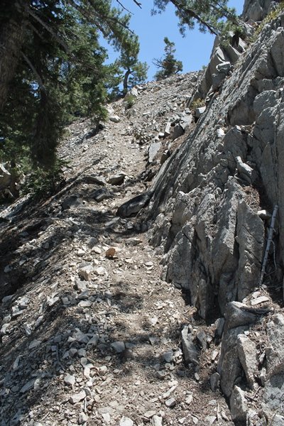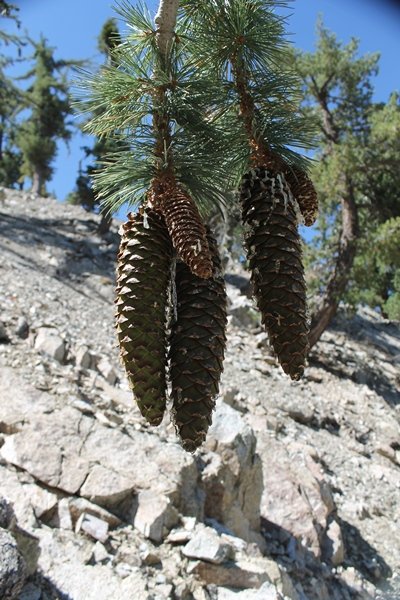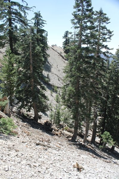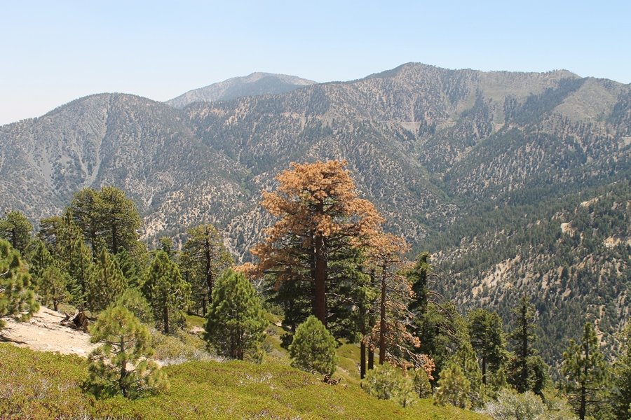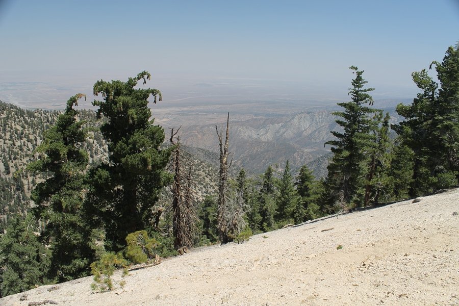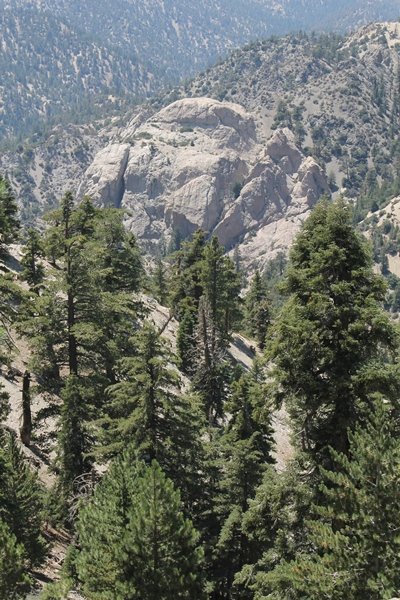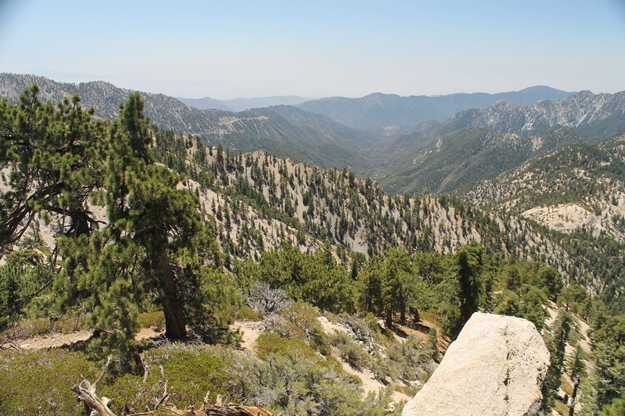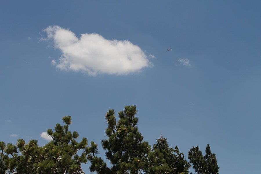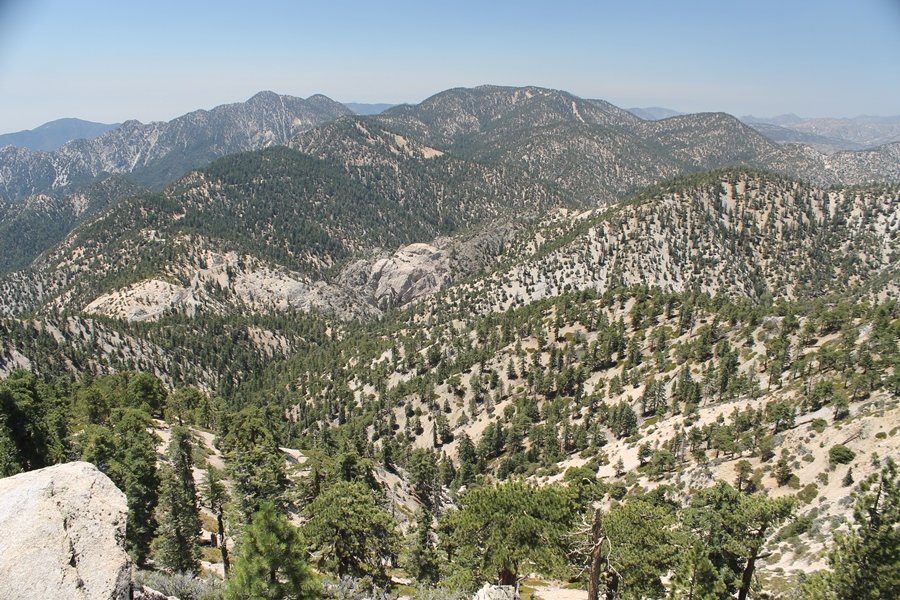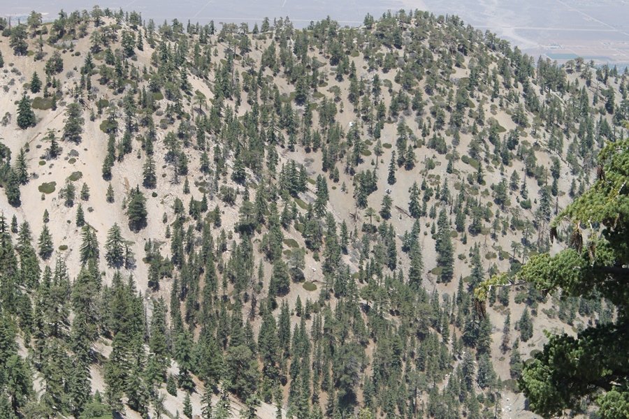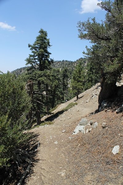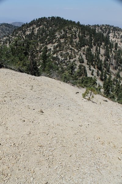 We had intended to hike Mt. Williamson as the second of a two-day exploration of the area around Islip Saddle, but our dog, Frances, got sick the night of our Mt. Islip walk and we had to postpone the next day’s trip as a result. The intervening weekends have been full of events and commitments, but none of them have involved any hiking of appreciable length. So, with our first available window since late June, we decided to give Mt. Williamson another go. The PCT heads west from Islip Saddle up and over Mt. Williamson’s south shoulder before dropping back southwest to Hwy 2, doing so to avoid very steep terrain across the south face of the mountain (Hwy 2 does the same, except that it tunnels under the south face). The distance on the PCT from either trailhead is the same, so, given our mid-morning start, we chose to start from the western trailhead on the far side of the tunnels as it was bound to be shadier than the exposed east side of the mountain. We headed out just before 11am under cloudless skies, making good time for the first half-mile as we ascended through open sugar pine forest – however, Chris quickly tired of our pace and wound up taking a good 30 minutes to cover the first mile (insert lessons about proper conditioning here). After munching on an energy bar, he felt much better, and we soon found ourselves at the crest of the south ridge marked prominently by a cairn – at this point, we turned north up a well-traveled use trail that picks it way up the easternmost of Williamson’s three summits. Most of the use trails we travel are less than well-engineered, usually steep and poorly maintained. We were pleasantly surprised that this one was nicely routed and unexpectedly gentle for the first two hundred yards – perhaps not unexpectedly, this quickly changed as we hit a significantly steeper section below the eastern summit. We picked our way upward, gaining about 300′ in a quarter mile, but the grade leveled out a bit and we found the open east summit before us at 8,214′. A couple of small cairns were here but not much else, so we continued west along the ridge toward the middle summit. The HPS guide notes that, although neither the marked summit (which is the eastern) nor the true high point (which is the western at 8,248′), the middle summit at 8,244′ is where the summit register is located – not. Two large cairns mark the middle summit, but we could not locate a register anywhere in the vicinity, despite an exhaustive search – the abundance of nice rocks and fallen logs for sitting do make this the best spot on the mountain for eating lunch or taking an extended break. We pushed westward over easy terrain to the west summit – here, we again found no register but were rewarded with the most open views along the ridge. To the north, we could easily see a debris field on a lower ridge – some online research revealed that this is the site of a 1966 plane crash, where an Air Force cargo plane went down killing the four unfortunate reservists aboard. The site is well-preserved with much of the plane’s structure intact, but we’ll save exploring that for another day. We had both turned on our phone’s GPS tracking function for a fitness app we’re using, and Jane realized her battery was quickly dying – we headed back east down the ridge, stopping briefly by the east summit to unsuccessfully locate a summit register, before retracing our steps back to the PCT. Once back on the main trail, Jane took off like a crazy woman, her breakaway opening up a large time gap ahead of the peloton (Chris). Down the trail we flew, Chris half-running to keep up – with about a mile to go, he reeled her in, probably due more to the fact she had given up hope of beating her phone’s battery to the finish and had slowed down considerably. In any event, we before long found ourselves back at the van, completing the 5+ miles in just over three hours, a pretty slow pace all things considered. Still, the weather and views were both great, and we look forward to our next hike, once the aches and pains of the rapid descent fade away…