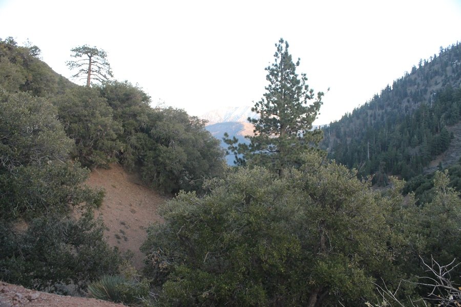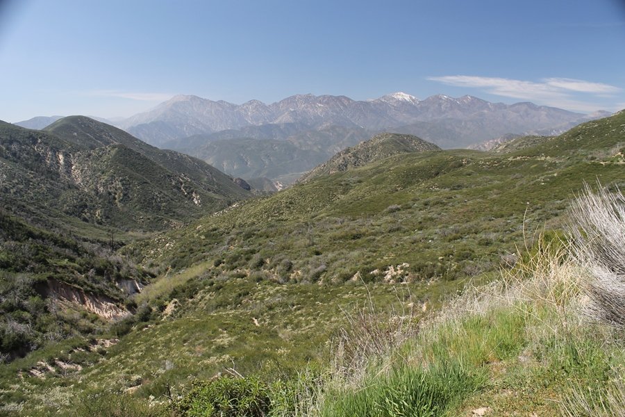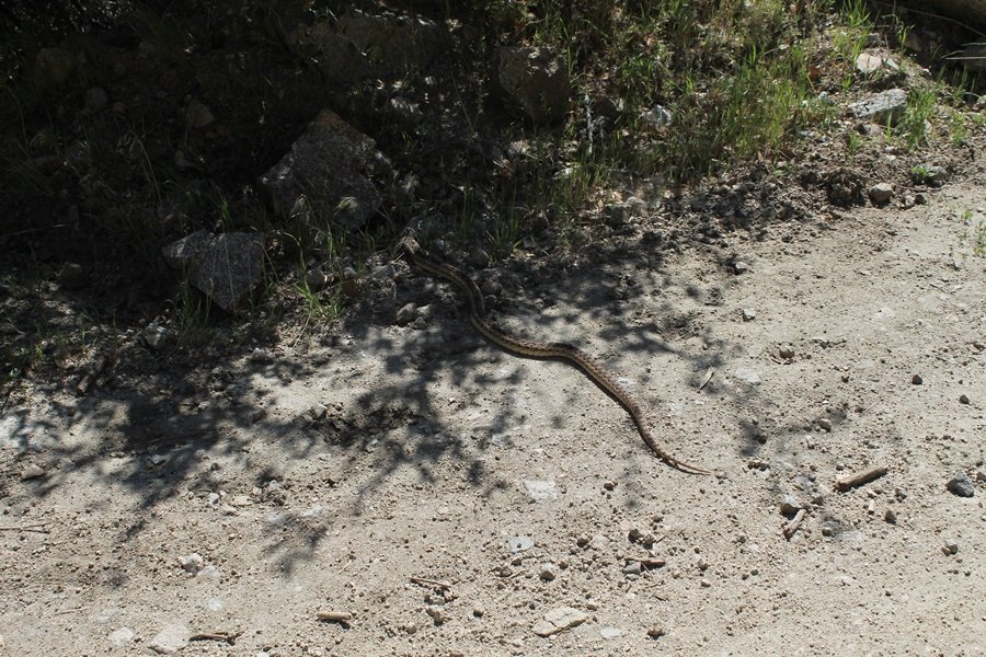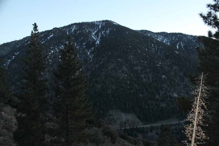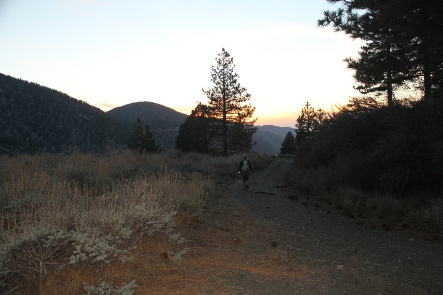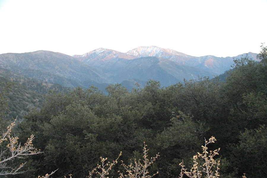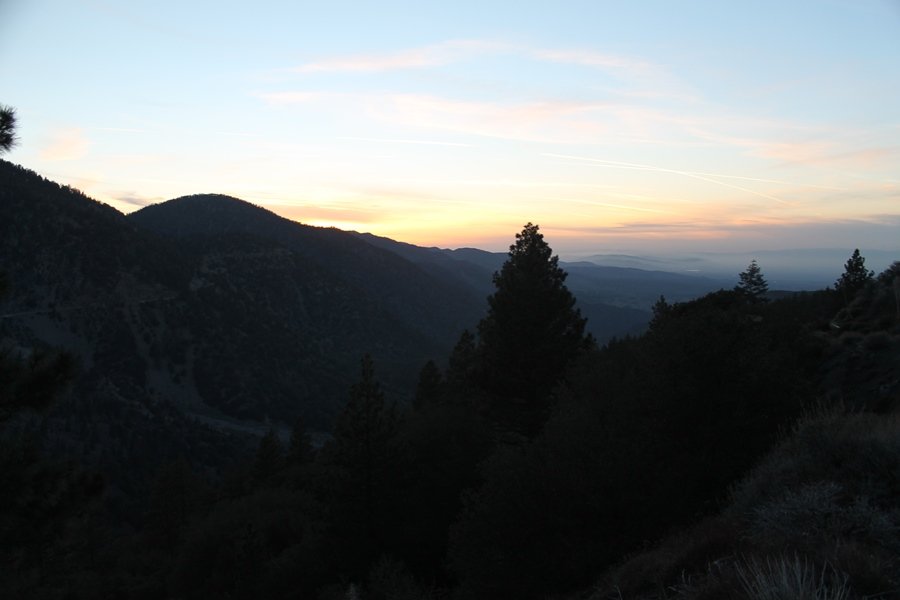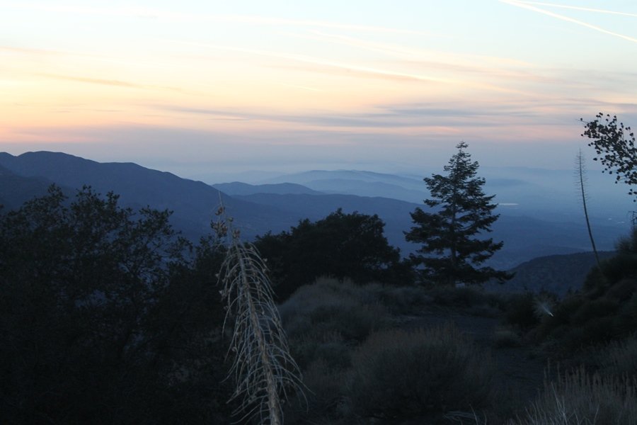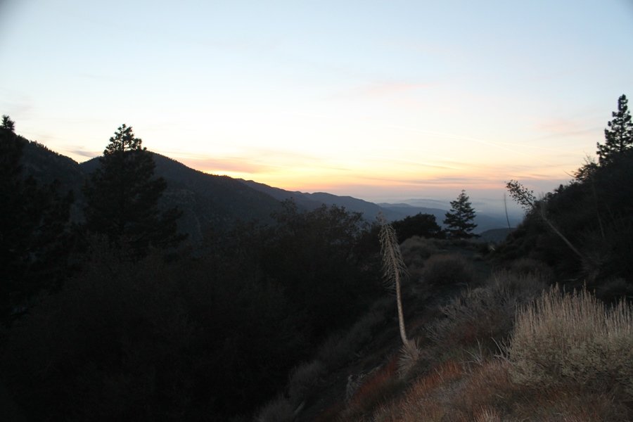 We had planned to hike today to The Pinnacles north of Lake Arrowhead, but halfway there decided we may not have time to do all we had hoped for – we chose instead to explore the West Fork of the Mojave River drainage west of Silverwood Lake, about a half hour east of Wrightwood off of Hwy 138. Cleghorn Road leaves the highway and heads due west, leading in a broad arc west, south, then east again to several summits, and our thoughts were to see how close we could get to either Cajon Mountain or Cleghorn Mountain for a quick hike. We followed the road westward as it changed from paved to dirt after the first mile or so, passing a junction with the PCT and gradually gaining elevation. The surrounding hills were beautiful, very green this time of year, and we crossed over a small stream running south over the road. After maybe 30 minutes, we reached a broad saddle at Cleghorn Pass – we had thought the road continues down the west face of the ridge to a junction with I-15 (where there is a Cleghorn Road offramp below Hwy 138, but that Cleghorn Road and this one never actually meet), but the road simply made an abrupt turn southward toward Cajon Mountain and points beyond. Chris had seen a map online that indicated there is a use trail from here to the summit of Cleghorn Mountain to the north, but a brief reconnaissance yielded nothing but heavy brush wherever a trail might be. We pondered following the road another two miles to Cajon Mountain but chose instead to head back to Wrightwood to take care of some projects and get a sunset hike in later that evening. So, back down the dirt road we went, meeting a silvery-green snake sunning himself in the middle of the track about a mile from the pavement – we would have had to run him over to continue, so Chris took his picture and shooed him off the road. The rest of the afternoon passed uneventfully, until we found ourselves heading west on Hwy 2 to Vincent Gap, where the PCT crosses the highway to ascend Mt. Baden-Powell to the southwest. Our plan was to hike north up the PCT about a mile to where the trail traverses the western end of Blue Ridge – here, we figured the open slopes would offer a nice view of the sunset. The trouble was that sunset was listed as 7:02pm, and we didn’t reach the trailhead until 6:30pm. This would not have been a big issue if the hike was to be on flat ground, but the northbound PCT at this point gains about 900′ of elevation in its first mile, and the steep climb quickly winded us as we raced up the trail, on the way passing through a remarkably dense grove of oaks. By 7:00pm we were still about a quarter mile south of the vantage point we had planned to gain, so we turned west where the trail crosses a Forest Service road and walked about 200 yards down it to see the last moments of the now-waning sunset. It was a marvelous view, although it would have been much better had we arrived 30 minutes earlier. By this time, the breeze had picked up and it was getting chilly, and the light was also fading fast – out came the jackets and headlamps, and we retraced our steps back to the trailhead. Hwy 2 westbound is still closed from Vincent Gap, but we’re hopeful that it opens soon so we can do more sunset hikes to other vistas further west.
