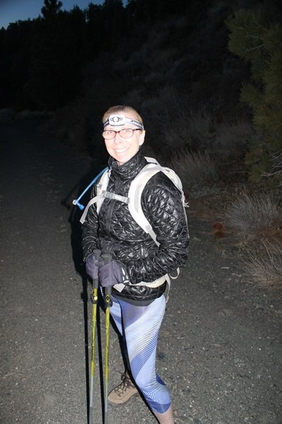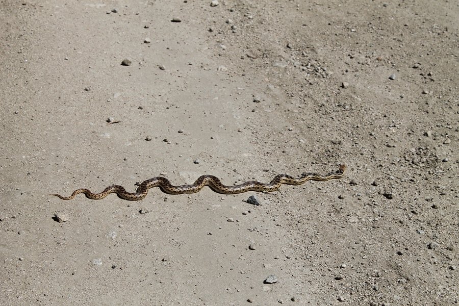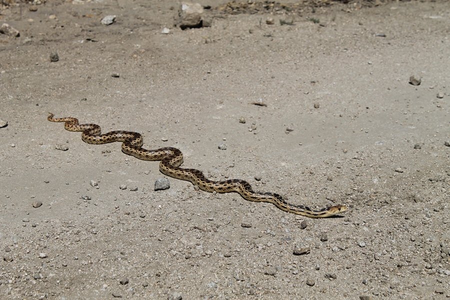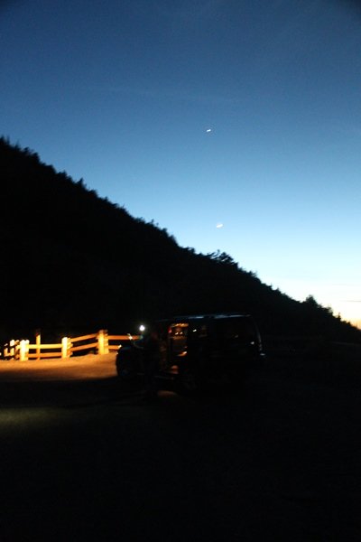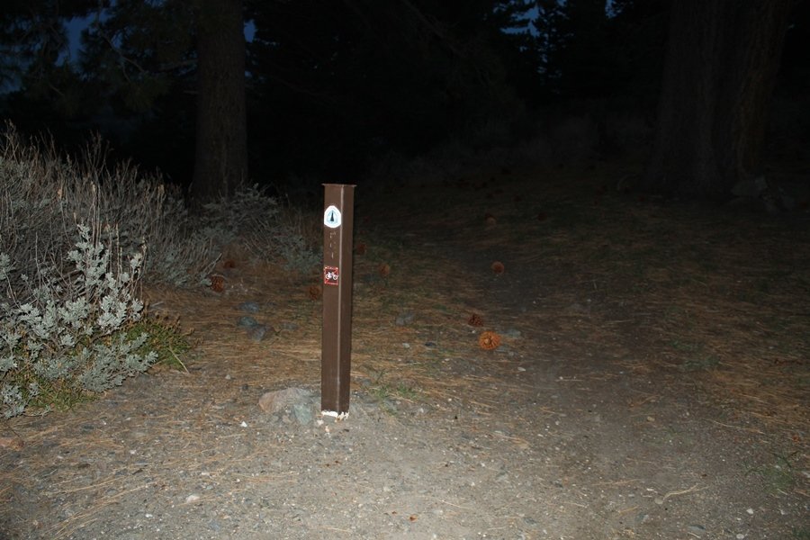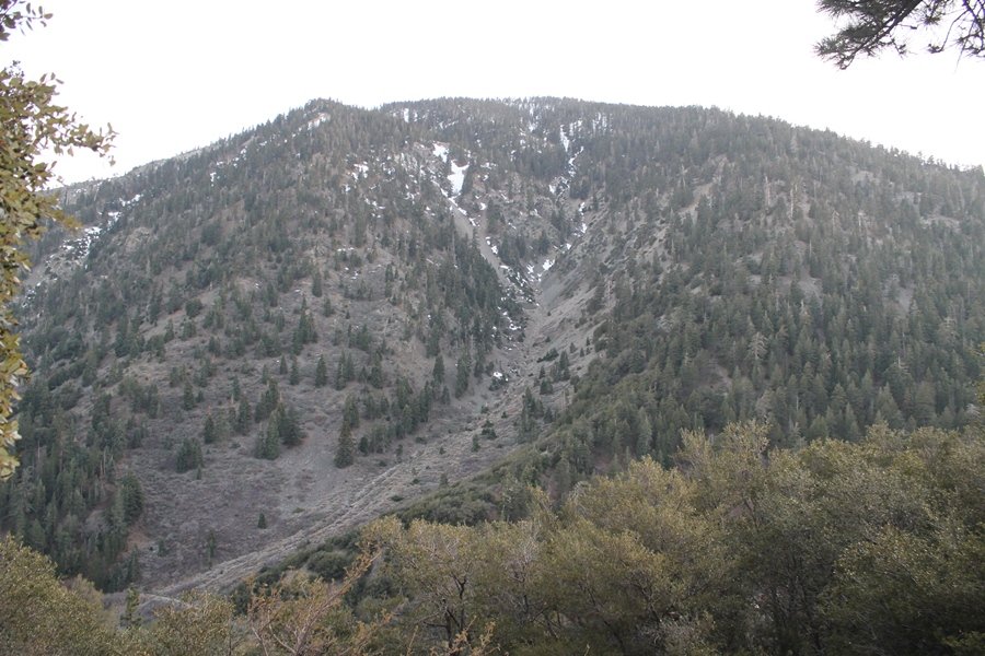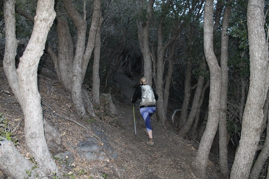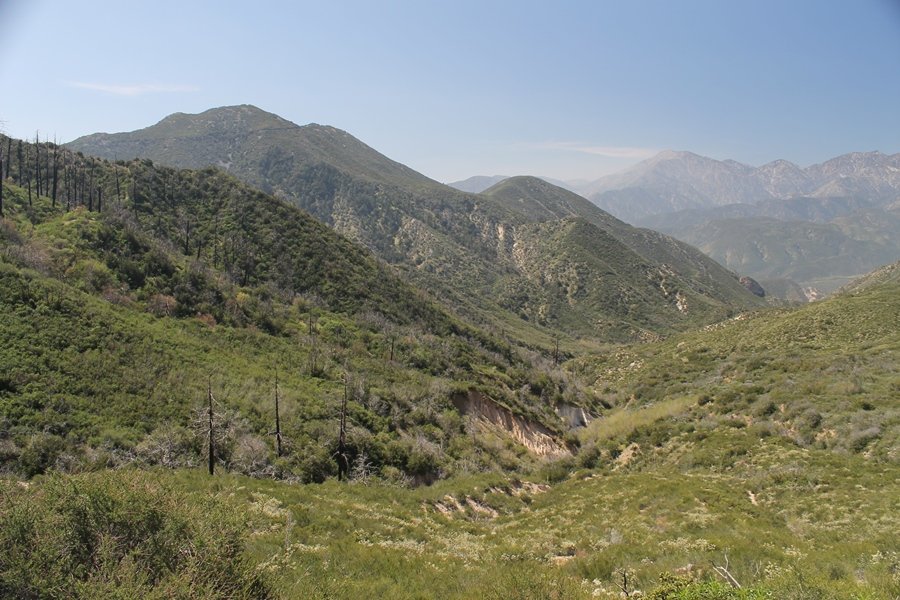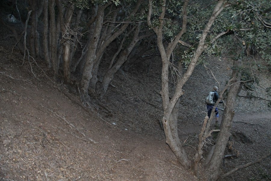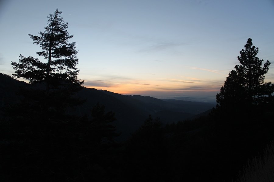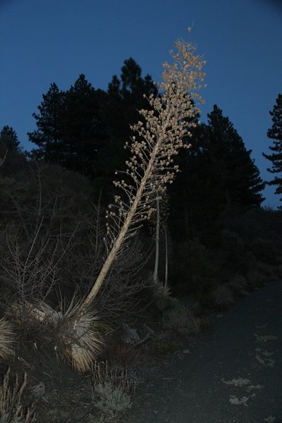 We had planned to hike today to The Pinnacles north of Lake Arrowhead, but halfway there decided we may not have time to do all we had hoped for – we chose instead to explore the West Fork of the Mojave River drainage west of Silverwood Lake, about a half hour east of Wrightwood off of Hwy 138. Cleghorn Road leaves the highway and heads due west, leading in a broad arc west, south, then east again to several summits, and our thoughts were to see how close we could get to either Cajon Mountain or Cleghorn Mountain for a quick hike. We followed the road westward as it changed from paved to dirt after the first mile or so, passing a junction with the PCT and gradually gaining elevation. The surrounding hills were beautiful, very green this time of year, and we crossed over a small stream running south over the road. After maybe 30 minutes, we reached a broad saddle at Cleghorn Pass – we had thought the road continues down the west face of the ridge to a junction with I-15 (where there is a Cleghorn Road offramp below Hwy 138, but that Cleghorn Road and this one never actually meet), but the road simply made an abrupt turn southward toward Cajon Mountain and points beyond. Chris had seen a map online that indicated there is a use trail from here to the summit of Cleghorn Mountain to the north, but a brief reconnaissance yielded nothing but heavy brush wherever a trail might be. We pondered following the road another two miles to Cajon Mountain but chose instead to head back to Wrightwood to take care of some projects and get a sunset hike in later that evening. So, back down the dirt road we went, meeting a silvery-green snake sunning himself in the middle of the track about a mile from the pavement – we would have had to run him over to continue, so Chris took his picture and shooed him off the road. The rest of the afternoon passed uneventfully, until we found ourselves heading west on Hwy 2 to Vincent Gap, where the PCT crosses the highway to ascend Mt. Baden-Powell to the southwest. Our plan was to hike north up the PCT about a mile to where the trail traverses the western end of Blue Ridge – here, we figured the open slopes would offer a nice view of the sunset. The trouble was that sunset was listed as 7:02pm, and we didn’t reach the trailhead until 6:30pm. This would not have been a big issue if the hike was to be on flat ground, but the northbound PCT at this point gains about 900′ of elevation in its first mile, and the steep climb quickly winded us as we raced up the trail, on the way passing through a remarkably dense grove of oaks. By 7:00pm we were still about a quarter mile south of the vantage point we had planned to gain, so we turned west where the trail crosses a Forest Service road and walked about 200 yards down it to see the last moments of the now-waning sunset. It was a marvelous view, although it would have been much better had we arrived 30 minutes earlier. By this time, the breeze had picked up and it was getting chilly, and the light was also fading fast – out came the jackets and headlamps, and we retraced our steps back to the trailhead. Hwy 2 westbound is still closed from Vincent Gap, but we’re hopeful that it opens soon so we can do more sunset hikes to other vistas further west.