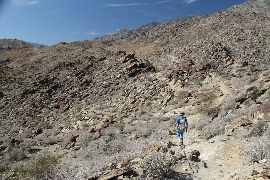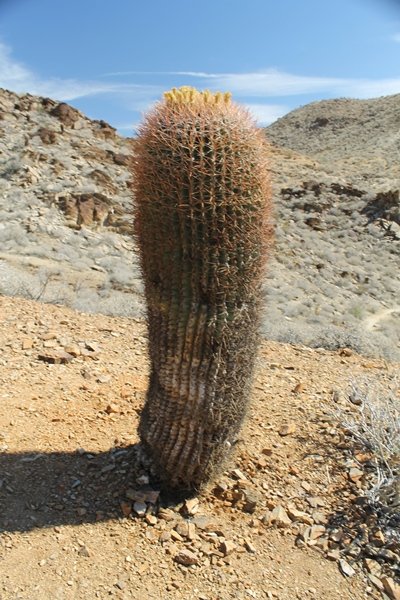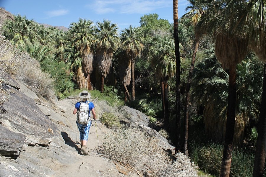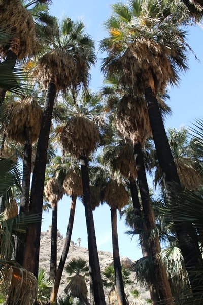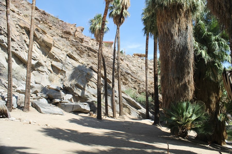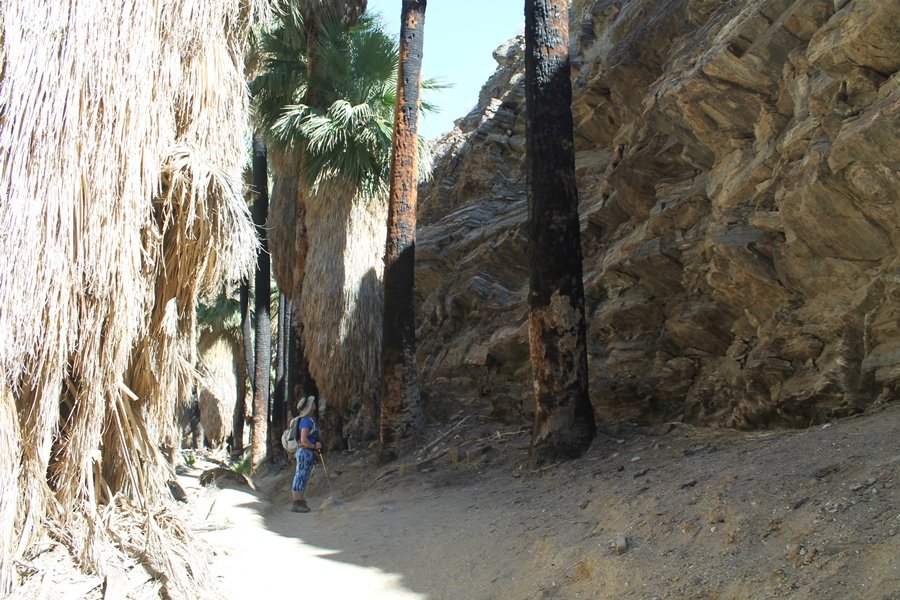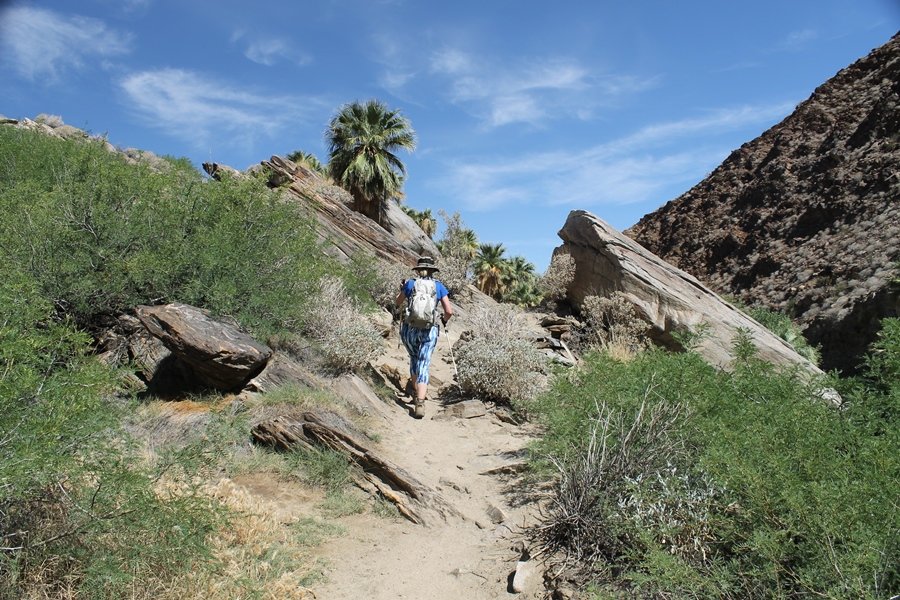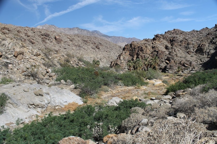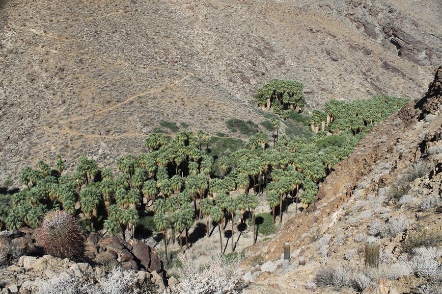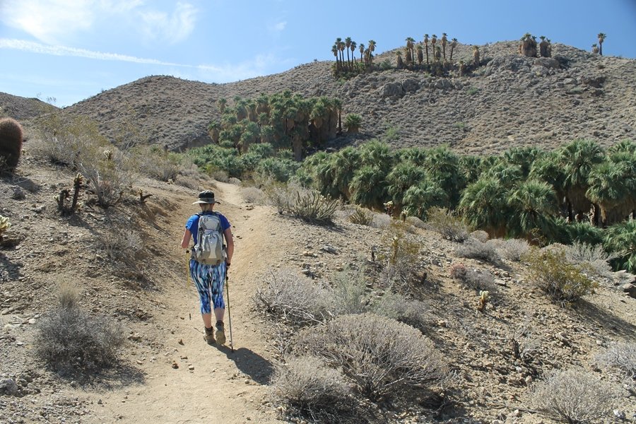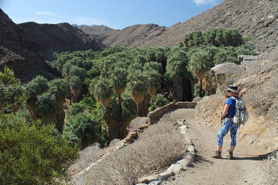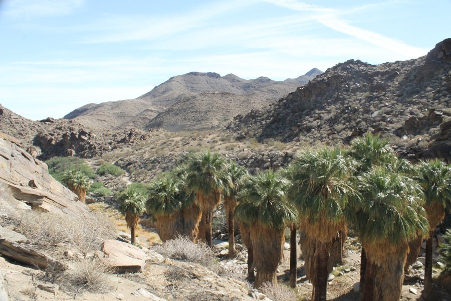 Months ago, we had made some reservations at a golf resort in Palm Desert through an email advertisement, thinking we’d enjoy some nice spring weather and a chance to hike in the desert. As the dates approached, however, it looked more like the area was going to be hot, hot, and hot during our three full days there – oh well, we figured we’d just have to get out early to beat the heat, forecasted to be over 100 degrees each day. We chose to first visit Indian Canyons on Day 1, located due south of Palm Springs on the Agua Caliente Indian Reservation. Initially intending to hike a 6.5-mile loop east through the outback, a helpful tribal ranger at the Hermit’s Bench trading post and visitor center suggested we contain our hike to a 3-mile loop through greener, wetter areas close by, thus saving time to visit a couple of more well-watered canyons to the north before the heat of the day fully set in. Most people do this loop by going first south up Palm Canyon, the world’s largest natural fan palm oasis, before returning north on the Victor Trail that runs along the bluffs above the canyon to the east – there was another group setting out through Palm Canyon as we got started, so we decided to do the loop in the reverse direction. We headed east first away from the trading post toward Fern Canyon (where there used to be ferns during wetter years) where, after about half a mile, we turned south up the Victor Trail – despite the early hour (about 8:30am), it was quite warm already, and there was no shade at all on this route. Still, the moderate climb southward was enjoyable, despite the heat – the scenery was beautiful as we passed teddy bear cholla and barrel cacti in bloom. Occasionally, we got glimpses west into the Palm Canyon oasis that were very pretty, and we also got wonderful views of the entire San Jacinto range high above us to the west and the Santa Rosa mountains to the south. After nearly a mile uphill in the exposed sun, we were ready for some shade, and it was a nice transition as we reached the palms at the upper end of the canyon and headed back north. Probably 15 degrees cooler, we passed quickly through the palm forest, eventually following a lightly flowing creek evidently fed by springs and seeps we occasionally encountered. Willows and reeds were abundant beneath the palms, as were large orange dragonflies – it was quite unlike anything we had yet seen in California. We soon arrived at a picnic area below the trading post, and we climbed out of the canyon and into the air-conditioned store and lunch counter there to cool off. The ranger was still there, so we asked him more about the other canyons he had recommended – one involved an exposed half-mile walk while the other one didn’t, so we chose the latter. A wonderful area to visit, but the heat made it less fun than it might have been otherwise.