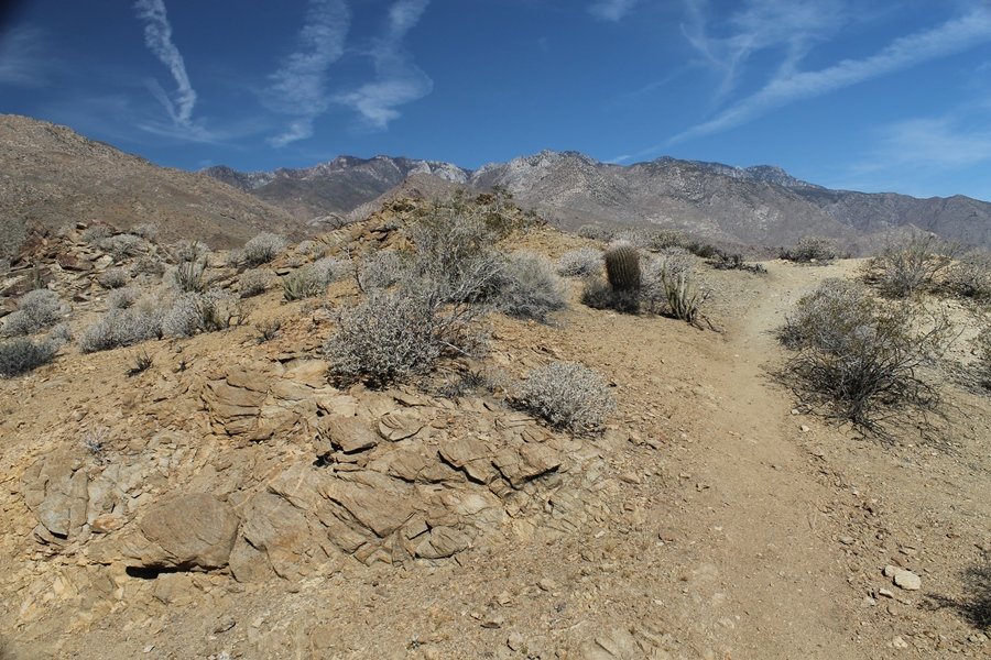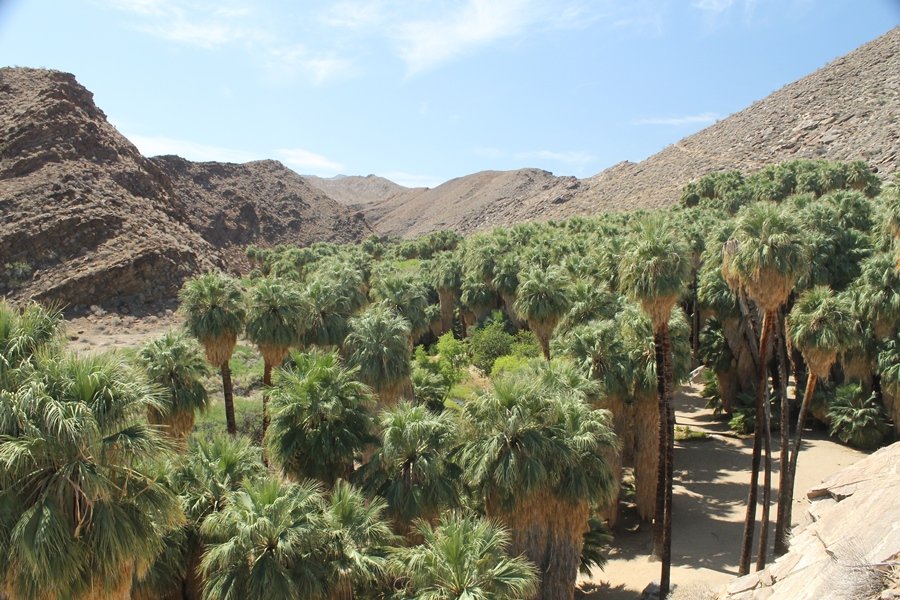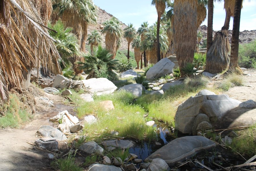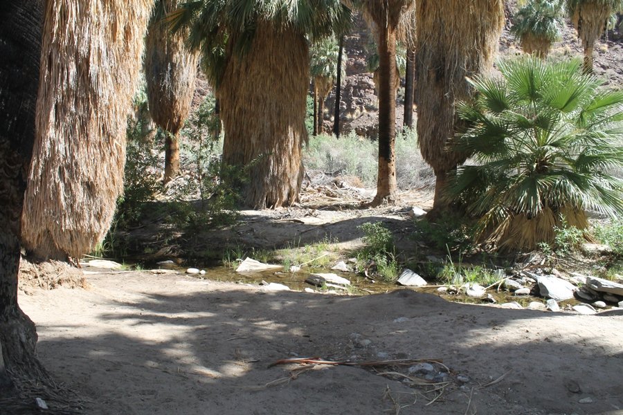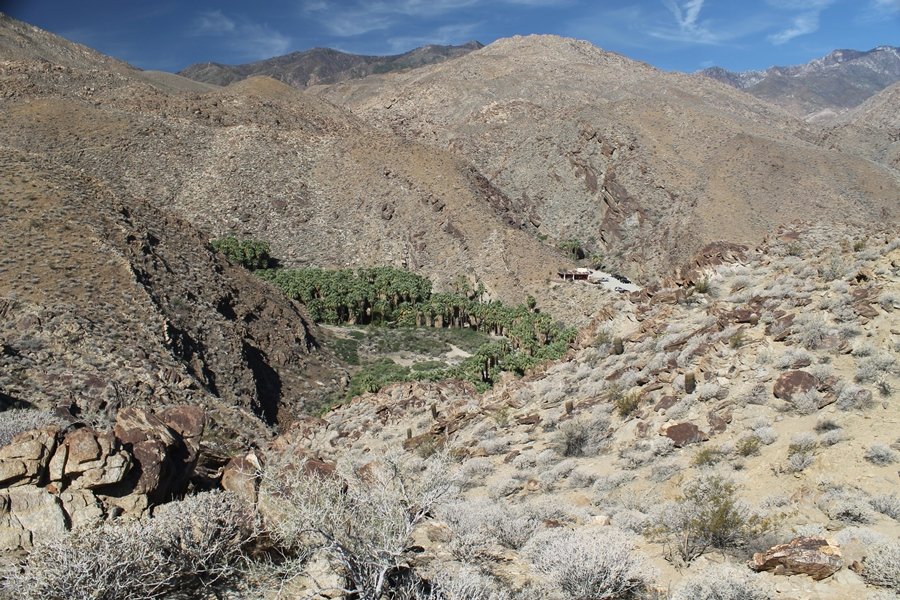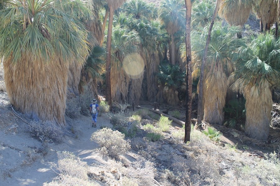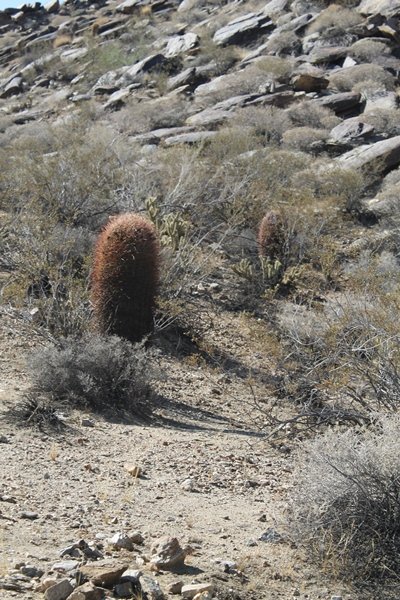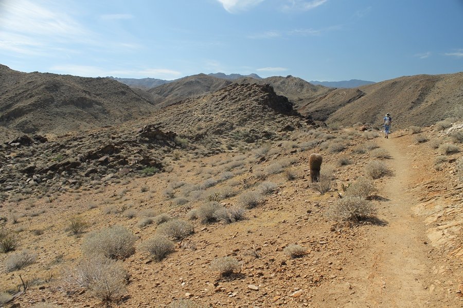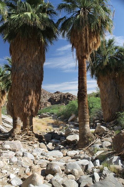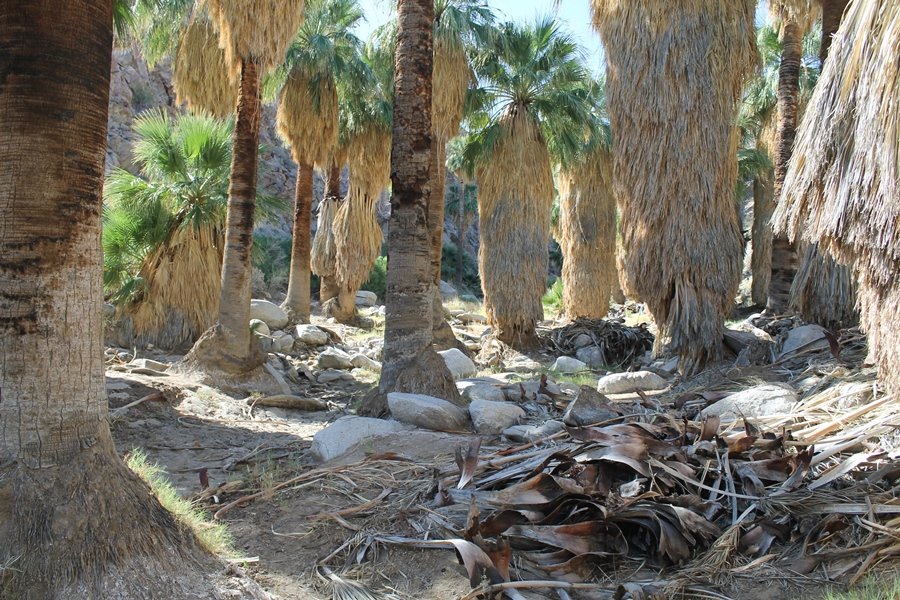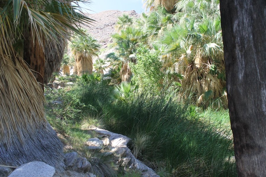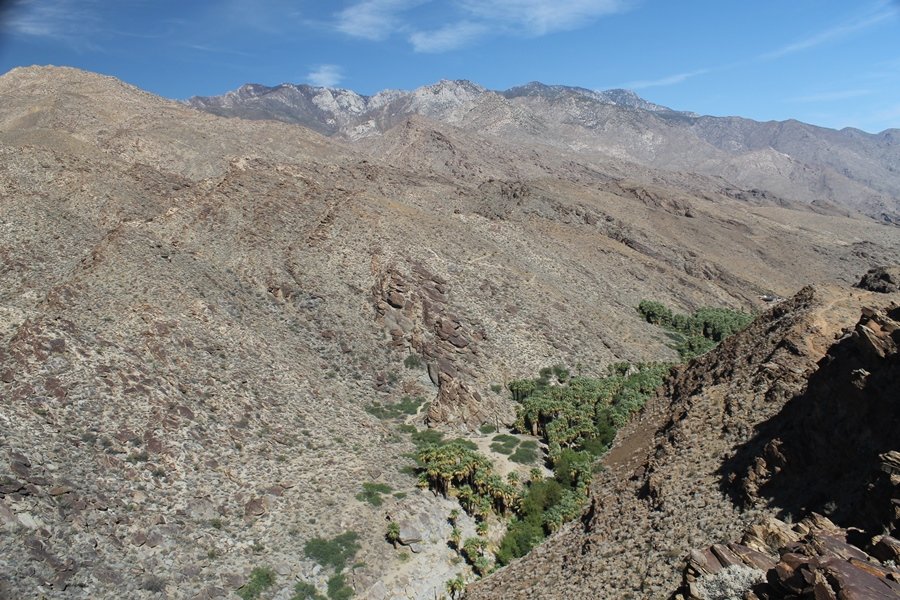 Months ago, we had made some reservations at a golf resort in Palm Desert through an email advertisement, thinking we’d enjoy some nice spring weather and a chance to hike in the desert. As the dates approached, however, it looked more like the area was going to be hot, hot, and hot during our three full days there – oh well, we figured we’d just have to get out early to beat the heat, forecasted to be over 100 degrees each day. We chose to first visit Indian Canyons on Day 1, located due south of Palm Springs on the Agua Caliente Indian Reservation. Initially intending to hike a 6.5-mile loop east through the outback, a helpful tribal ranger at the Hermit’s Bench trading post and visitor center suggested we contain our hike to a 3-mile loop through greener, wetter areas close by, thus saving time to visit a couple of more well-watered canyons to the north before the heat of the day fully set in. Most people do this loop by going first south up Palm Canyon, the world’s largest natural fan palm oasis, before returning north on the Victor Trail that runs along the bluffs above the canyon to the east – there was another group setting out through Palm Canyon as we got started, so we decided to do the loop in the reverse direction. We headed east first away from the trading post toward Fern Canyon (where there used to be ferns during wetter years) where, after about half a mile, we turned south up the Victor Trail – despite the early hour (about 8:30am), it was quite warm already, and there was no shade at all on this route. Still, the moderate climb southward was enjoyable, despite the heat – the scenery was beautiful as we passed teddy bear cholla and barrel cacti in bloom. Occasionally, we got glimpses west into the Palm Canyon oasis that were very pretty, and we also got wonderful views of the entire San Jacinto range high above us to the west and the Santa Rosa mountains to the south. After nearly a mile uphill in the exposed sun, we were ready for some shade, and it was a nice transition as we reached the palms at the upper end of the canyon and headed back north. Probably 15 degrees cooler, we passed quickly through the palm forest, eventually following a lightly flowing creek evidently fed by springs and seeps we occasionally encountered. Willows and reeds were abundant beneath the palms, as were large orange dragonflies – it was quite unlike anything we had yet seen in California. We soon arrived at a picnic area below the trading post, and we climbed out of the canyon and into the air-conditioned store and lunch counter there to cool off. The ranger was still there, so we asked him more about the other canyons he had recommended – one involved an exposed half-mile walk while the other one didn’t, so we chose the latter. A wonderful area to visit, but the heat made it less fun than it might have been otherwise.