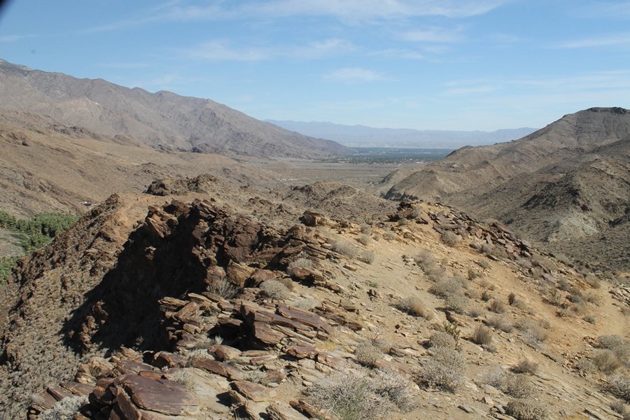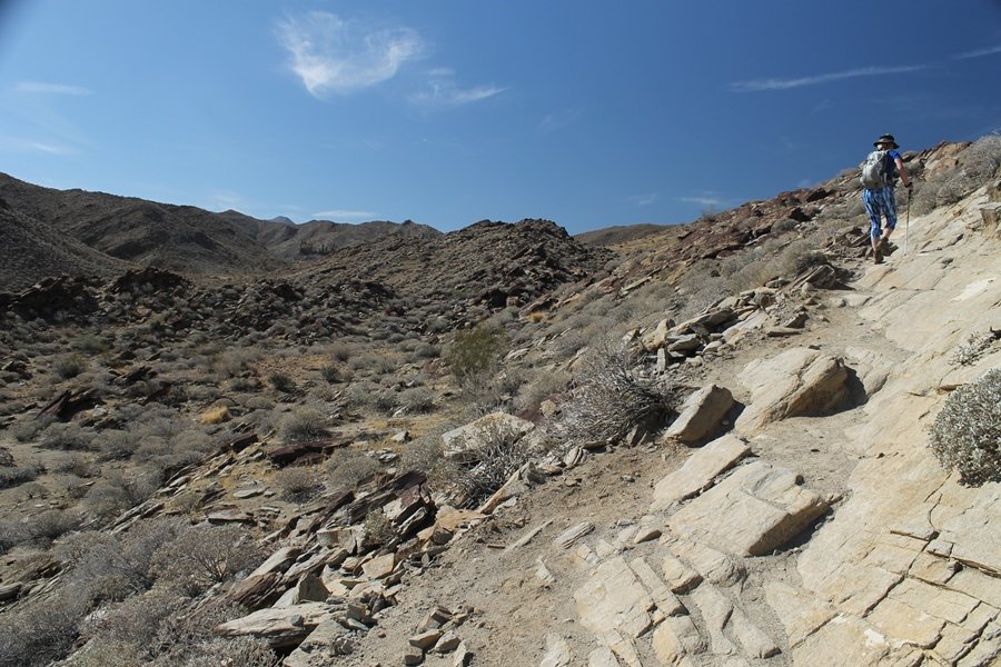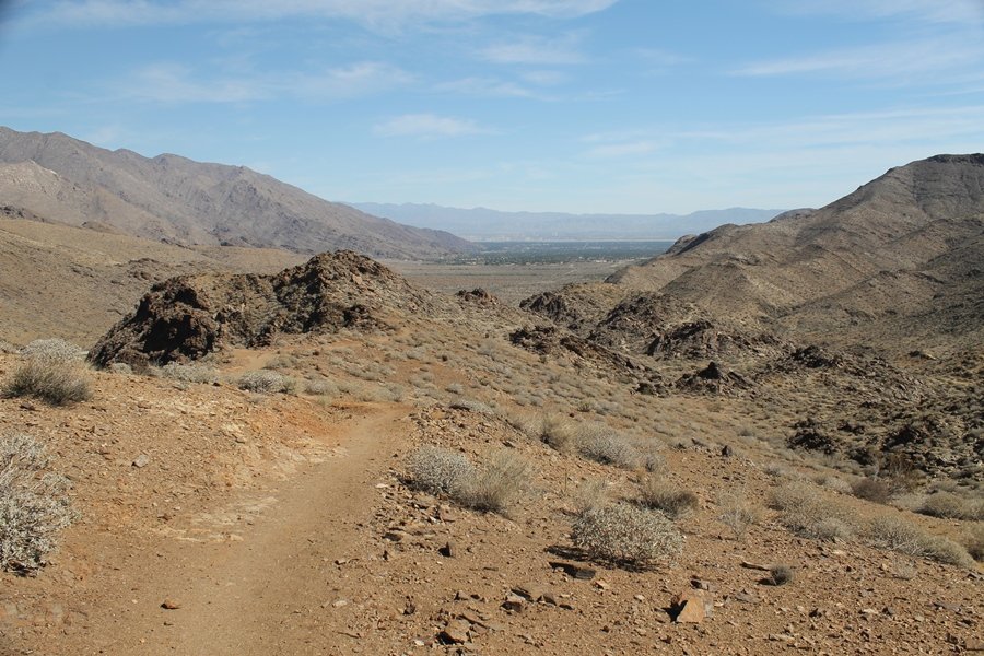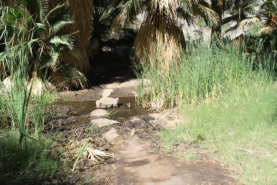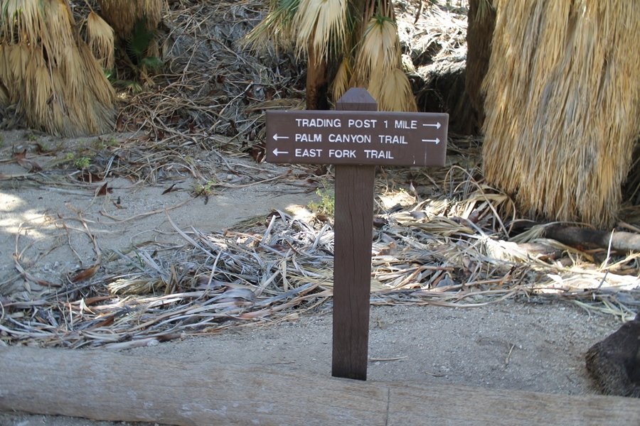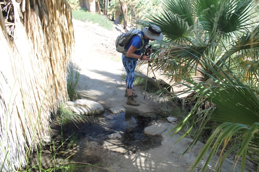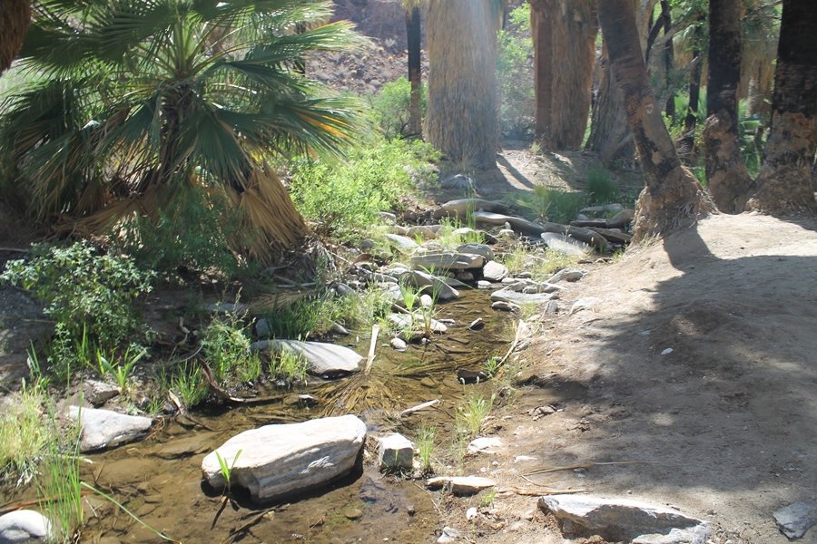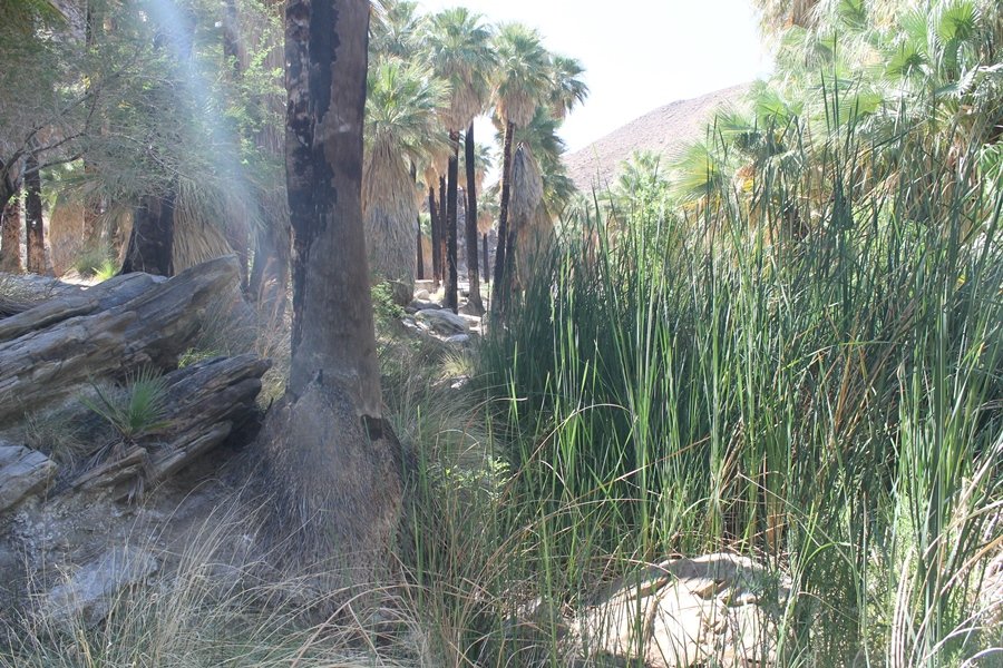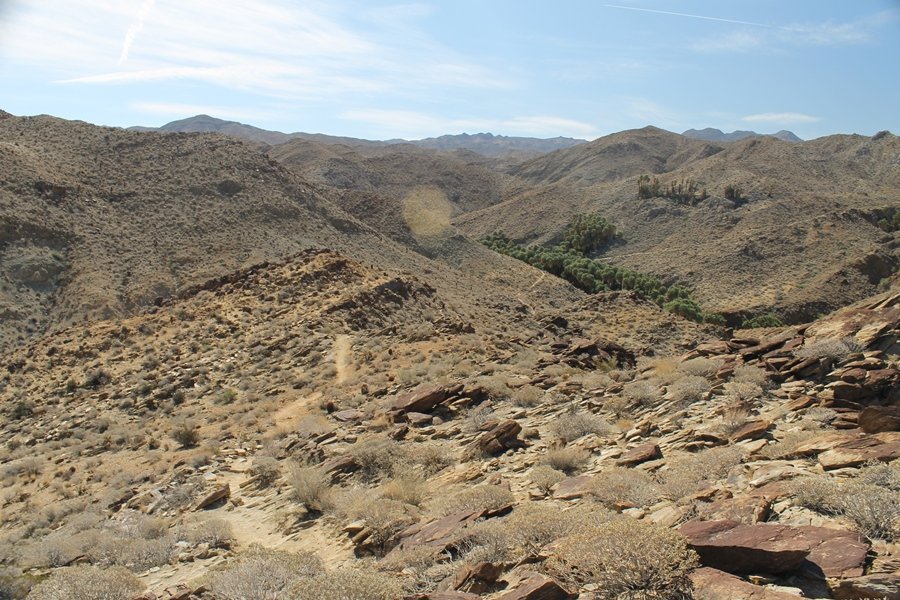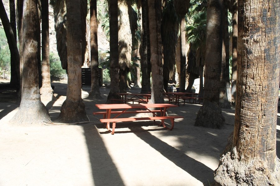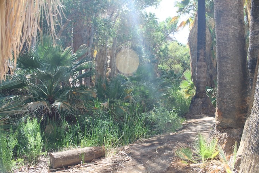 Months ago, we had made some reservations at a golf resort in Palm Desert through an email advertisement, thinking we’d enjoy some nice spring weather and a chance to hike in the desert. As the dates approached, however, it looked more like the area was going to be hot, hot, and hot during our three full days there – oh well, we figured we’d just have to get out early to beat the heat, forecasted to be over 100 degrees each day. We chose to first visit Indian Canyons on Day 1, located due south of Palm Springs on the Agua Caliente Indian Reservation. Initially intending to hike a 6.5-mile loop east through the outback, a helpful tribal ranger at the Hermit’s Bench trading post and visitor center suggested we contain our hike to a 3-mile loop through greener, wetter areas close by, thus saving time to visit a couple of more well-watered canyons to the north before the heat of the day fully set in. Most people do this loop by going first south up Palm Canyon, the world’s largest natural fan palm oasis, before returning north on the Victor Trail that runs along the bluffs above the canyon to the east – there was another group setting out through Palm Canyon as we got started, so we decided to do the loop in the reverse direction. We headed east first away from the trading post toward Fern Canyon (where there used to be ferns during wetter years) where, after about half a mile, we turned south up the Victor Trail – despite the early hour (about 8:30am), it was quite warm already, and there was no shade at all on this route. Still, the moderate climb southward was enjoyable, despite the heat – the scenery was beautiful as we passed teddy bear cholla and barrel cacti in bloom. Occasionally, we got glimpses west into the Palm Canyon oasis that were very pretty, and we also got wonderful views of the entire San Jacinto range high above us to the west and the Santa Rosa mountains to the south. After nearly a mile uphill in the exposed sun, we were ready for some shade, and it was a nice transition as we reached the palms at the upper end of the canyon and headed back north. Probably 15 degrees cooler, we passed quickly through the palm forest, eventually following a lightly flowing creek evidently fed by springs and seeps we occasionally encountered. Willows and reeds were abundant beneath the palms, as were large orange dragonflies – it was quite unlike anything we had yet seen in California. We soon arrived at a picnic area below the trading post, and we climbed out of the canyon and into the air-conditioned store and lunch counter there to cool off. The ranger was still there, so we asked him more about the other canyons he had recommended – one involved an exposed half-mile walk while the other one didn’t, so we chose the latter. A wonderful area to visit, but the heat made it less fun than it might have been otherwise.