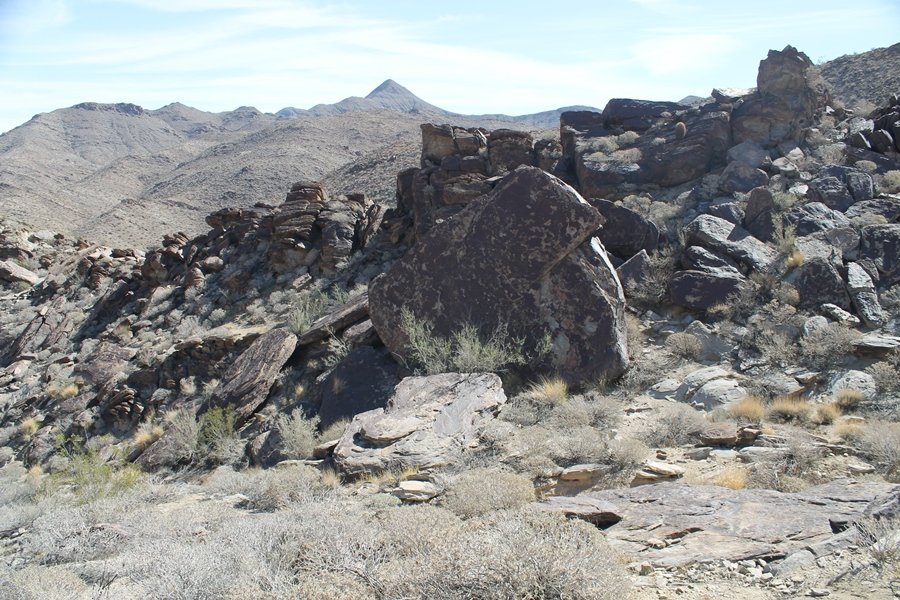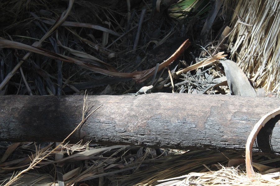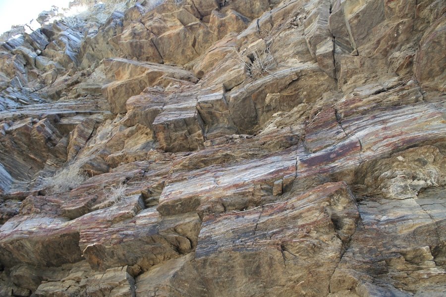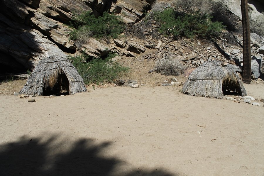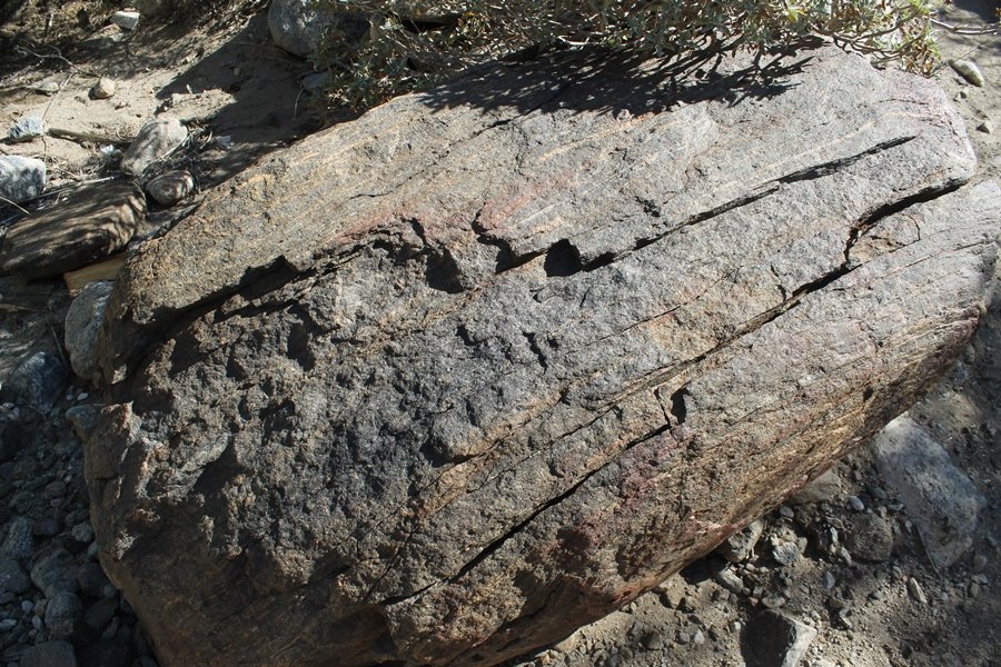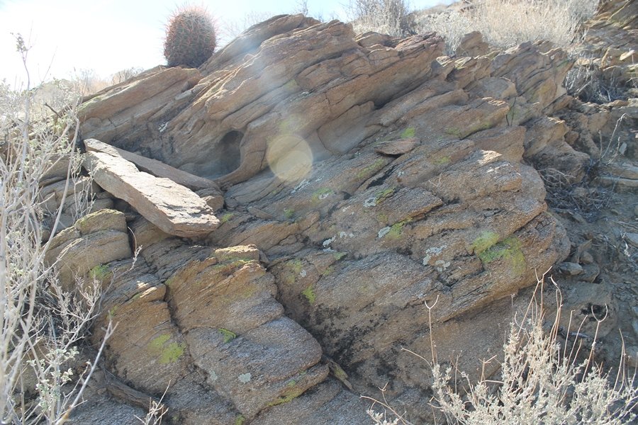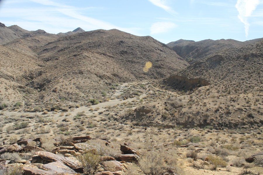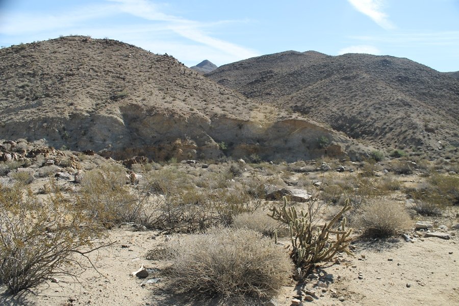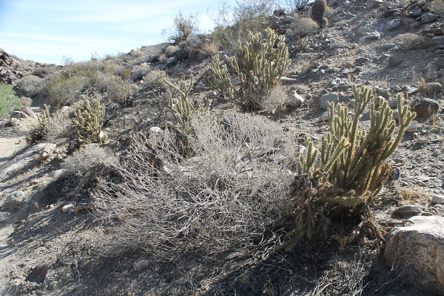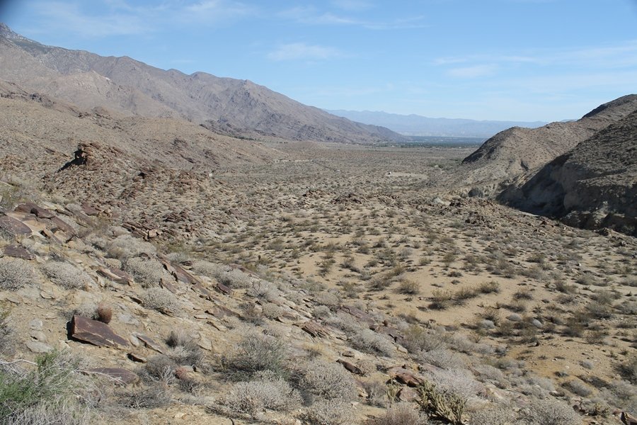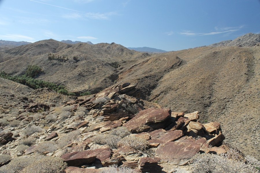 Months ago, we had made some reservations at a golf resort in Palm Desert through an email advertisement, thinking we’d enjoy some nice spring weather and a chance to hike in the desert. As the dates approached, however, it looked more like the area was going to be hot, hot, and hot during our three full days there – oh well, we figured we’d just have to get out early to beat the heat, forecasted to be over 100 degrees each day. We chose to first visit Indian Canyons on Day 1, located due south of Palm Springs on the Agua Caliente Indian Reservation. Initially intending to hike a 6.5-mile loop east through the outback, a helpful tribal ranger at the Hermit’s Bench trading post and visitor center suggested we contain our hike to a 3-mile loop through greener, wetter areas close by, thus saving time to visit a couple of more well-watered canyons to the north before the heat of the day fully set in. Most people do this loop by going first south up Palm Canyon, the world’s largest natural fan palm oasis, before returning north on the Victor Trail that runs along the bluffs above the canyon to the east – there was another group setting out through Palm Canyon as we got started, so we decided to do the loop in the reverse direction. We headed east first away from the trading post toward Fern Canyon (where there used to be ferns during wetter years) where, after about half a mile, we turned south up the Victor Trail – despite the early hour (about 8:30am), it was quite warm already, and there was no shade at all on this route. Still, the moderate climb southward was enjoyable, despite the heat – the scenery was beautiful as we passed teddy bear cholla and barrel cacti in bloom. Occasionally, we got glimpses west into the Palm Canyon oasis that were very pretty, and we also got wonderful views of the entire San Jacinto range high above us to the west and the Santa Rosa mountains to the south. After nearly a mile uphill in the exposed sun, we were ready for some shade, and it was a nice transition as we reached the palms at the upper end of the canyon and headed back north. Probably 15 degrees cooler, we passed quickly through the palm forest, eventually following a lightly flowing creek evidently fed by springs and seeps we occasionally encountered. Willows and reeds were abundant beneath the palms, as were large orange dragonflies – it was quite unlike anything we had yet seen in California. We soon arrived at a picnic area below the trading post, and we climbed out of the canyon and into the air-conditioned store and lunch counter there to cool off. The ranger was still there, so we asked him more about the other canyons he had recommended – one involved an exposed half-mile walk while the other one didn’t, so we chose the latter. A wonderful area to visit, but the heat made it less fun than it might have been otherwise.