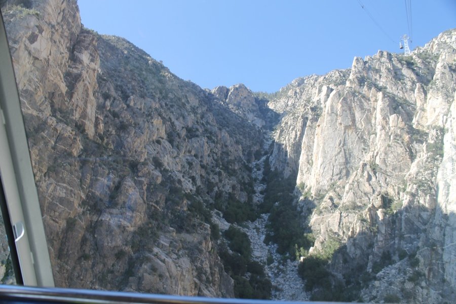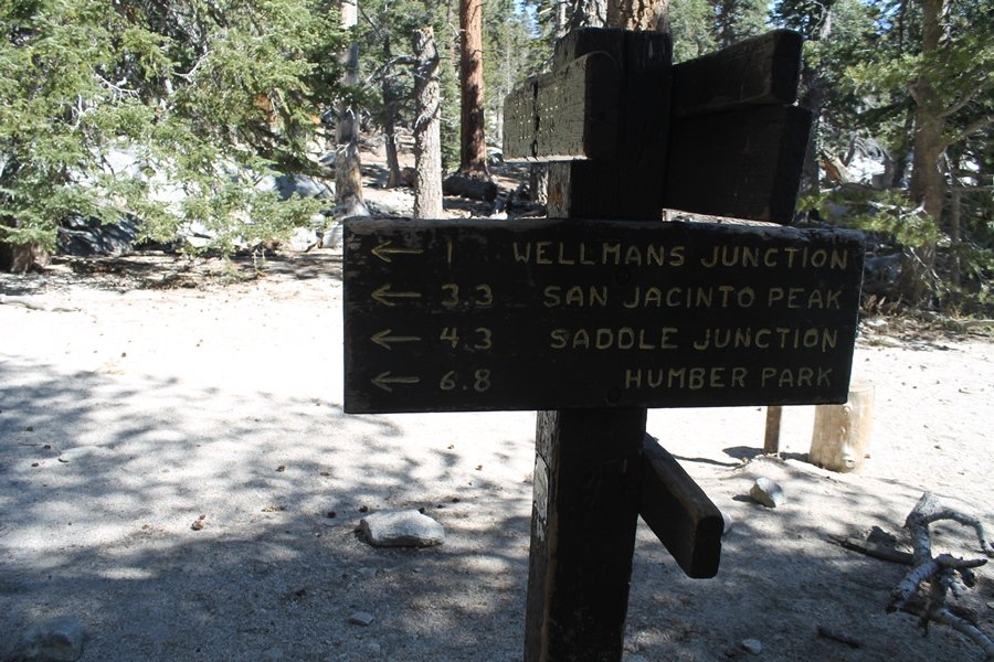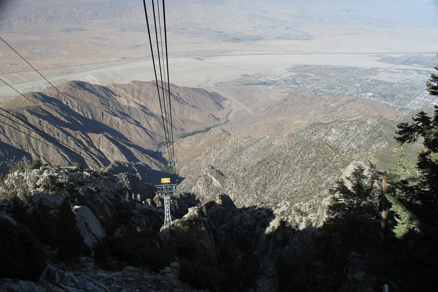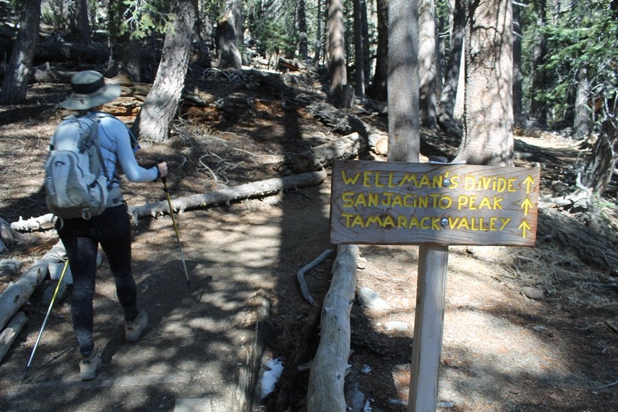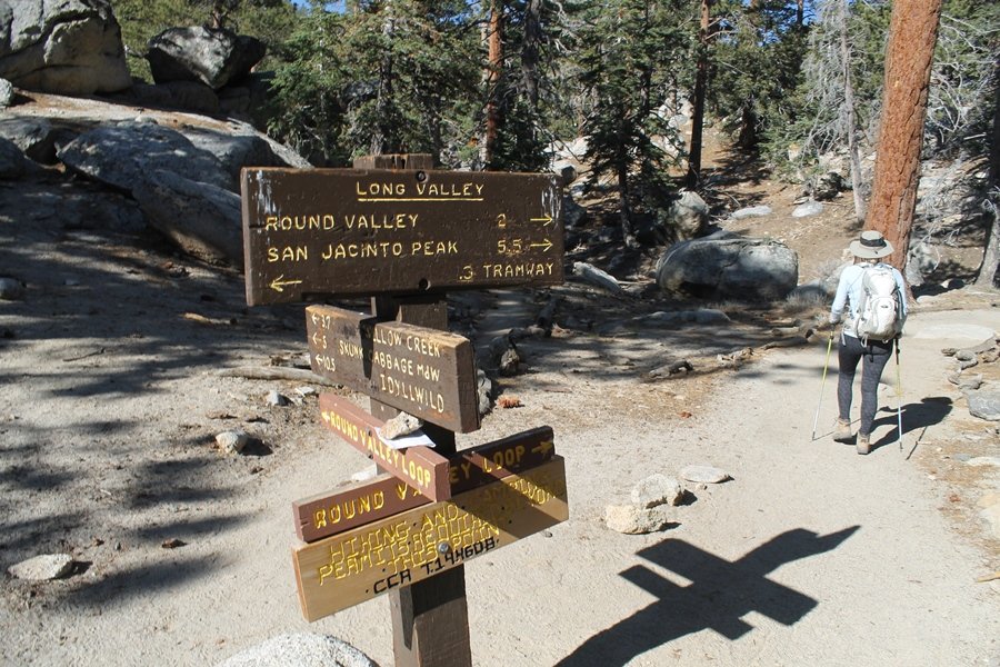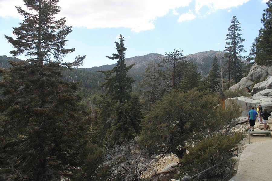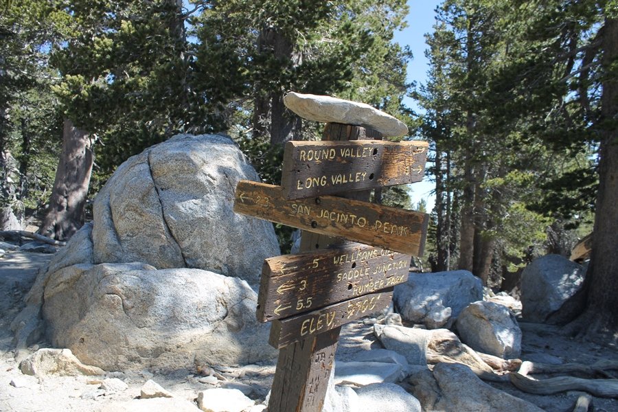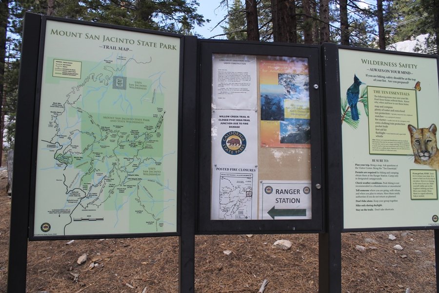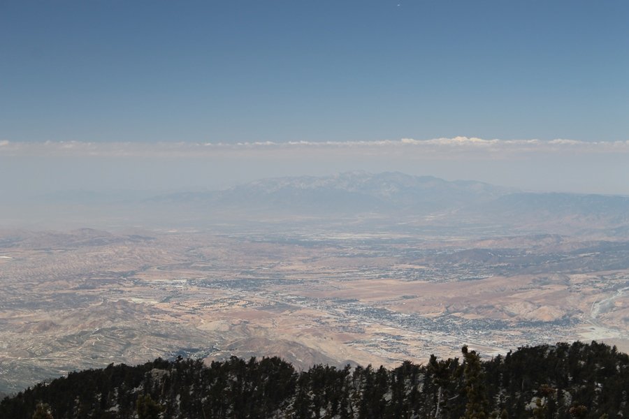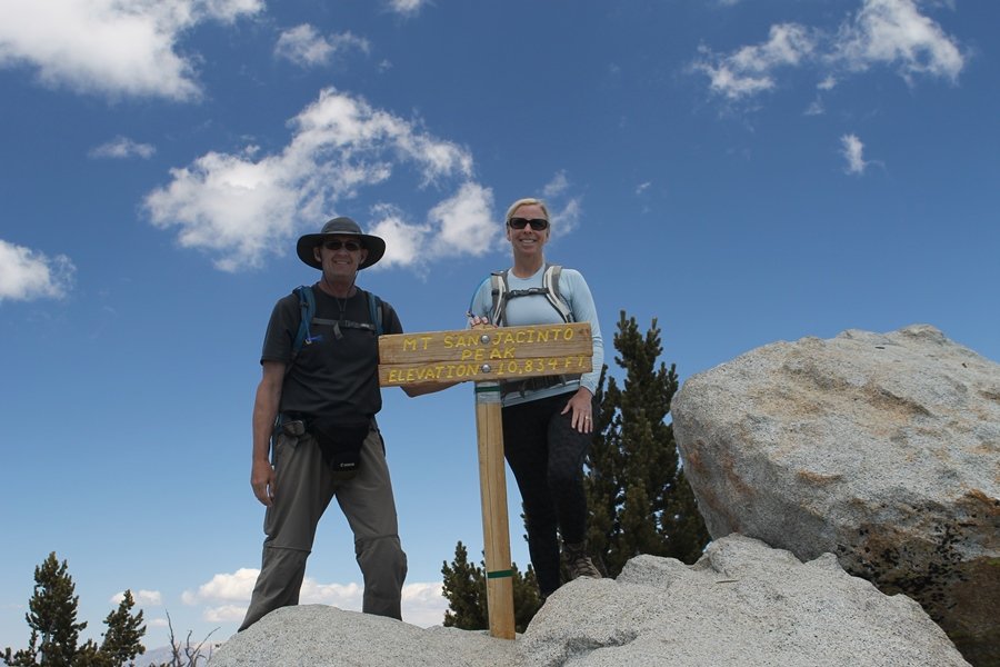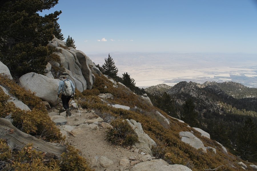 We could have booked our Palm Desert trip several weeks earlier, but we chose to do it relatively late because we wanted to hike San Jacinto Peak, and we were worried that the higher mountains would still be snowy earlier in the season. Day 3 of our stay in the desert had us rushing out the door to catch the 8am tram (we were a little late and caught the 8:15) to the trailhead. San Jacinto Peak, 10,834′, is the second highest peak in Southern California (San Gorgonio Mountain is 665′ taller), but it’s one of the most prominent summits in the country – the canyon floor at the northern base of the mountain is at elevation 2,000′ and only four miles from the summit. Trails lead to the peak from both the west and east, but the shortest and most popular route runs about 5-1/2 miles west from the Palm Springs aerial tramway station to Wellman Divide, then north along the mountain’s east slope to the summit – we have seen various round-trip distances noted, but we expected it to be somewhere between 10 and 11 miles total with about 2,400′ of gain. The tram ride up, first of all, is an experience in itself – ours was the second car of the day to go up, and it was packed. We were lucky enough to get a spot against the glass, and as the floor rotated two full revolutions during our ascent, we were treated to views all round that were simply amazing – early morning light on the sheer cliffs and the temperature dropping from the 80s to the 50s lent the feeling of entering a different world, all within the space of a few minutes. With all the hikers and their gear aboard, we figured there would be a long line for required permits at the ranger station below the top of the tram, so we headed straight out of the building and down the paved switchbacks to the ranger station, only to find that the permits are self-issued so there was no need to rush – oh well. The ranger station is in Long Valley, a crescent-shaped depression below the rim of the cliffs overlooking the desert to the north and east, and our trail initially led us out the western end of the lowland, across an intermittent stream, and up along the south side of the drainage where the path steepened considerably and became more rocky – this became the pattern of the day as we tramped up the trail, continually stair-stepping up (and down, on our return) the well-placed rocks and logs in the trail bed. After about 1-1/2 miles, the trail gradient eased significantly as we entered the Round Valley area – the terrain became much more level, and we passed several large campsites (we didn’t explore further in this area, but there is an expansive campground here, as well as one at Tamarack Valley a half mile to the north). Turning left at the signed Round Valley junction, we immediately began to gain elevation again as we headed southwest up to Wellman Divide, a ridge separating Round Valley from the regions further south. A climb of about 400′ in a mile, the trail seemed steeper than that, perhaps because of the altitude or maybe the stair-stepping effect – in any case, we were a little tired as we reached the divide. The open views south were spectacular – the whole San Jacinto range lay directly before us, and the rest of the ranges down to San Diego county were beyond, including a tall mountain on the horizon that we believe is Cuyamaca Peak, some 60 miles away. We rested here for a bit but soon headed out north from another well-signed junction atop the ridge – we had leapfrogged with several other groups of hikers on the trail to this point, and there was one woman who, talking incessantly as she walked, had seriously harshed our collective mellow and we didn’t want her to catch up with us (that sounds uncharitable – sorry). We cruised quickly through the next section as the trail lost its rockiness for about 3/4 of a mile, traversing gently up the east face of Jean Peak directly south of San Jacinto, after which it resumed its former character for some distance before flattening out through a pretty rock garden. From here, we resumed our northern march up the again-rocky trail to a point on San Jacinto’s east ridge where the trail abruptly switches back south – the views east through this last section were marvelous as well, and they got even better as we made our way south to the saddle north of the still-snowy Jean Peak. We came to a junction with a trail leading westward down to (or up from) the Idyllwild area and turned north – this junction is at about 10,500′ of elevation, and the trail gains the last 300′ over about 1/4 mile from this point. We found the stone hut that lies just southeast from the summit, and we could hear a rowdy group of hikers, who had apparently spent the night on the summit, coming down. We had trouble finding a defined path through the rocks, as the single track devolved into many nondescript use trails beyond this point – the rule of thumb is up, however, and we scrambled the last few dozen yards up the east side of the summit area to find maybe 50 others who had gotten there ahead of us. There was literally a line to take photos at the summit sign, which we dutifully stood in for about 10 minutes awaiting our turn (this is the highest elevation to which we’ve yet been together – Haleakala on Maui, at 10,023′, was our previous mark). Chris was able to scramble up the actual adjacent summit block for some pictures as Jane went and found a solitary spot about 30 yards west of the sign, and we spent about another 30 minutes there taking in the sights. John Muir once described the view from San Jacinto Peak as one of the most sublime anywhere in California, and he wasn’t overstating in the least. The entire valley west of the range was open before us, and we could easily make out the familiar shape of Saddleback Mountain (Santiago Peak) in the Santa Anas. The San Gabriels lay to the northwest, unfortunately locked in a dense haze, while San Gorgonio Mountai