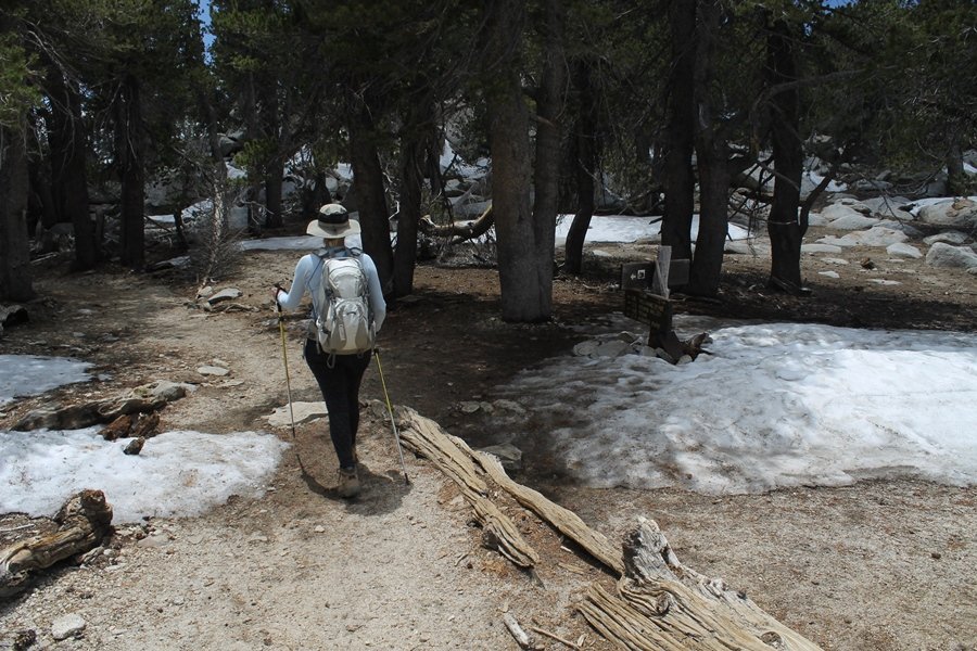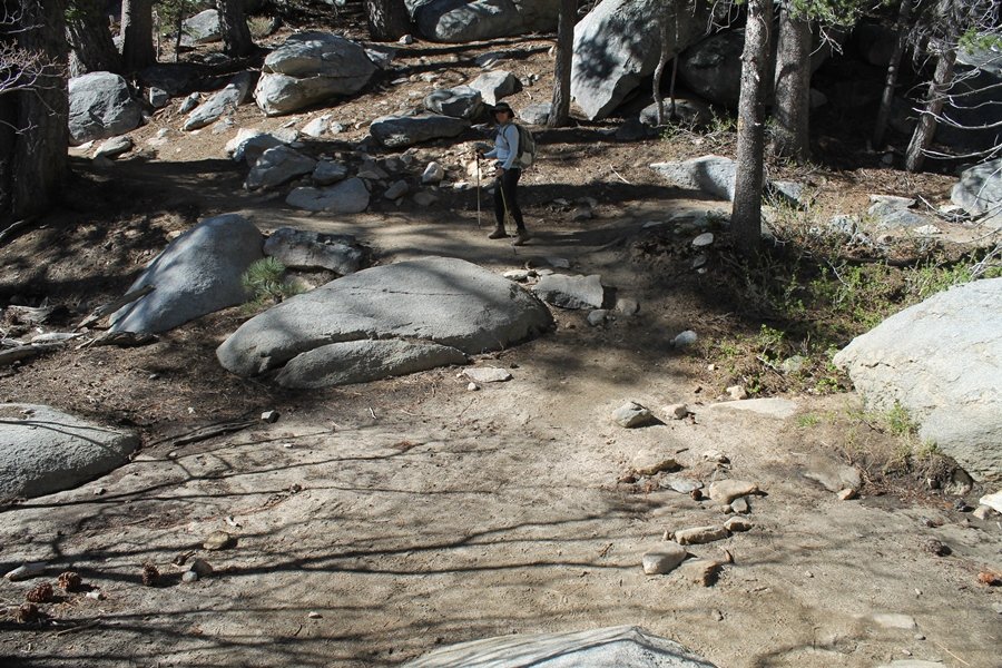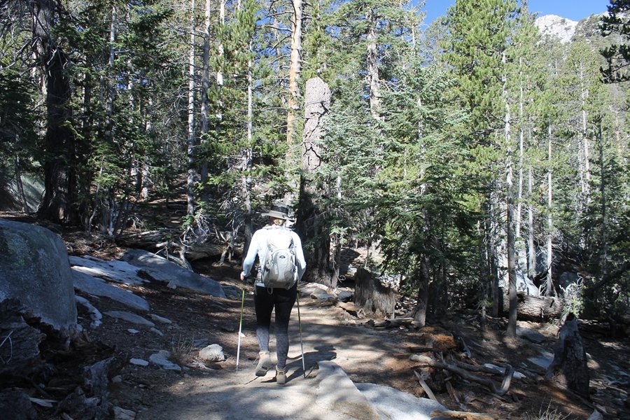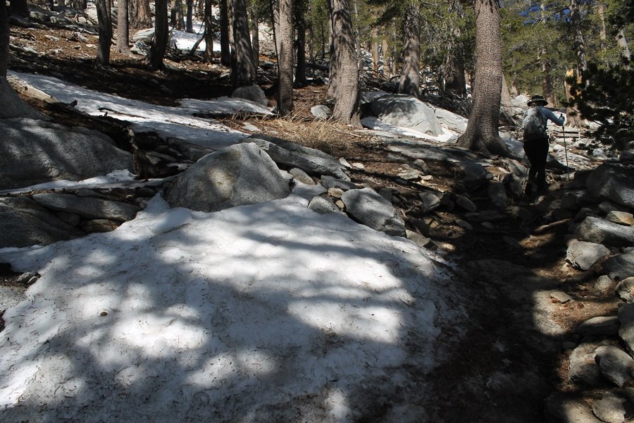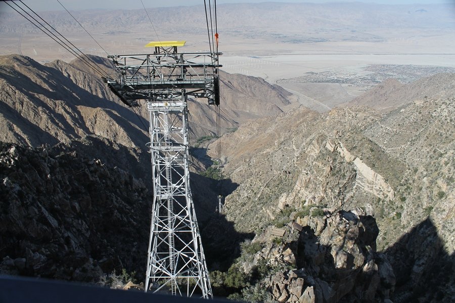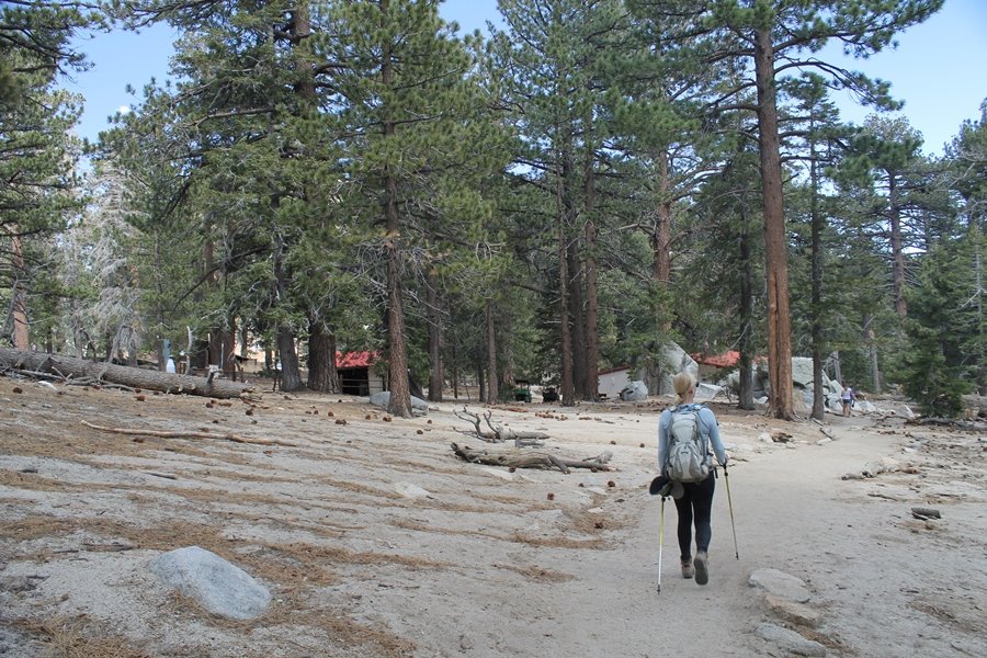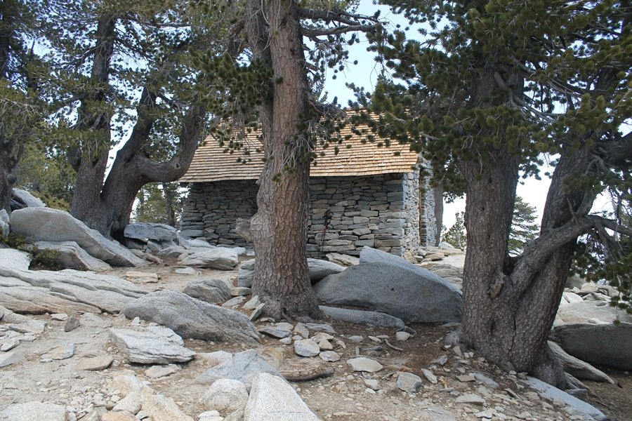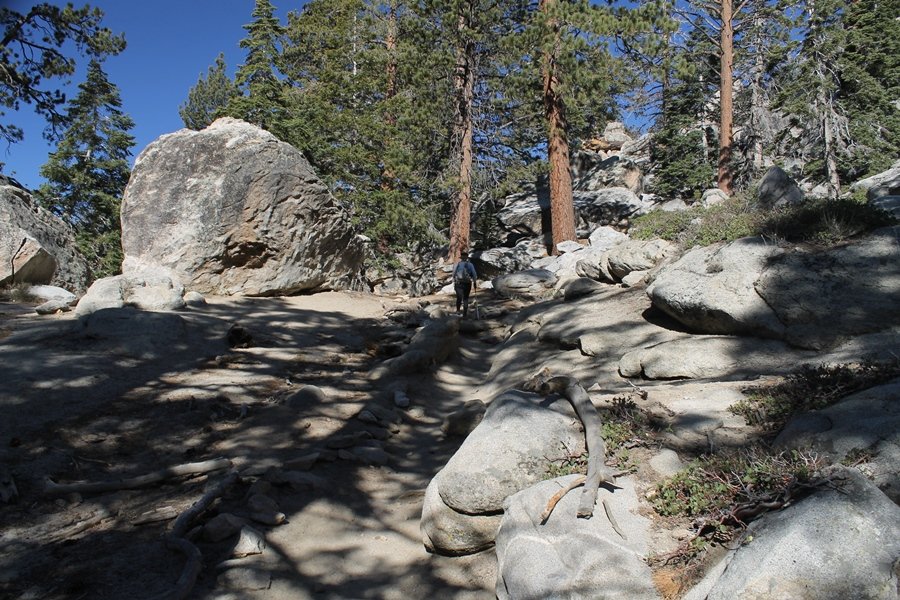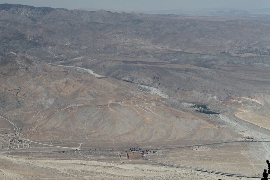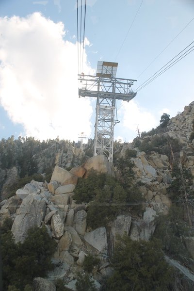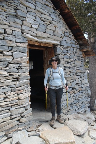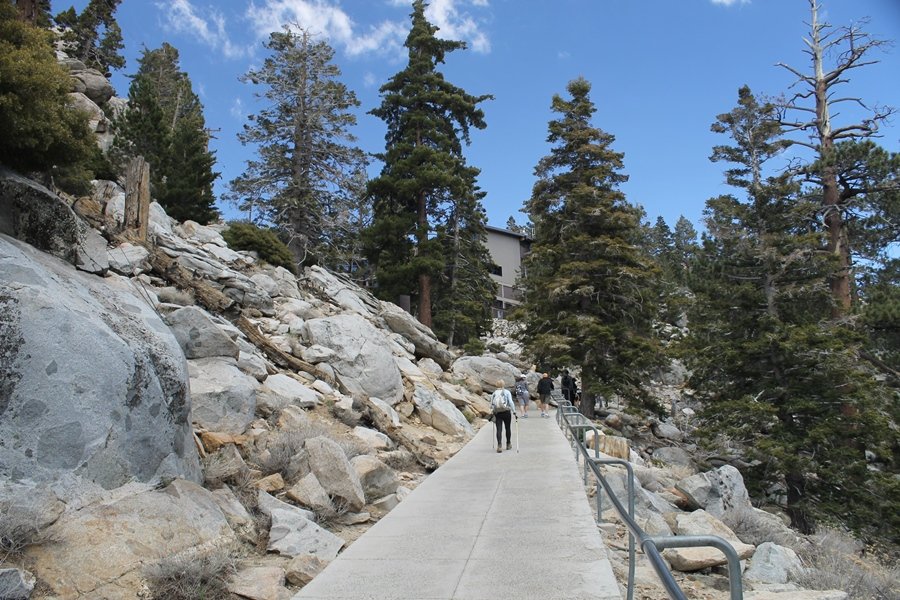 We could have booked our Palm Desert trip several weeks earlier, but we chose to do it relatively late because we wanted to hike San Jacinto Peak, and we were worried that the higher mountains would still be snowy earlier in the season. Day 3 of our stay in the desert had us rushing out the door to catch the 8am tram (we were a little late and caught the 8:15) to the trailhead. San Jacinto Peak, 10,834′, is the second highest peak in Southern California (San Gorgonio Mountain is 665′ taller), but it’s one of the most prominent summits in the country – the canyon floor at the northern base of the mountain is at elevation 2,000′ and only four miles from the summit. Trails lead to the peak from both the west and east, but the shortest and most popular route runs about 5-1/2 miles west from the Palm Springs aerial tramway station to Wellman Divide, then north along the mountain’s east slope to the summit – we have seen various round-trip distances noted, but we expected it to be somewhere between 10 and 11 miles total with about 2,400′ of gain. The tram ride up, first of all, is an experience in itself – ours was the second car of the day to go up, and it was packed. We were lucky enough to get a spot against the glass, and as the floor rotated two full revolutions during our ascent, we were treated to views all round that were simply amazing – early morning light on the sheer cliffs and the temperature dropping from the 80s to the 50s lent the feeling of entering a different world, all within the space of a few minutes. With all the hikers and their gear aboard, we figured there would be a long line for required permits at the ranger station below the top of the tram, so we headed straight out of the building and down the paved switchbacks to the ranger station, only to find that the permits are self-issued so there was no need to rush – oh well. The ranger station is in Long Valley, a crescent-shaped depression below the rim of the cliffs overlooking the desert to the north and east, and our trail initially led us out the western end of the lowland, across an intermittent stream, and up along the south side of the drainage where the path steepened considerably and became more rocky – this became the pattern of the day as we tramped up the trail, continually stair-stepping up (and down, on our return) the well-placed rocks and logs in the trail bed. After about 1-1/2 miles, the trail gradient eased significantly as we entered the Round Valley area – the terrain became much more level, and we passed several large campsites (we didn’t explore further in this area, but there is an expansive campground here, as well as one at Tamarack Valley a half mile to the north). Turning left at the signed Round Valley junction, we immediately began to gain elevation again as we headed southwest up to Wellman Divide, a ridge separating Round Valley from the regions further south. A climb of about 400′ in a mile, the trail seemed steeper than that, perhaps because of the altitude or maybe the stair-stepping effect – in any case, we were a little tired as we reached the divide. The open views south were spectacular – the whole San Jacinto range lay directly before us, and the rest of the ranges down to San Diego county were beyond, including a tall mountain on the horizon that we believe is Cuyamaca Peak, some 60 miles away. We rested here for a bit but soon headed out north from another well-signed junction atop the ridge – we had leapfrogged with several other groups of hikers on the trail to this point, and there was one woman who, talking incessantly as she walked, had seriously harshed our collective mellow and we didn’t want her to catch up with us (that sounds uncharitable – sorry). We cruised quickly through the next section as the trail lost its rockiness for about 3/4 of a mile, traversing gently up the east face of Jean Peak directly south of San Jacinto, after which it resumed its former character for some distance before flattening out through a pretty rock garden. From here, we resumed our northern march up the again-rocky trail to a point on San Jacinto’s east ridge where the trail abruptly switches back south – the views east through this last section were marvelous as well, and they got even better as we made our way south to the saddle north of the still-snowy Jean Peak. We came to a junction with a trail leading westward down to (or up from) the Idyllwild area and turned north – this junction is at about 10,500′ of elevation, and the trail gains the last 300′ over about 1/4 mile from this point. We found the stone hut that lies just southeast from the summit, and we could hear a rowdy group of hikers, who had apparently spent the night on the summit, coming down. We had trouble finding a defined path through the rocks, as the single track devolved into many nondescript use trails beyond this point – the rule of thumb is up, however, and we scrambled the last few dozen yards up the east side of the summit area to find maybe 50 others who had gotten there ahead of us. There was literally a line to take photos at the summit sign, which we dutifully stood in for about 10 minutes awaiting our turn (this is the highest elevation to which we’ve yet been together – Haleakala on Maui, at 10,023′, was our previous mark). Chris was able to scramble up the actual adjacent summit block for some pictures as Jane went and found a solitary spot about 30 yards west of the sign, and we spent about another 30 minutes there taking in the sights. John Muir once described the view from San Jacinto Peak as one of the most sublime anywhere in California, and he wasn’t overstating in the least. The entire valley west of the range was open before us, and we could easily make out the familiar shape of Saddleback Mountain (Santiago Peak) in the Santa Anas. The San Gabriels lay to the northwest, unfortunately locked in a dense haze, while San Gorgonio Mountai