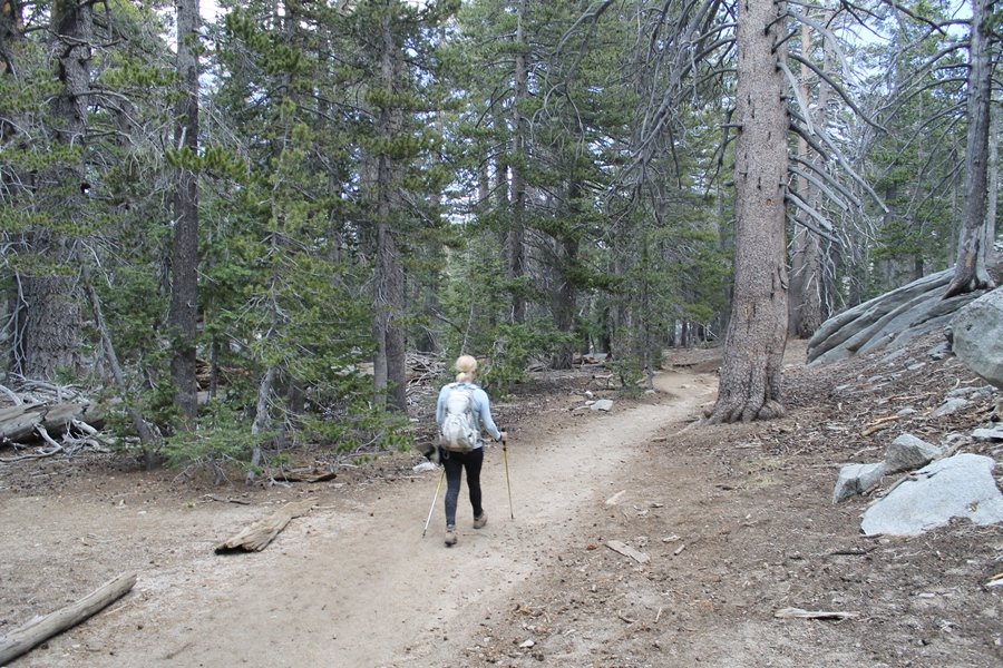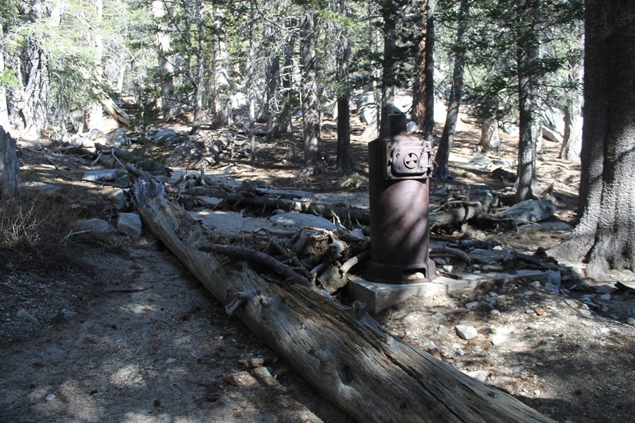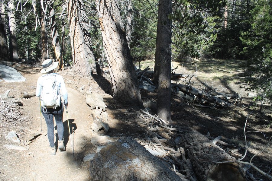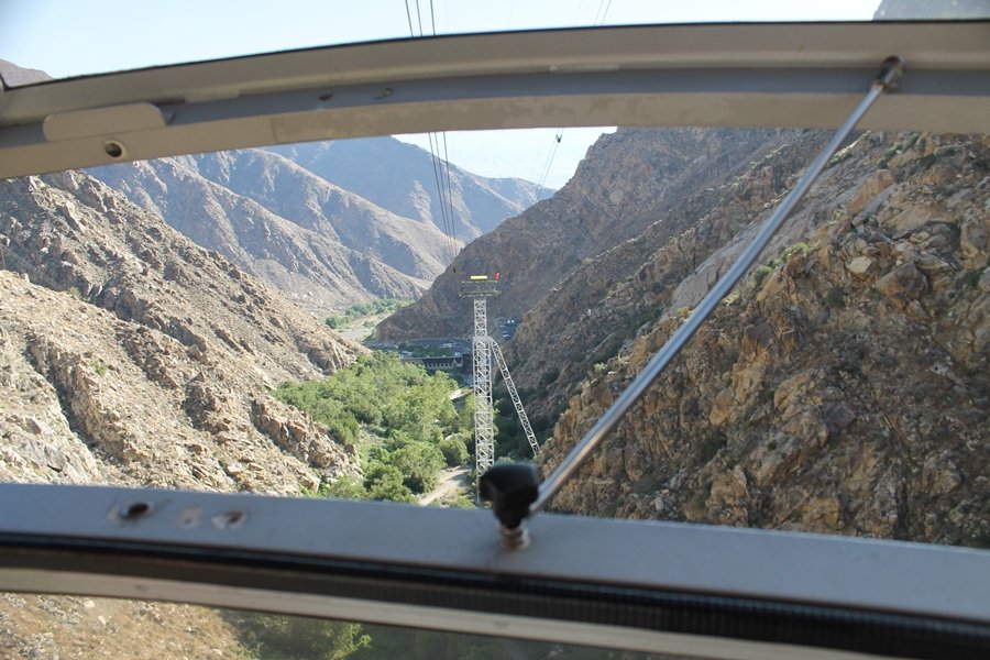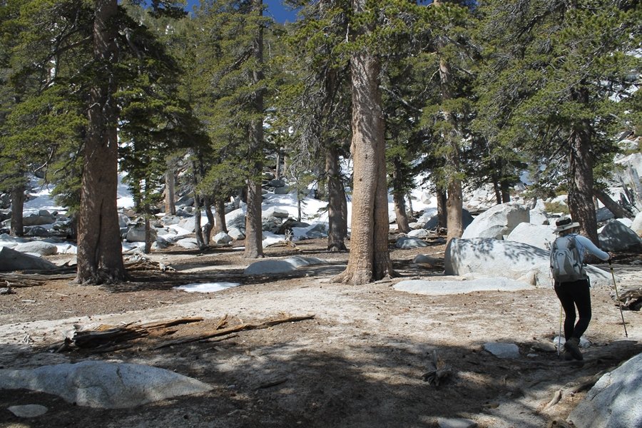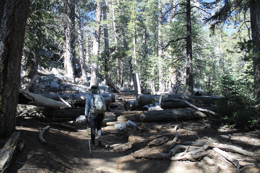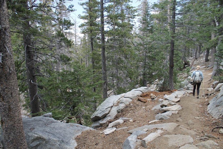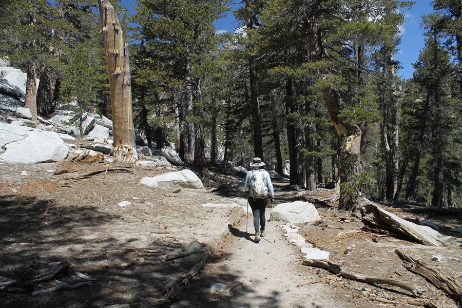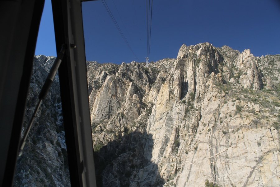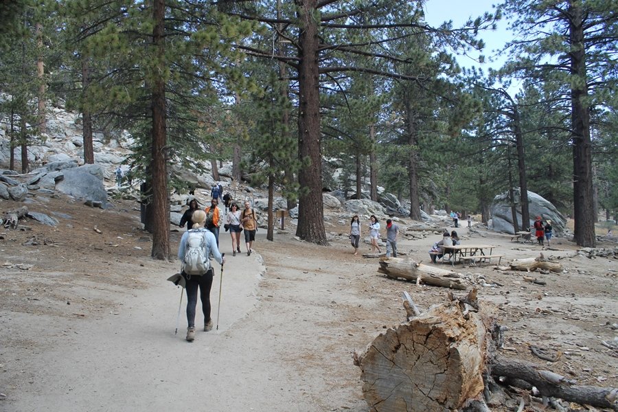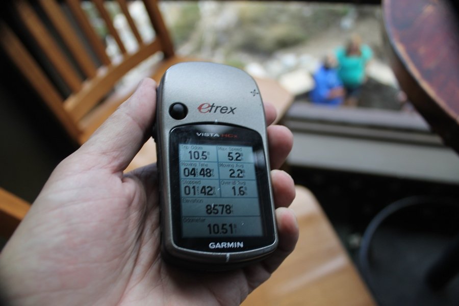 We could have booked our Palm Desert trip several weeks earlier, but we chose to do it relatively late because we wanted to hike San Jacinto Peak, and we were worried that the higher mountains would still be snowy earlier in the season. Day 3 of our stay in the desert had us rushing out the door to catch the 8am tram (we were a little late and caught the 8:15) to the trailhead. San Jacinto Peak, 10,834′, is the second highest peak in Southern California (San Gorgonio Mountain is 665′ taller), but it’s one of the most prominent summits in the country – the canyon floor at the northern base of the mountain is at elevation 2,000′ and only four miles from the summit. Trails lead to the peak from both the west and east, but the shortest and most popular route runs about 5-1/2 miles west from the Palm Springs aerial tramway station to Wellman Divide, then north along the mountain’s east slope to the summit – we have seen various round-trip distances noted, but we expected it to be somewhere between 10 and 11 miles total with about 2,400′ of gain. The tram ride up, first of all, is an experience in itself – ours was the second car of the day to go up, and it was packed. We were lucky enough to get a spot against the glass, and as the floor rotated two full revolutions during our ascent, we were treated to views all round that were simply amazing – early morning light on the sheer cliffs and the temperature dropping from the 80s to the 50s lent the feeling of entering a different world, all within the space of a few minutes. With all the hikers and their gear aboard, we figured there would be a long line for required permits at the ranger station below the top of the tram, so we headed straight out of the building and down the paved switchbacks to the ranger station, only to find that the permits are self-issued so there was no need to rush – oh well. The ranger station is in Long Valley, a crescent-shaped depression below the rim of the cliffs overlooking the desert to the north and east, and our trail initially led us out the western end of the lowland, across an intermittent stream, and up along the south side of the drainage where the path steepened considerably and became more rocky – this became the pattern of the day as we tramped up the trail, continually stair-stepping up (and down, on our return) the well-placed rocks and logs in the trail bed. After about 1-1/2 miles, the trail gradient eased significantly as we entered the Round Valley area – the terrain became much more level, and we passed several large campsites (we didn’t explore further in this area, but there is an expansive campground here, as well as one at Tamarack Valley a half mile to the north). Turning left at the signed Round Valley junction, we immediately began to gain elevation again as we headed southwest up to Wellman Divide, a ridge separating Round Valley from the regions further south. A climb of about 400′ in a mile, the trail seemed steeper than that, perhaps because of the altitude or maybe the stair-stepping effect – in any case, we were a little tired as we reached the divide. The open views south were spectacular – the whole San Jacinto range lay directly before us, and the rest of the ranges down to San Diego county were beyond, including a tall mountain on the horizon that we believe is Cuyamaca Peak, some 60 miles away. We rested here for a bit but soon headed out north from another well-signed junction atop the ridge – we had leapfrogged with several other groups of hikers on the trail to this point, and there was one woman who, talking incessantly as she walked, had seriously harshed our collective mellow and we didn’t want her to catch up with us (that sounds uncharitable – sorry). We cruised quickly through the next section as the trail lost its rockiness for about 3/4 of a mile, traversing gently up the east face of Jean Peak directly south of San Jacinto, after which it resumed its former character for some distance before flattening out through a pretty rock garden. From here, we resumed our northern march up the again-rocky trail to a point on San Jacinto’s east ridge where the trail abruptly switches back south – the views east through this last section were marvelous as well, and they got even better as we made our way south to the saddle north of the still-snowy Jean Peak. We came to a junction with a trail leading westward down to (or up from) the Idyllwild area and turned north – this junction is at about 10,500′ of elevation, and the trail gains the last 300′ over about 1/4 mile from this point. We found the stone hut that lies just southeast from the summit, and we could hear a rowdy group of hikers, who had apparently spent the night on the summit, coming down. We had trouble finding a defined path through the rocks, as the single track devolved into many nondescript use trails beyond this point – the rule of thumb is up, however, and we scrambled the last few dozen yards up the east side of the summit area to find maybe 50 others who had gotten there ahead of us. There was literally a line to take photos at the summit sign, which we dutifully stood in for about 10 minutes awaiting our turn (this is the highest elevation to which we’ve yet been together – Haleakala on Maui, at 10,023′, was our previous mark). Chris was able to scramble up the actual adjacent summit block for some pictures as Jane went and found a solitary spot about 30 yards west of the sign, and we spent about another 30 minutes there taking in the sights. John Muir once described the view from San Jacinto Peak as one of the most sublime anywhere in California, and he wasn’t overstating in the least. The entire valley west of the range was open before us, and we could easily make out the familiar shape of Saddleback Mountain (Santiago Peak) in the Santa Anas. The San Gabriels lay to the northwest, unfortunately locked in a dense haze, while San Gorgonio Mountai