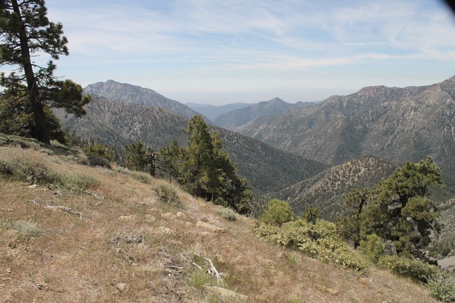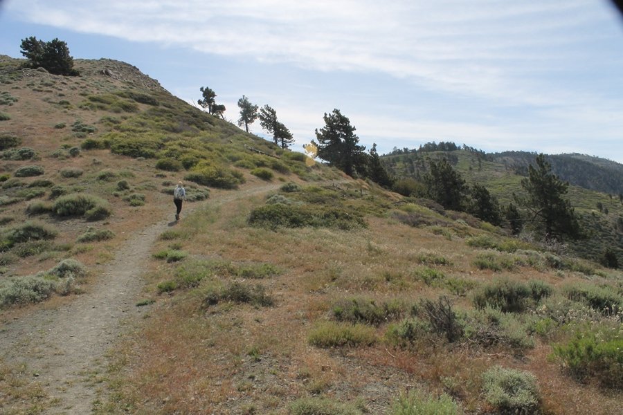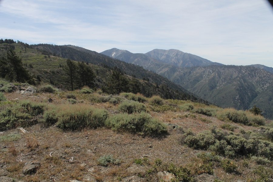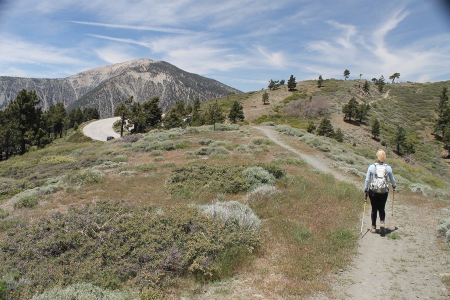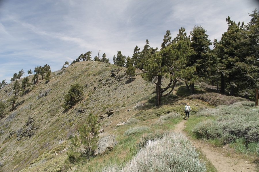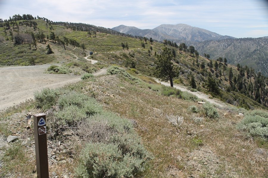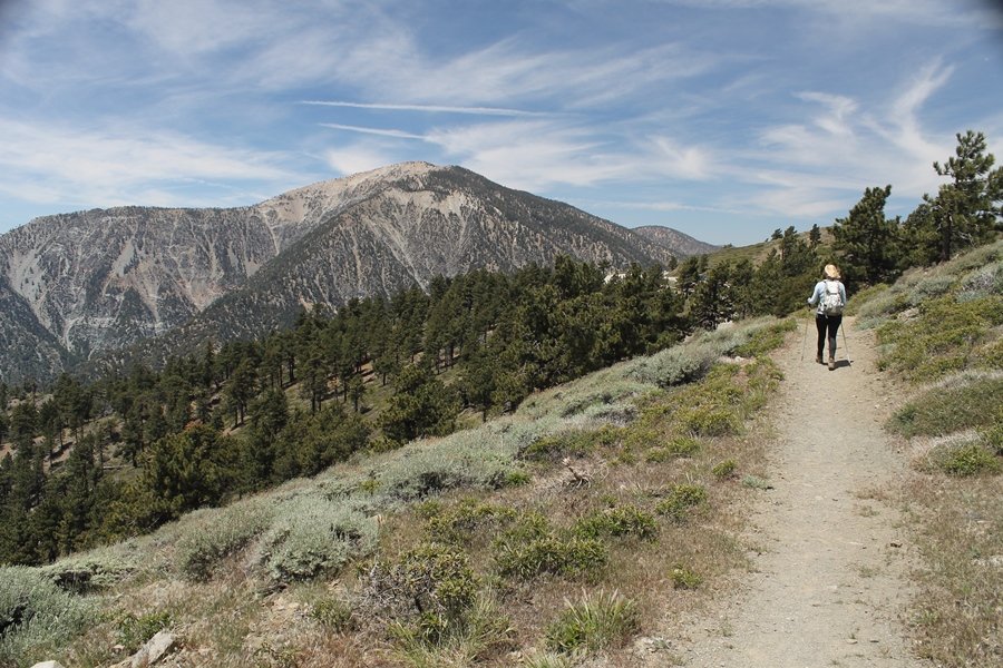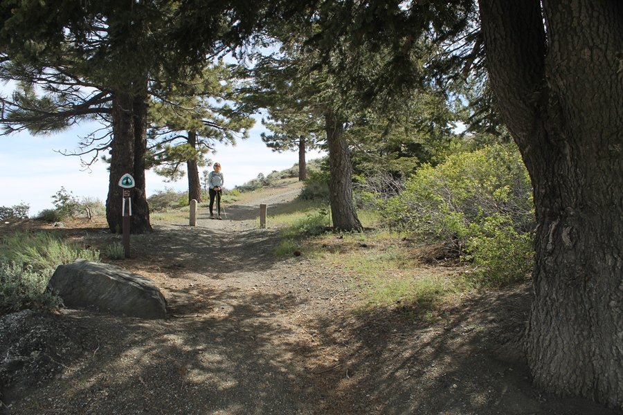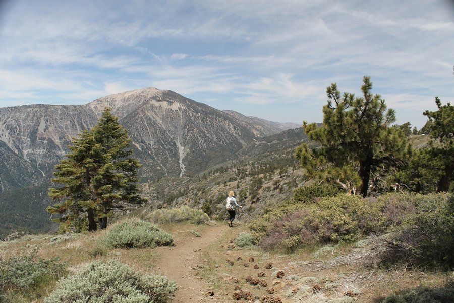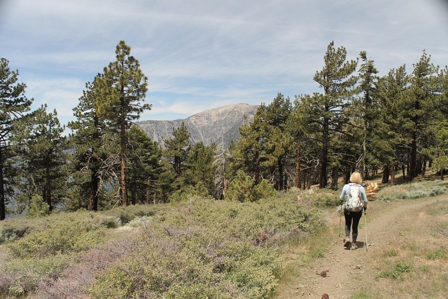 One stretch of the PCT near Wrightwood we had yet to fully explore is the 5-mile section between Guffy Campground and Inspiration Point – we visited some of the area when hiking Frost Peak last year but thought the full out-and-back would make for a nice longish walk that was close enough to home. Plus, it’s nearing the end of the PCT thru-hiker season already and, since we enjoy meeting these intrepid folks and hearing their stories, we figured we’d encounter some PCTers during our 10 miles on the trail. We got to the trailhead about 9:30am and right away discovered Jane was without her hat, and by the time we had walked a mile eastward, she had decided the sun was going to be too harsh to spend that much time outdoors without it – we agreed to go east another mile or so before turning back. We drove the Blue Ridge road up to Guffy CG last year as well, so we should have expected the frequent ups and downs of the terrain – for some reason, the grade looks quite mild on the topo map, and we were a little surprised to find a couple of steep inclines on the trail, the most intense one being a short piece just below the east end of the Mt. High West ski area. Still, the scenery was beautiful, and the steep sections were short enough to not be an issue. The forest gives way to a series of open, brushy slopes here, especially on the south side of the ridge, and the views south, though familiar, were nothing short of amazing. We had a revised goal of turning around at the Blue Ridge CG, about two miles east of Inspiration Point, and there we met a young man with his large standard poodle hiking west as we reached the campground area – he was camping at Guffy and was doing the same hike as our original plan, but from the opposite direction, and was low on water. Since we had brought 2.5 liters apiece and clearly wouldn’t need that much to get back, we filled his Camelbak from ours and proceeded on. Though dry, the Blue Ridge CG seems like a great place to car camp, with open views south and west, at least from the southern edge of the facility. We rested here for a little while before heading back west, treated to marvelous views of Mt. Baden-Powell and the western end of Blue Ridge along the way. As we neared the car, we again met the guy with his dog, topped off his water reservoir for their return trip up the ridge, and finished the hike about noon. While it was in the 80s in Wrightwood, it was at least 10 degrees cooler up here with a gentle breeze the whole time – perfect weather for a nice hike.