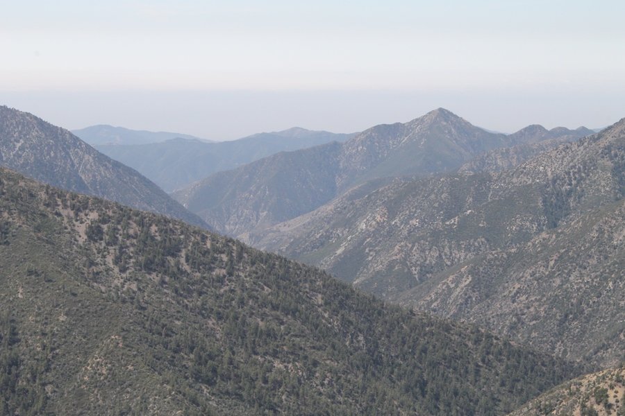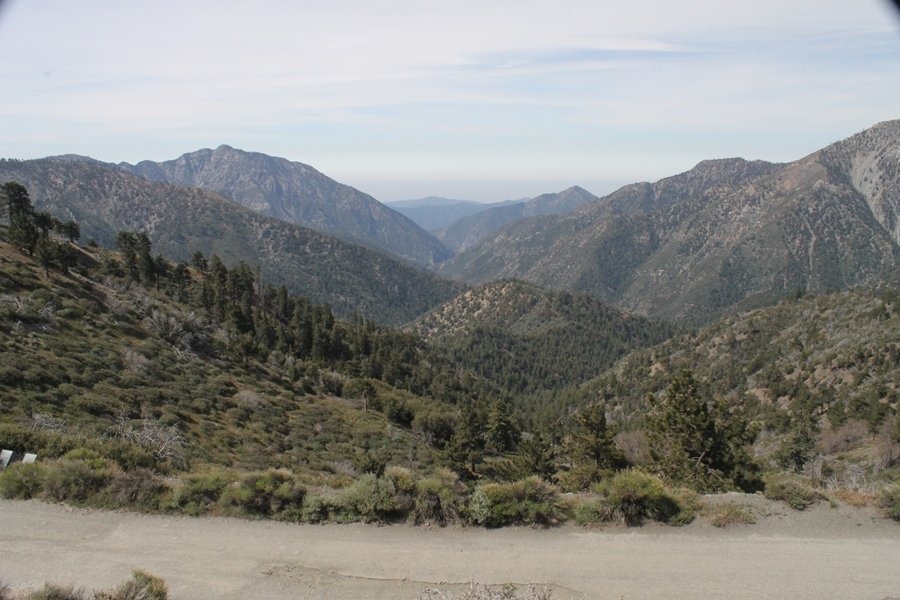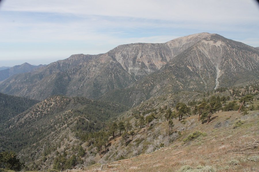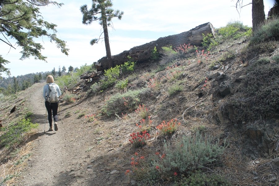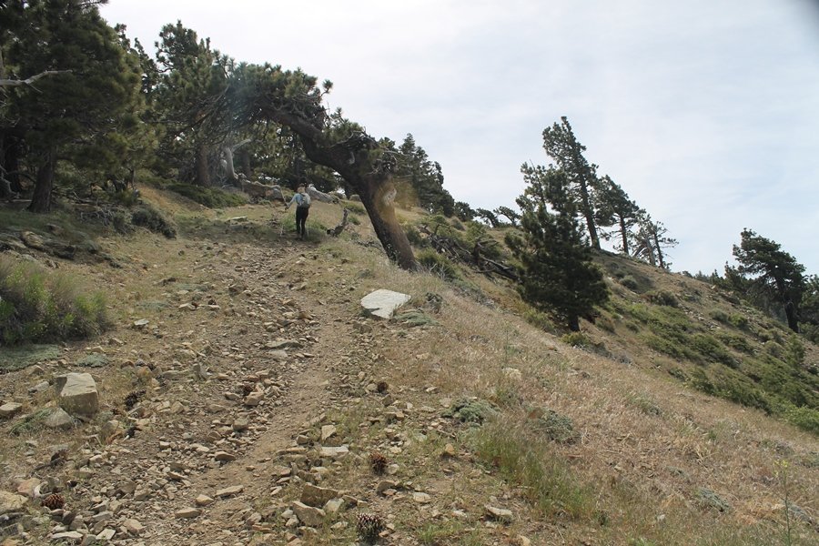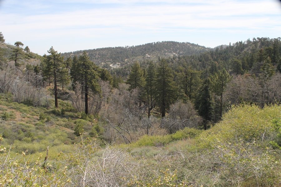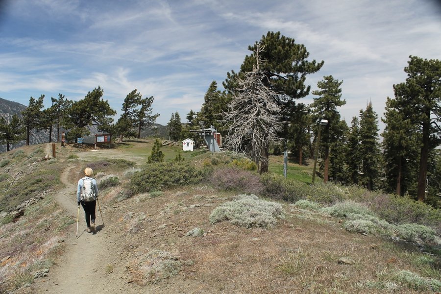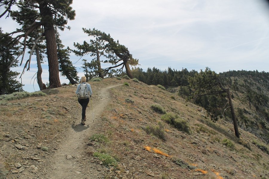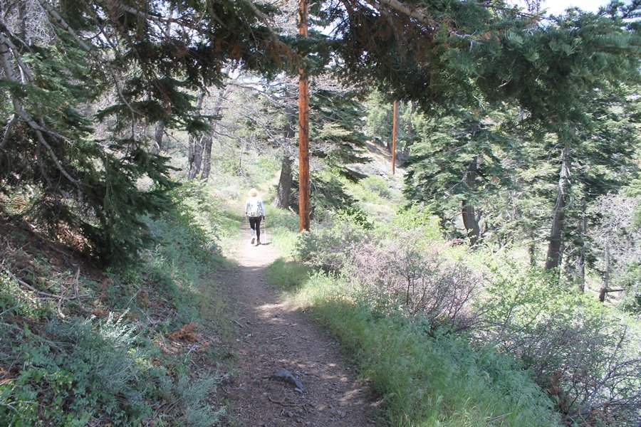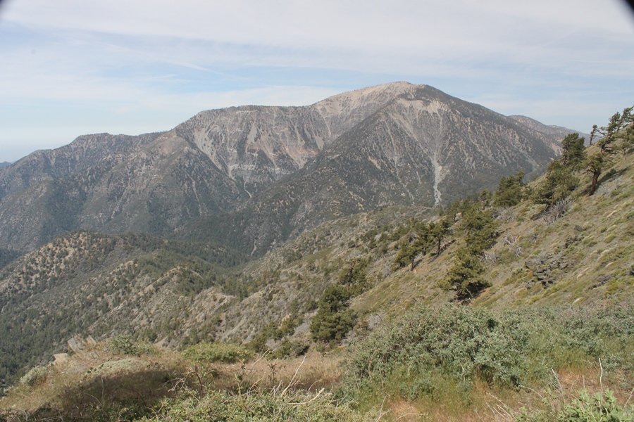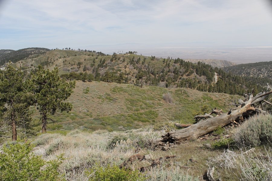 One stretch of the PCT near Wrightwood we had yet to fully explore is the 5-mile section between Guffy Campground and Inspiration Point – we visited some of the area when hiking Frost Peak last year but thought the full out-and-back would make for a nice longish walk that was close enough to home. Plus, it’s nearing the end of the PCT thru-hiker season already and, since we enjoy meeting these intrepid folks and hearing their stories, we figured we’d encounter some PCTers during our 10 miles on the trail. We got to the trailhead about 9:30am and right away discovered Jane was without her hat, and by the time we had walked a mile eastward, she had decided the sun was going to be too harsh to spend that much time outdoors without it – we agreed to go east another mile or so before turning back. We drove the Blue Ridge road up to Guffy CG last year as well, so we should have expected the frequent ups and downs of the terrain – for some reason, the grade looks quite mild on the topo map, and we were a little surprised to find a couple of steep inclines on the trail, the most intense one being a short piece just below the east end of the Mt. High West ski area. Still, the scenery was beautiful, and the steep sections were short enough to not be an issue. The forest gives way to a series of open, brushy slopes here, especially on the south side of the ridge, and the views south, though familiar, were nothing short of amazing. We had a revised goal of turning around at the Blue Ridge CG, about two miles east of Inspiration Point, and there we met a young man with his large standard poodle hiking west as we reached the campground area – he was camping at Guffy and was doing the same hike as our original plan, but from the opposite direction, and was low on water. Since we had brought 2.5 liters apiece and clearly wouldn’t need that much to get back, we filled his Camelbak from ours and proceeded on. Though dry, the Blue Ridge CG seems like a great place to car camp, with open views south and west, at least from the southern edge of the facility. We rested here for a little while before heading back west, treated to marvelous views of Mt. Baden-Powell and the western end of Blue Ridge along the way. As we neared the car, we again met the guy with his dog, topped off his water reservoir for their return trip up the ridge, and finished the hike about noon. While it was in the 80s in Wrightwood, it was at least 10 degrees cooler up here with a gentle breeze the whole time – perfect weather for a nice hike.