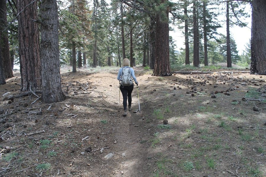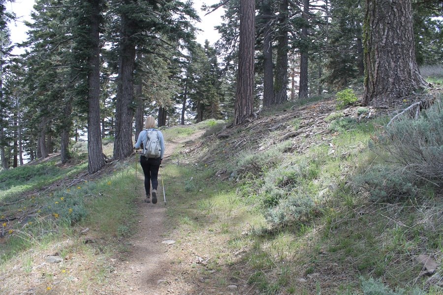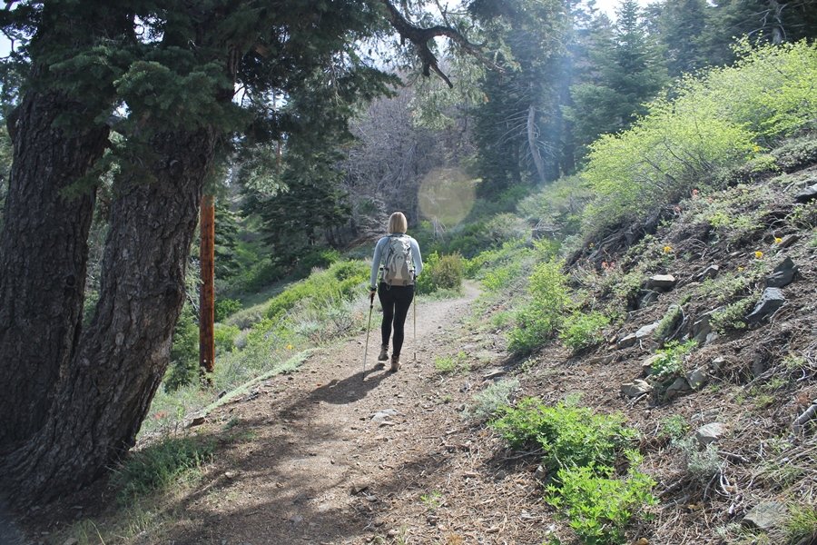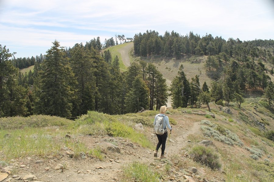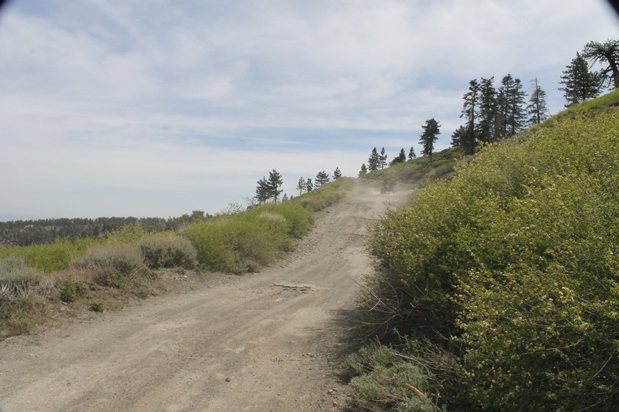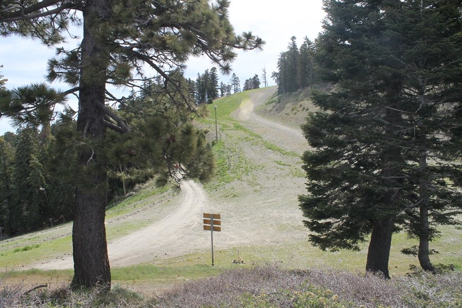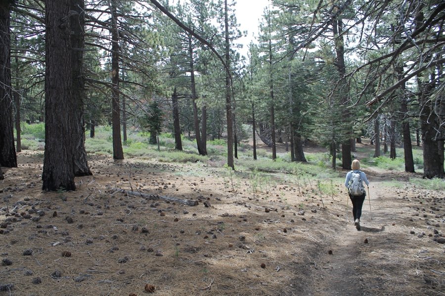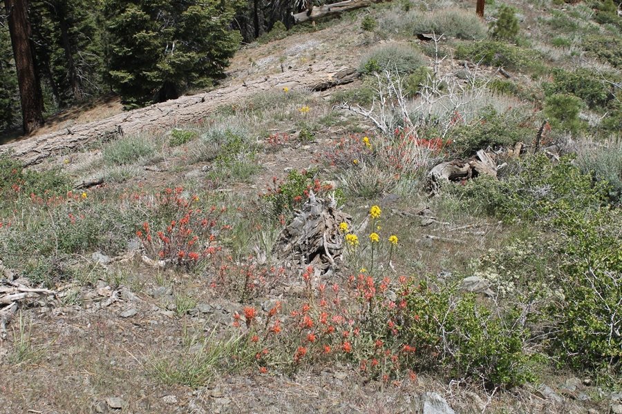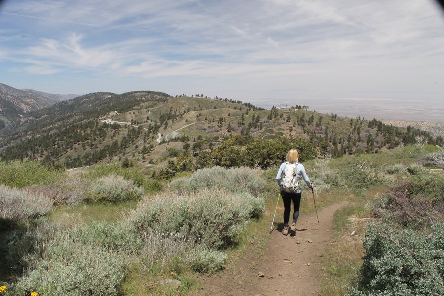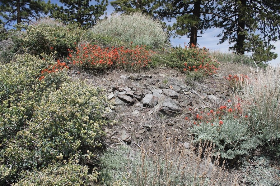 One stretch of the PCT near Wrightwood we had yet to fully explore is the 5-mile section between Guffy Campground and Inspiration Point – we visited some of the area when hiking Frost Peak last year but thought the full out-and-back would make for a nice longish walk that was close enough to home. Plus, it’s nearing the end of the PCT thru-hiker season already and, since we enjoy meeting these intrepid folks and hearing their stories, we figured we’d encounter some PCTers during our 10 miles on the trail. We got to the trailhead about 9:30am and right away discovered Jane was without her hat, and by the time we had walked a mile eastward, she had decided the sun was going to be too harsh to spend that much time outdoors without it – we agreed to go east another mile or so before turning back. We drove the Blue Ridge road up to Guffy CG last year as well, so we should have expected the frequent ups and downs of the terrain – for some reason, the grade looks quite mild on the topo map, and we were a little surprised to find a couple of steep inclines on the trail, the most intense one being a short piece just below the east end of the Mt. High West ski area. Still, the scenery was beautiful, and the steep sections were short enough to not be an issue. The forest gives way to a series of open, brushy slopes here, especially on the south side of the ridge, and the views south, though familiar, were nothing short of amazing. We had a revised goal of turning around at the Blue Ridge CG, about two miles east of Inspiration Point, and there we met a young man with his large standard poodle hiking west as we reached the campground area – he was camping at Guffy and was doing the same hike as our original plan, but from the opposite direction, and was low on water. Since we had brought 2.5 liters apiece and clearly wouldn’t need that much to get back, we filled his Camelbak from ours and proceeded on. Though dry, the Blue Ridge CG seems like a great place to car camp, with open views south and west, at least from the southern edge of the facility. We rested here for a little while before heading back west, treated to marvelous views of Mt. Baden-Powell and the western end of Blue Ridge along the way. As we neared the car, we again met the guy with his dog, topped off his water reservoir for their return trip up the ridge, and finished the hike about noon. While it was in the 80s in Wrightwood, it was at least 10 degrees cooler up here with a gentle breeze the whole time – perfect weather for a nice hike.