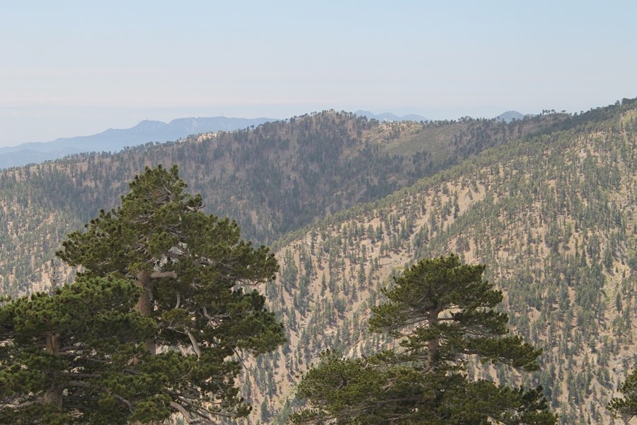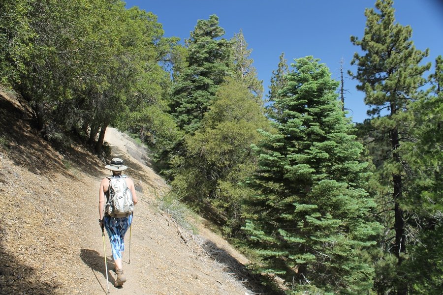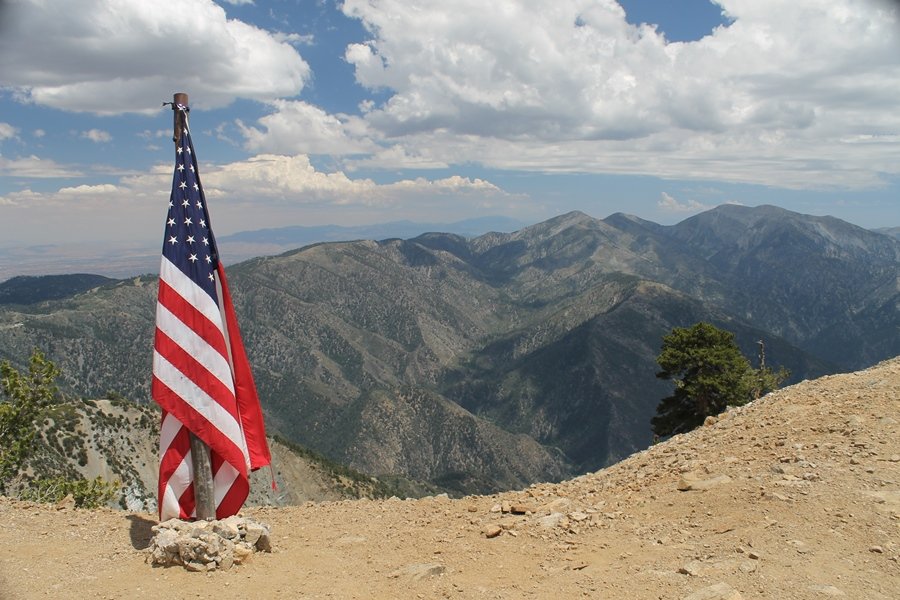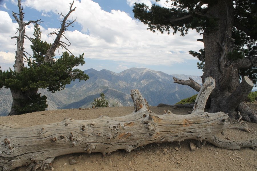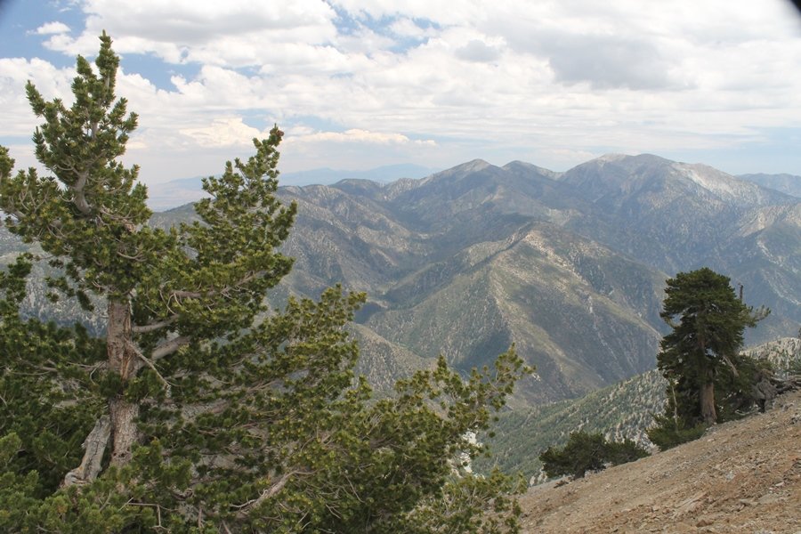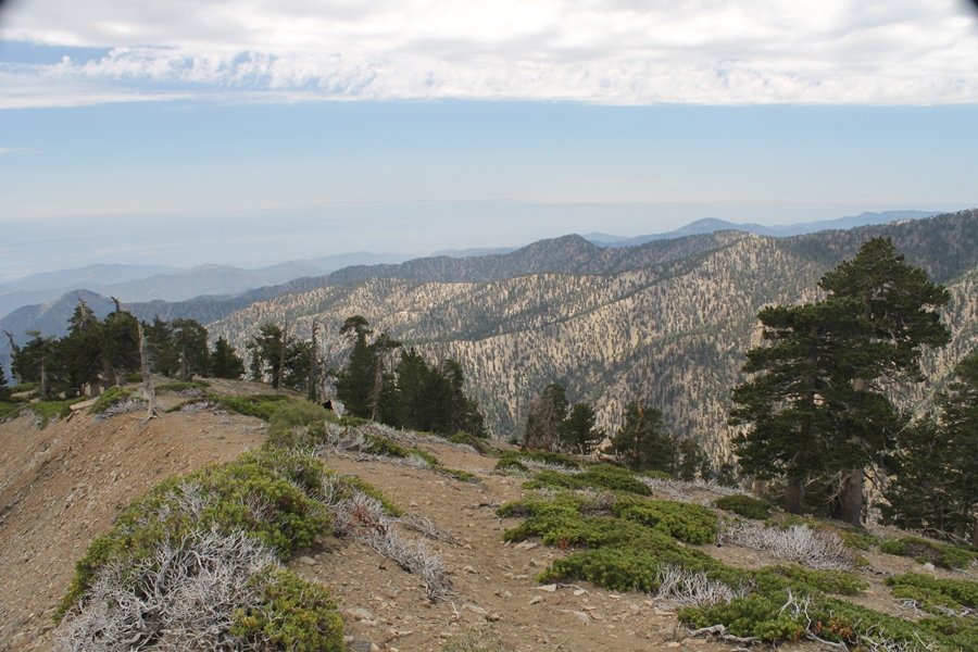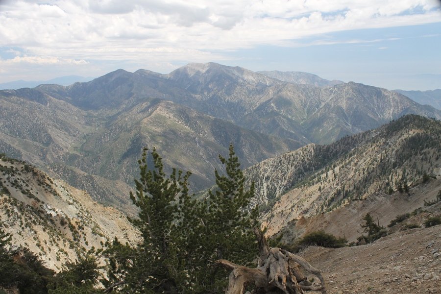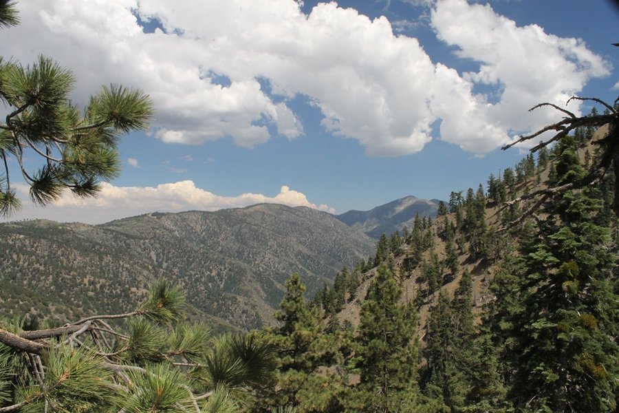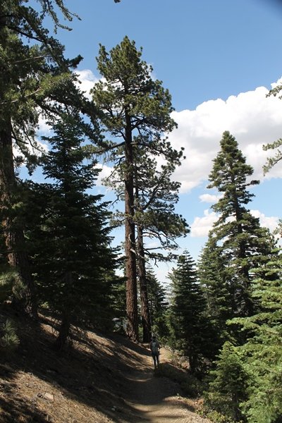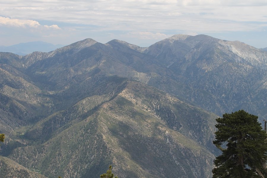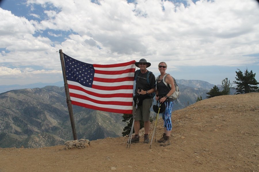 We first hiked up the PCT to Mt. Baden-Powell more than a year-and-a-half ago – it was a crisp November day then, and those memories of a tough hike in cool weather were beckoning us to repeat the journey, albeit on a warm Fourth of July Saturday. Baden-Powell’s northeast slope is one of the steepest around, rising about 2,800 vertical feet from Vincent Gap to the summit just 1.2 air-miles away – the PCT takes four miles and 42 switchbacks to cover the elevation gain. As we drove to the trailhead, Jane commented that we don’t do hard hikes anymore, and she has a point. In 2013, we walked over 300 miles and averaged 4.42 miles per hike, although the average distance was just under six miles if you ignore all the short hikes we took while in Maui. In 2014, we only walked 77+ miles and averaged 5.56 miles per hike – so far in 2015, we’ve covered almost 64 miles but averaged only 4.9 miles per hike, including today’s nearly-nine-mile effort. All that said, we do have some longer trips on our radar, so we’ll see if we can reverse the trend and make 2015 a more prolific year. We got organized at Vincent Gap and headed out about 10:20am, sort of kicking ourselves for not starting earlier – that November hike was on a chilly morning in late fall when this part of the mountain was still in deep shade, and the midday July sun made this particular ascent unpleasant at times. We made pretty good time up the trail, although Jane, dealing with some summer allergies, felt winded most of the way. Still, the forest was as beautiful as ever and the views to a clear desert floor were as good as any in recent memory – some low cloud cover moved in and out and helped temper the sun’s effects. We topped out on Baden-Powell’s northeast ridge about 12:45 and made the summit about 5 minutes later, treated to gorgeous views in all directions. Someone, perhaps Boy Scouts, had placed a flag near the summit high point, which was an unexpected treat – we had passed (and had been passed by) several groups on the way up, and some kids took our picture with the flag before we took theirs. We wandered down the south ridge about a quarter-mile as we did on our first visit here (we had come up the PCT the other direction from Dawson Saddle in May 2014 but were short on time and didn’t stay on the top but for a few minutes), before meandering back to the summit area for a brief rest – there was a group of hikers occupying seats on a log about 100 yards south of the summit, and after they got up and left, we took their place – what a wonderful spot for a break. The photos, though dramatic, don’t really come close to conveying the grandeur of the view – this is a marvelous place, and well worth the effort in getting to it. We headed back about 1:30, choosing to explore the trail to Lamel Spring for a short distance before deciding to continue the descent, leaving the spring for another time. We reached the bottom at 3:20pm, logging exactly five hours on the trail and covering 8.73 miles. It had looked like we might get some weather as we completed the bottom half of the trail, but the thunderheads stayed well to the east. A beautiful hike, though warm, and a great way to celebrate the holiday.