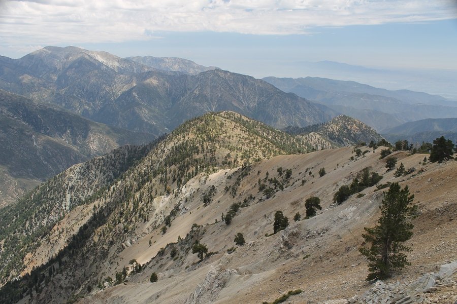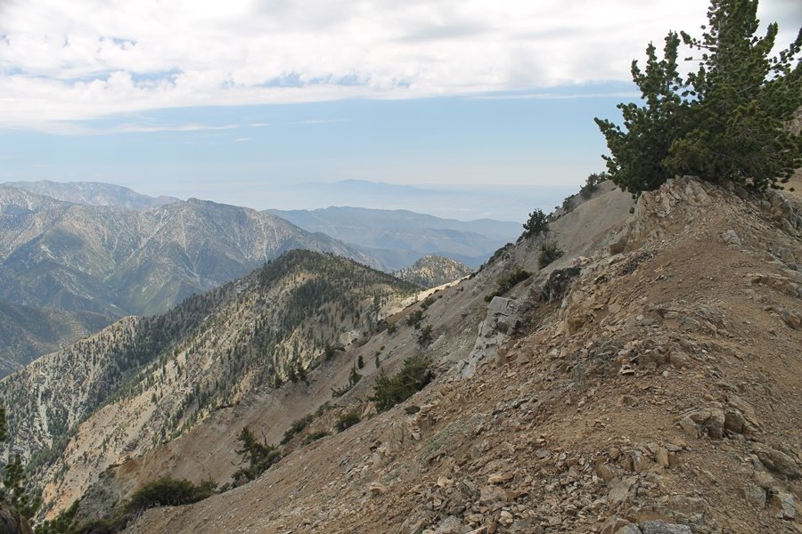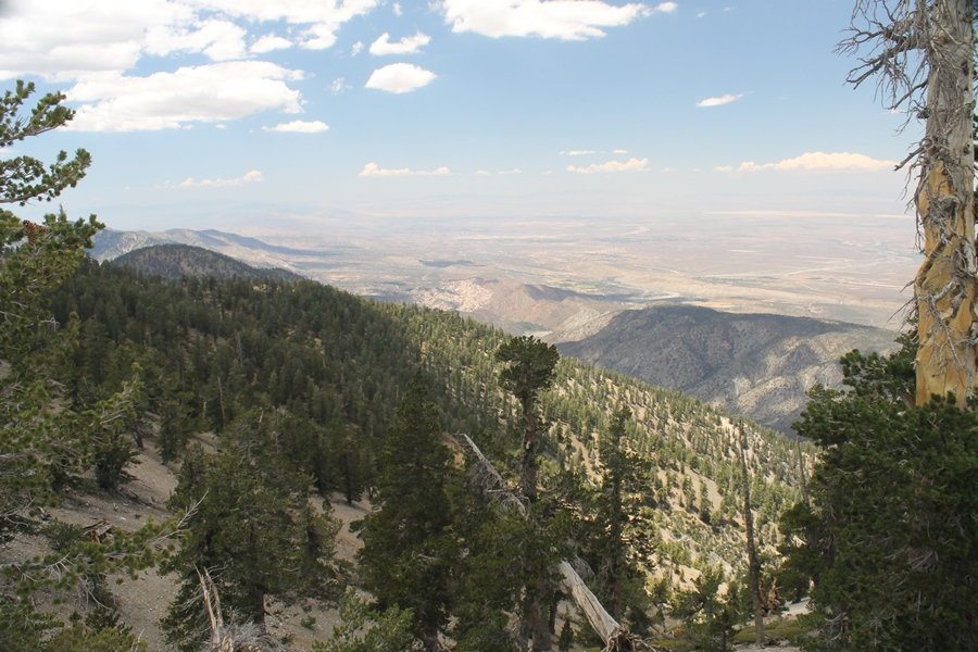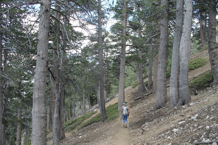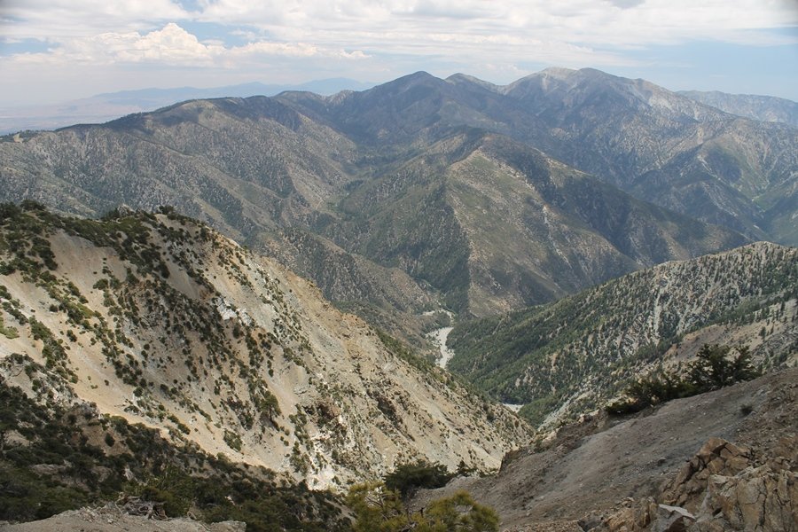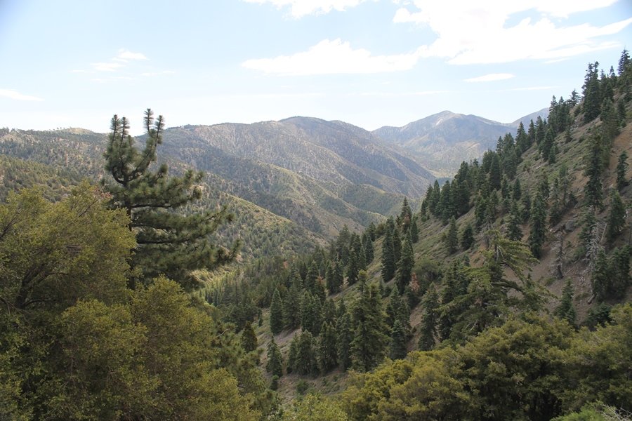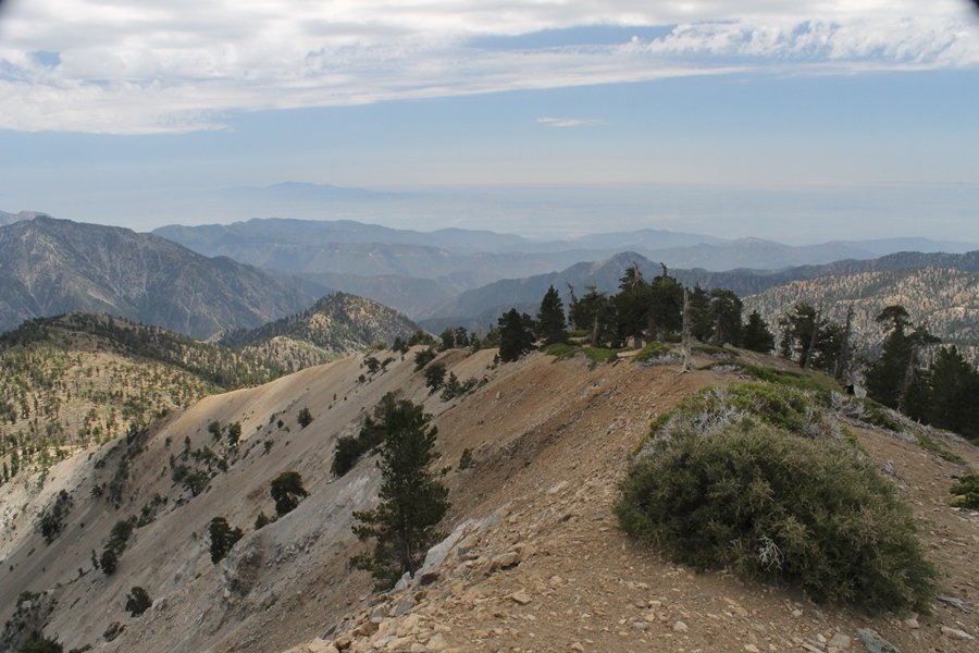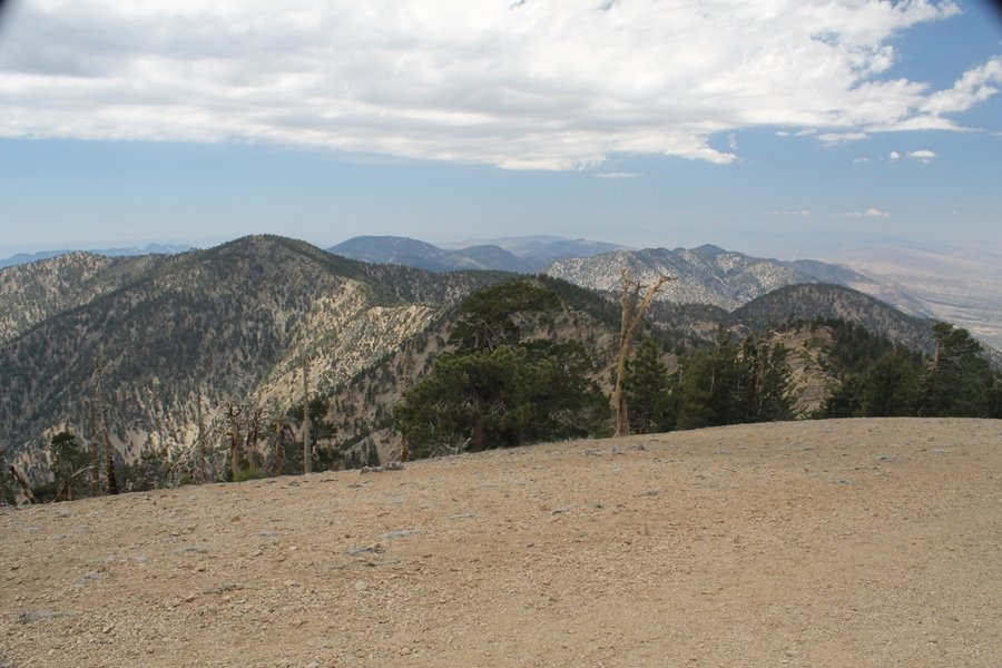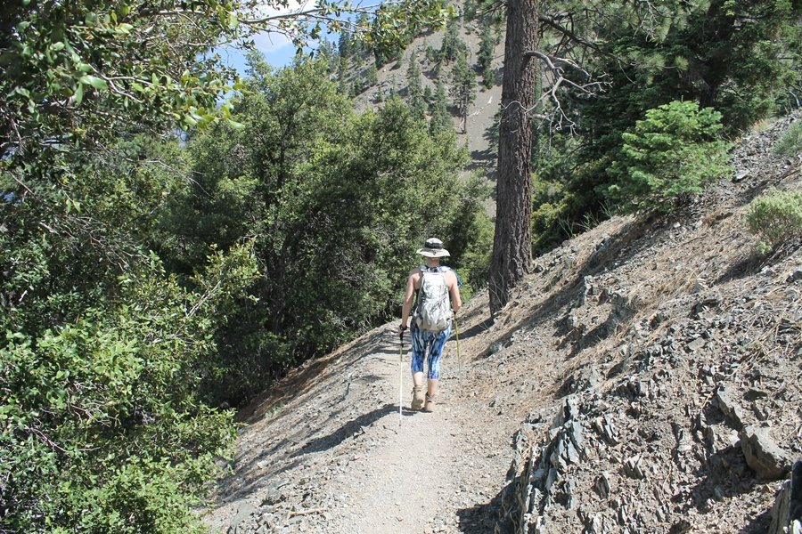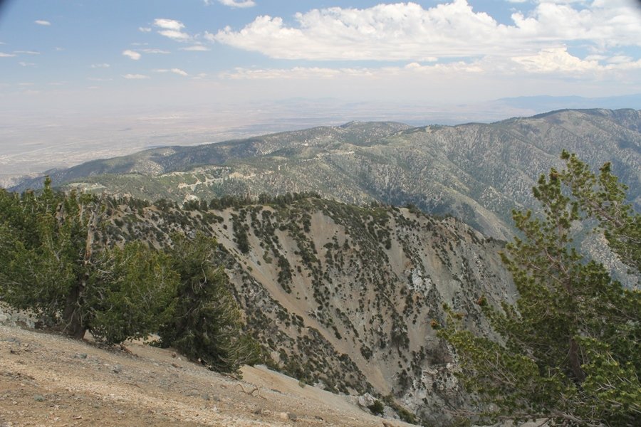 We first hiked up the PCT to Mt. Baden-Powell more than a year-and-a-half ago – it was a crisp November day then, and those memories of a tough hike in cool weather were beckoning us to repeat the journey, albeit on a warm Fourth of July Saturday. Baden-Powell’s northeast slope is one of the steepest around, rising about 2,800 vertical feet from Vincent Gap to the summit just 1.2 air-miles away – the PCT takes four miles and 42 switchbacks to cover the elevation gain. As we drove to the trailhead, Jane commented that we don’t do hard hikes anymore, and she has a point. In 2013, we walked over 300 miles and averaged 4.42 miles per hike, although the average distance was just under six miles if you ignore all the short hikes we took while in Maui. In 2014, we only walked 77+ miles and averaged 5.56 miles per hike – so far in 2015, we’ve covered almost 64 miles but averaged only 4.9 miles per hike, including today’s nearly-nine-mile effort. All that said, we do have some longer trips on our radar, so we’ll see if we can reverse the trend and make 2015 a more prolific year. We got organized at Vincent Gap and headed out about 10:20am, sort of kicking ourselves for not starting earlier – that November hike was on a chilly morning in late fall when this part of the mountain was still in deep shade, and the midday July sun made this particular ascent unpleasant at times. We made pretty good time up the trail, although Jane, dealing with some summer allergies, felt winded most of the way. Still, the forest was as beautiful as ever and the views to a clear desert floor were as good as any in recent memory – some low cloud cover moved in and out and helped temper the sun’s effects. We topped out on Baden-Powell’s northeast ridge about 12:45 and made the summit about 5 minutes later, treated to gorgeous views in all directions. Someone, perhaps Boy Scouts, had placed a flag near the summit high point, which was an unexpected treat – we had passed (and had been passed by) several groups on the way up, and some kids took our picture with the flag before we took theirs. We wandered down the south ridge about a quarter-mile as we did on our first visit here (we had come up the PCT the other direction from Dawson Saddle in May 2014 but were short on time and didn’t stay on the top but for a few minutes), before meandering back to the summit area for a brief rest – there was a group of hikers occupying seats on a log about 100 yards south of the summit, and after they got up and left, we took their place – what a wonderful spot for a break. The photos, though dramatic, don’t really come close to conveying the grandeur of the view – this is a marvelous place, and well worth the effort in getting to it. We headed back about 1:30, choosing to explore the trail to Lamel Spring for a short distance before deciding to continue the descent, leaving the spring for another time. We reached the bottom at 3:20pm, logging exactly five hours on the trail and covering 8.73 miles. It had looked like we might get some weather as we completed the bottom half of the trail, but the thunderheads stayed well to the east. A beautiful hike, though warm, and a great way to celebrate the holiday.