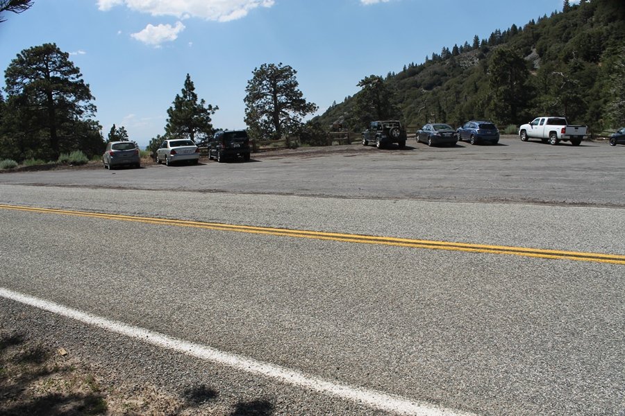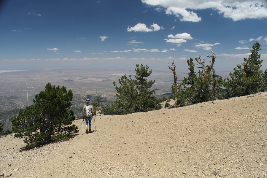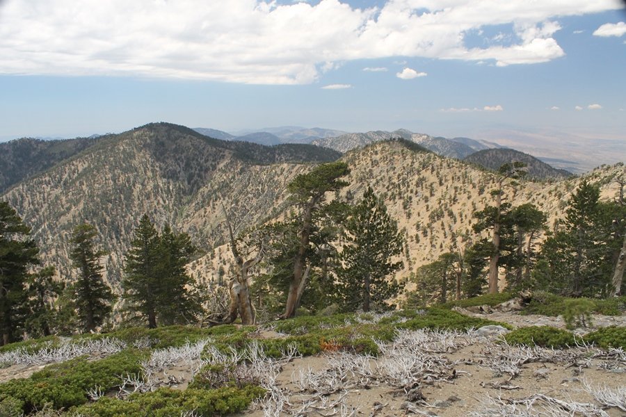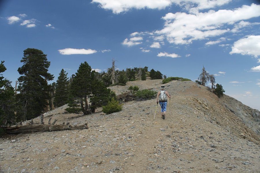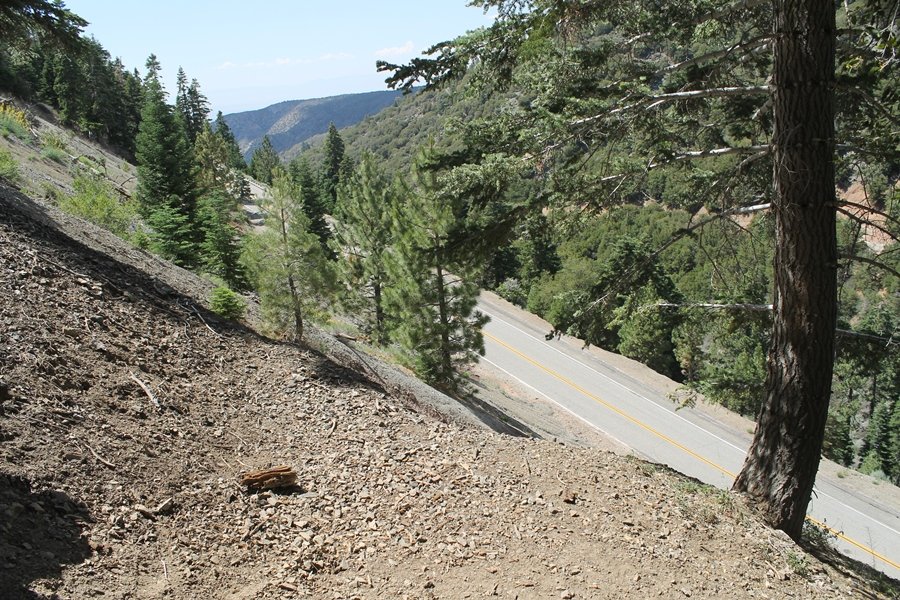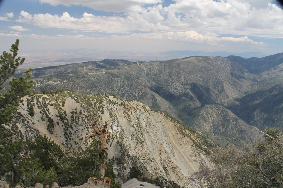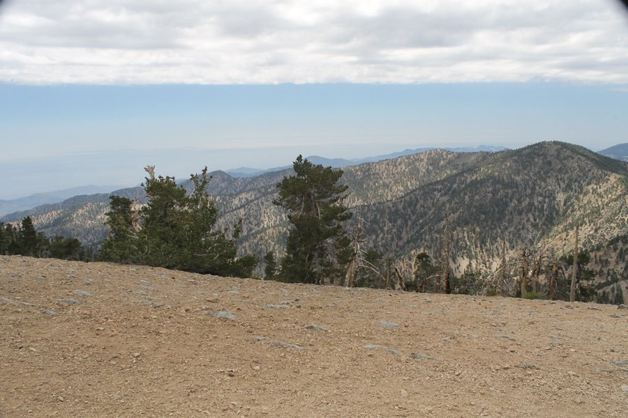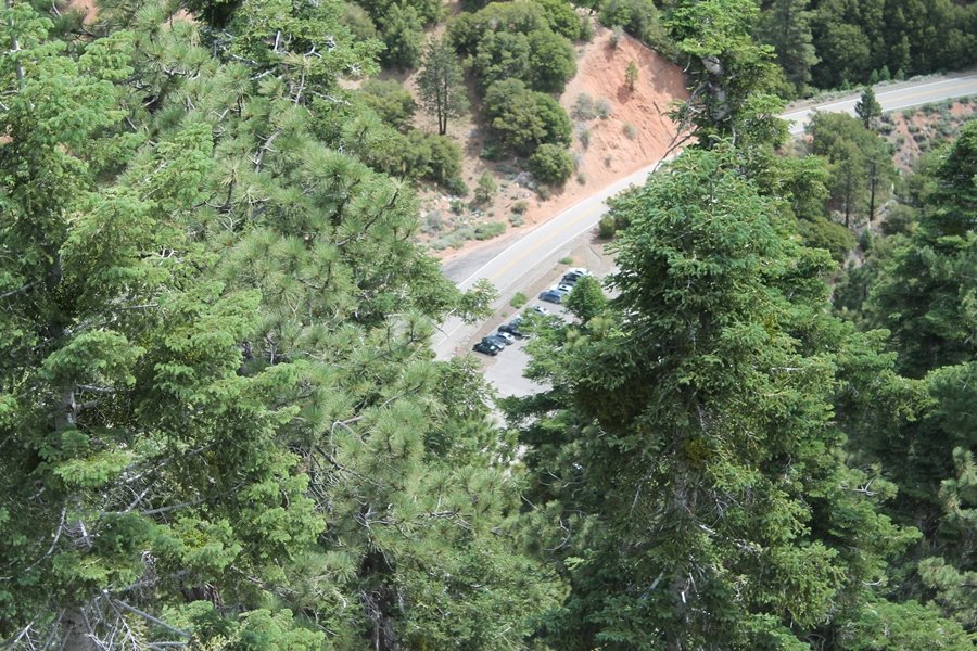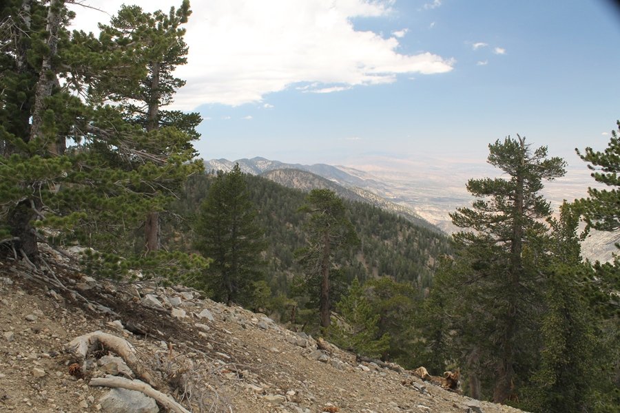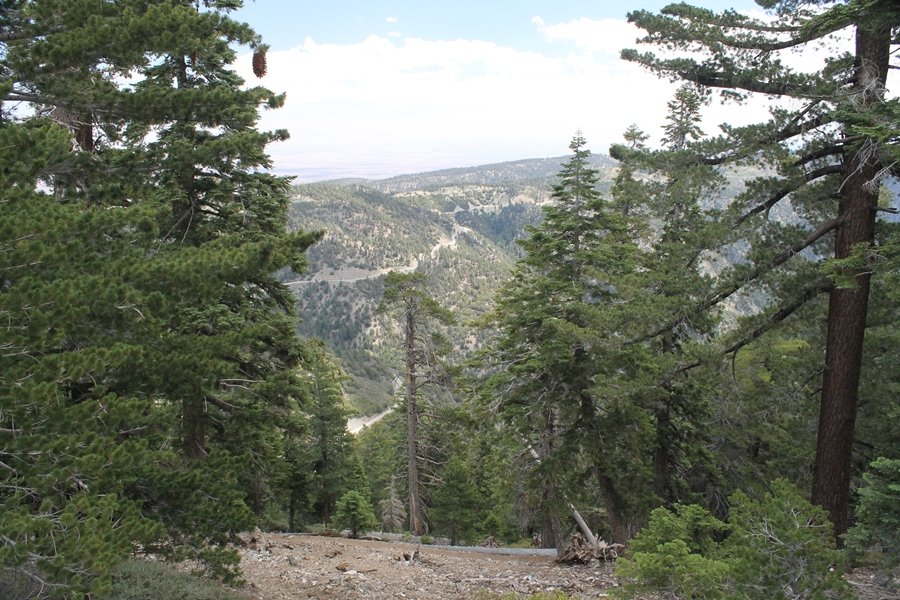 We first hiked up the PCT to Mt. Baden-Powell more than a year-and-a-half ago – it was a crisp November day then, and those memories of a tough hike in cool weather were beckoning us to repeat the journey, albeit on a warm Fourth of July Saturday. Baden-Powell’s northeast slope is one of the steepest around, rising about 2,800 vertical feet from Vincent Gap to the summit just 1.2 air-miles away – the PCT takes four miles and 42 switchbacks to cover the elevation gain. As we drove to the trailhead, Jane commented that we don’t do hard hikes anymore, and she has a point. In 2013, we walked over 300 miles and averaged 4.42 miles per hike, although the average distance was just under six miles if you ignore all the short hikes we took while in Maui. In 2014, we only walked 77+ miles and averaged 5.56 miles per hike – so far in 2015, we’ve covered almost 64 miles but averaged only 4.9 miles per hike, including today’s nearly-nine-mile effort. All that said, we do have some longer trips on our radar, so we’ll see if we can reverse the trend and make 2015 a more prolific year. We got organized at Vincent Gap and headed out about 10:20am, sort of kicking ourselves for not starting earlier – that November hike was on a chilly morning in late fall when this part of the mountain was still in deep shade, and the midday July sun made this particular ascent unpleasant at times. We made pretty good time up the trail, although Jane, dealing with some summer allergies, felt winded most of the way. Still, the forest was as beautiful as ever and the views to a clear desert floor were as good as any in recent memory – some low cloud cover moved in and out and helped temper the sun’s effects. We topped out on Baden-Powell’s northeast ridge about 12:45 and made the summit about 5 minutes later, treated to gorgeous views in all directions. Someone, perhaps Boy Scouts, had placed a flag near the summit high point, which was an unexpected treat – we had passed (and had been passed by) several groups on the way up, and some kids took our picture with the flag before we took theirs. We wandered down the south ridge about a quarter-mile as we did on our first visit here (we had come up the PCT the other direction from Dawson Saddle in May 2014 but were short on time and didn’t stay on the top but for a few minutes), before meandering back to the summit area for a brief rest – there was a group of hikers occupying seats on a log about 100 yards south of the summit, and after they got up and left, we took their place – what a wonderful spot for a break. The photos, though dramatic, don’t really come close to conveying the grandeur of the view – this is a marvelous place, and well worth the effort in getting to it. We headed back about 1:30, choosing to explore the trail to Lamel Spring for a short distance before deciding to continue the descent, leaving the spring for another time. We reached the bottom at 3:20pm, logging exactly five hours on the trail and covering 8.73 miles. It had looked like we might get some weather as we completed the bottom half of the trail, but the thunderheads stayed well to the east. A beautiful hike, though warm, and a great way to celebrate the holiday.