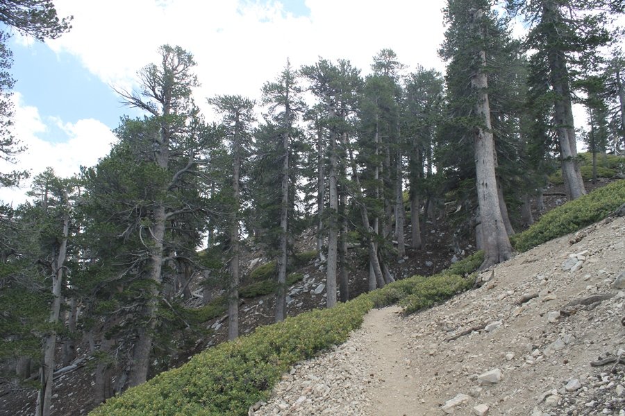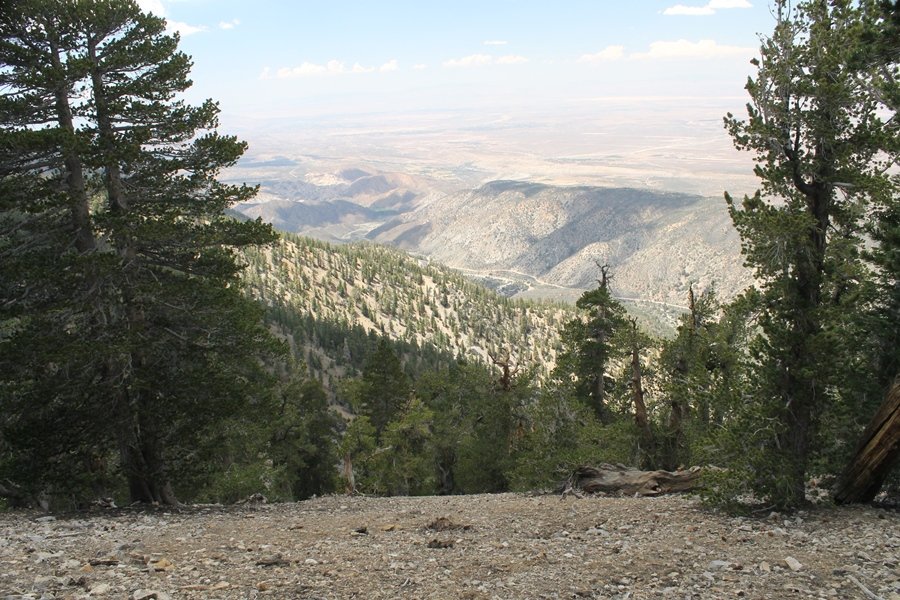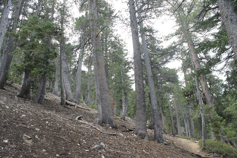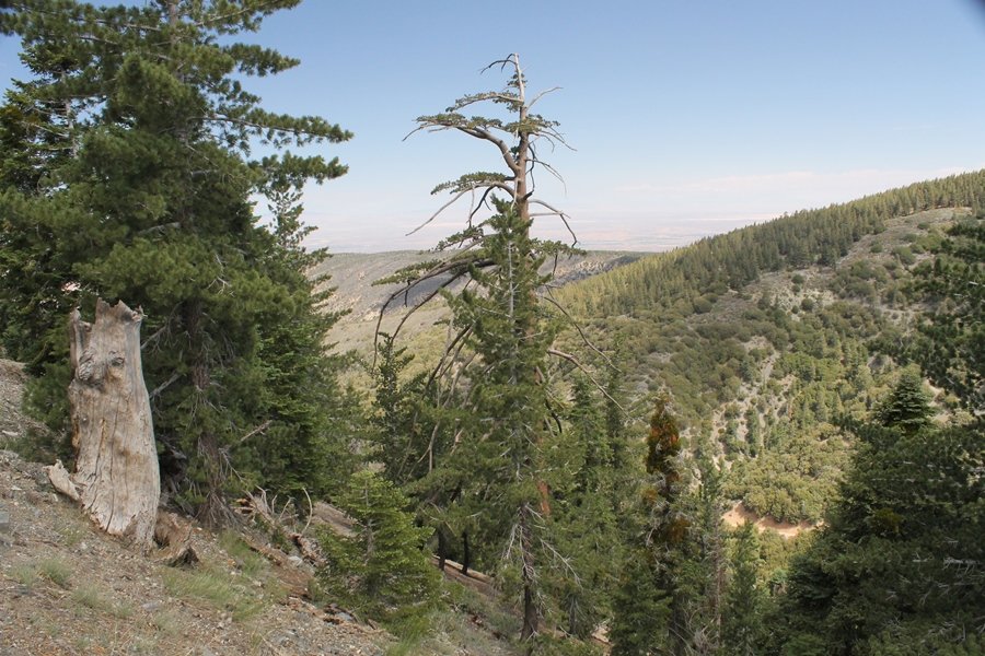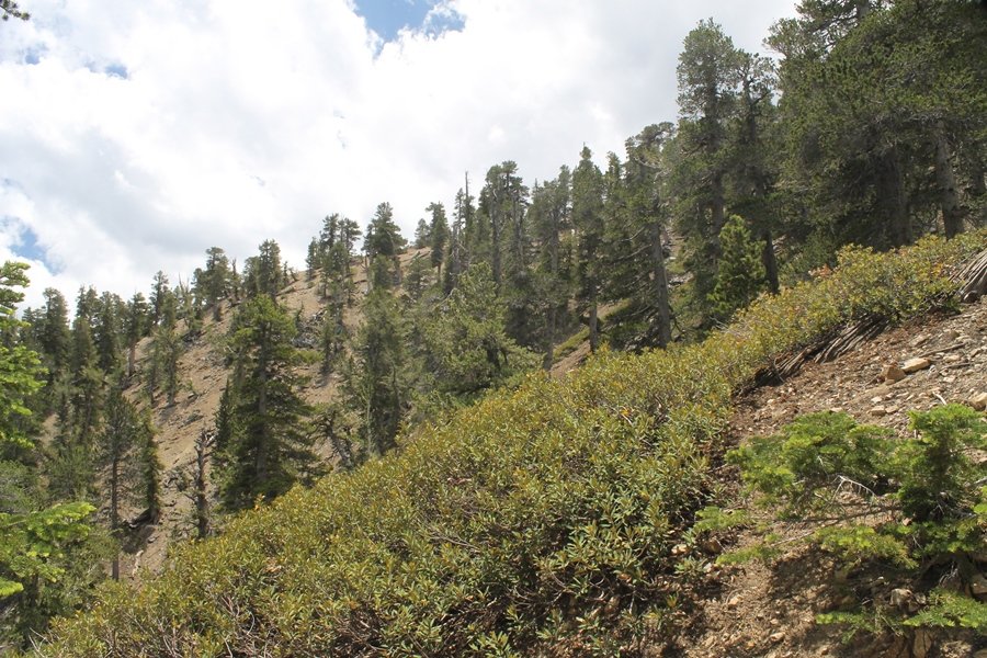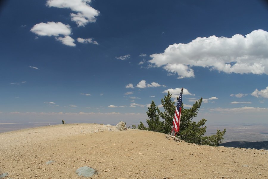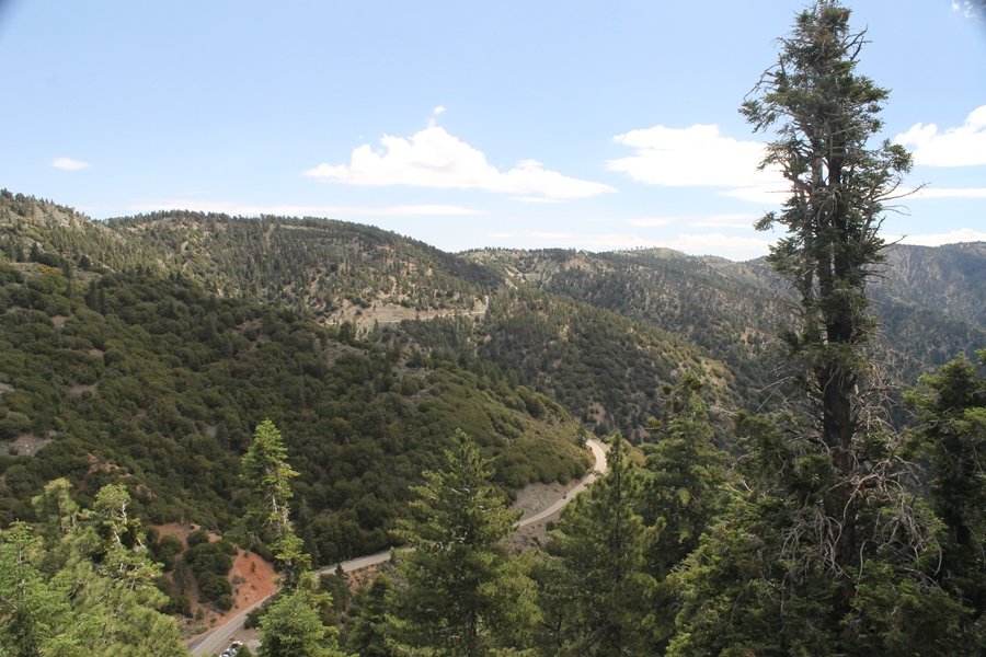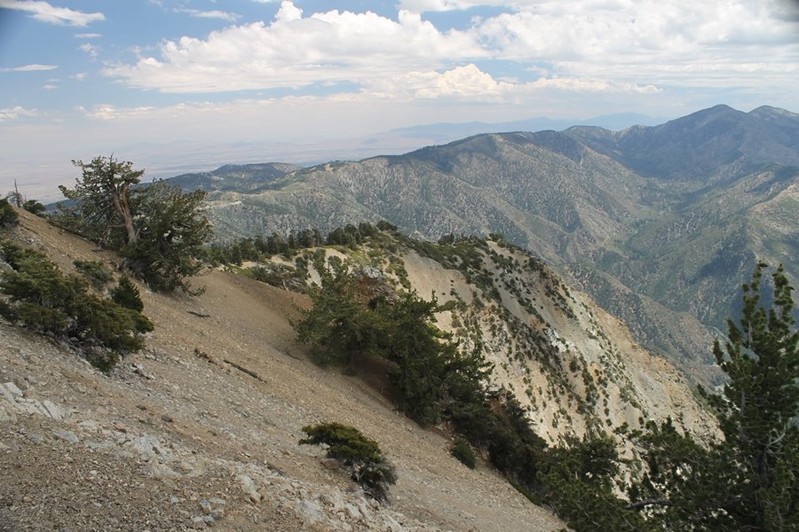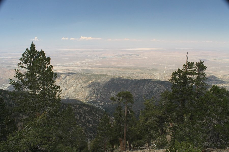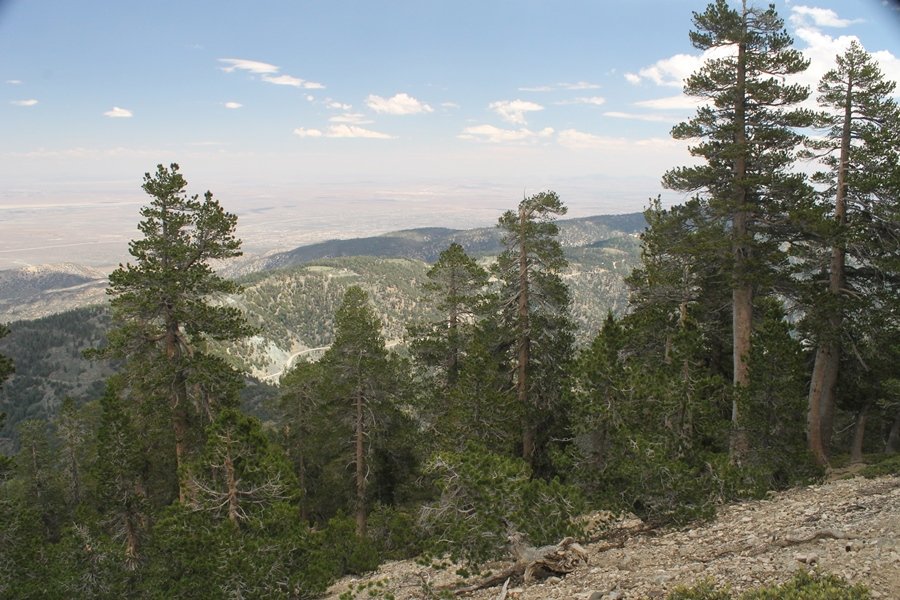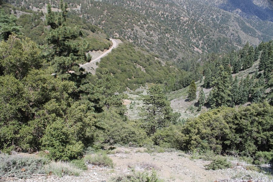 We first hiked up the PCT to Mt. Baden-Powell more than a year-and-a-half ago – it was a crisp November day then, and those memories of a tough hike in cool weather were beckoning us to repeat the journey, albeit on a warm Fourth of July Saturday. Baden-Powell’s northeast slope is one of the steepest around, rising about 2,800 vertical feet from Vincent Gap to the summit just 1.2 air-miles away – the PCT takes four miles and 42 switchbacks to cover the elevation gain. As we drove to the trailhead, Jane commented that we don’t do hard hikes anymore, and she has a point. In 2013, we walked over 300 miles and averaged 4.42 miles per hike, although the average distance was just under six miles if you ignore all the short hikes we took while in Maui. In 2014, we only walked 77+ miles and averaged 5.56 miles per hike – so far in 2015, we’ve covered almost 64 miles but averaged only 4.9 miles per hike, including today’s nearly-nine-mile effort. All that said, we do have some longer trips on our radar, so we’ll see if we can reverse the trend and make 2015 a more prolific year. We got organized at Vincent Gap and headed out about 10:20am, sort of kicking ourselves for not starting earlier – that November hike was on a chilly morning in late fall when this part of the mountain was still in deep shade, and the midday July sun made this particular ascent unpleasant at times. We made pretty good time up the trail, although Jane, dealing with some summer allergies, felt winded most of the way. Still, the forest was as beautiful as ever and the views to a clear desert floor were as good as any in recent memory – some low cloud cover moved in and out and helped temper the sun’s effects. We topped out on Baden-Powell’s northeast ridge about 12:45 and made the summit about 5 minutes later, treated to gorgeous views in all directions. Someone, perhaps Boy Scouts, had placed a flag near the summit high point, which was an unexpected treat – we had passed (and had been passed by) several groups on the way up, and some kids took our picture with the flag before we took theirs. We wandered down the south ridge about a quarter-mile as we did on our first visit here (we had come up the PCT the other direction from Dawson Saddle in May 2014 but were short on time and didn’t stay on the top but for a few minutes), before meandering back to the summit area for a brief rest – there was a group of hikers occupying seats on a log about 100 yards south of the summit, and after they got up and left, we took their place – what a wonderful spot for a break. The photos, though dramatic, don’t really come close to conveying the grandeur of the view – this is a marvelous place, and well worth the effort in getting to it. We headed back about 1:30, choosing to explore the trail to Lamel Spring for a short distance before deciding to continue the descent, leaving the spring for another time. We reached the bottom at 3:20pm, logging exactly five hours on the trail and covering 8.73 miles. It had looked like we might get some weather as we completed the bottom half of the trail, but the thunderheads stayed well to the east. A beautiful hike, though warm, and a great way to celebrate the holiday.