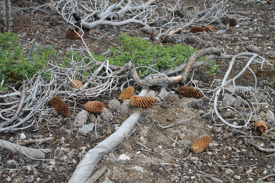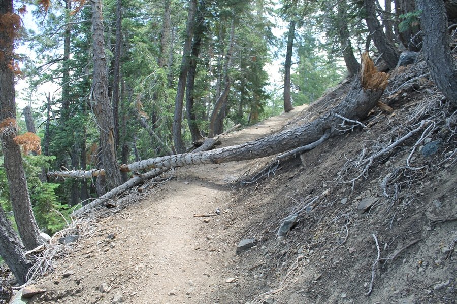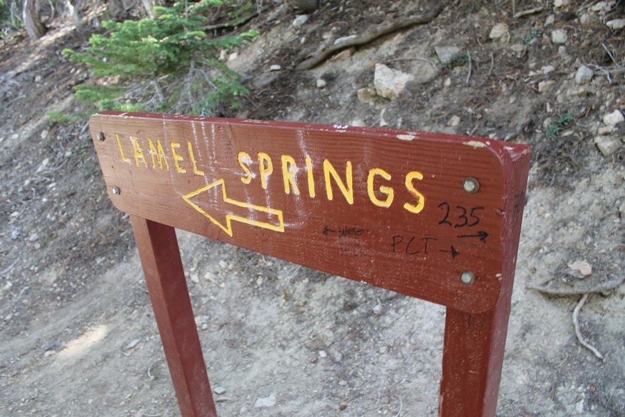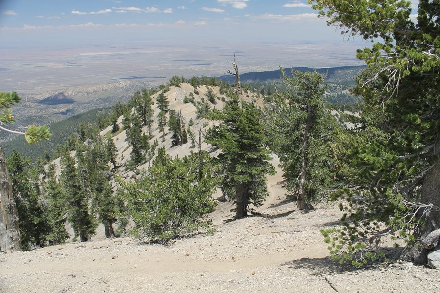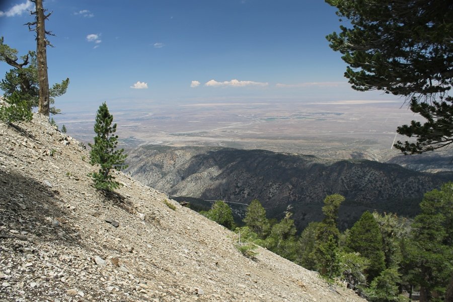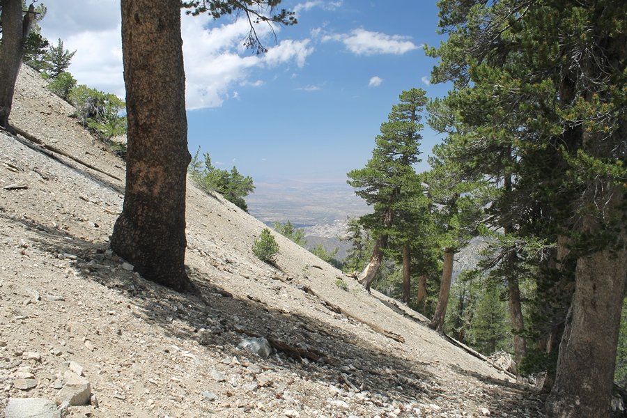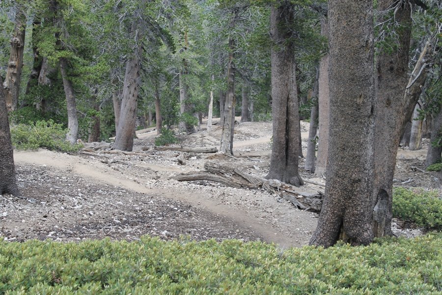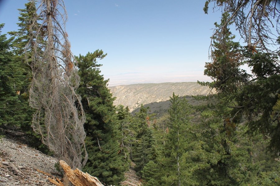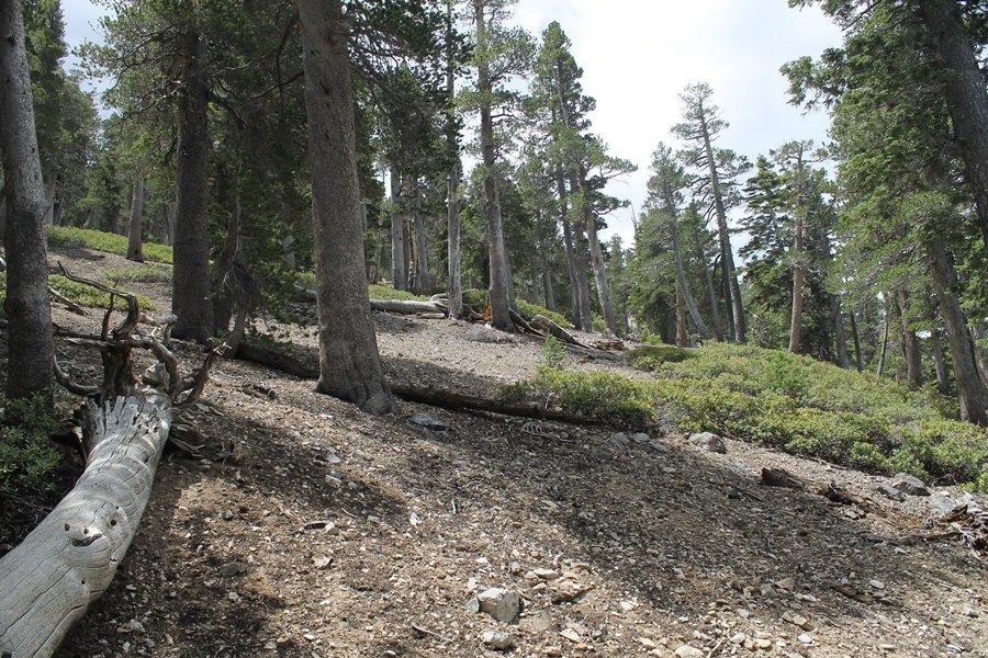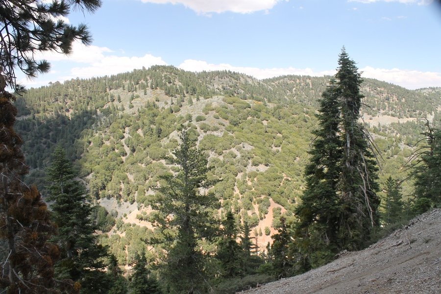 We first hiked up the PCT to Mt. Baden-Powell more than a year-and-a-half ago – it was a crisp November day then, and those memories of a tough hike in cool weather were beckoning us to repeat the journey, albeit on a warm Fourth of July Saturday. Baden-Powell’s northeast slope is one of the steepest around, rising about 2,800 vertical feet from Vincent Gap to the summit just 1.2 air-miles away – the PCT takes four miles and 42 switchbacks to cover the elevation gain. As we drove to the trailhead, Jane commented that we don’t do hard hikes anymore, and she has a point. In 2013, we walked over 300 miles and averaged 4.42 miles per hike, although the average distance was just under six miles if you ignore all the short hikes we took while in Maui. In 2014, we only walked 77+ miles and averaged 5.56 miles per hike – so far in 2015, we’ve covered almost 64 miles but averaged only 4.9 miles per hike, including today’s nearly-nine-mile effort. All that said, we do have some longer trips on our radar, so we’ll see if we can reverse the trend and make 2015 a more prolific year. We got organized at Vincent Gap and headed out about 10:20am, sort of kicking ourselves for not starting earlier – that November hike was on a chilly morning in late fall when this part of the mountain was still in deep shade, and the midday July sun made this particular ascent unpleasant at times. We made pretty good time up the trail, although Jane, dealing with some summer allergies, felt winded most of the way. Still, the forest was as beautiful as ever and the views to a clear desert floor were as good as any in recent memory – some low cloud cover moved in and out and helped temper the sun’s effects. We topped out on Baden-Powell’s northeast ridge about 12:45 and made the summit about 5 minutes later, treated to gorgeous views in all directions. Someone, perhaps Boy Scouts, had placed a flag near the summit high point, which was an unexpected treat – we had passed (and had been passed by) several groups on the way up, and some kids took our picture with the flag before we took theirs. We wandered down the south ridge about a quarter-mile as we did on our first visit here (we had come up the PCT the other direction from Dawson Saddle in May 2014 but were short on time and didn’t stay on the top but for a few minutes), before meandering back to the summit area for a brief rest – there was a group of hikers occupying seats on a log about 100 yards south of the summit, and after they got up and left, we took their place – what a wonderful spot for a break. The photos, though dramatic, don’t really come close to conveying the grandeur of the view – this is a marvelous place, and well worth the effort in getting to it. We headed back about 1:30, choosing to explore the trail to Lamel Spring for a short distance before deciding to continue the descent, leaving the spring for another time. We reached the bottom at 3:20pm, logging exactly five hours on the trail and covering 8.73 miles. It had looked like we might get some weather as we completed the bottom half of the trail, but the thunderheads stayed well to the east. A beautiful hike, though warm, and a great way to celebrate the holiday.