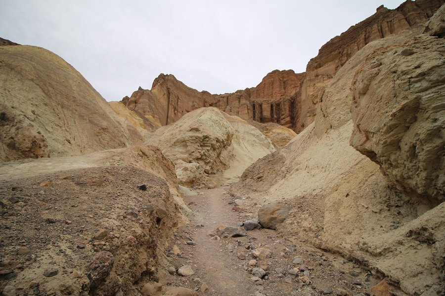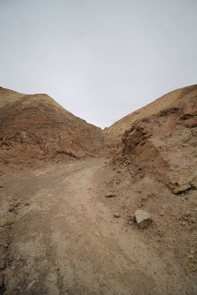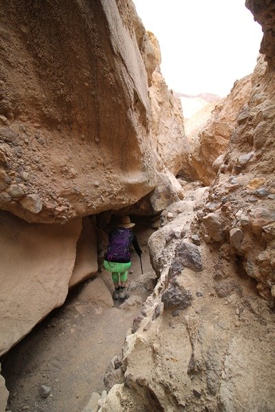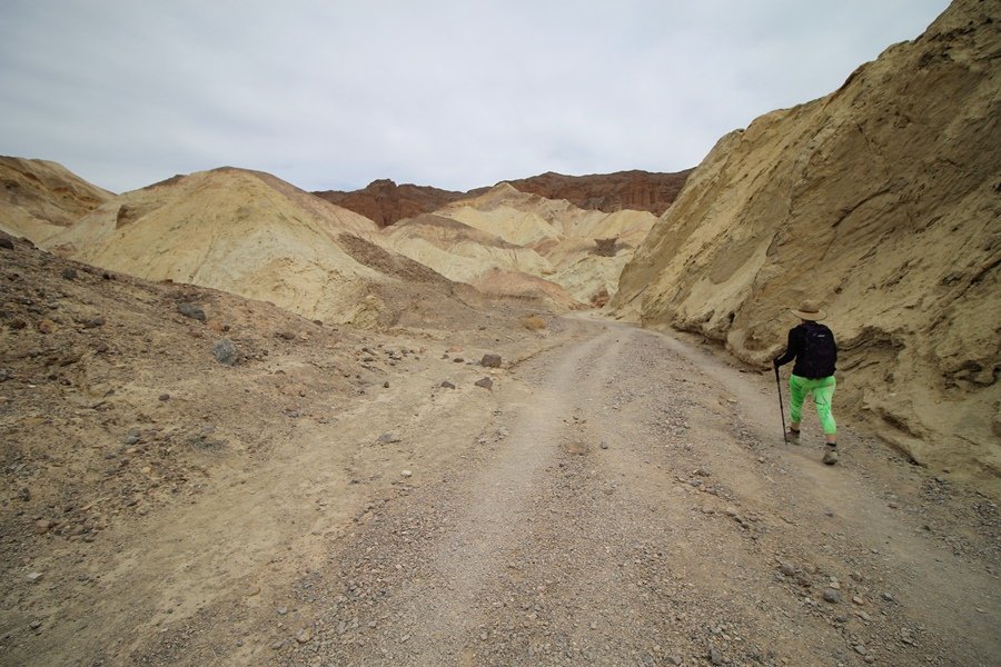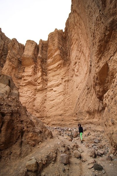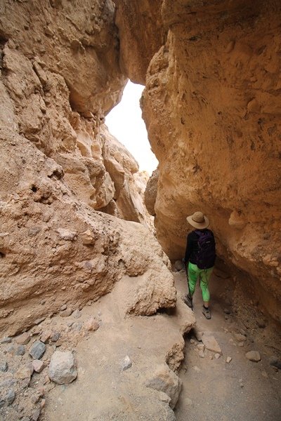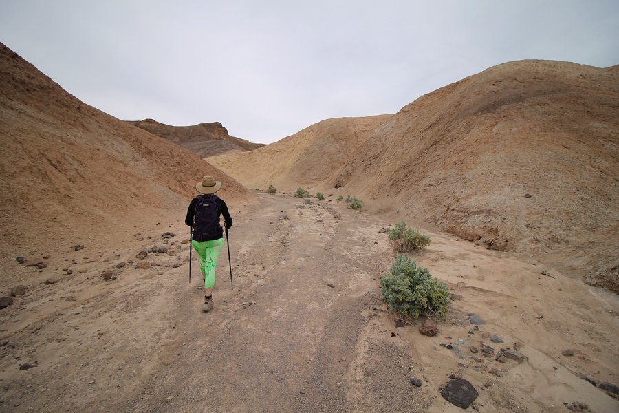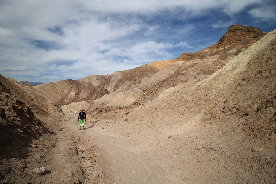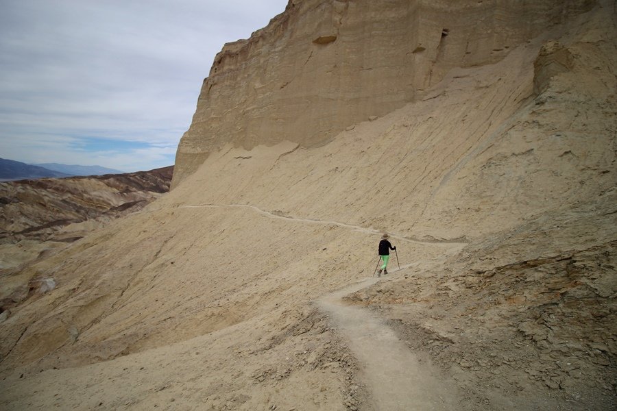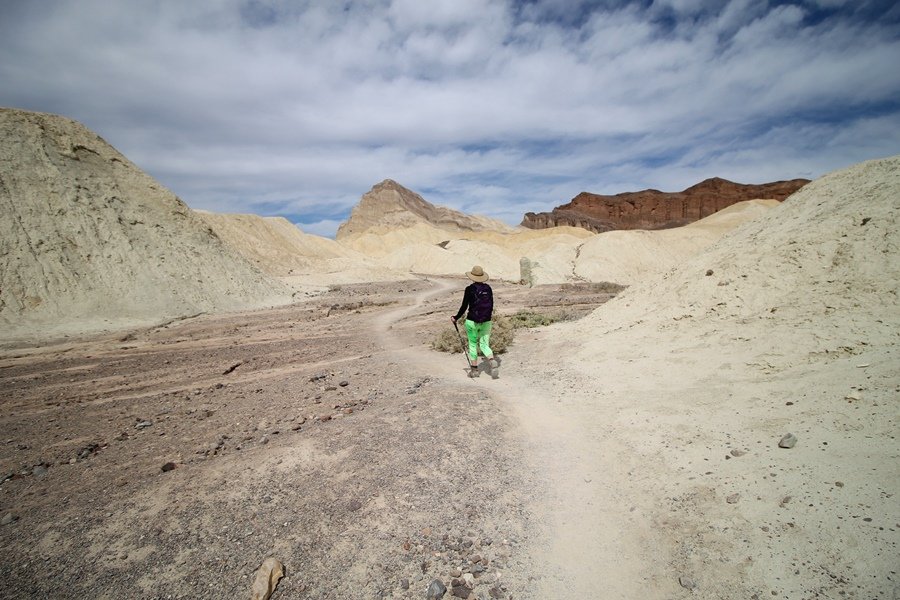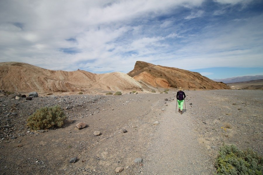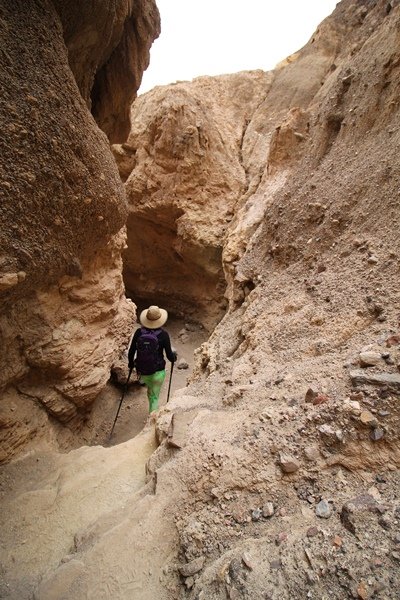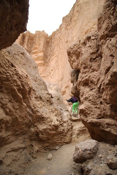 After returning to Ridgecrest on Friday night, we decided to head somewhere in the eastern Sierras since we were two hours closer to those destinations than if we’d started from home, yet, after waking up early, we decided to make the return trip to Death Valley instead – there were simply too many things that we still wanted to see. Since we were getting ready well before sunrise, Jane suggested we drive the long way around, out to Barstow, then up Interstate 15 to Baker, then north up Hwy 127 to Death Valley’s east entrance. It meant four hours in the car instead of two, but we decided to go for it – neither of us had ever been through that part of the desert before, so off we went. Leaving Ridgecrest about 6am, we made it to Baker by about 8 – it was cool and windy here as Chris fueled up the Jeep again. The dusty town and weekend traffic were less than appealing, but that quickly changed as we found the road leading north up the Silurian Valley – there were very few cars on the highway, and the desert scenery became dreamlike in a hurry. Everything was so green, and we actually passed running streams where we expected dry washes. About 45 minutes out of Baker, we crossed the Amargosa River and ascended the low saddle at Ibex Pass, dropping into a broad valley known as McClain Park. Save the lone powerline 1/4-mile west of the road and the road itself, there were virtually no signs of civilization as far as the eye could see. We stopped to take some pictures, and Jane announced flatly that she was going to hike over to the powerline and beyond – she was 200 yards ahead by the time Chris turned around from his survey of the east side of the valley. The views from the western side of the valley were just beautiful – the green hills, deep blue skies filled with streaky cirrus clouds, and the variegated soil and sagebrush made for a gorgeous scene. We could probably have spent the day just roaming around here, but we eventually made our way back to the Jeep and continued northward through the town of Shoshone, then further north to Death Valley Junction and Hwy 190. We followed the latter then westward into Death Valley, stopping again at the top of the grade for some more photos. As we began our descent toward Furnace Creek, we decided to stop at Zabriskie Point, a popular overlook we had passed on our way to and from Dante’s View the previous evening. Here, a loop trail winds its way westward into the badlands below the point, and the loop is also connected by lateral trails to Golden Canyon, another well-visited attraction adjacent to the north – the hiking here could total upwards of seven miles, depending on the chosen route. We found a very full parking lot when we arrived at Zabriskie Point around 10:30am, mostly drive-by tourists who were strolling up the paved switchbacks to the observation area at the top of the hill – we made the obligatory visit here also, and again, the views were fabulous. We retreated back to car after a short time, got our boots and packs, and headed out across a dry wash, over a low ridge, and down a broad trail into Gower Gulch. We expected the washes in Death Valley to be full of sand, but, like at Natural Bridge the day before, the canyon bottoms were surprisingly easy to walk in – the first mile passed quickly as we meandered down the shallow canyons, and we were soon hiking north on the lateral trail to Golden Canyon that runs across the base of Manly Beacon, a distinctive rock formation that dominates the surrounding terrain. Once past Manly Beacon, the trail drops steeply to the northwest, and we met several hikers coming uphill who were clearly winded, even this close to sea level (on our return, we calculated that this stretch gains about 1,000′ per mile, so it is indeed quite steep). Going down wasn’t so bad, however, and we met the main channel of Golden Canyon soon thereafter. This canyon is principally served from a trailhead a mile west on the Badwater Road, and we immediately encountered others who had come up from that direction – all were headed, like us, further northeast from this junction to the beautiful cliffs of Red Cathedral, a semicircular canyon that abuts the back side of Manly Beacon to the north. The canyon floor is very twisty here, the ravines deep and narrow, but the main path was easy to follow. At several points, we had to step up, lean over, or stoop low to get through the tighter spots, but, after maybe 20 minutes in Golden Canyon, we reached a wide wash at the very base of the red cliffs. Others appeared to be heading northward (to the highest of the accessible overlooks, as it turned out), but we found an alternate path leading south up the cliff face – here, we reached the end of the trail where the cliffs met the network of rounded ridgetops below – it was a marvelous view out west over the canyon to the salt flats in the main valley. We retraced our steps to Zabriskie Point in reverse order, opting not to walk further west through Golden Canyon – the high clouds had become more of a constant overcast, and we didn’t want to get caught in any downpour that might be imminent (as it turned out, the whole day was dry as the rain stayed away until Saturday night). Our hike totaled just under five miles, but it felt like twice that – the varied terrain and ever-changing views served to make us feel we had traveled great distances. The parking lot was even busier when we got back to the Jeep, and we were quickly on our way to find more lunch options (we ended up at the Furnace Creek Golf Course grill, which we highly recommend).