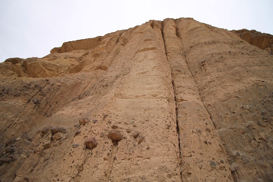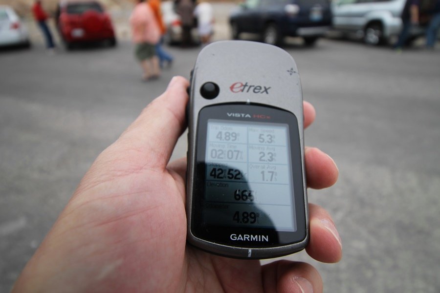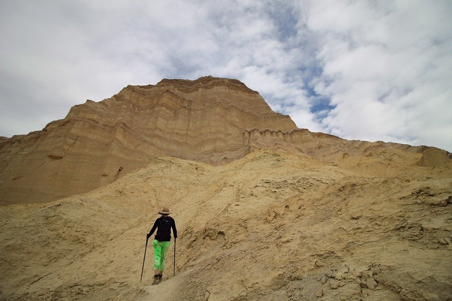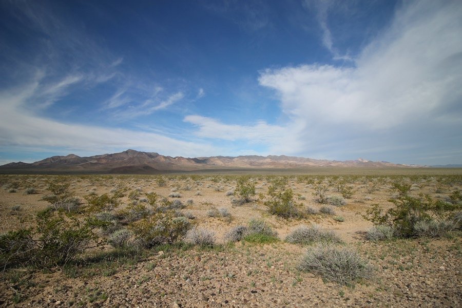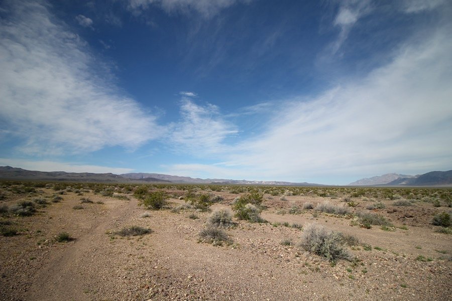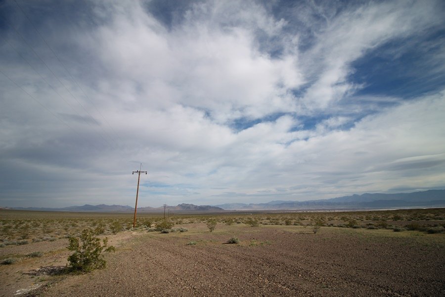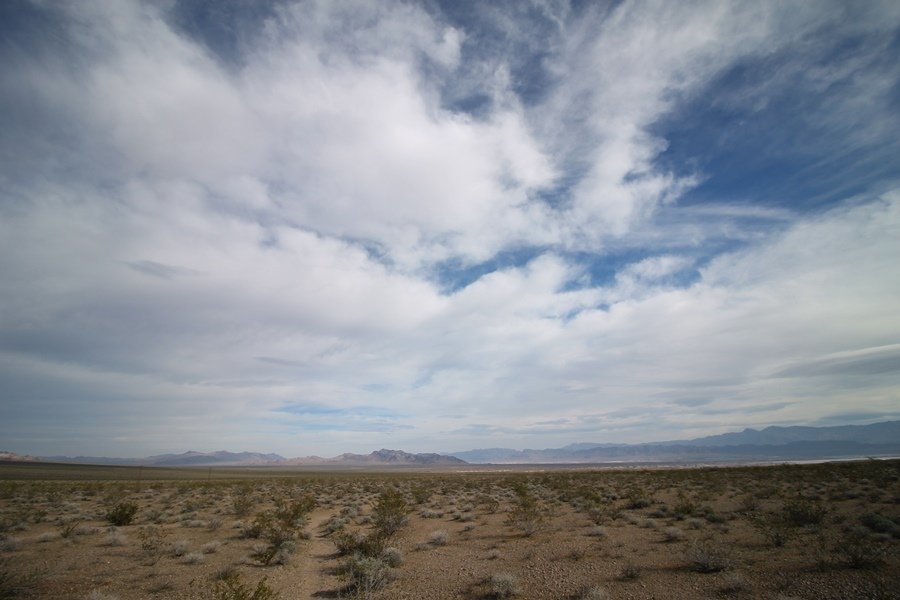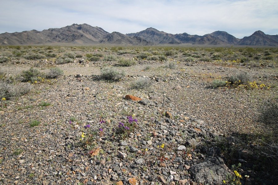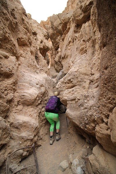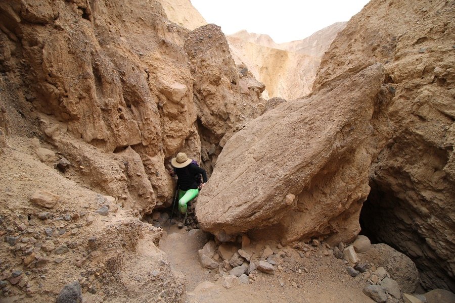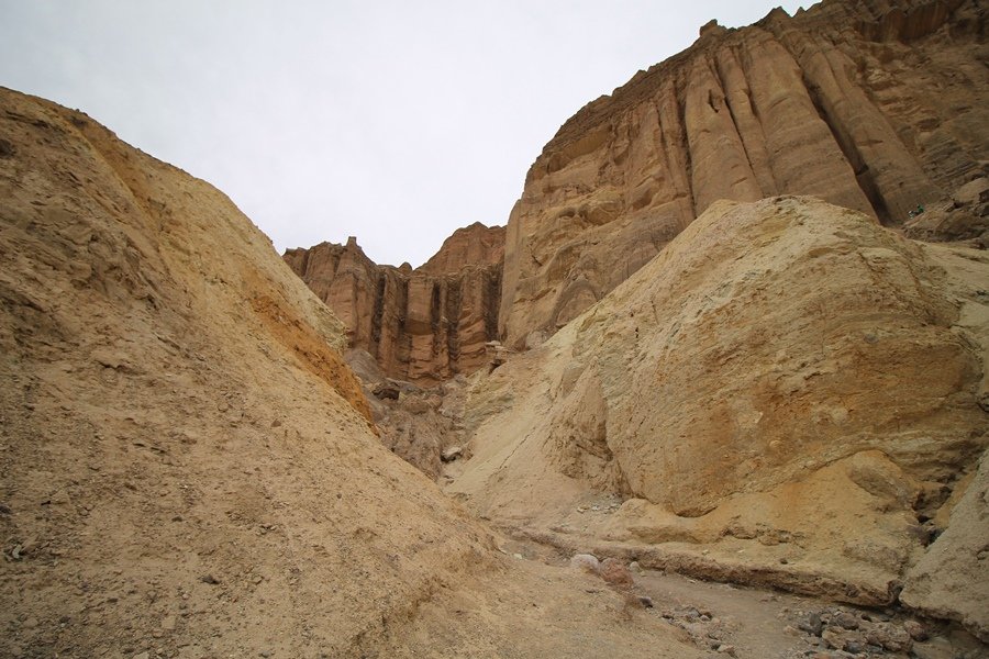 After returning to Ridgecrest on Friday night, we decided to head somewhere in the eastern Sierras since we were two hours closer to those destinations than if we’d started from home, yet, after waking up early, we decided to make the return trip to Death Valley instead – there were simply too many things that we still wanted to see. Since we were getting ready well before sunrise, Jane suggested we drive the long way around, out to Barstow, then up Interstate 15 to Baker, then north up Hwy 127 to Death Valley’s east entrance. It meant four hours in the car instead of two, but we decided to go for it – neither of us had ever been through that part of the desert before, so off we went. Leaving Ridgecrest about 6am, we made it to Baker by about 8 – it was cool and windy here as Chris fueled up the Jeep again. The dusty town and weekend traffic were less than appealing, but that quickly changed as we found the road leading north up the Silurian Valley – there were very few cars on the highway, and the desert scenery became dreamlike in a hurry. Everything was so green, and we actually passed running streams where we expected dry washes. About 45 minutes out of Baker, we crossed the Amargosa River and ascended the low saddle at Ibex Pass, dropping into a broad valley known as McClain Park. Save the lone powerline 1/4-mile west of the road and the road itself, there were virtually no signs of civilization as far as the eye could see. We stopped to take some pictures, and Jane announced flatly that she was going to hike over to the powerline and beyond – she was 200 yards ahead by the time Chris turned around from his survey of the east side of the valley. The views from the western side of the valley were just beautiful – the green hills, deep blue skies filled with streaky cirrus clouds, and the variegated soil and sagebrush made for a gorgeous scene. We could probably have spent the day just roaming around here, but we eventually made our way back to the Jeep and continued northward through the town of Shoshone, then further north to Death Valley Junction and Hwy 190. We followed the latter then westward into Death Valley, stopping again at the top of the grade for some more photos. As we began our descent toward Furnace Creek, we decided to stop at Zabriskie Point, a popular overlook we had passed on our way to and from Dante’s View the previous evening. Here, a loop trail winds its way westward into the badlands below the point, and the loop is also connected by lateral trails to Golden Canyon, another well-visited attraction adjacent to the north – the hiking here could total upwards of seven miles, depending on the chosen route. We found a very full parking lot when we arrived at Zabriskie Point around 10:30am, mostly drive-by tourists who were strolling up the paved switchbacks to the observation area at the top of the hill – we made the obligatory visit here also, and again, the views were fabulous. We retreated back to car after a short time, got our boots and packs, and headed out across a dry wash, over a low ridge, and down a broad trail into Gower Gulch. We expected the washes in Death Valley to be full of sand, but, like at Natural Bridge the day before, the canyon bottoms were surprisingly easy to walk in – the first mile passed quickly as we meandered down the shallow canyons, and we were soon hiking north on the lateral trail to Golden Canyon that runs across the base of Manly Beacon, a distinctive rock formation that dominates the surrounding terrain. Once past Manly Beacon, the trail drops steeply to the northwest, and we met several hikers coming uphill who were clearly winded, even this close to sea level (on our return, we calculated that this stretch gains about 1,000′ per mile, so it is indeed quite steep). Going down wasn’t so bad, however, and we met the main channel of Golden Canyon soon thereafter. This canyon is principally served from a trailhead a mile west on the Badwater Road, and we immediately encountered others who had come up from that direction – all were headed, like us, further northeast from this junction to the beautiful cliffs of Red Cathedral, a semicircular canyon that abuts the back side of Manly Beacon to the north. The canyon floor is very twisty here, the ravines deep and narrow, but the main path was easy to follow. At several points, we had to step up, lean over, or stoop low to get through the tighter spots, but, after maybe 20 minutes in Golden Canyon, we reached a wide wash at the very base of the red cliffs. Others appeared to be heading northward (to the highest of the accessible overlooks, as it turned out), but we found an alternate path leading south up the cliff face – here, we reached the end of the trail where the cliffs met the network of rounded ridgetops below – it was a marvelous view out west over the canyon to the salt flats in the main valley. We retraced our steps to Zabriskie Point in reverse order, opting not to walk further west through Golden Canyon – the high clouds had become more of a constant overcast, and we didn’t want to get caught in any downpour that might be imminent (as it turned out, the whole day was dry as the rain stayed away until Saturday night). Our hike totaled just under five miles, but it felt like twice that – the varied terrain and ever-changing views served to make us feel we had traveled great distances. The parking lot was even busier when we got back to the Jeep, and we were quickly on our way to find more lunch options (we ended up at the Furnace Creek Golf Course grill, which we highly recommend).