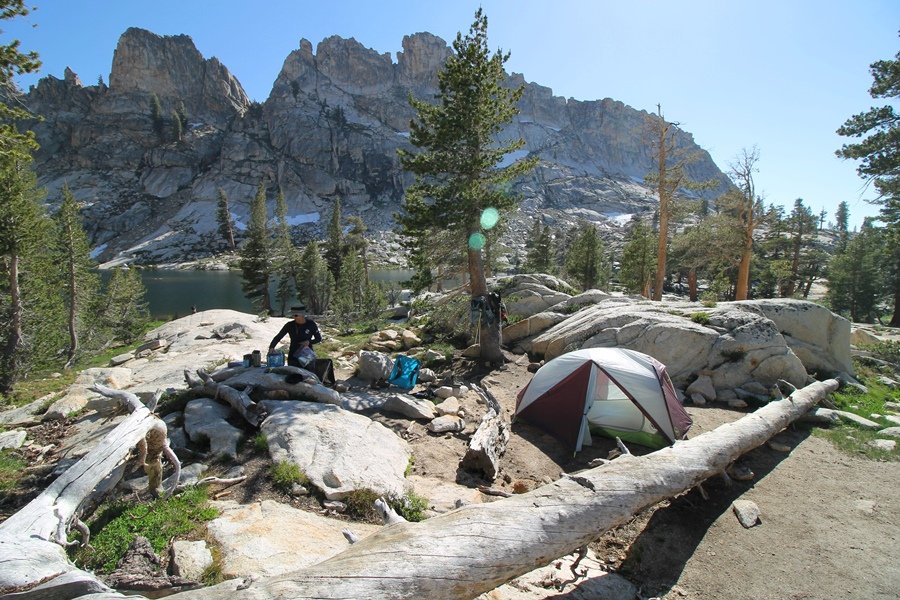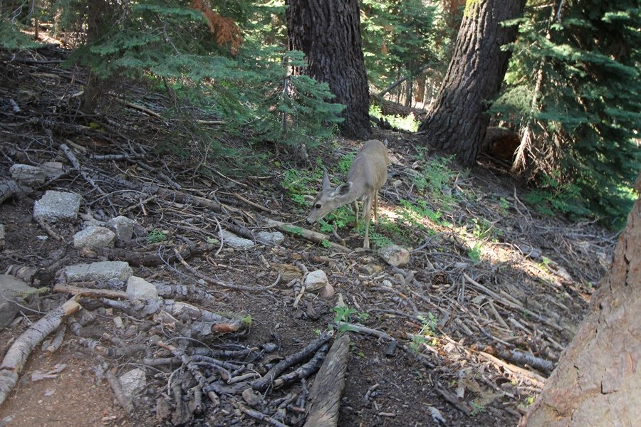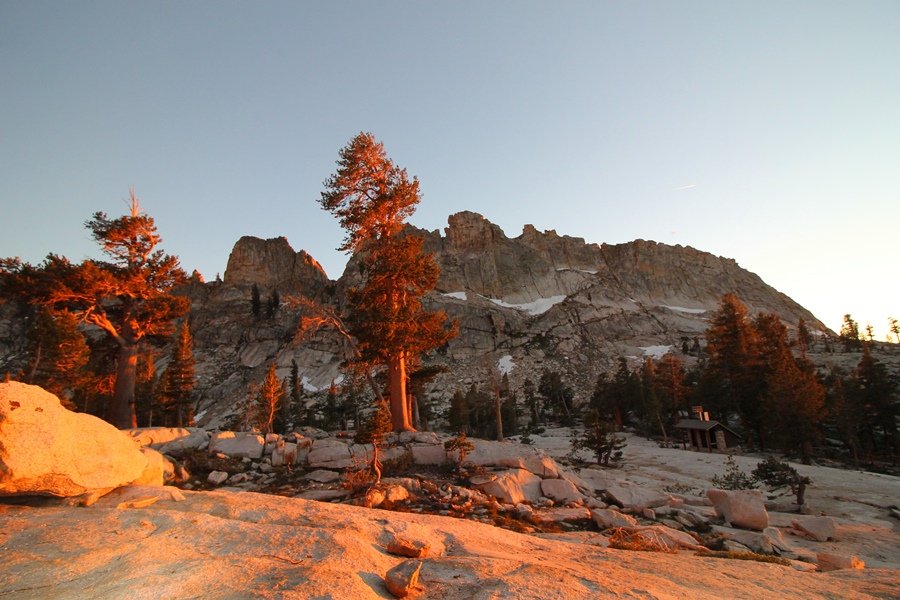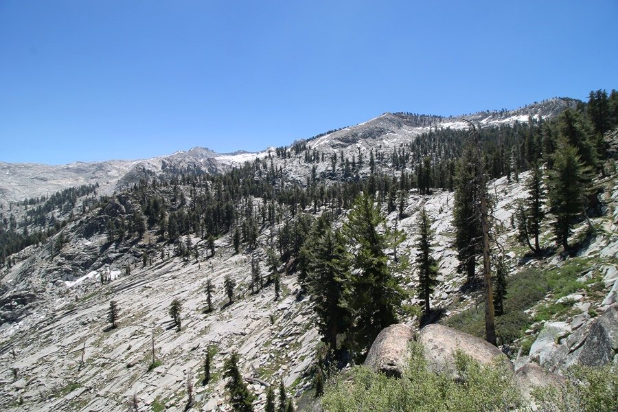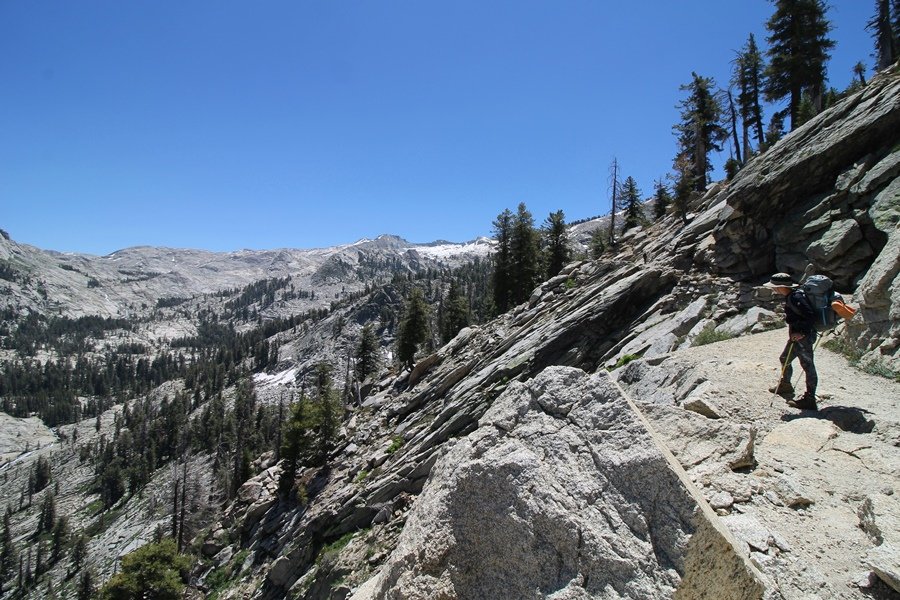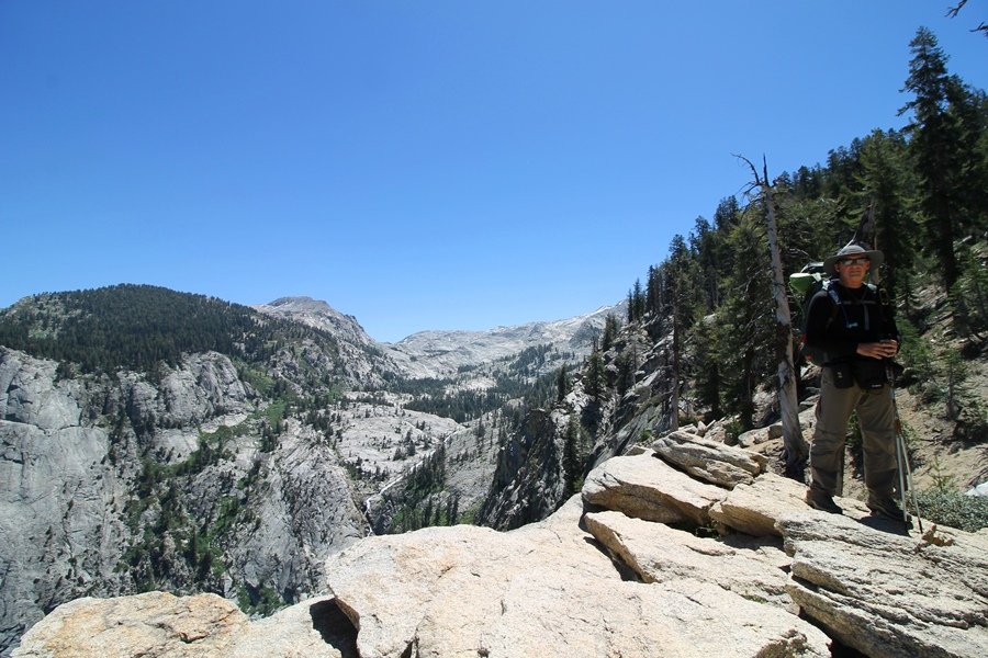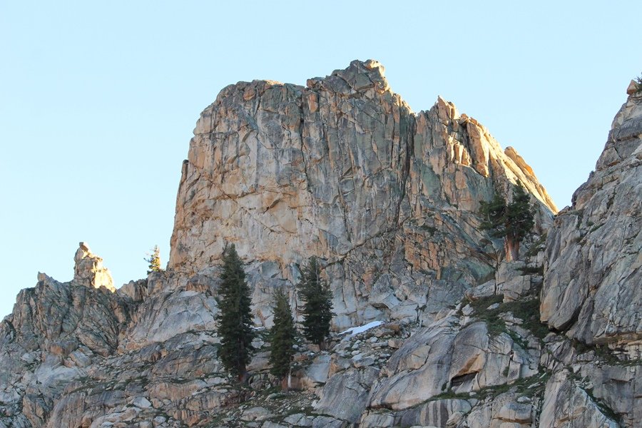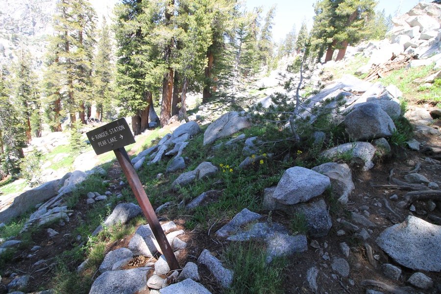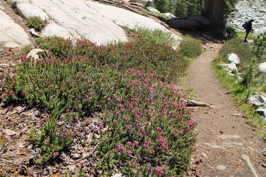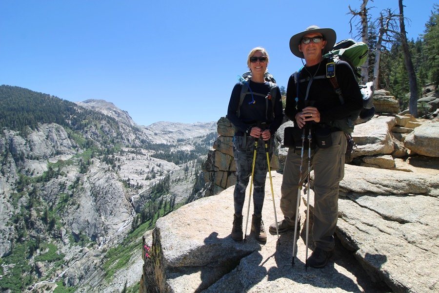 We’ve been hiking with full packs the past couple of months in preparation for our upcoming six-day backpack trip in Yosemite, and this particular weekend had long been slated for a shorter practice excursion, a shakedown cruise of sorts to prove out both our gear and our ability. We’ve had a wilderness permit since February to visit Little Lakes Valley near Bishop, but concerns about still-melting snow and associated clouds of mosquitos had us looking elsewhere for destinations. Pear Lake in Sequoia National Park has long been on our list of places to go, and it rather quickly sprung to the top of our list of possible trips for this weekend – since the park does not take permit reservations in advance for Pear Lake, we figured we could simply show up at the ranger station at first light Friday morning and not be at a disadvantage getting a last minute permit. So, after spending Thursday night in a pricey but convenient motel room in Three Rivers, we arrived at the Lodgepole visitor center at 6:15am Friday to find three other parties standing at the locked doors ahead of us – once the rangers opened up the facility at 7:00, we found out only one of those groups was headed to Pear Lake, and we got our permit without any trouble. By 8:30am, we were at the Wolverton trailhead and ready to head out. The Lakes trail heads east from Wolverton, first up a gentle ridgeline before bending southeast and climbing through the Panther Creek drainage. About two miles from Wolverton, the trail splits off northward, splitting again after a short distance into two parallel tracks, the left fork continuing north to a 1,000′-tall granite monolith called The Watchtower, the right fork climbing more earnestly eastward over The Hump, a ridge separating Panther Creek from the Heather Lake basin adjacent to the east – the two trails reunite at Heather Lake, which we had targeted as our likely lunch spot. Beyond Heather Lake, the trail ascends around another intervening ridge before dropping into the Emerald Lake cirque, then ascending again around a third ridge before making a final climb to Pear Lake at 9,500+’ – all told, the trail to Pear Lake is nominally 6.2 miles (although the Watchtower route adds about 0.3 miles to the total distance) with some 2,500′ of elevation gain. Leaving Wolverton, we immediately felt the increased weight of our packs – the additions of food and extra clothing meant both our packs were now over 30 lbs., and we necessarily shifted our respective loads around within the first half mile, leaving Jane with about 28 lbs. while Chris carried about 35. Luckily, the trail gradient is quite moderate over the first few miles through very pretty forest. There were lots of hikers on this popular trail, most folks with day packs who were going further up the Alta trail to Panther Gap or Mehrten Meadow located south and east of our turnoff up the Lakes trail. We passed a nonchalant doe grazing along the trail, entirely undisturbed by the curious bipeds wandering by – she must be used to us. After turning north, the Lakes trail steepens a bit as it gradually climbs for a mile, emerging after two short switchbacks at the top of The Watchtower – its rounded crown, which is a steep scramble from below the trail to the west, appears as just a minor outcropping, until one realizes the vertigo-inducing sheerness of the drop on its north and east sides. Some other hikers took our photo here, and it was one of the most photogenic spots of the whole hike – this trail closes whenever ice and snow are present, so it’s a must-do in the summer. We continued east and south, first along the clifftops and then across more moderate slopes into the Heather Lake basin – we ate our salami-and-cheese lunch admiring the reflection in the water of the mountains above. We had taken our time on this hike so far as it was about 12:30pm when we got to Heather Lake – leaving about 1pm, we went even slower up to Emerald Lake (the trail passes below the lake to the north, but the views over the smaller Aster Lake further down the basin are marvelous) before exiting that cirque northward and rounding the ridge into the Pear Lake bowl. Here, the views east opened up and the last few hundred yards, though tiring at the end of our long climb under heavy loads, were some of the most enjoyable of the day. Camping at Pear Lake is limited to the ten numbered sites only – four are located west of the lake’s outlet while the balance are on the far side. Stopping briefly near the outlet for pictures of the stunning scenery, we wandered past and found only one site already occupied – having been told by the rangers to expect a full campground, we were astonished that we were the first party to arrive that day, given our very slow pace, but that left us with a number of campsite choices. We found #8 most to our liking – the furthest east, we were separated from the other eastern sites by some large rocks, and yet had a nice view of the lake below and some connecting slabs down which we could walk for water (the vault toilets are also conveniently nearby). A ranger was in residence at the station a few hundred yards down the slope, and she came by to check our permit, noting that the pesky marmots has already gnawed the grips of our trekking poles which we had left laying against a log while we had scouted campsites – we made sure to hang our gear 3-4 feet off the ground after that. After setting up camp, we lounged for a bit before cooking our dinner of mac-and-cheese with bacon bits added – it was heavenly, no lie. As the sun set later in the evening, the alpenglow lit up the walls of the cirque behind our camp and the east side of the bowl to the south, making for a glorious display of color to close out the day. A wonderful Day One of three…