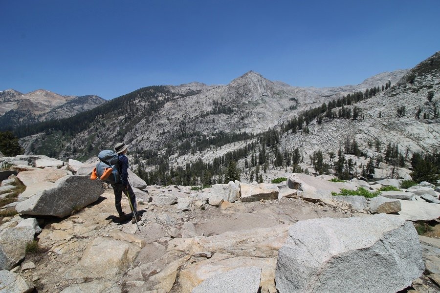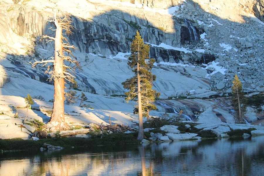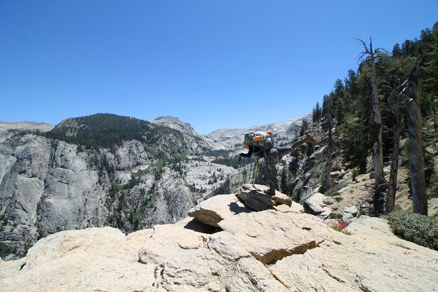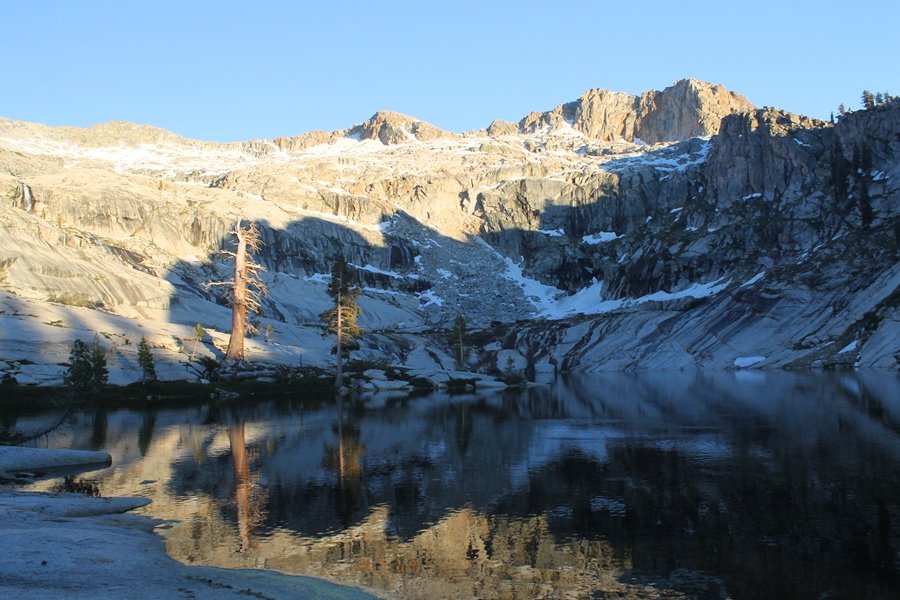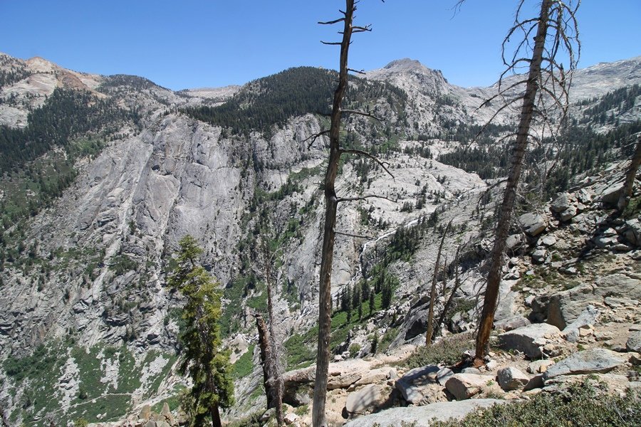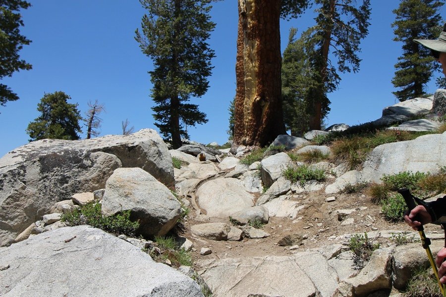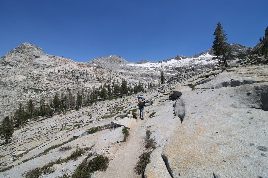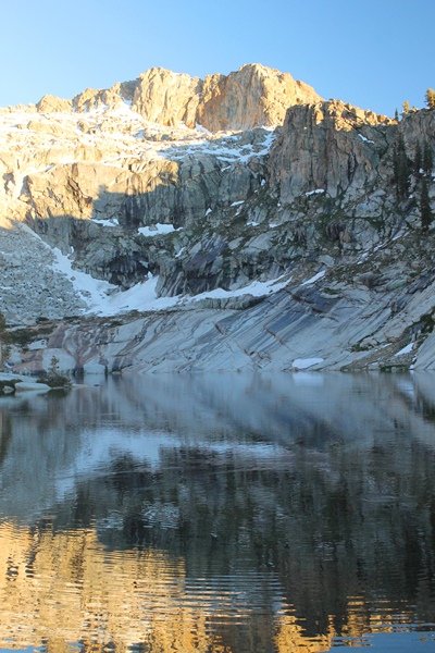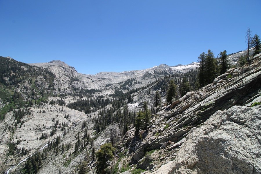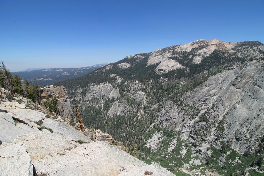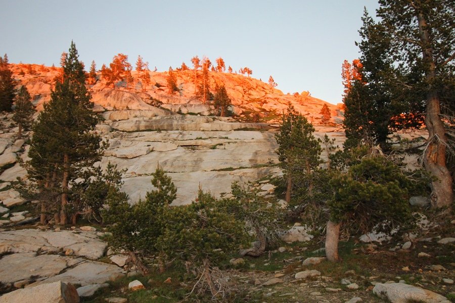We’ve been hiking with full packs the past couple of months in preparation for our upcoming six-day backpack trip in Yosemite, and this particular weekend had long been slated for a shorter practice excursion, a shakedown cruise of sorts to prove out both our gear and our ability. We’ve had a wilderness permit since February to visit Little Lakes Valley near Bishop, but concerns about still-melting snow and associated clouds of mosquitos had us looking elsewhere for destinations. Pear Lake in Sequoia National Park has long been on our list of places to go, and it rather quickly sprung to the top of our list of possible trips for this weekend – since the park does not take permit reservations in advance for Pear Lake, we figured we could simply show up at the ranger station at first light Friday morning and not be at a disadvantage getting a last minute permit. So, after spending Thursday night in a pricey but convenient motel room in Three Rivers, we arrived at the Lodgepole visitor center at 6:15am Friday to find three other parties standing at the locked doors ahead of us – once the rangers opened up the facility at 7:00, we found out only one of those groups was headed to Pear Lake, and we got our permit without any trouble. By 8:30am, we were at the Wolverton trailhead and ready to head out. The Lakes trail heads east from Wolverton, first up a gentle ridgeline before bending southeast and climbing through the Panther Creek drainage. About two miles from Wolverton, the trail splits off northward, splitting again after a short distance into two parallel tracks, the left fork continuing north to a 1,000′-tall granite monolith called The Watchtower, the right fork climbing more earnestly eastward over The Hump, a ridge separating Panther Creek from the Heather Lake basin adjacent to the east – the two trails reunite at Heather Lake, which we had targeted as our likely lunch spot. Beyond Heather Lake, the trail ascends around another intervening ridge before dropping into the Emerald Lake cirque, then ascending again around a third ridge before making a final climb to Pear Lake at 9,500+’ – all told, the trail to Pear Lake is nominally 6.2 miles (although the Watchtower route adds about 0.3 miles to the total distance) with some 2,500′ of elevation gain. Leaving Wolverton, we immediately felt the increased weight of our packs – the additions of food and extra clothing meant both our packs were now over 30 lbs., and we necessarily shifted our respective loads around within the first half mile, leaving Jane with about 28 lbs. while Chris carried about 35. Luckily, the trail gradient is quite moderate over the first few miles through very pretty forest. There were lots of hikers on this popular trail, most folks with day packs who were going further up the Alta trail to Panther Gap or Mehrten Meadow located south and east of our turnoff up the Lakes trail. We passed a nonchalant doe grazing along the trail, entirely undisturbed by the curious bipeds wandering by – she must be used to us. After turning north, the Lakes trail steepens a bit as it gradually climbs for a mile, emerging after two short switchbacks at the top of The Watchtower – its rounded crown, which is a steep scramble from below the trail to the west, appears as just a minor outcropping, until one realizes the vertigo-inducing sheerness of the drop on its north and east sides. Some other hikers took our photo here, and it was one of the most photogenic spots of the whole hike – this trail closes whenever ice and snow are present, so it’s a must-do in the summer. We continued east and south, first along the clifftops and then across more moderate slopes into the Heather Lake basin – we ate our salami-and-cheese lunch admiring the reflection in the water of the mountains above. We had taken our time on this hike so far as it was about 12:30pm when we got to Heather Lake – leaving about 1pm, we went even slower up to Emerald Lake (the trail passes below the lake to the north, but the views over the smaller Aster Lake further down the basin are marvelous) before exiting that cirque northward and rounding the ridge into the Pear Lake bowl. Here, the views east opened up and the last few hundred yards, though tiring at the end of our long climb under heavy loads, were some of the most enjoyable of the day. Camping at Pear Lake is limited to the ten numbered sites only – four are located west of the lake’s outlet while the balance are on the far side. Stopping briefly near the outlet for pictures of the stunning scenery, we wandered past and found only one site already occupied – having been told by the rangers to expect a full campground, we were astonished that we were the first party to arrive that day, given our very slow pace, but that left us with a number of campsite choices. We found #8 most to our liking – the furthest east, we were separated from the other eastern sites by some large rocks, and yet had a nice view of the lake below and some connecting slabs down which we could walk for water (the vault toilets are also conveniently nearby). A ranger was in residence at the station a few hundred yards down the slope, and she came by to check our permit, noting that the pesky marmots has already gnawed the grips of our trekking poles which we had left laying against a log while we had scouted campsites – we made sure to hang our gear 3-4 feet off the ground after that. After setting up camp, we lounged for a bit before cooking our dinner of mac-and-cheese with bacon bits added – it was heavenly, no lie. As the sun set later in the evening, the alpenglow lit up the walls of the cirque behind our camp and the east side of the bowl to the south, making for a glorious display of color to close out the day. A wonderful Day One of three…
