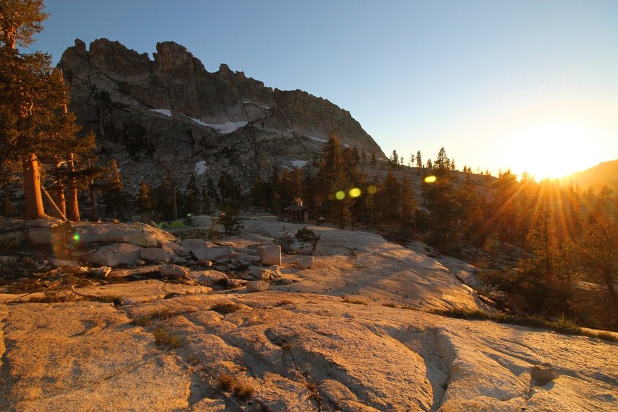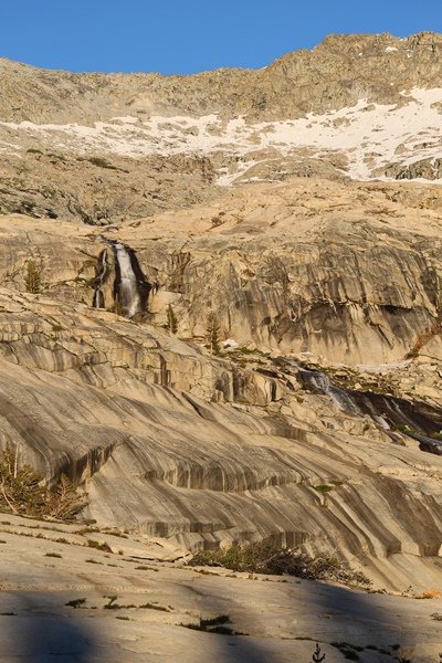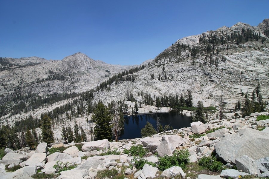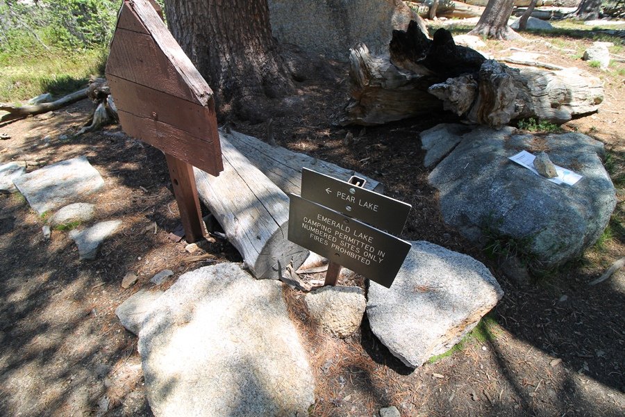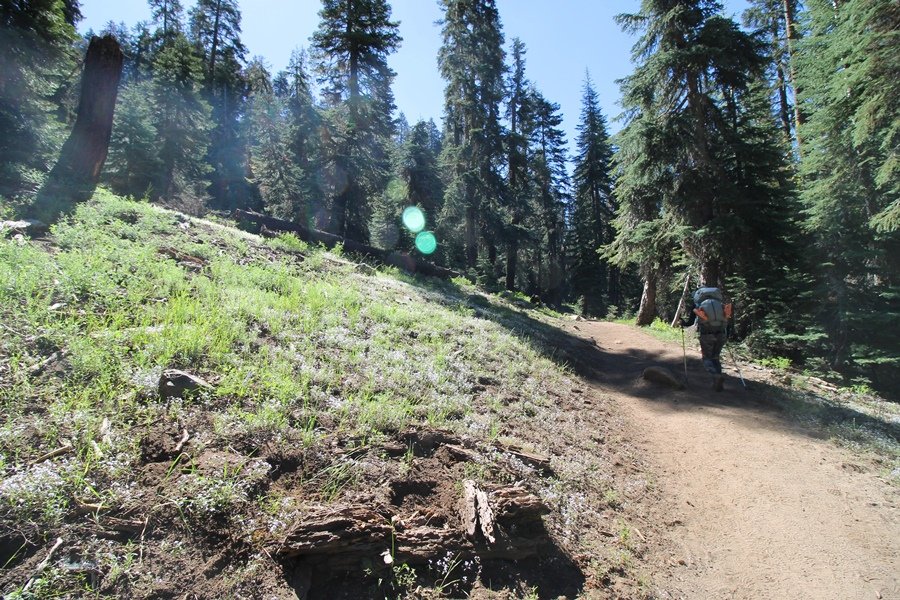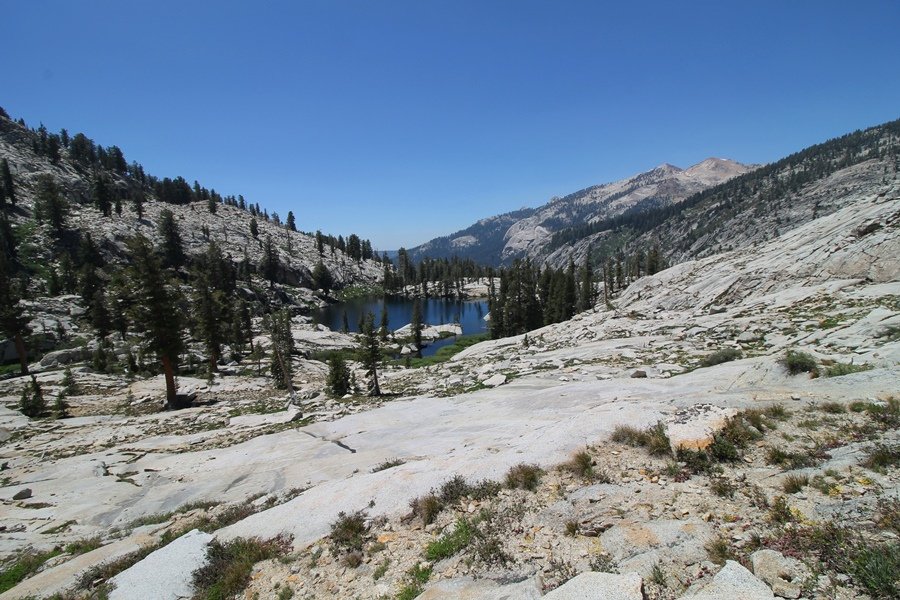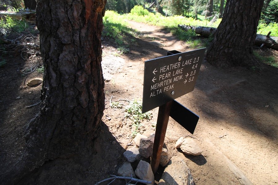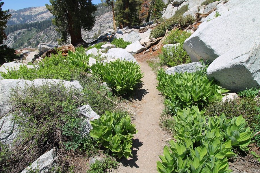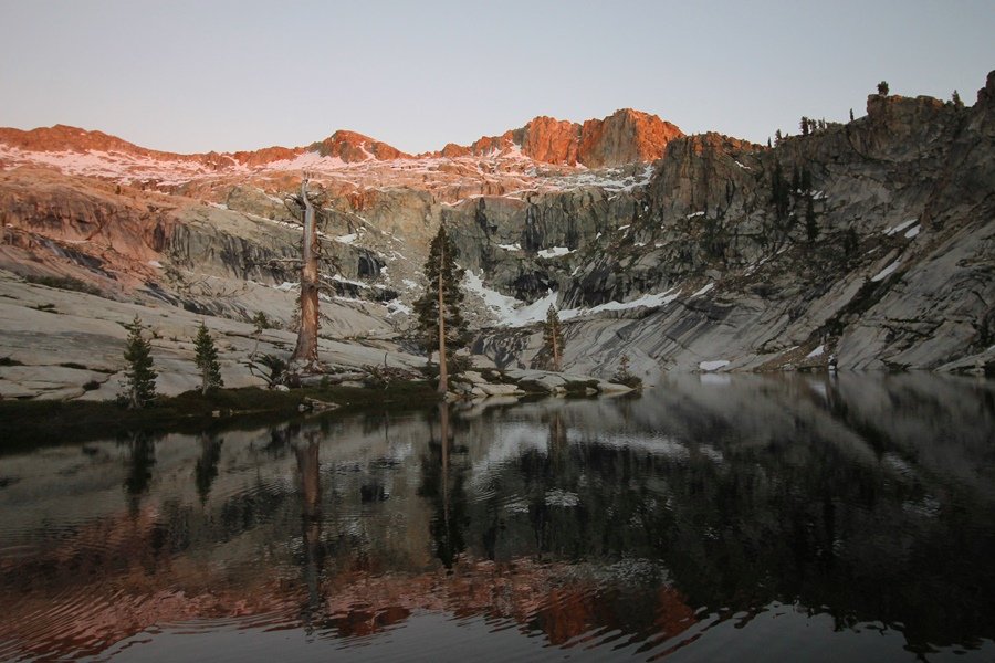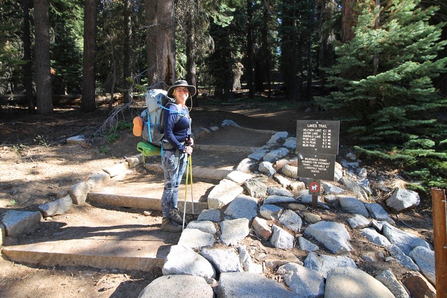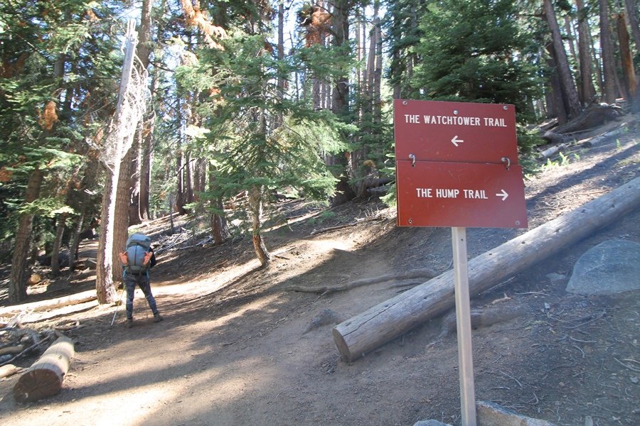 We’ve been hiking with full packs the past couple of months in preparation for our upcoming six-day backpack trip in Yosemite, and this particular weekend had long been slated for a shorter practice excursion, a shakedown cruise of sorts to prove out both our gear and our ability. We’ve had a wilderness permit since February to visit Little Lakes Valley near Bishop, but concerns about still-melting snow and associated clouds of mosquitos had us looking elsewhere for destinations. Pear Lake in Sequoia National Park has long been on our list of places to go, and it rather quickly sprung to the top of our list of possible trips for this weekend – since the park does not take permit reservations in advance for Pear Lake, we figured we could simply show up at the ranger station at first light Friday morning and not be at a disadvantage getting a last minute permit. So, after spending Thursday night in a pricey but convenient motel room in Three Rivers, we arrived at the Lodgepole visitor center at 6:15am Friday to find three other parties standing at the locked doors ahead of us – once the rangers opened up the facility at 7:00, we found out only one of those groups was headed to Pear Lake, and we got our permit without any trouble. By 8:30am, we were at the Wolverton trailhead and ready to head out. The Lakes trail heads east from Wolverton, first up a gentle ridgeline before bending southeast and climbing through the Panther Creek drainage. About two miles from Wolverton, the trail splits off northward, splitting again after a short distance into two parallel tracks, the left fork continuing north to a 1,000′-tall granite monolith called The Watchtower, the right fork climbing more earnestly eastward over The Hump, a ridge separating Panther Creek from the Heather Lake basin adjacent to the east – the two trails reunite at Heather Lake, which we had targeted as our likely lunch spot. Beyond Heather Lake, the trail ascends around another intervening ridge before dropping into the Emerald Lake cirque, then ascending again around a third ridge before making a final climb to Pear Lake at 9,500+’ – all told, the trail to Pear Lake is nominally 6.2 miles (although the Watchtower route adds about 0.3 miles to the total distance) with some 2,500′ of elevation gain. Leaving Wolverton, we immediately felt the increased weight of our packs – the additions of food and extra clothing meant both our packs were now over 30 lbs., and we necessarily shifted our respective loads around within the first half mile, leaving Jane with about 28 lbs. while Chris carried about 35. Luckily, the trail gradient is quite moderate over the first few miles through very pretty forest. There were lots of hikers on this popular trail, most folks with day packs who were going further up the Alta trail to Panther Gap or Mehrten Meadow located south and east of our turnoff up the Lakes trail. We passed a nonchalant doe grazing along the trail, entirely undisturbed by the curious bipeds wandering by – she must be used to us. After turning north, the Lakes trail steepens a bit as it gradually climbs for a mile, emerging after two short switchbacks at the top of The Watchtower – its rounded crown, which is a steep scramble from below the trail to the west, appears as just a minor outcropping, until one realizes the vertigo-inducing sheerness of the drop on its north and east sides. Some other hikers took our photo here, and it was one of the most photogenic spots of the whole hike – this trail closes whenever ice and snow are present, so it’s a must-do in the summer. We continued east and south, first along the clifftops and then across more moderate slopes into the Heather Lake basin – we ate our salami-and-cheese lunch admiring the reflection in the water of the mountains above. We had taken our time on this hike so far as it was about 12:30pm when we got to Heather Lake – leaving about 1pm, we went even slower up to Emerald Lake (the trail passes below the lake to the north, but the views over the smaller Aster Lake further down the basin are marvelous) before exiting that cirque northward and rounding the ridge into the Pear Lake bowl. Here, the views east opened up and the last few hundred yards, though tiring at the end of our long climb under heavy loads, were some of the most enjoyable of the day. Camping at Pear Lake is limited to the ten numbered sites only – four are located west of the lake’s outlet while the balance are on the far side. Stopping briefly near the outlet for pictures of the stunning scenery, we wandered past and found only one site already occupied – having been told by the rangers to expect a full campground, we were astonished that we were the first party to arrive that day, given our very slow pace, but that left us with a number of campsite choices. We found #8 most to our liking – the furthest east, we were separated from the other eastern sites by some large rocks, and yet had a nice view of the lake below and some connecting slabs down which we could walk for water (the vault toilets are also conveniently nearby). A ranger was in residence at the station a few hundred yards down the slope, and she came by to check our permit, noting that the pesky marmots has already gnawed the grips of our trekking poles which we had left laying against a log while we had scouted campsites – we made sure to hang our gear 3-4 feet off the ground after that. After setting up camp, we lounged for a bit before cooking our dinner of mac-and-cheese with bacon bits added – it was heavenly, no lie. As the sun set later in the evening, the alpenglow lit up the walls of the cirque behind our camp and the east side of the bowl to the south, making for a glorious display of color to close out the day. A wonderful Day One of three…
