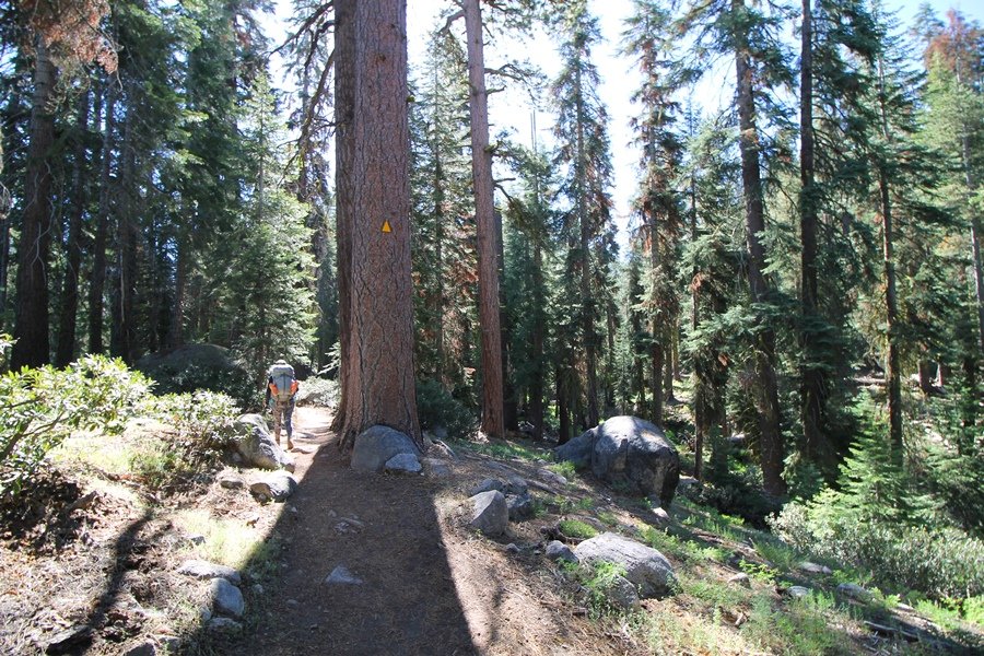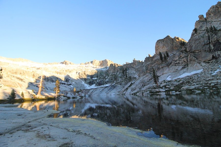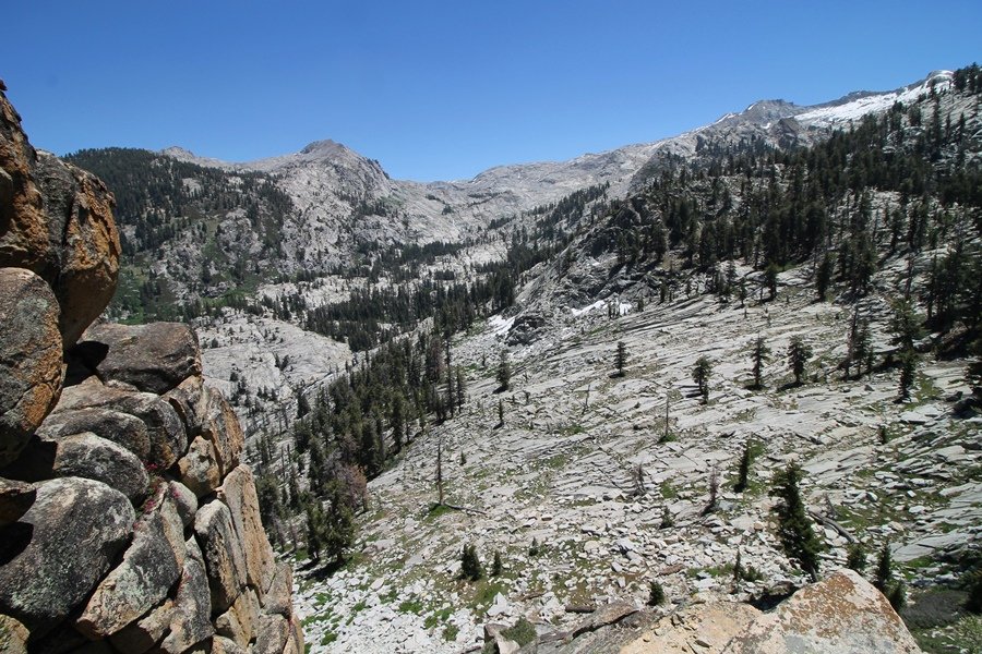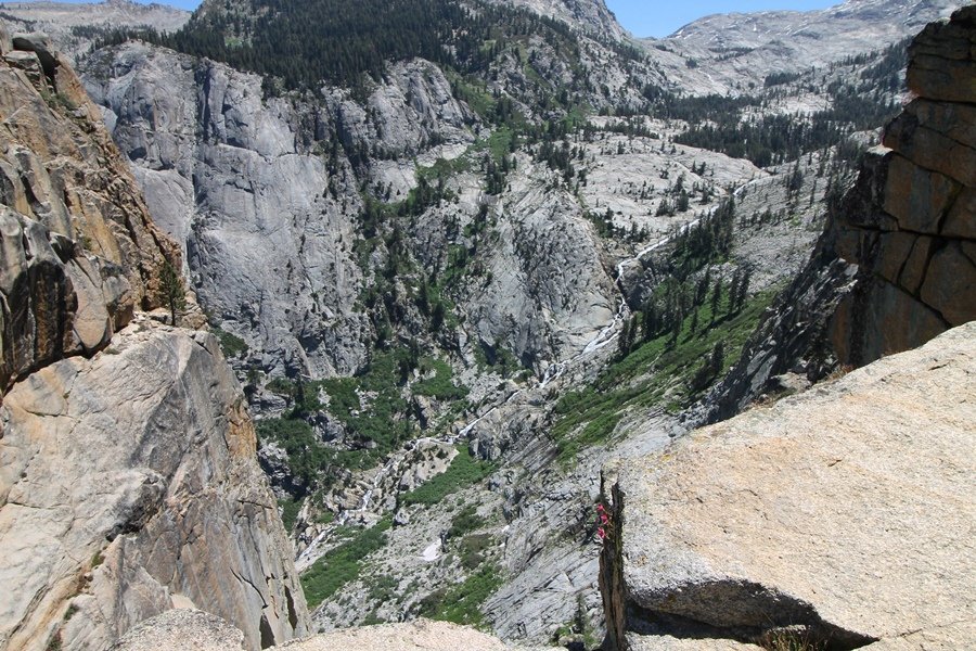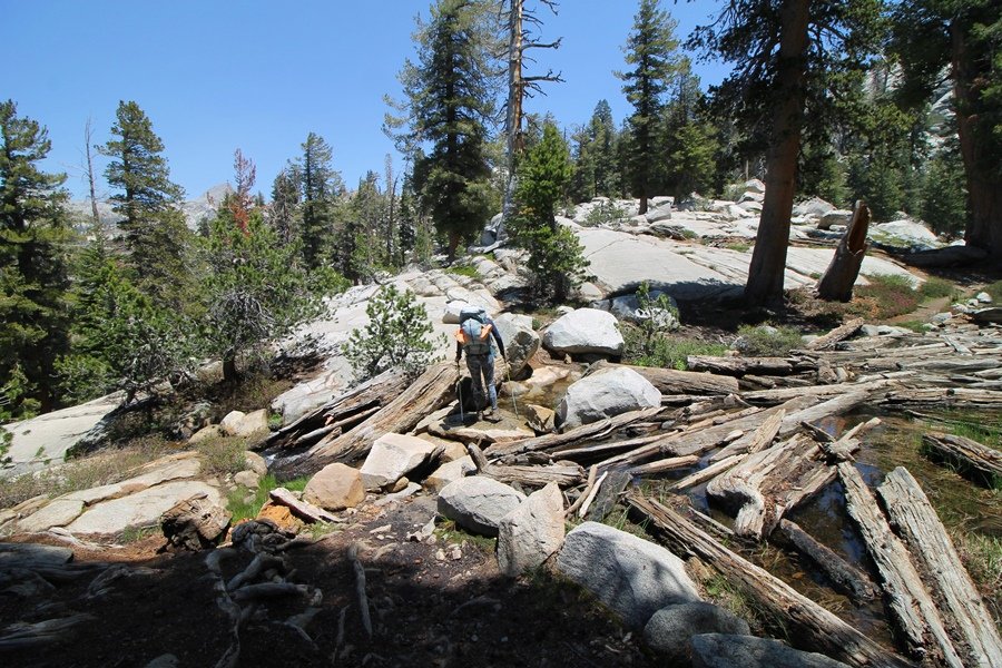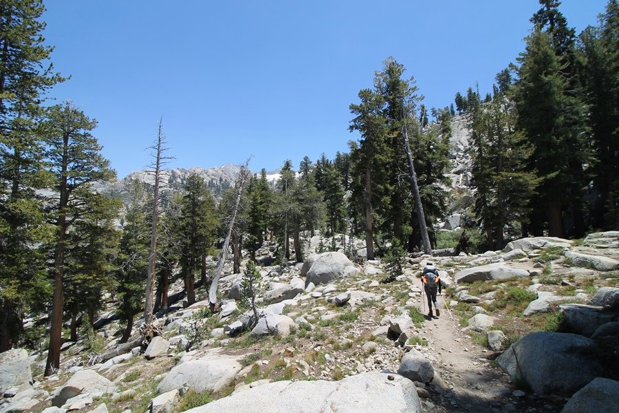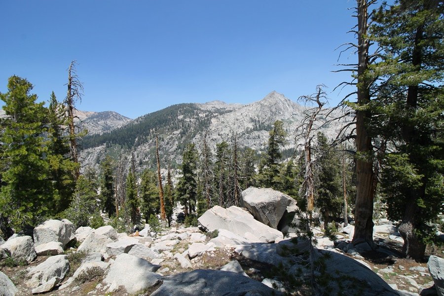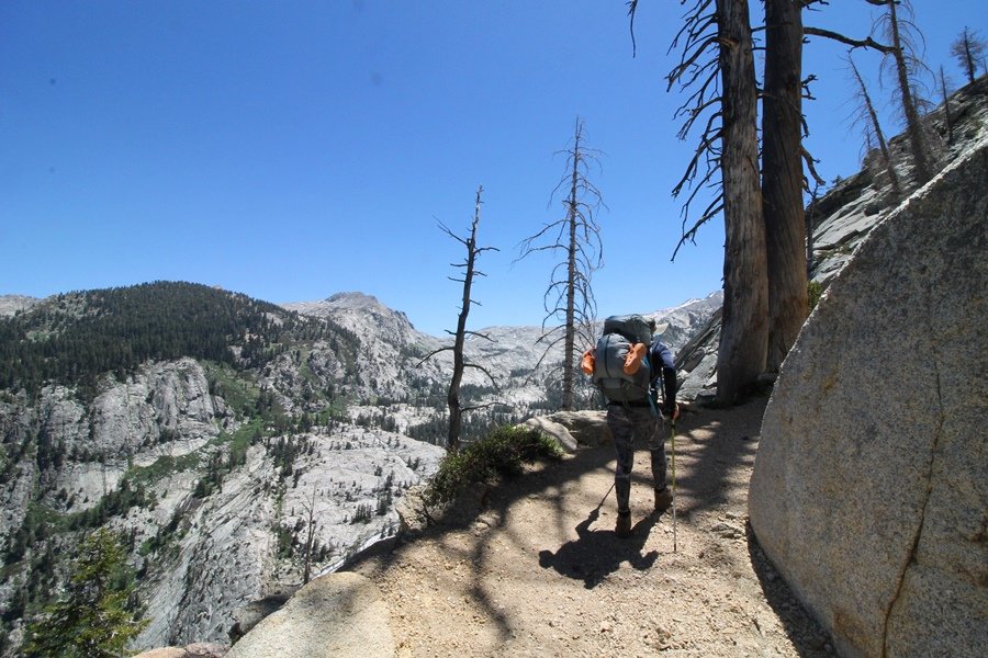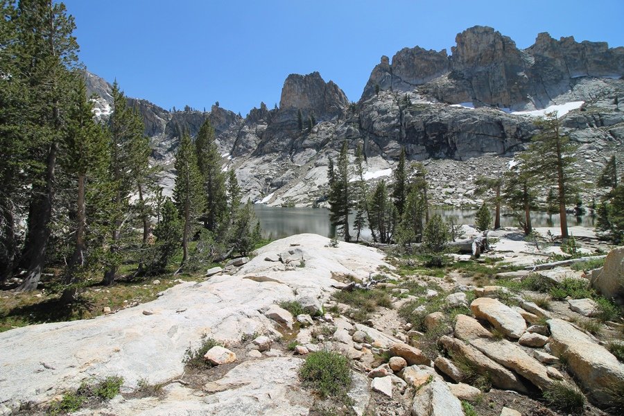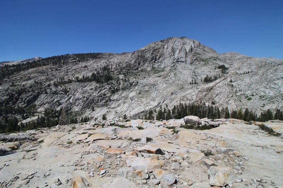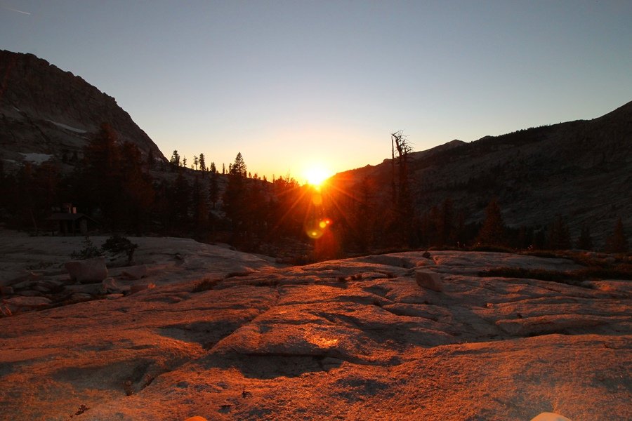 We’ve been hiking with full packs the past couple of months in preparation for our upcoming six-day backpack trip in Yosemite, and this particular weekend had long been slated for a shorter practice excursion, a shakedown cruise of sorts to prove out both our gear and our ability. We’ve had a wilderness permit since February to visit Little Lakes Valley near Bishop, but concerns about still-melting snow and associated clouds of mosquitos had us looking elsewhere for destinations. Pear Lake in Sequoia National Park has long been on our list of places to go, and it rather quickly sprung to the top of our list of possible trips for this weekend – since the park does not take permit reservations in advance for Pear Lake, we figured we could simply show up at the ranger station at first light Friday morning and not be at a disadvantage getting a last minute permit. So, after spending Thursday night in a pricey but convenient motel room in Three Rivers, we arrived at the Lodgepole visitor center at 6:15am Friday to find three other parties standing at the locked doors ahead of us – once the rangers opened up the facility at 7:00, we found out only one of those groups was headed to Pear Lake, and we got our permit without any trouble. By 8:30am, we were at the Wolverton trailhead and ready to head out. The Lakes trail heads east from Wolverton, first up a gentle ridgeline before bending southeast and climbing through the Panther Creek drainage. About two miles from Wolverton, the trail splits off northward, splitting again after a short distance into two parallel tracks, the left fork continuing north to a 1,000′-tall granite monolith called The Watchtower, the right fork climbing more earnestly eastward over The Hump, a ridge separating Panther Creek from the Heather Lake basin adjacent to the east – the two trails reunite at Heather Lake, which we had targeted as our likely lunch spot. Beyond Heather Lake, the trail ascends around another intervening ridge before dropping into the Emerald Lake cirque, then ascending again around a third ridge before making a final climb to Pear Lake at 9,500+’ – all told, the trail to Pear Lake is nominally 6.2 miles (although the Watchtower route adds about 0.3 miles to the total distance) with some 2,500′ of elevation gain. Leaving Wolverton, we immediately felt the increased weight of our packs – the additions of food and extra clothing meant both our packs were now over 30 lbs., and we necessarily shifted our respective loads around within the first half mile, leaving Jane with about 28 lbs. while Chris carried about 35. Luckily, the trail gradient is quite moderate over the first few miles through very pretty forest. There were lots of hikers on this popular trail, most folks with day packs who were going further up the Alta trail to Panther Gap or Mehrten Meadow located south and east of our turnoff up the Lakes trail. We passed a nonchalant doe grazing along the trail, entirely undisturbed by the curious bipeds wandering by – she must be used to us. After turning north, the Lakes trail steepens a bit as it gradually climbs for a mile, emerging after two short switchbacks at the top of The Watchtower – its rounded crown, which is a steep scramble from below the trail to the west, appears as just a minor outcropping, until one realizes the vertigo-inducing sheerness of the drop on its north and east sides. Some other hikers took our photo here, and it was one of the most photogenic spots of the whole hike – this trail closes whenever ice and snow are present, so it’s a must-do in the summer. We continued east and south, first along the clifftops and then across more moderate slopes into the Heather Lake basin – we ate our salami-and-cheese lunch admiring the reflection in the water of the mountains above. We had taken our time on this hike so far as it was about 12:30pm when we got to Heather Lake – leaving about 1pm, we went even slower up to Emerald Lake (the trail passes below the lake to the north, but the views over the smaller Aster Lake further down the basin are marvelous) before exiting that cirque northward and rounding the ridge into the Pear Lake bowl. Here, the views east opened up and the last few hundred yards, though tiring at the end of our long climb under heavy loads, were some of the most enjoyable of the day. Camping at Pear Lake is limited to the ten numbered sites only – four are located west of the lake’s outlet while the balance are on the far side. Stopping briefly near the outlet for pictures of the stunning scenery, we wandered past and found only one site already occupied – having been told by the rangers to expect a full campground, we were astonished that we were the first party to arrive that day, given our very slow pace, but that left us with a number of campsite choices. We found #8 most to our liking – the furthest east, we were separated from the other eastern sites by some large rocks, and yet had a nice view of the lake below and some connecting slabs down which we could walk for water (the vault toilets are also conveniently nearby). A ranger was in residence at the station a few hundred yards down the slope, and she came by to check our permit, noting that the pesky marmots has already gnawed the grips of our trekking poles which we had left laying against a log while we had scouted campsites – we made sure to hang our gear 3-4 feet off the ground after that. After setting up camp, we lounged for a bit before cooking our dinner of mac-and-cheese with bacon bits added – it was heavenly, no lie. As the sun set later in the evening, the alpenglow lit up the walls of the cirque behind our camp and the east side of the bowl to the south, making for a glorious display of color to close out the day. A wonderful Day One of three…