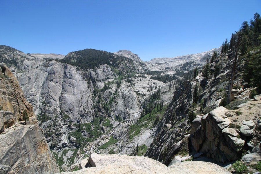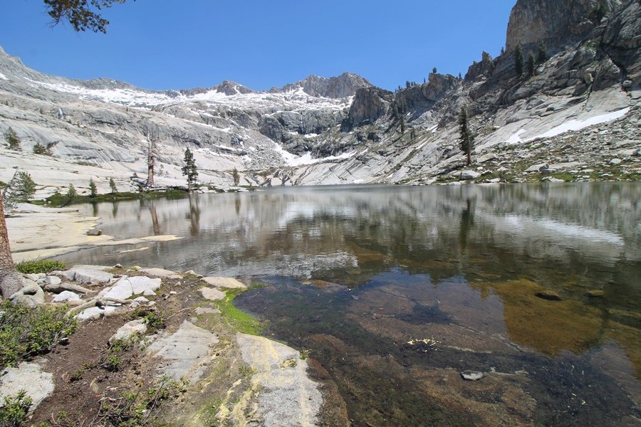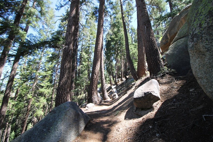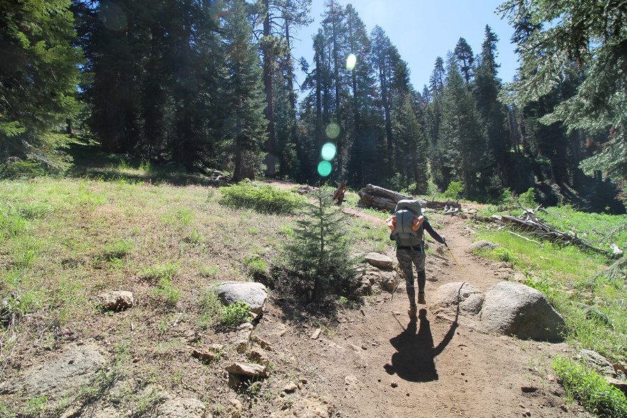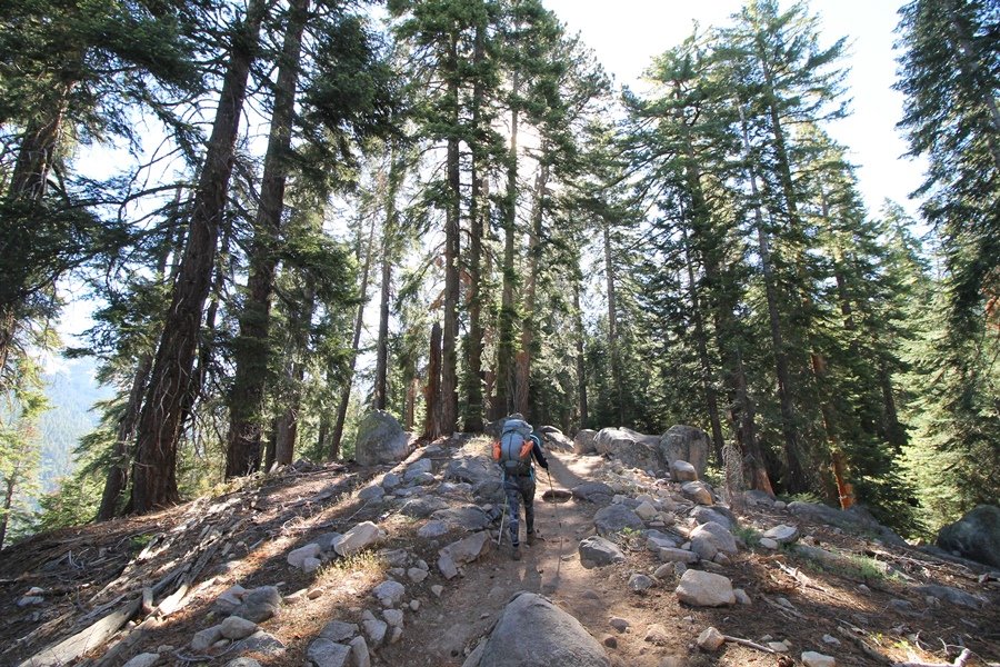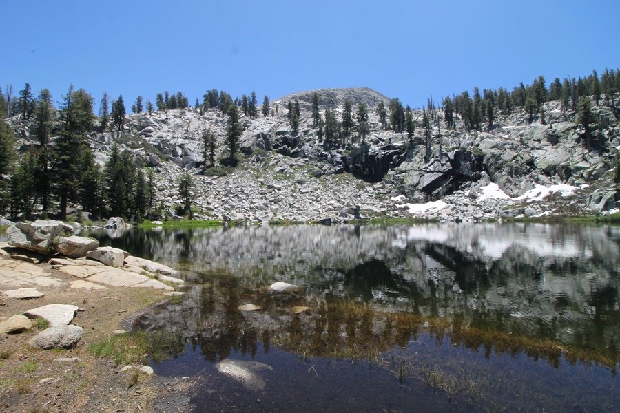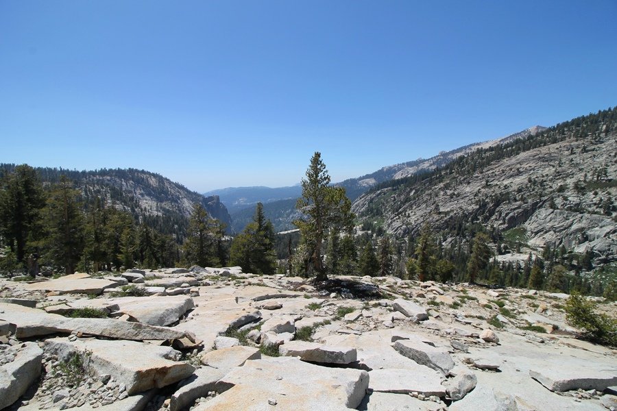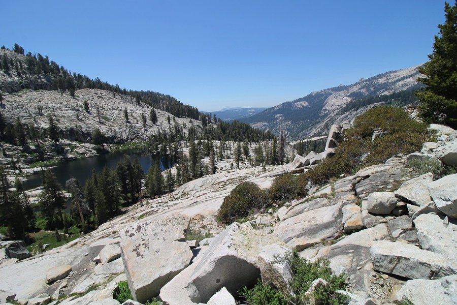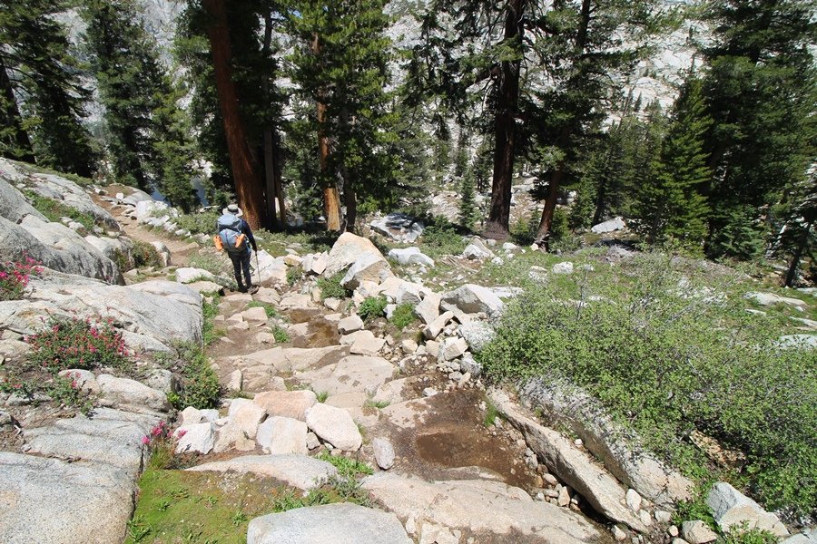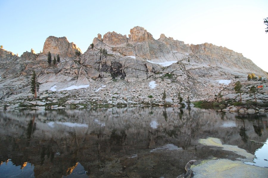 We’ve been hiking with full packs the past couple of months in preparation for our upcoming six-day backpack trip in Yosemite, and this particular weekend had long been slated for a shorter practice excursion, a shakedown cruise of sorts to prove out both our gear and our ability. We’ve had a wilderness permit since February to visit Little Lakes Valley near Bishop, but concerns about still-melting snow and associated clouds of mosquitos had us looking elsewhere for destinations. Pear Lake in Sequoia National Park has long been on our list of places to go, and it rather quickly sprung to the top of our list of possible trips for this weekend – since the park does not take permit reservations in advance for Pear Lake, we figured we could simply show up at the ranger station at first light Friday morning and not be at a disadvantage getting a last minute permit. So, after spending Thursday night in a pricey but convenient motel room in Three Rivers, we arrived at the Lodgepole visitor center at 6:15am Friday to find three other parties standing at the locked doors ahead of us – once the rangers opened up the facility at 7:00, we found out only one of those groups was headed to Pear Lake, and we got our permit without any trouble. By 8:30am, we were at the Wolverton trailhead and ready to head out. The Lakes trail heads east from Wolverton, first up a gentle ridgeline before bending southeast and climbing through the Panther Creek drainage. About two miles from Wolverton, the trail splits off northward, splitting again after a short distance into two parallel tracks, the left fork continuing north to a 1,000′-tall granite monolith called The Watchtower, the right fork climbing more earnestly eastward over The Hump, a ridge separating Panther Creek from the Heather Lake basin adjacent to the east – the two trails reunite at Heather Lake, which we had targeted as our likely lunch spot. Beyond Heather Lake, the trail ascends around another intervening ridge before dropping into the Emerald Lake cirque, then ascending again around a third ridge before making a final climb to Pear Lake at 9,500+’ – all told, the trail to Pear Lake is nominally 6.2 miles (although the Watchtower route adds about 0.3 miles to the total distance) with some 2,500′ of elevation gain. Leaving Wolverton, we immediately felt the increased weight of our packs – the additions of food and extra clothing meant both our packs were now over 30 lbs., and we necessarily shifted our respective loads around within the first half mile, leaving Jane with about 28 lbs. while Chris carried about 35. Luckily, the trail gradient is quite moderate over the first few miles through very pretty forest. There were lots of hikers on this popular trail, most folks with day packs who were going further up the Alta trail to Panther Gap or Mehrten Meadow located south and east of our turnoff up the Lakes trail. We passed a nonchalant doe grazing along the trail, entirely undisturbed by the curious bipeds wandering by – she must be used to us. After turning north, the Lakes trail steepens a bit as it gradually climbs for a mile, emerging after two short switchbacks at the top of The Watchtower – its rounded crown, which is a steep scramble from below the trail to the west, appears as just a minor outcropping, until one realizes the vertigo-inducing sheerness of the drop on its north and east sides. Some other hikers took our photo here, and it was one of the most photogenic spots of the whole hike – this trail closes whenever ice and snow are present, so it’s a must-do in the summer. We continued east and south, first along the clifftops and then across more moderate slopes into the Heather Lake basin – we ate our salami-and-cheese lunch admiring the reflection in the water of the mountains above. We had taken our time on this hike so far as it was about 12:30pm when we got to Heather Lake – leaving about 1pm, we went even slower up to Emerald Lake (the trail passes below the lake to the north, but the views over the smaller Aster Lake further down the basin are marvelous) before exiting that cirque northward and rounding the ridge into the Pear Lake bowl. Here, the views east opened up and the last few hundred yards, though tiring at the end of our long climb under heavy loads, were some of the most enjoyable of the day. Camping at Pear Lake is limited to the ten numbered sites only – four are located west of the lake’s outlet while the balance are on the far side. Stopping briefly near the outlet for pictures of the stunning scenery, we wandered past and found only one site already occupied – having been told by the rangers to expect a full campground, we were astonished that we were the first party to arrive that day, given our very slow pace, but that left us with a number of campsite choices. We found #8 most to our liking – the furthest east, we were separated from the other eastern sites by some large rocks, and yet had a nice view of the lake below and some connecting slabs down which we could walk for water (the vault toilets are also conveniently nearby). A ranger was in residence at the station a few hundred yards down the slope, and she came by to check our permit, noting that the pesky marmots has already gnawed the grips of our trekking poles which we had left laying against a log while we had scouted campsites – we made sure to hang our gear 3-4 feet off the ground after that. After setting up camp, we lounged for a bit before cooking our dinner of mac-and-cheese with bacon bits added – it was heavenly, no lie. As the sun set later in the evening, the alpenglow lit up the walls of the cirque behind our camp and the east side of the bowl to the south, making for a glorious display of color to close out the day. A wonderful Day One of three…
