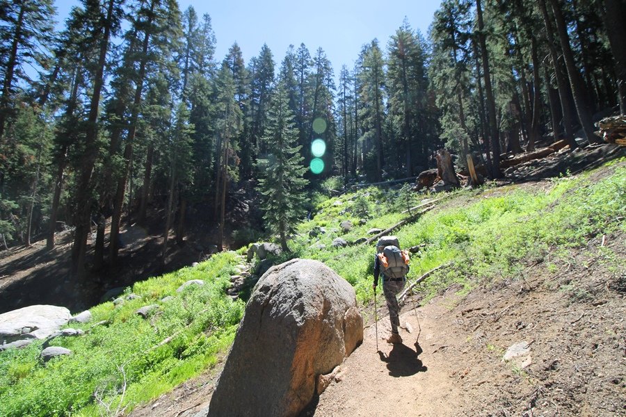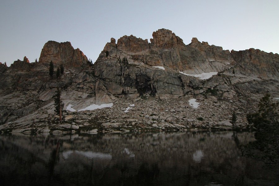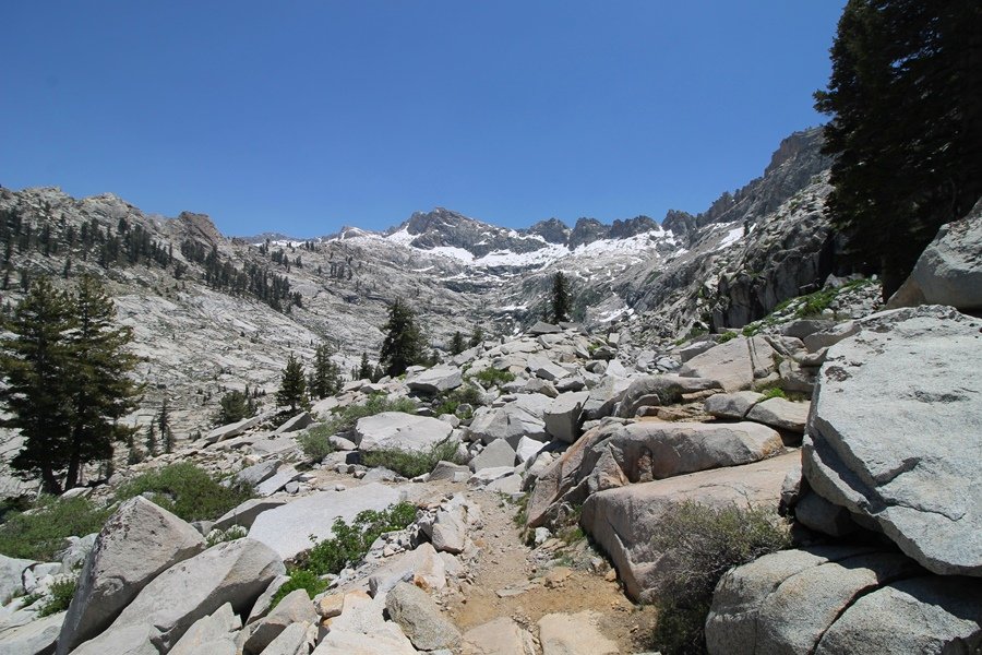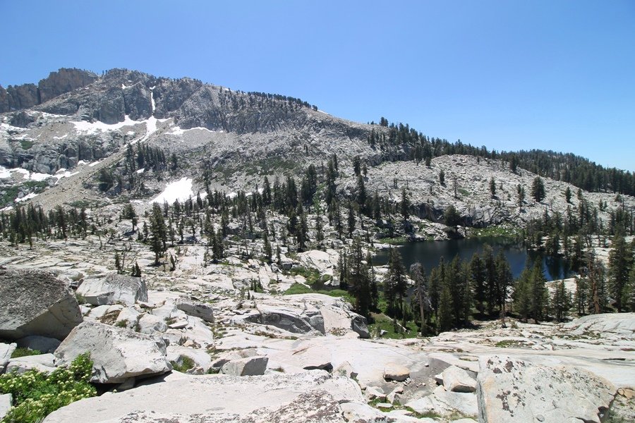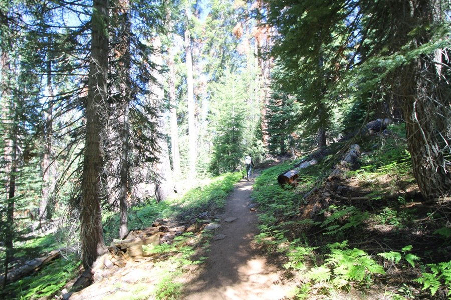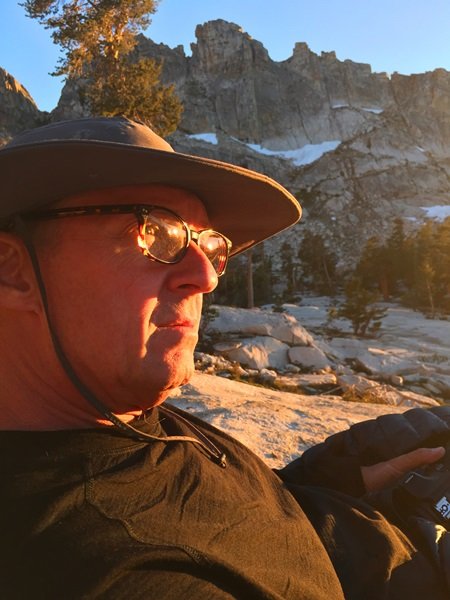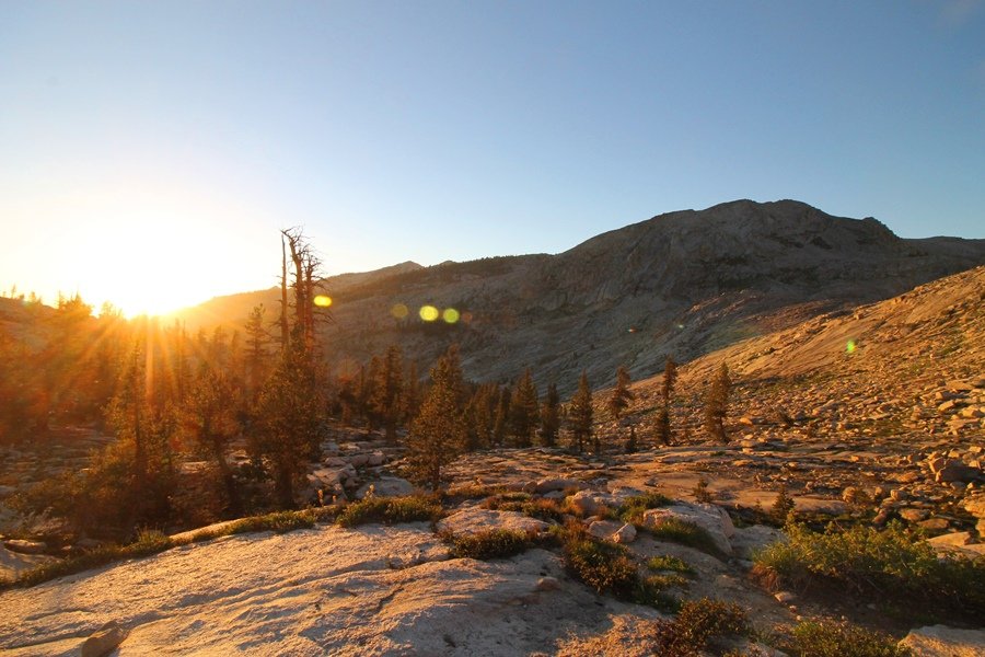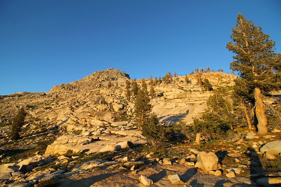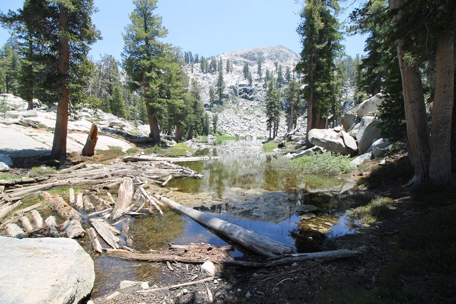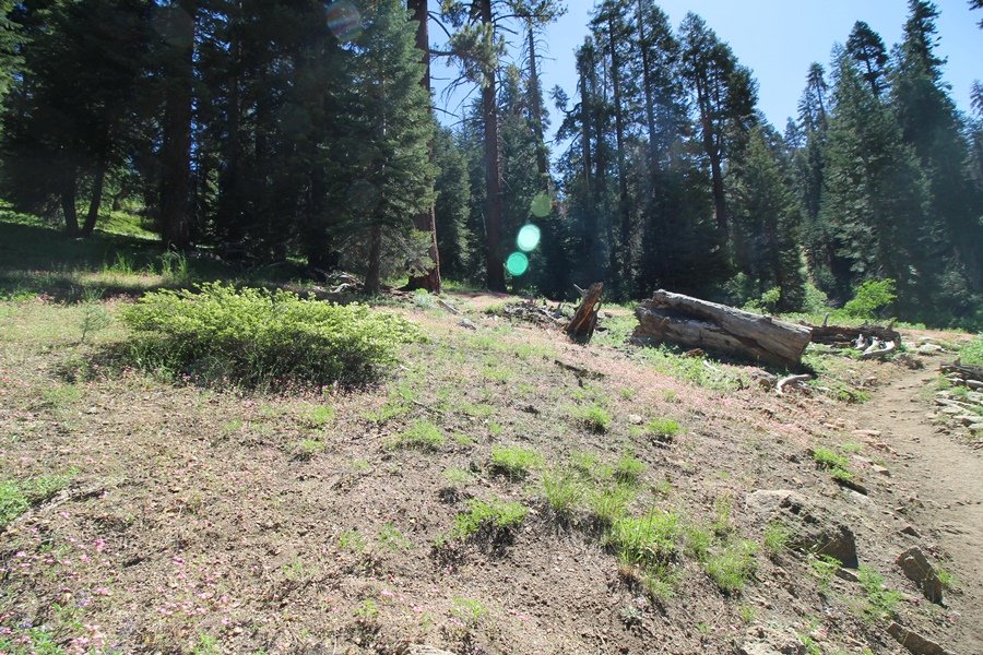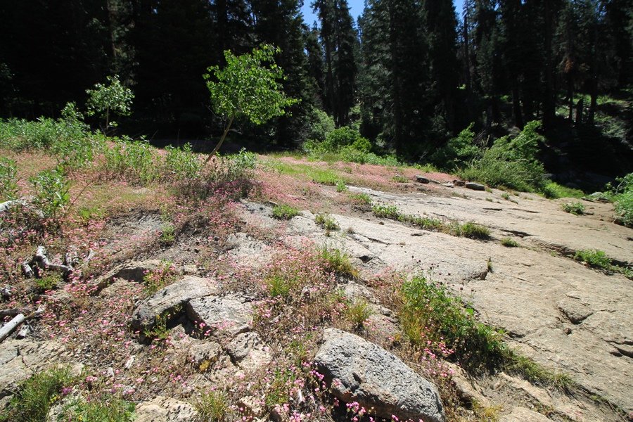 We’ve been hiking with full packs the past couple of months in preparation for our upcoming six-day backpack trip in Yosemite, and this particular weekend had long been slated for a shorter practice excursion, a shakedown cruise of sorts to prove out both our gear and our ability. We’ve had a wilderness permit since February to visit Little Lakes Valley near Bishop, but concerns about still-melting snow and associated clouds of mosquitos had us looking elsewhere for destinations. Pear Lake in Sequoia National Park has long been on our list of places to go, and it rather quickly sprung to the top of our list of possible trips for this weekend – since the park does not take permit reservations in advance for Pear Lake, we figured we could simply show up at the ranger station at first light Friday morning and not be at a disadvantage getting a last minute permit. So, after spending Thursday night in a pricey but convenient motel room in Three Rivers, we arrived at the Lodgepole visitor center at 6:15am Friday to find three other parties standing at the locked doors ahead of us – once the rangers opened up the facility at 7:00, we found out only one of those groups was headed to Pear Lake, and we got our permit without any trouble. By 8:30am, we were at the Wolverton trailhead and ready to head out. The Lakes trail heads east from Wolverton, first up a gentle ridgeline before bending southeast and climbing through the Panther Creek drainage. About two miles from Wolverton, the trail splits off northward, splitting again after a short distance into two parallel tracks, the left fork continuing north to a 1,000′-tall granite monolith called The Watchtower, the right fork climbing more earnestly eastward over The Hump, a ridge separating Panther Creek from the Heather Lake basin adjacent to the east – the two trails reunite at Heather Lake, which we had targeted as our likely lunch spot. Beyond Heather Lake, the trail ascends around another intervening ridge before dropping into the Emerald Lake cirque, then ascending again around a third ridge before making a final climb to Pear Lake at 9,500+’ – all told, the trail to Pear Lake is nominally 6.2 miles (although the Watchtower route adds about 0.3 miles to the total distance) with some 2,500′ of elevation gain. Leaving Wolverton, we immediately felt the increased weight of our packs – the additions of food and extra clothing meant both our packs were now over 30 lbs., and we necessarily shifted our respective loads around within the first half mile, leaving Jane with about 28 lbs. while Chris carried about 35. Luckily, the trail gradient is quite moderate over the first few miles through very pretty forest. There were lots of hikers on this popular trail, most folks with day packs who were going further up the Alta trail to Panther Gap or Mehrten Meadow located south and east of our turnoff up the Lakes trail. We passed a nonchalant doe grazing along the trail, entirely undisturbed by the curious bipeds wandering by – she must be used to us. After turning north, the Lakes trail steepens a bit as it gradually climbs for a mile, emerging after two short switchbacks at the top of The Watchtower – its rounded crown, which is a steep scramble from below the trail to the west, appears as just a minor outcropping, until one realizes the vertigo-inducing sheerness of the drop on its north and east sides. Some other hikers took our photo here, and it was one of the most photogenic spots of the whole hike – this trail closes whenever ice and snow are present, so it’s a must-do in the summer. We continued east and south, first along the clifftops and then across more moderate slopes into the Heather Lake basin – we ate our salami-and-cheese lunch admiring the reflection in the water of the mountains above. We had taken our time on this hike so far as it was about 12:30pm when we got to Heather Lake – leaving about 1pm, we went even slower up to Emerald Lake (the trail passes below the lake to the north, but the views over the smaller Aster Lake further down the basin are marvelous) before exiting that cirque northward and rounding the ridge into the Pear Lake bowl. Here, the views east opened up and the last few hundred yards, though tiring at the end of our long climb under heavy loads, were some of the most enjoyable of the day. Camping at Pear Lake is limited to the ten numbered sites only – four are located west of the lake’s outlet while the balance are on the far side. Stopping briefly near the outlet for pictures of the stunning scenery, we wandered past and found only one site already occupied – having been told by the rangers to expect a full campground, we were astonished that we were the first party to arrive that day, given our very slow pace, but that left us with a number of campsite choices. We found #8 most to our liking – the furthest east, we were separated from the other eastern sites by some large rocks, and yet had a nice view of the lake below and some connecting slabs down which we could walk for water (the vault toilets are also conveniently nearby). A ranger was in residence at the station a few hundred yards down the slope, and she came by to check our permit, noting that the pesky marmots has already gnawed the grips of our trekking poles which we had left laying against a log while we had scouted campsites – we made sure to hang our gear 3-4 feet off the ground after that. After setting up camp, we lounged for a bit before cooking our dinner of mac-and-cheese with bacon bits added – it was heavenly, no lie. As the sun set later in the evening, the alpenglow lit up the walls of the cirque behind our camp and the east side of the bowl to the south, making for a glorious display of color to close out the day. A wonderful Day One of three…