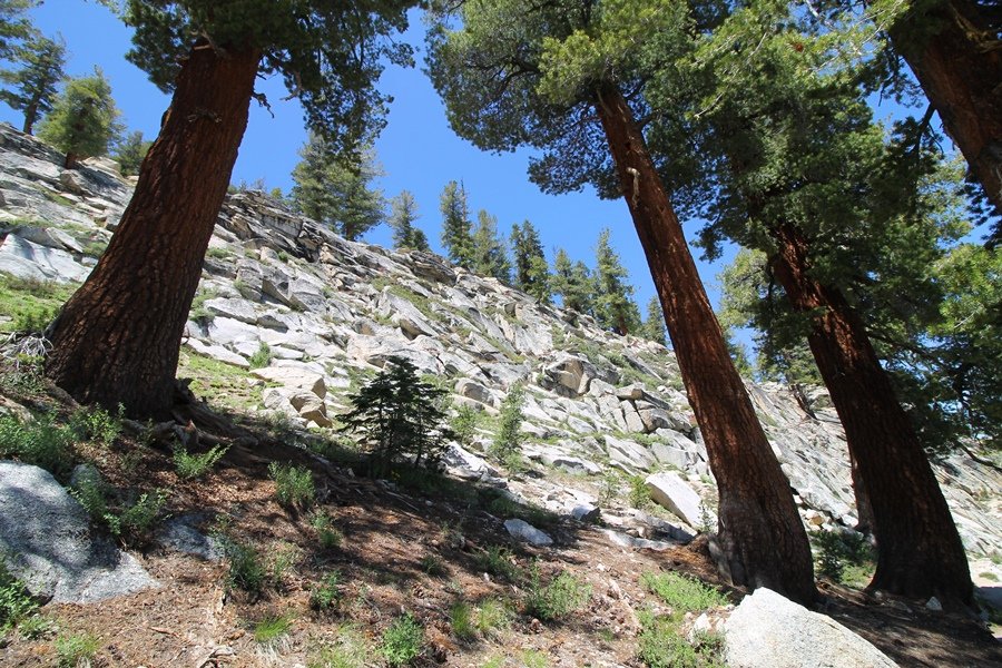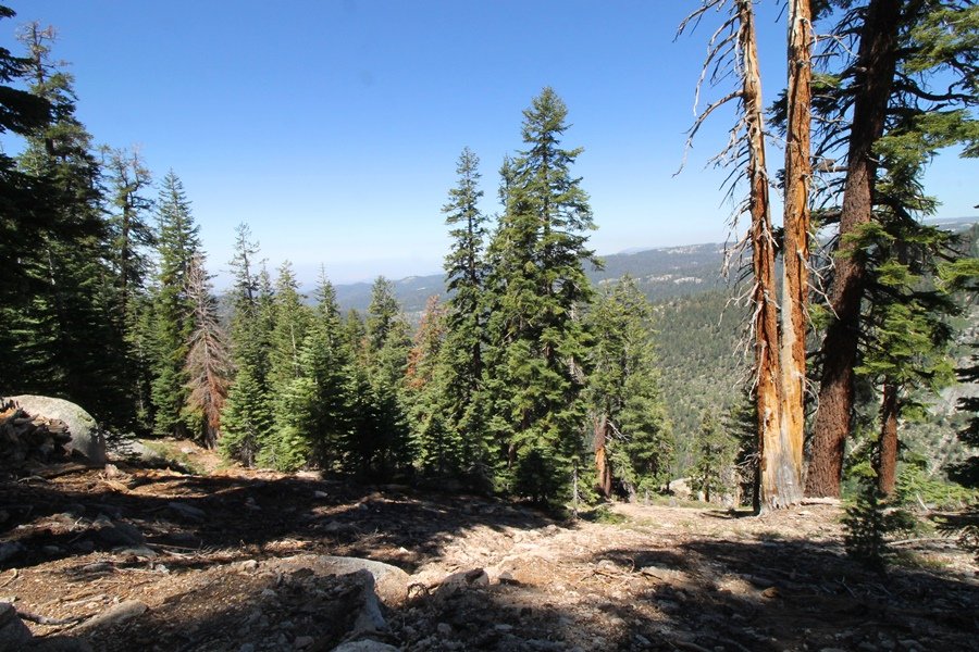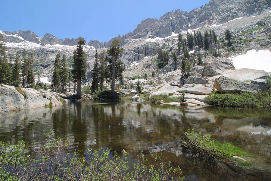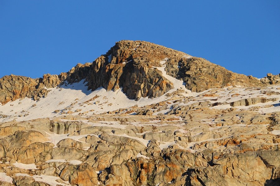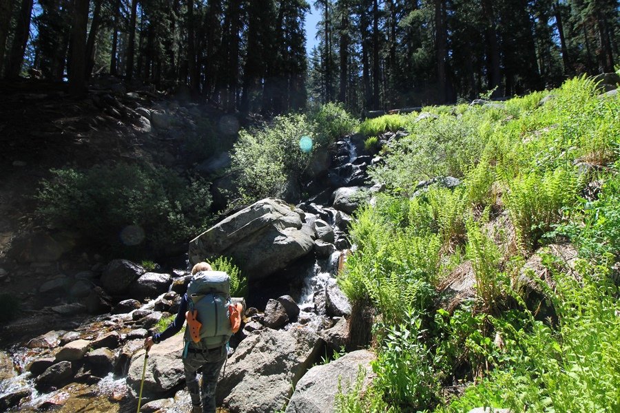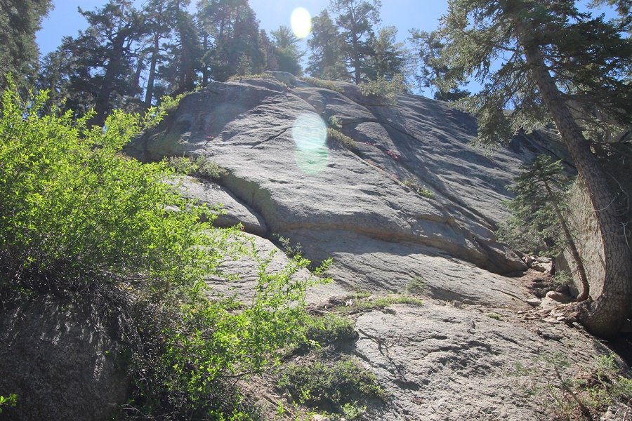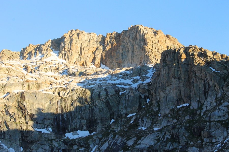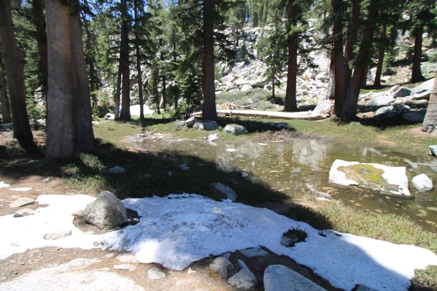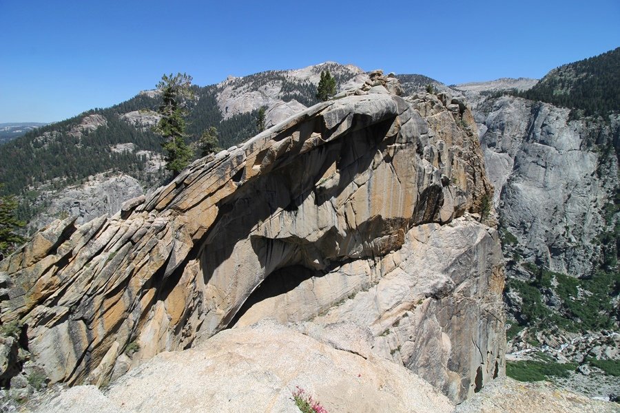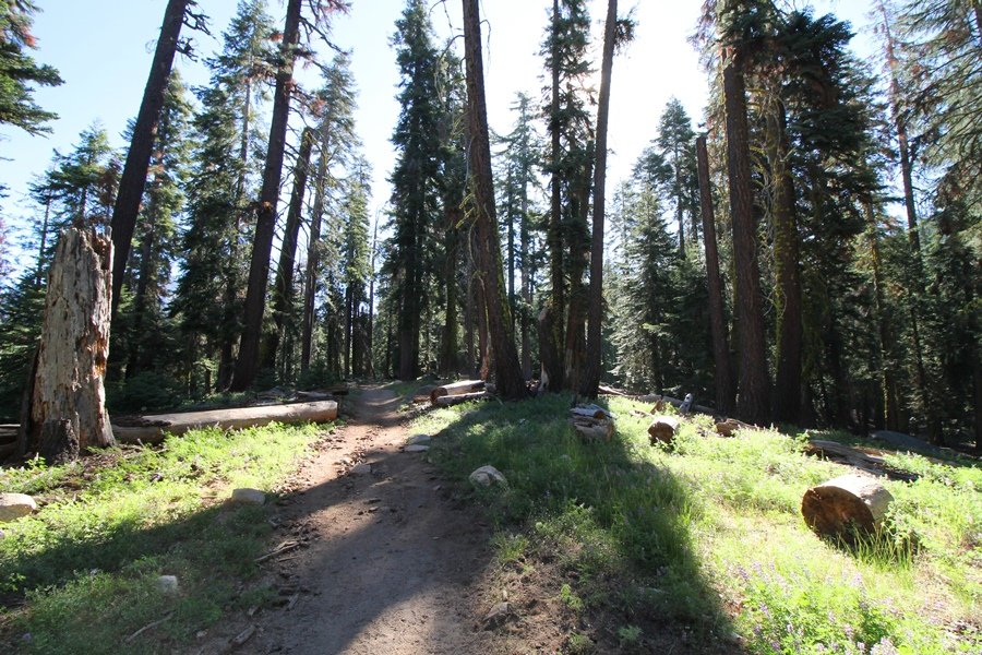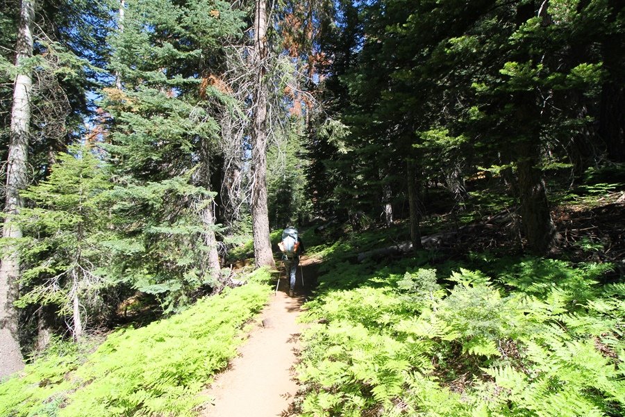 We’ve been hiking with full packs the past couple of months in preparation for our upcoming six-day backpack trip in Yosemite, and this particular weekend had long been slated for a shorter practice excursion, a shakedown cruise of sorts to prove out both our gear and our ability. We’ve had a wilderness permit since February to visit Little Lakes Valley near Bishop, but concerns about still-melting snow and associated clouds of mosquitos had us looking elsewhere for destinations. Pear Lake in Sequoia National Park has long been on our list of places to go, and it rather quickly sprung to the top of our list of possible trips for this weekend – since the park does not take permit reservations in advance for Pear Lake, we figured we could simply show up at the ranger station at first light Friday morning and not be at a disadvantage getting a last minute permit. So, after spending Thursday night in a pricey but convenient motel room in Three Rivers, we arrived at the Lodgepole visitor center at 6:15am Friday to find three other parties standing at the locked doors ahead of us – once the rangers opened up the facility at 7:00, we found out only one of those groups was headed to Pear Lake, and we got our permit without any trouble. By 8:30am, we were at the Wolverton trailhead and ready to head out. The Lakes trail heads east from Wolverton, first up a gentle ridgeline before bending southeast and climbing through the Panther Creek drainage. About two miles from Wolverton, the trail splits off northward, splitting again after a short distance into two parallel tracks, the left fork continuing north to a 1,000′-tall granite monolith called The Watchtower, the right fork climbing more earnestly eastward over The Hump, a ridge separating Panther Creek from the Heather Lake basin adjacent to the east – the two trails reunite at Heather Lake, which we had targeted as our likely lunch spot. Beyond Heather Lake, the trail ascends around another intervening ridge before dropping into the Emerald Lake cirque, then ascending again around a third ridge before making a final climb to Pear Lake at 9,500+’ – all told, the trail to Pear Lake is nominally 6.2 miles (although the Watchtower route adds about 0.3 miles to the total distance) with some 2,500′ of elevation gain. Leaving Wolverton, we immediately felt the increased weight of our packs – the additions of food and extra clothing meant both our packs were now over 30 lbs., and we necessarily shifted our respective loads around within the first half mile, leaving Jane with about 28 lbs. while Chris carried about 35. Luckily, the trail gradient is quite moderate over the first few miles through very pretty forest. There were lots of hikers on this popular trail, most folks with day packs who were going further up the Alta trail to Panther Gap or Mehrten Meadow located south and east of our turnoff up the Lakes trail. We passed a nonchalant doe grazing along the trail, entirely undisturbed by the curious bipeds wandering by – she must be used to us. After turning north, the Lakes trail steepens a bit as it gradually climbs for a mile, emerging after two short switchbacks at the top of The Watchtower – its rounded crown, which is a steep scramble from below the trail to the west, appears as just a minor outcropping, until one realizes the vertigo-inducing sheerness of the drop on its north and east sides. Some other hikers took our photo here, and it was one of the most photogenic spots of the whole hike – this trail closes whenever ice and snow are present, so it’s a must-do in the summer. We continued east and south, first along the clifftops and then across more moderate slopes into the Heather Lake basin – we ate our salami-and-cheese lunch admiring the reflection in the water of the mountains above. We had taken our time on this hike so far as it was about 12:30pm when we got to Heather Lake – leaving about 1pm, we went even slower up to Emerald Lake (the trail passes below the lake to the north, but the views over the smaller Aster Lake further down the basin are marvelous) before exiting that cirque northward and rounding the ridge into the Pear Lake bowl. Here, the views east opened up and the last few hundred yards, though tiring at the end of our long climb under heavy loads, were some of the most enjoyable of the day. Camping at Pear Lake is limited to the ten numbered sites only – four are located west of the lake’s outlet while the balance are on the far side. Stopping briefly near the outlet for pictures of the stunning scenery, we wandered past and found only one site already occupied – having been told by the rangers to expect a full campground, we were astonished that we were the first party to arrive that day, given our very slow pace, but that left us with a number of campsite choices. We found #8 most to our liking – the furthest east, we were separated from the other eastern sites by some large rocks, and yet had a nice view of the lake below and some connecting slabs down which we could walk for water (the vault toilets are also conveniently nearby). A ranger was in residence at the station a few hundred yards down the slope, and she came by to check our permit, noting that the pesky marmots has already gnawed the grips of our trekking poles which we had left laying against a log while we had scouted campsites – we made sure to hang our gear 3-4 feet off the ground after that. After setting up camp, we lounged for a bit before cooking our dinner of mac-and-cheese with bacon bits added – it was heavenly, no lie. As the sun set later in the evening, the alpenglow lit up the walls of the cirque behind our camp and the east side of the bowl to the south, making for a glorious display of color to close out the day. A wonderful Day One of three…